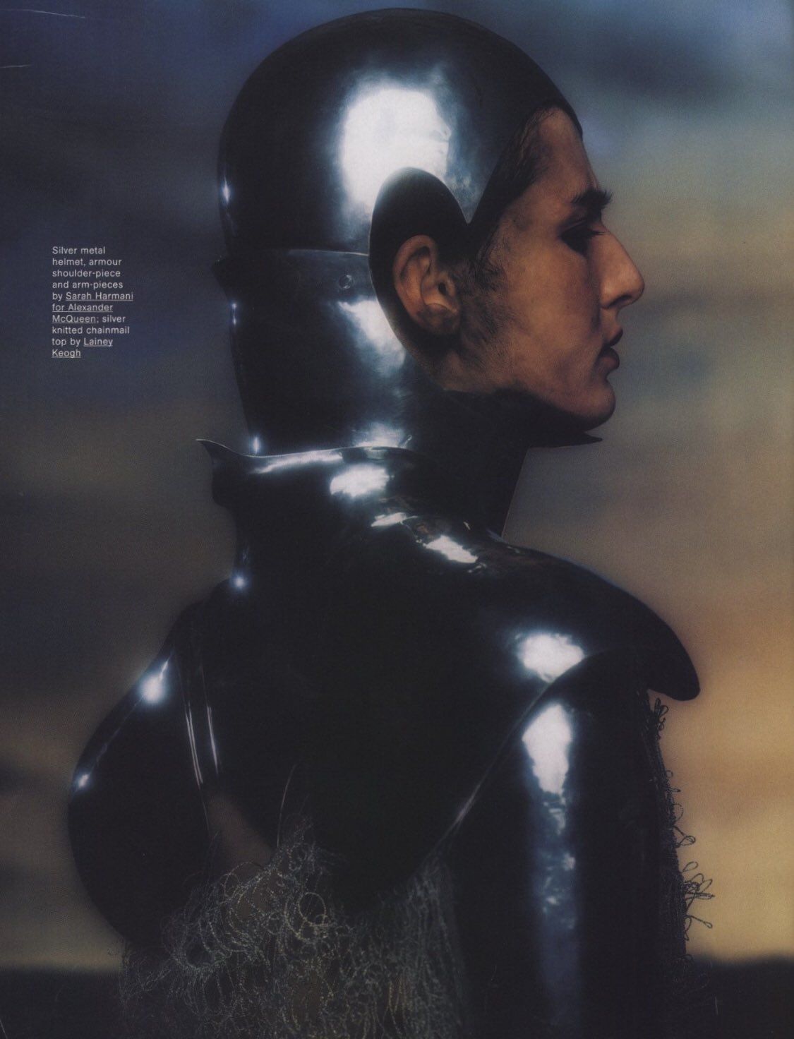 L'arrivée inquiétante du nouveau millénaire a poussé plusieurs designers à chercher refuge dans l'histoire. L'un d'entre eux est Alexander McQueen, qui pour l'automne-hiver 98, intitulée Joan, a offert un immense hommage à la figure de Jeanne d'Arc. Entre vêtements en cotte de mailles et coiffes en métal, lunettes rouges flamboyantes et robes assorties tout aussi scintillantes, la collection a épousé le charme maudit de la figure de Jeanne d'Arc à une mode tout aussi perverse, à mi-chemin entre le séduisant et l'inquiétant. La collection apparaît sur The Face la même année dans un éditorial grandiose où McQueen lui-même est photographié en soldat. Nous retrouvons la cotte de mailles sur le podium pour la collection printemps-été 2000, lorsque pour son premier défilé à New York, McQueen présente une de ses collections les plus controversées. Intitulée Eye, elle associe les codes stylistiques de la tradition arabe et de la religion islamique comme le burka, la kefiah et le kajal à des silhouettes laissant entrevoir beaucoup, voire tout, le corps des mannequins. Certains des looks étaient caractérisés par de véritables armures réalisées avec des plaques en argent reliées entre elles qui rappelaient le style des hirz (talisman) moyen-orientaux, même si c'était des top models comme Gisele Bündchen qui les portaient.
