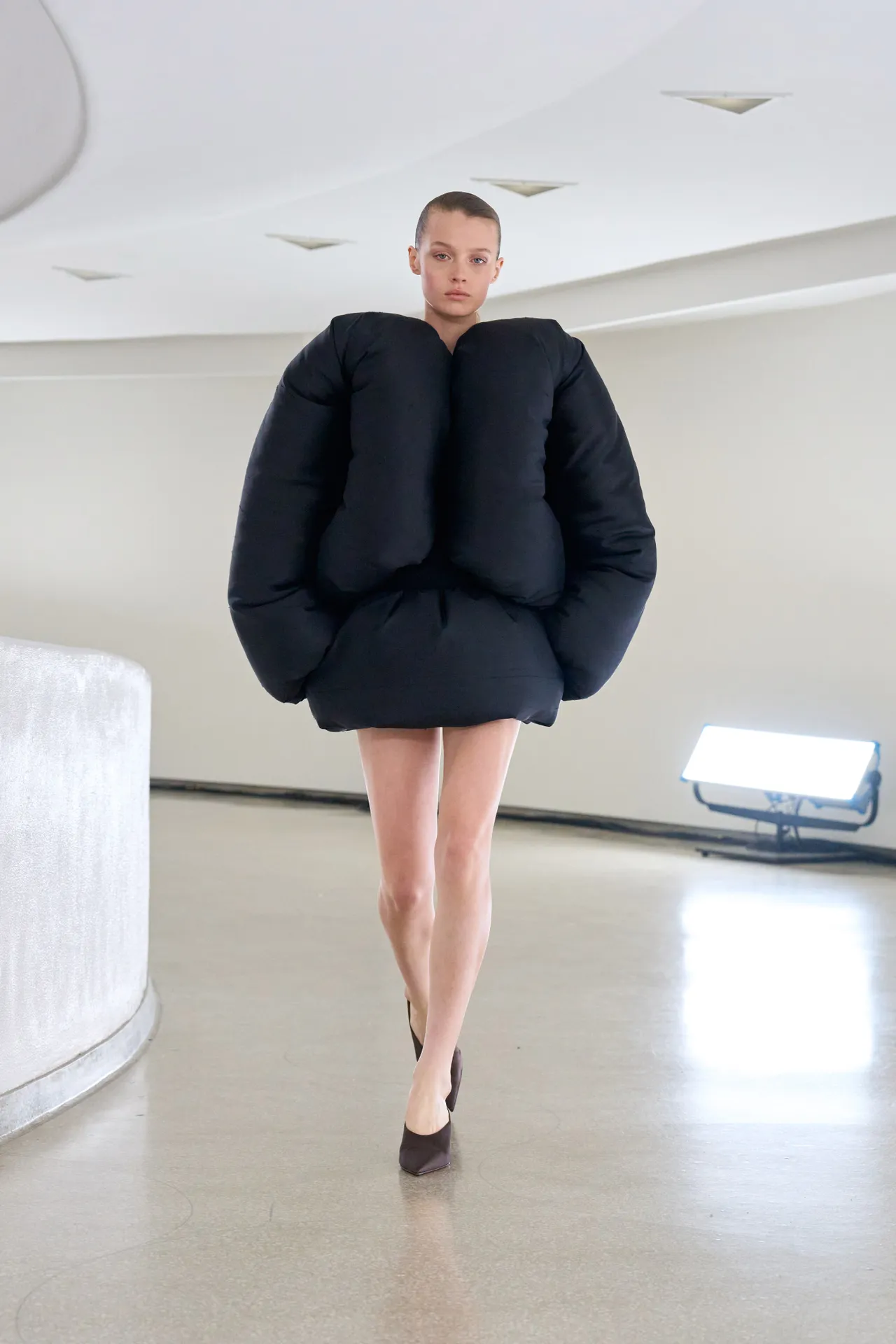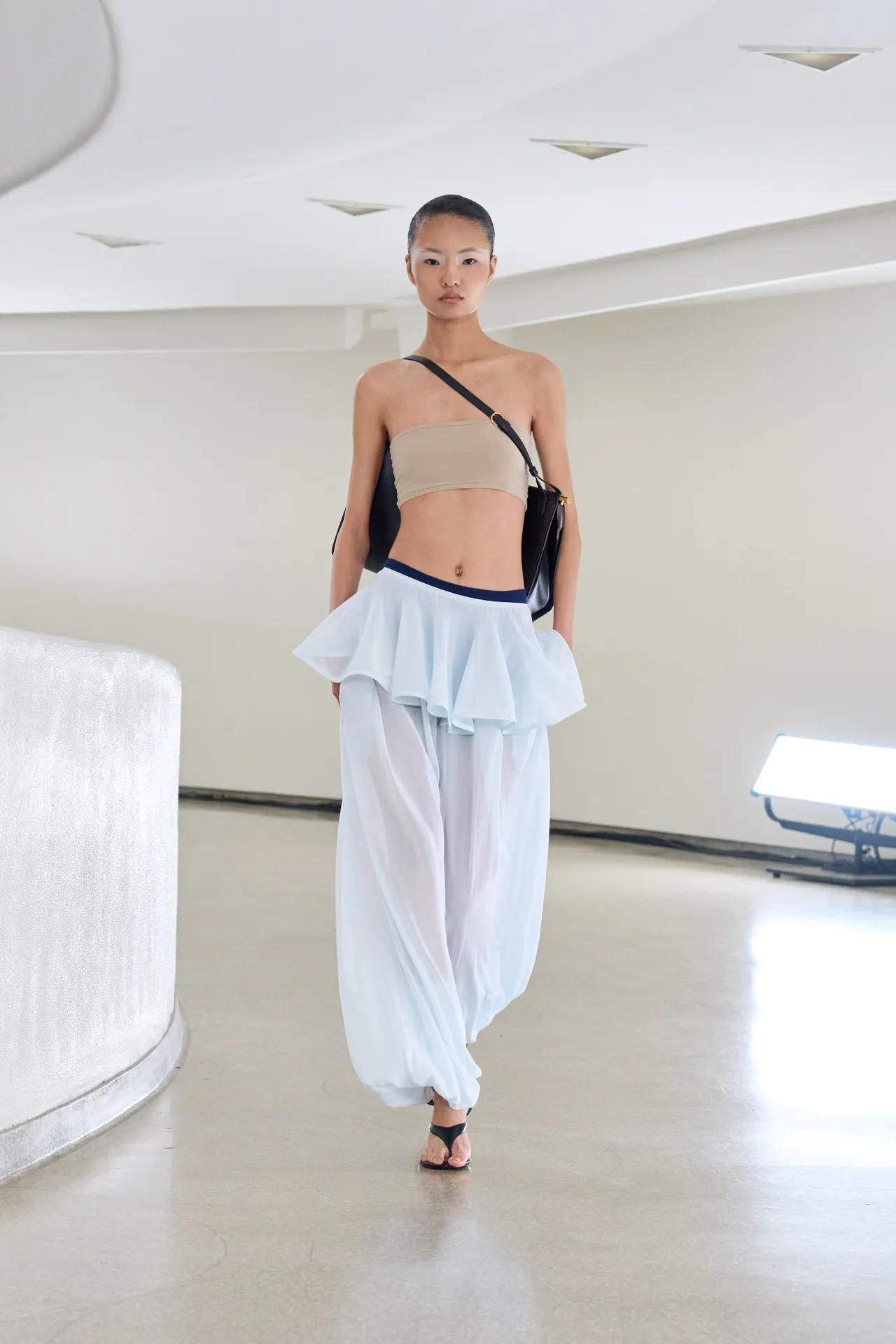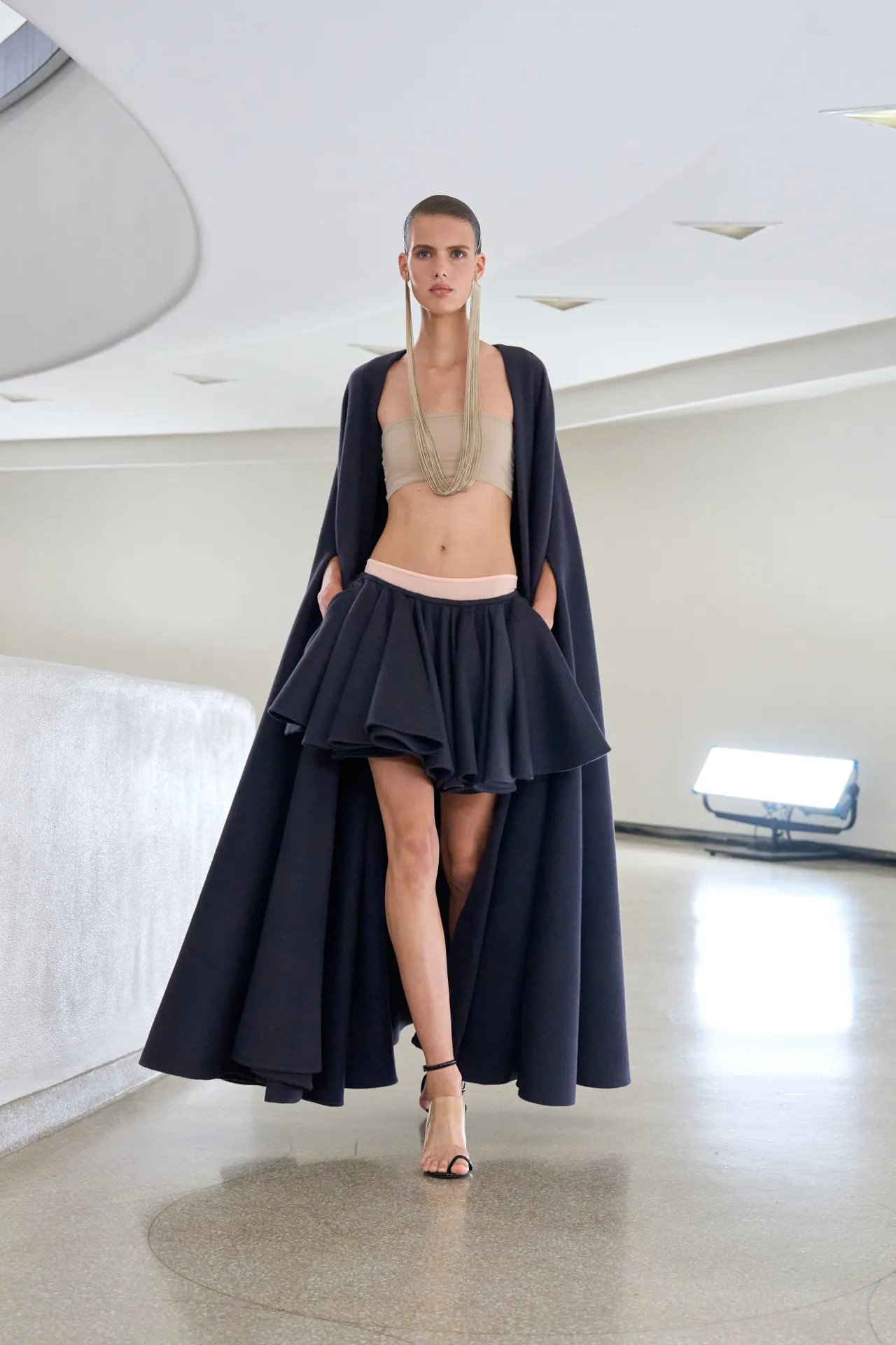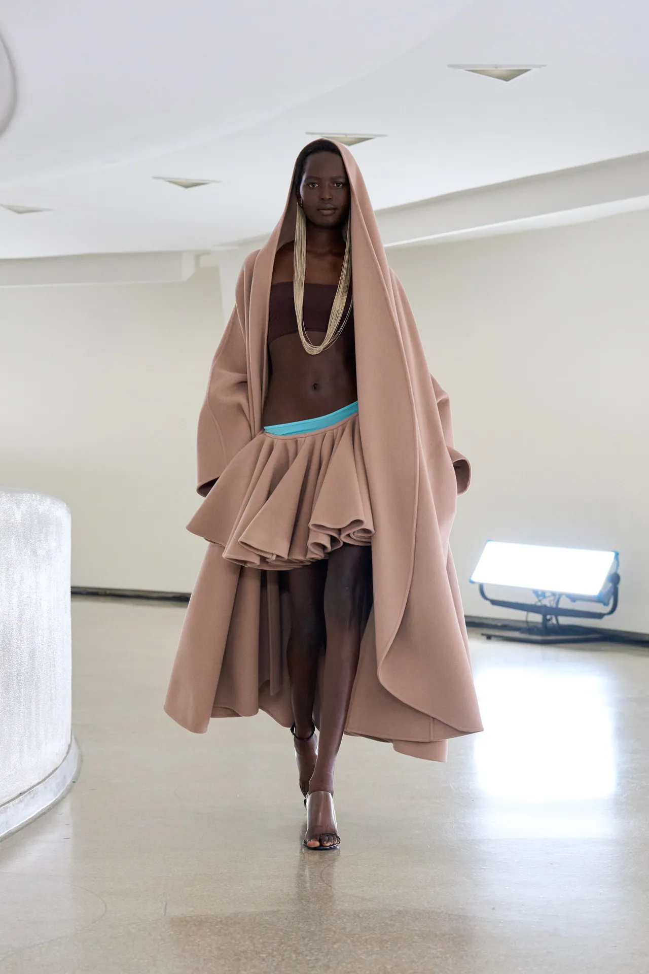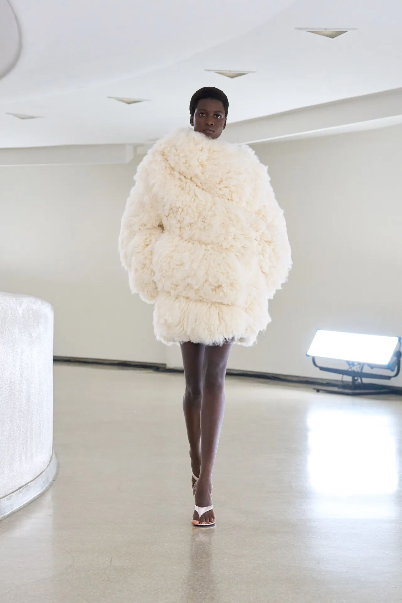 Ce défilé n’était pas seulement une ôde à la mode, mais aussi au cadre qui l’a accueilli et au pays dans lequel il se trouve. En effet, certaines pièces de la collection présentée rappelaient étrangement l'architecture du musée, comme le volumineux manteau de fourrure disposé comme si le morceau de pelage enroulait joliment le corps du mannequin sans demander son reste, présenté en ivoir et en rose saumon, ou encore les robes bustier à la jupe plissée présentées à la fin du show, au corsage composé de deux bandes arrondies semblant vouloir enrober le buste du mannequin. Mais le musée n’est pas la seule muse à avoir inspiré le directeur créatif. Féru de mode américaine, Mulier n’a pas hésité à mettre de côté ses origines européennes pour présenter une collection principalement inspirée de créateurs Américains. Les tops bandeaux assortis d’une version chic et élégante de pantalons de survêtement tantôt en fishnet, tantôt transparent, tantôt en jean ont été inspirés des maillots Halston des années 70. Les manteaux à capuche et la cape accompagnée d’une minijupe patineuse ont été tirés des créations de Pauline Trigère (styliste aux origines françaises, mais bel et bien Américaine), tandis que les doudounes bouffantes à la silhouette pourtant très structurée ont été inspirées par le travail de Charles James.