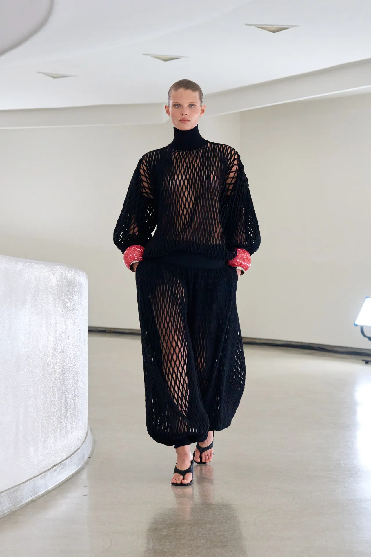 Une collection qui rend donc hommage à New York, la ville là où tout à commencé pour Alaïa et Mulier, de la plus belle des manières et qui justifie de plus belle le choix de la localisation du défilé, qui aurait probablement été incompris par la Ville Lumière. Dans ce show, les prouesses fashion de Pieter Mulier se sont mêlées à l’inventivité de Frank Lloyd Wright (architecte du musée) et à l’ADN d’Azzedine Alaïa, offrant au public un condensé de silhouettes jouant avec les lois de la gravité à l’allure étourdissante. Et si dans le dernier show présenté en janvier dernier à Paris avec la collection prêt-à-porter F24 la star était le fil de mérinos, cette fois, c’est la continuité, non seulement du spectacle mais aussi des pièces : aucune fermeture, aucune bouton à l’horizon, tout se suit, rien ne s'interrompt. La soie et le taffetas sont coupés en des silhouettes harmonieuses, élevant le vêtement sportif en un uniforme de mode innovant et élégant qui incarne à la perfection la liberté du corps et de l'esprit.