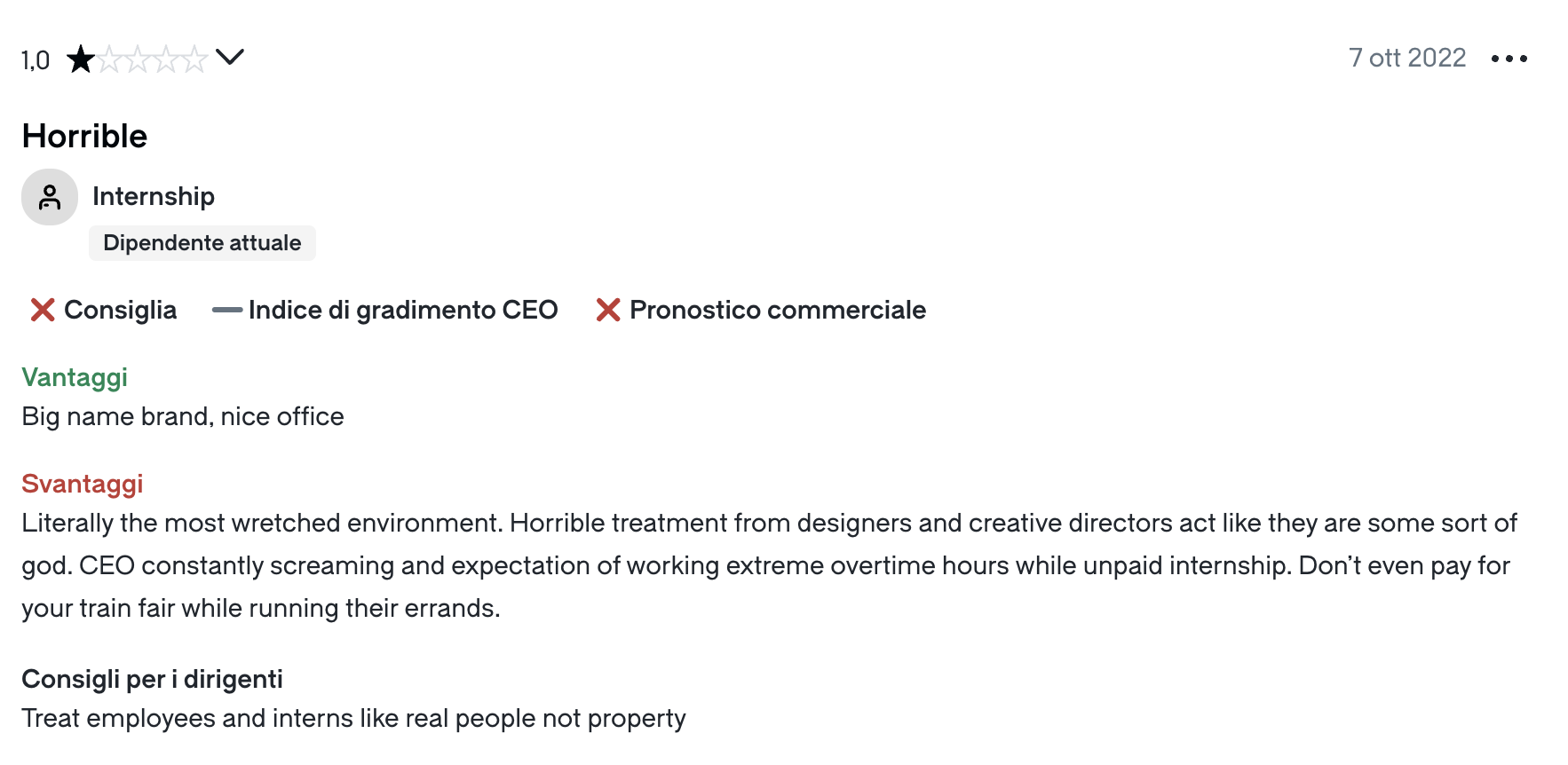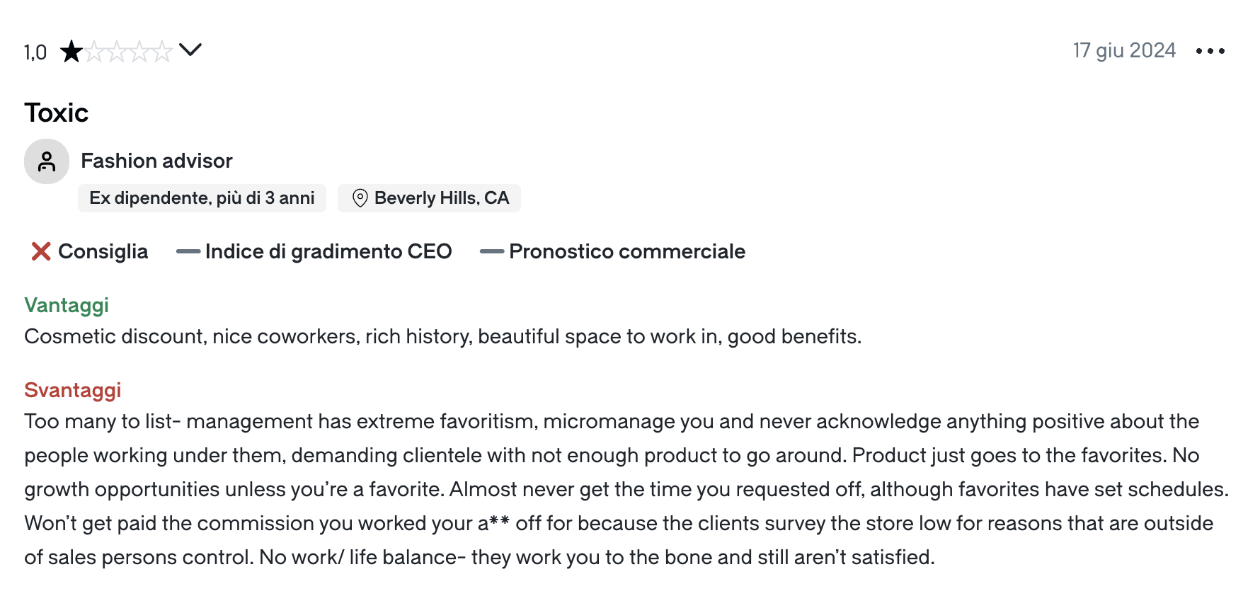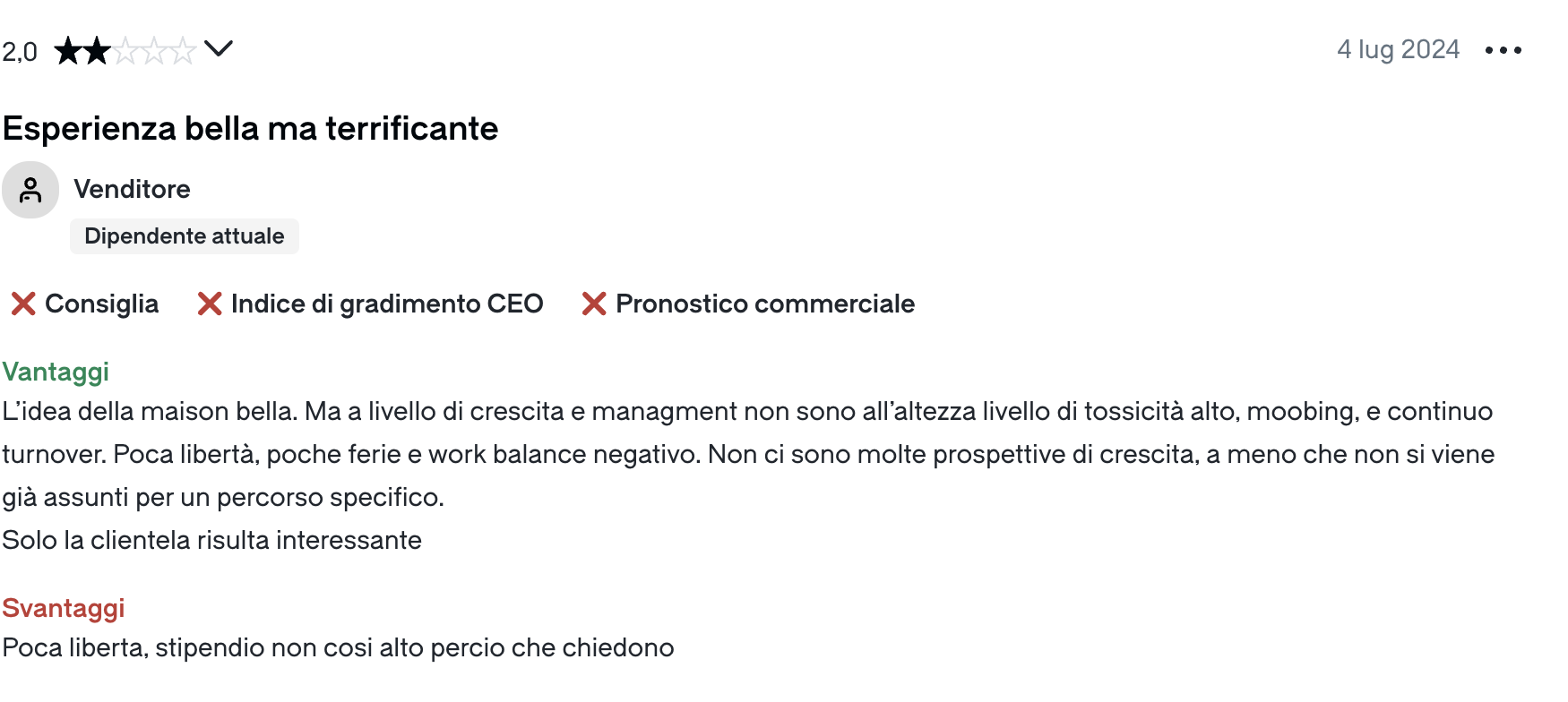 Quant aux grands groupes, LVMH et Kering maintiennent des scores généralement élevés, avec respectivement 3,9 et 3,7 étoiles, accompagnés de nombreux avis exprimant un grand respect pour le lieu de travail. Cependant, certaines disparités émergent au sein du Groupe Prada : tandis que Miu Miu peine à dépasser les 3 étoiles, avec de nombreuses critiques adressées à la direction, Prada se conforme à la moyenne des marques de luxe, obtenant 3,5 étoiles. Néanmoins, aucune marque n'est à l'abri des nombreux avis négatifs signalant des horaires de travail frénétiques, un équilibre entre vie professionnelle et vie privée quasiment inexistant et, dans certains cas, des abus verbaux de la part des dirigeants.