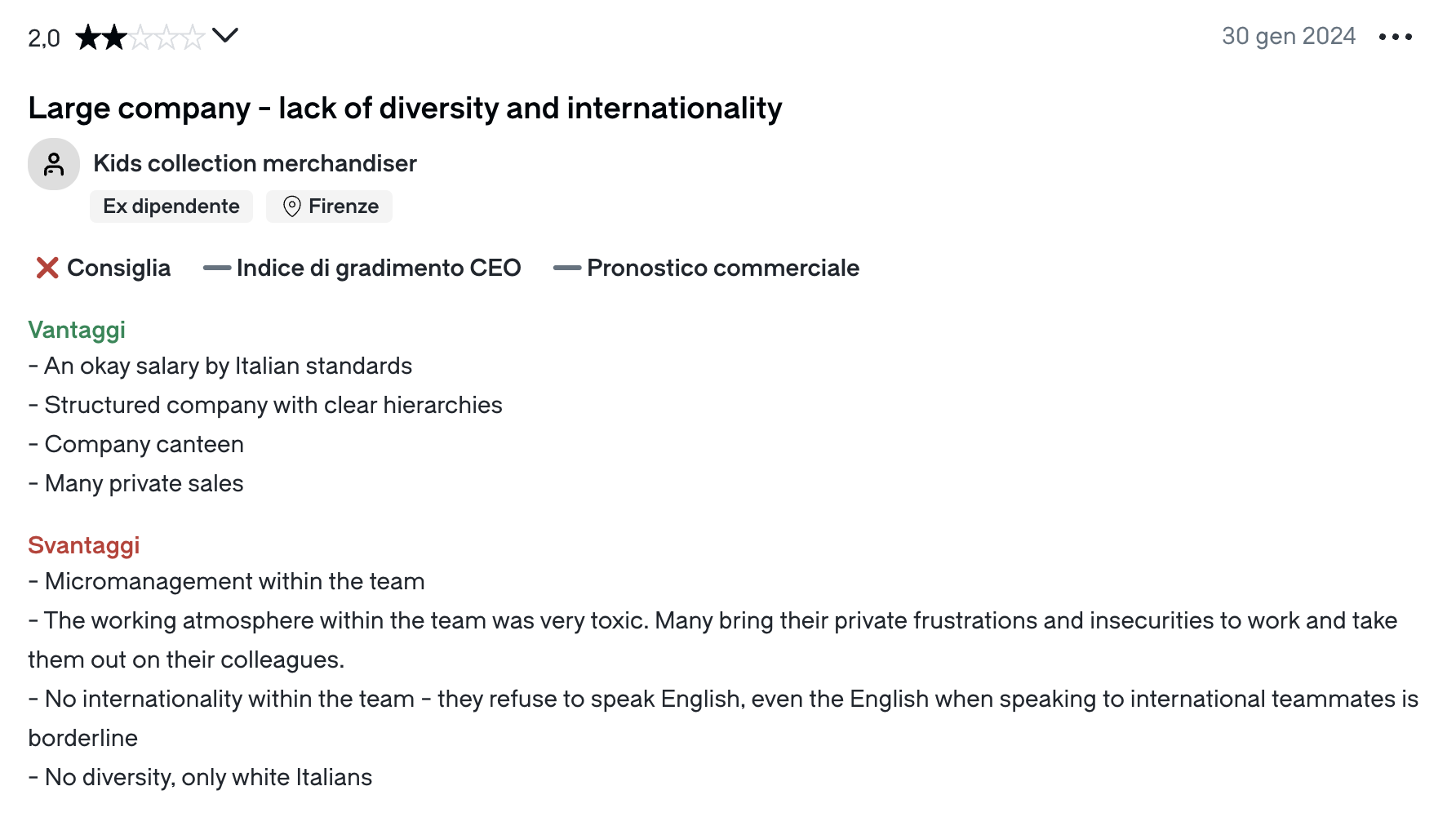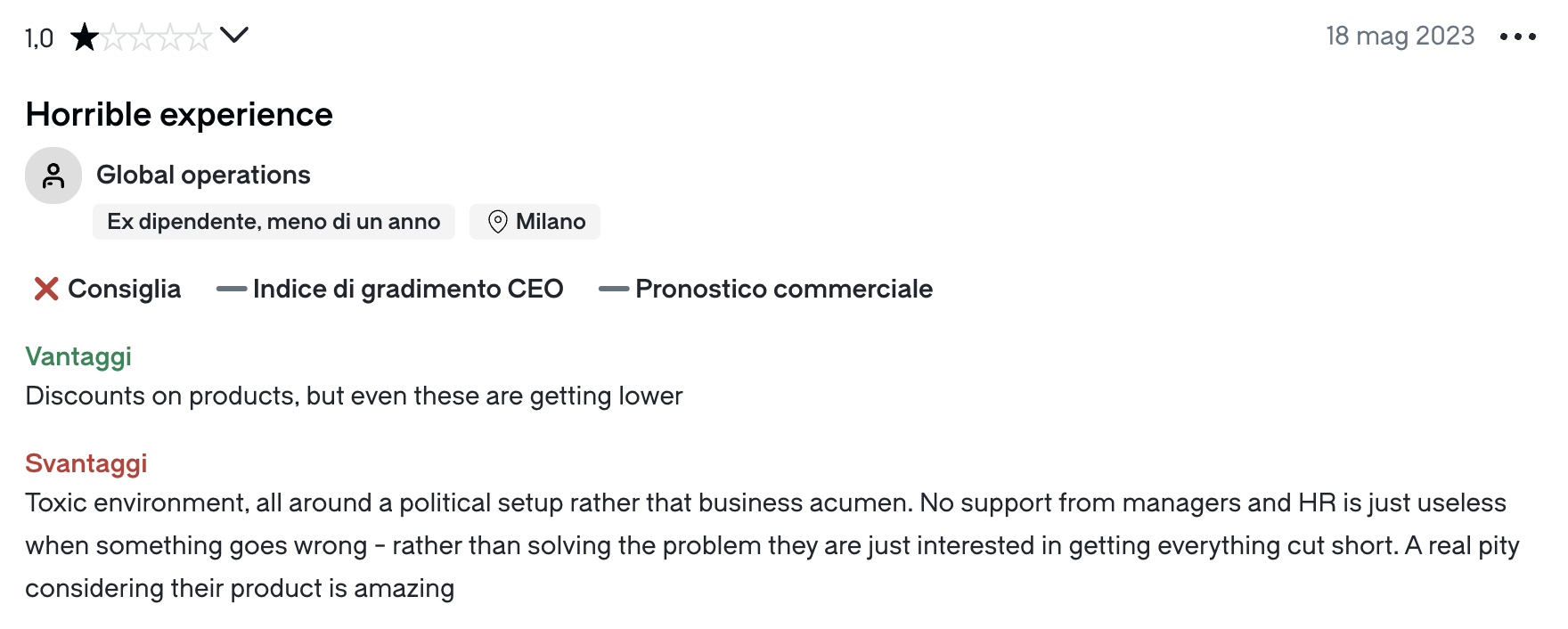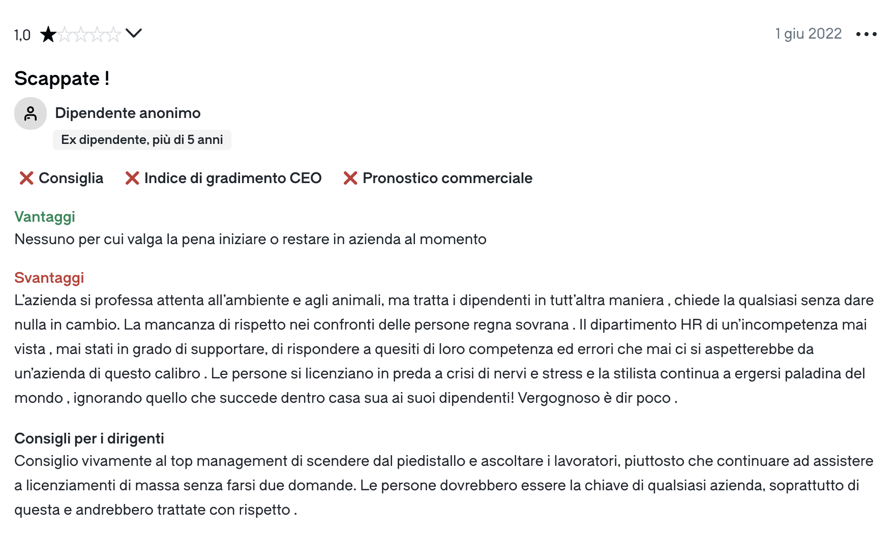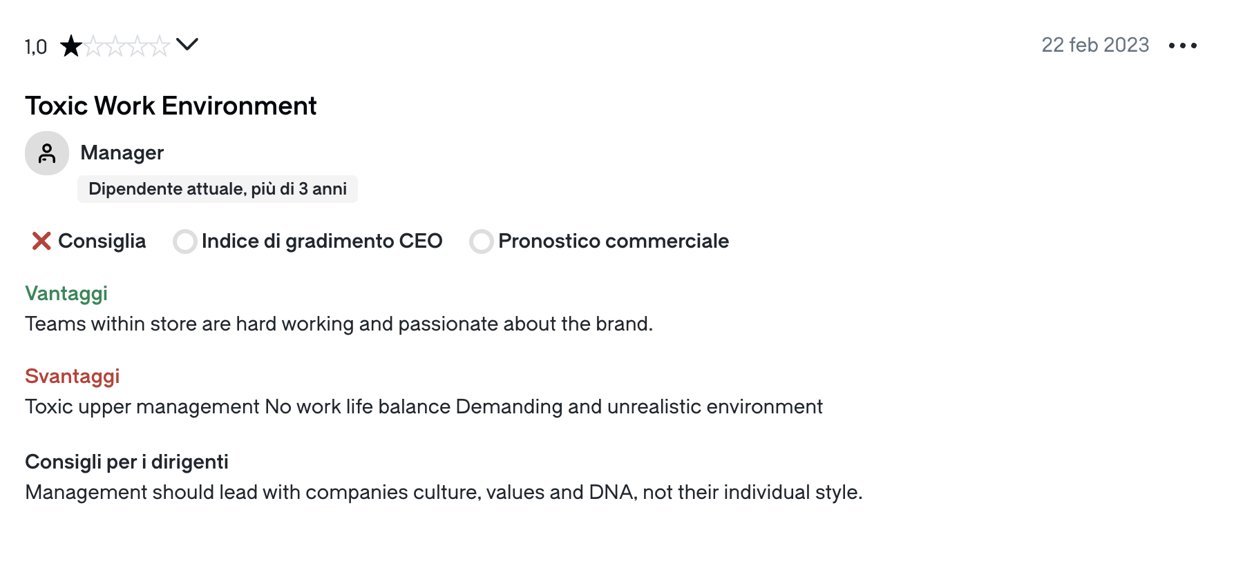 Quant aux grands groupes, LVMH et Kering maintiennent des scores généralement élevés, avec respectivement 3,9 et 3,7 étoiles, accompagnés de nombreux avis exprimant un grand respect pour le lieu de travail. Cependant, certaines disparités émergent au sein du Groupe Prada : tandis que Miu Miu peine à dépasser les 3 étoiles, avec de nombreuses critiques adressées à la direction, Prada se conforme à la moyenne des marques de luxe, obtenant 3,5 étoiles. Néanmoins, aucune marque n'est à l'abri des nombreux avis négatifs signalant des horaires de travail frénétiques, un équilibre entre vie professionnelle et vie privée quasiment inexistant et, dans certains cas, des abus verbaux de la part des dirigeants.