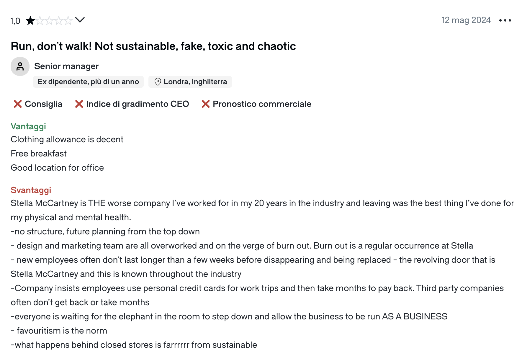 Les mises à jour de Glassdoor, en particulier la dernière, ont rendu la plateforme de plus en plus fiable, surtout grâce à l'authenticité des avis. En effet, il n'est pas possible de publier un avis sur une entreprise sans d'abord vérifier que la personne y a effectivement travaillé. Le document requis par la plateforme pour cette vérification ? Un bulletin de salaire ou, à défaut de ce dernier, une explication détaillée de la rémunération, comprenant les avantages, les jours de congé et d'autres informations pertinentes. Dans le monde de la mode, après les accusations portées contre Phoebe Philo et bien d'autres avant elle, il est devenu presque naturel de se demander comment se comportent les marques de luxe sur Glassdoor avant d'envoyer une candidature. La marque de l'ancienne directrice créative de Celine a une moyenne de 1,3 étoiles, tandis que la plupart des maisons de mode se situent autour de 3,5 étoiles. Parmi les marques avec les meilleures notes, on trouve Chanel, Hermès et Alexander McQueen, ce dernier ayant la meilleure note avec 4,2 étoiles. En revanche, parmi les marques avec les notes les plus basses, on trouve Stella McCartney et Oscar De La Renta, qui restent sous les trois étoiles. La majorité des avis négatifs pour ces marques concerne les longues et épuisantes heures de travail et l'environnement toxique dans les bureaux.