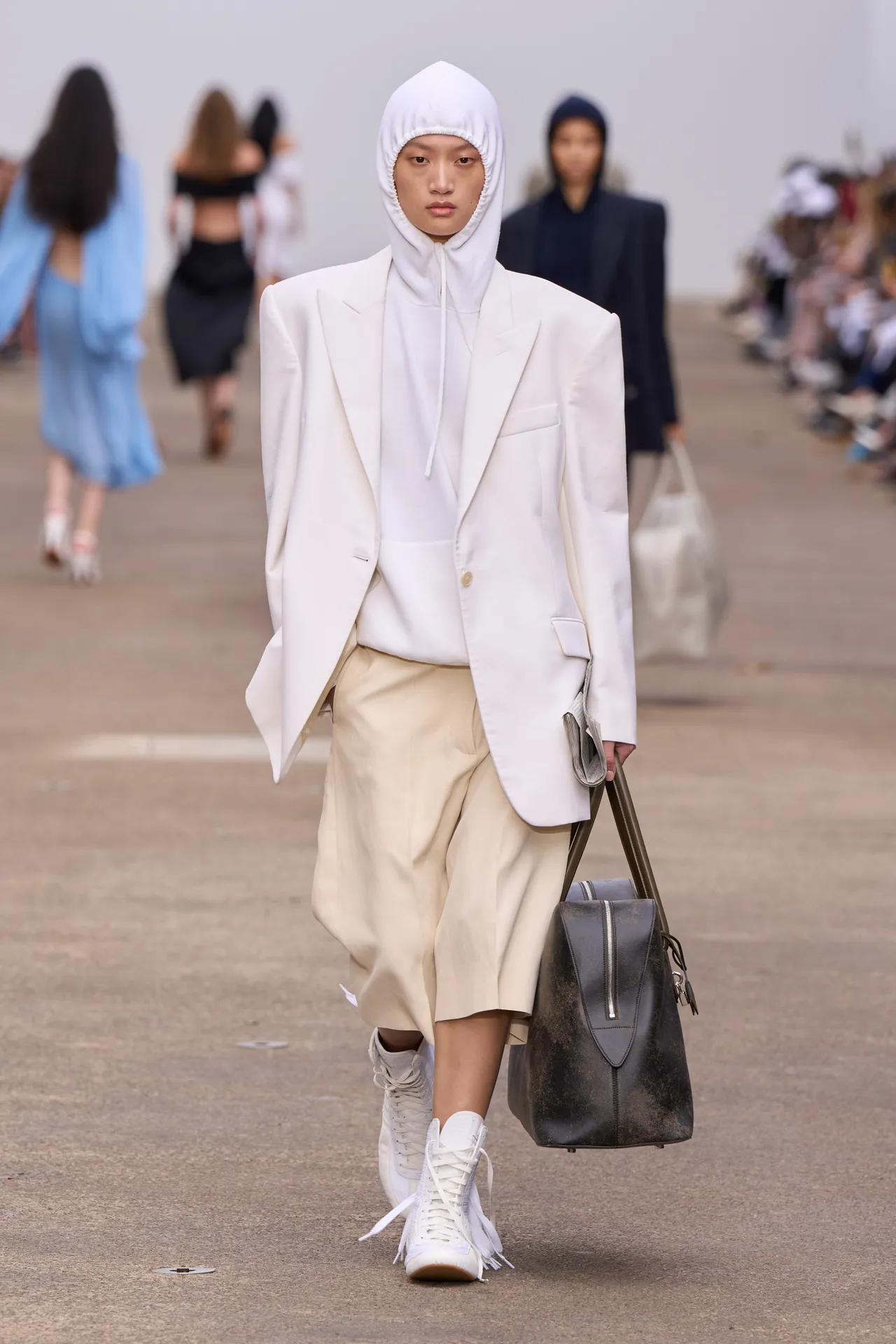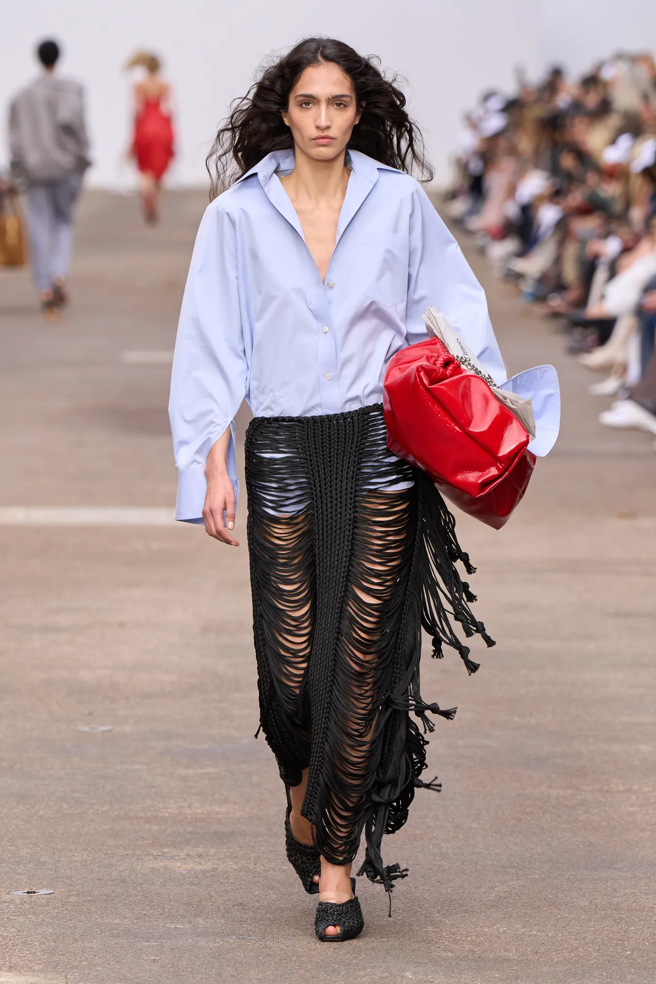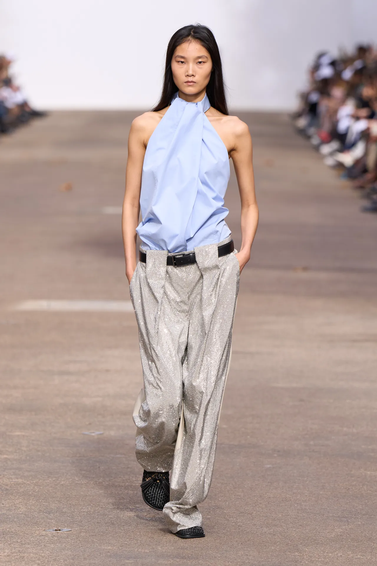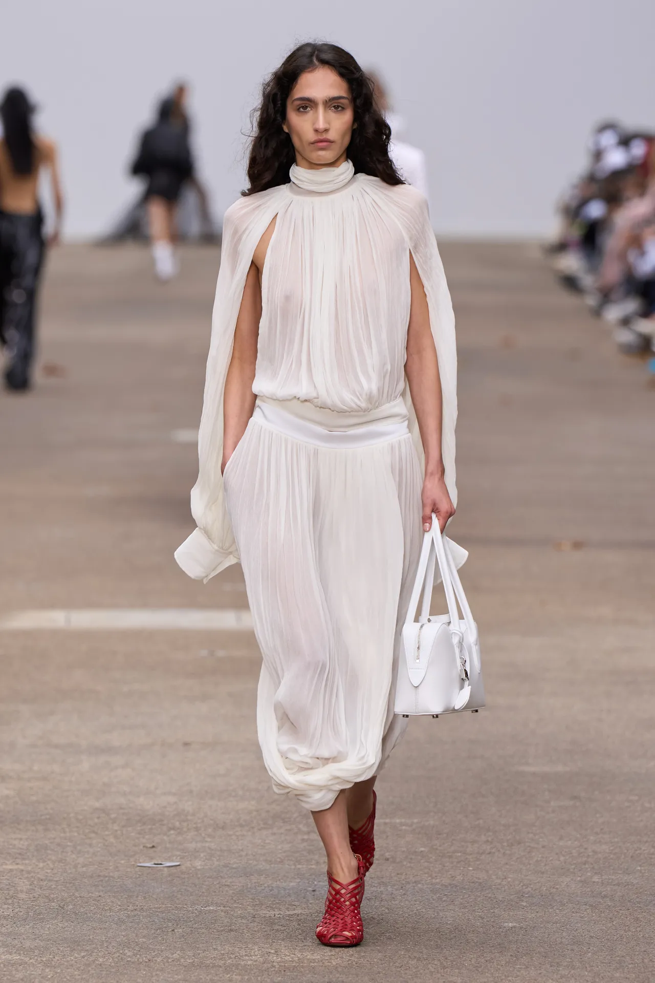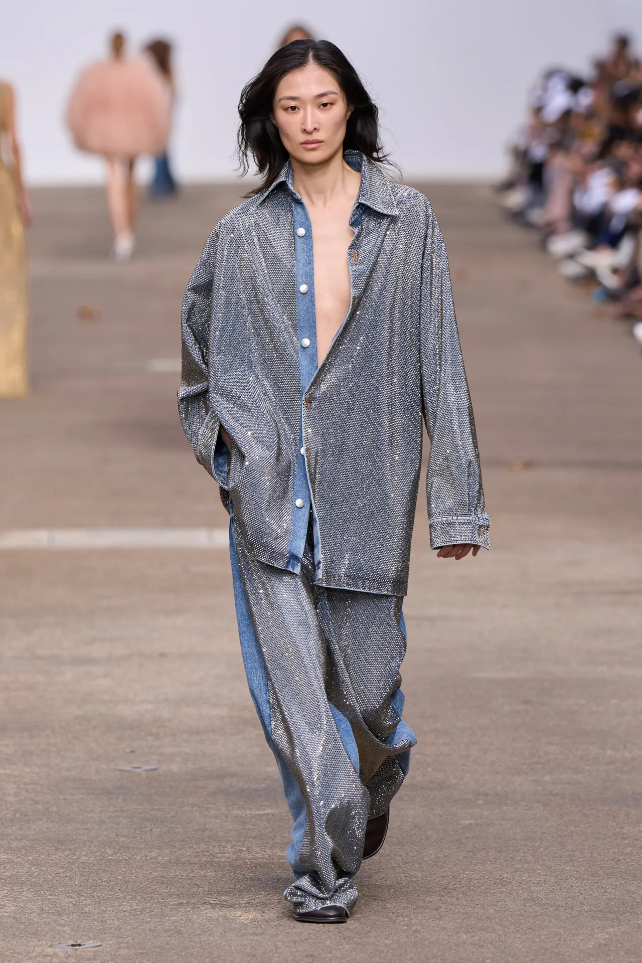 La collection se divise principalement en deux catégories: d’un côté, on retrouve les tailleurs à épaulettes et les pantalons amples, semblant sortir tout droit du dressing oublié mais pourtant bien fourni d’un papa des années 80 - à porter de jour - et les robes plissées transparentes ainsi que de la lingerie délicate à porter de nuit. À la main des mannequins pend un nouveau modèle de sac de sport qui n’a pas manqué d’attirer l’attention du public: le Ryder, fabriqué évidemment en matériaux végétaliens et disponible dans toutes les tailles possibles et imaginables. Le tulle vaporeux se retrouve dans de nombreuses robes cette saison, aux côtés des perles argentées en franges, des tissus fluidement drapés, de dentelle transparente, de soie froissée et du denim, décoré de cristaux. Véritable démonstration de savoir-faire en matière de couture, de construction et de design, la collection met l'accent sur des silhouettes volumineuses avec ses robes bouffantes, ses larges épaulettes et ses ornements audacieux, et allie des pièces classiques telles que des débardeurs et des pantalons en cuir végétalien, trouvant ainsi le parfait équilibre entre minimalisme et maximalisme des temps modernes. En plus des cuirs végétaliens, la créatrice a également eu recours à des bouteilles en plastique recyclées afin de fabriquer des robes qui semblent pourtant tout sauf en plastique. Un choix avant tout éco-responsable, très attendu de la part de Stella McCartney qui n’en est plus à ses premières armes en matière d'innovations écologiques, mais effectué également dans un élan activiste, l’essence même de sa collection.