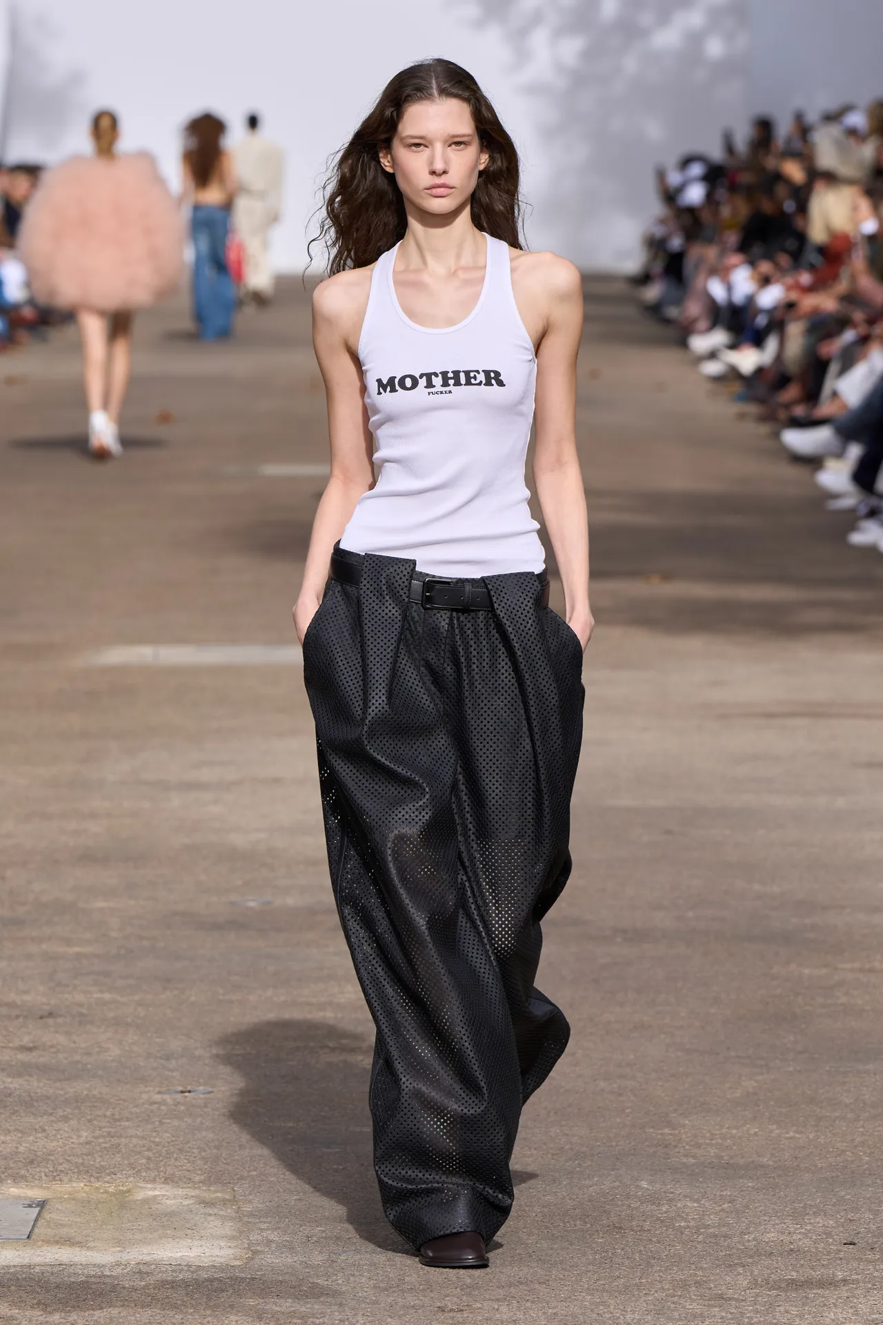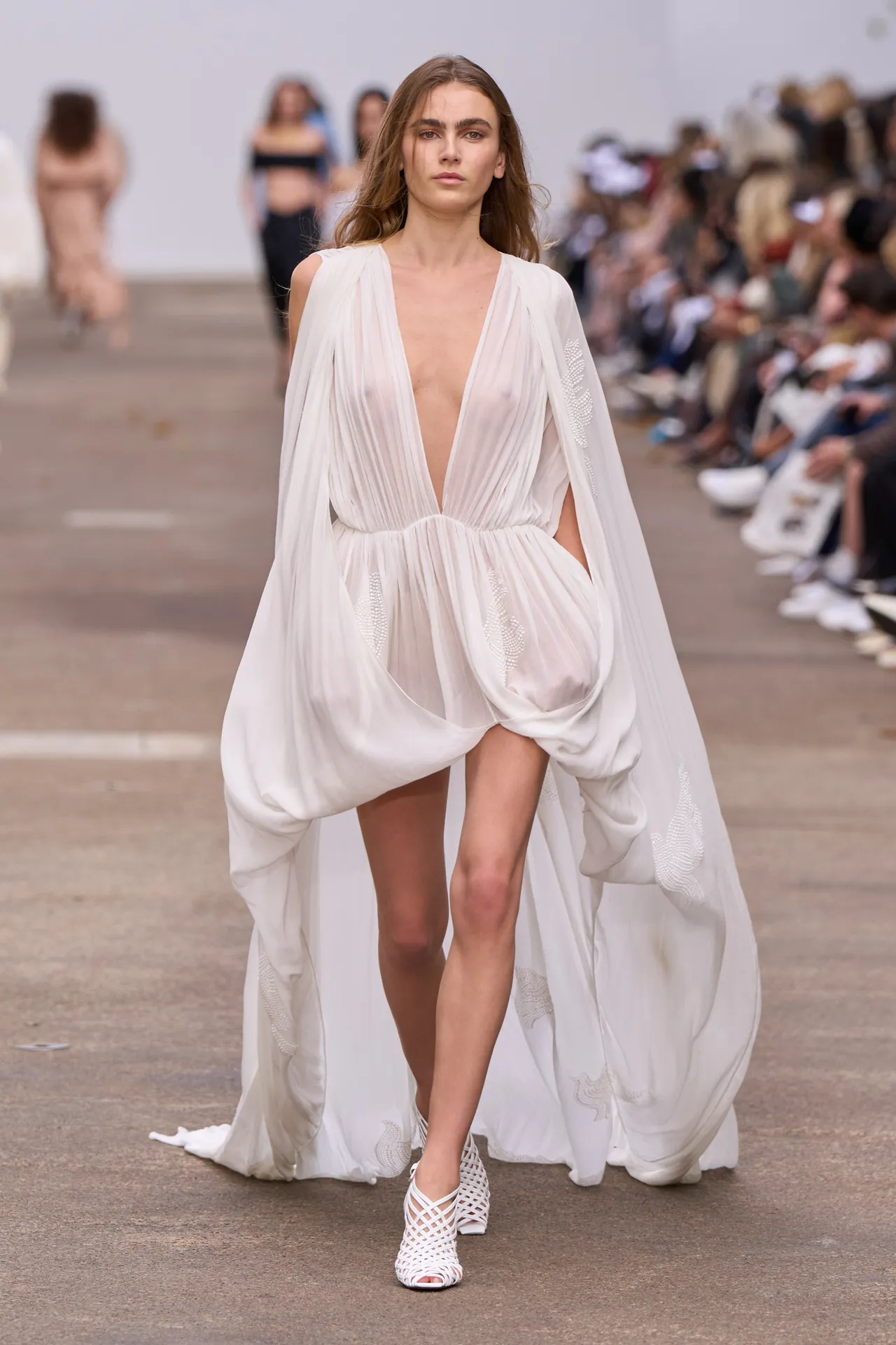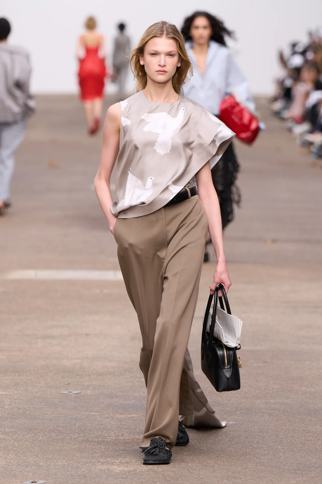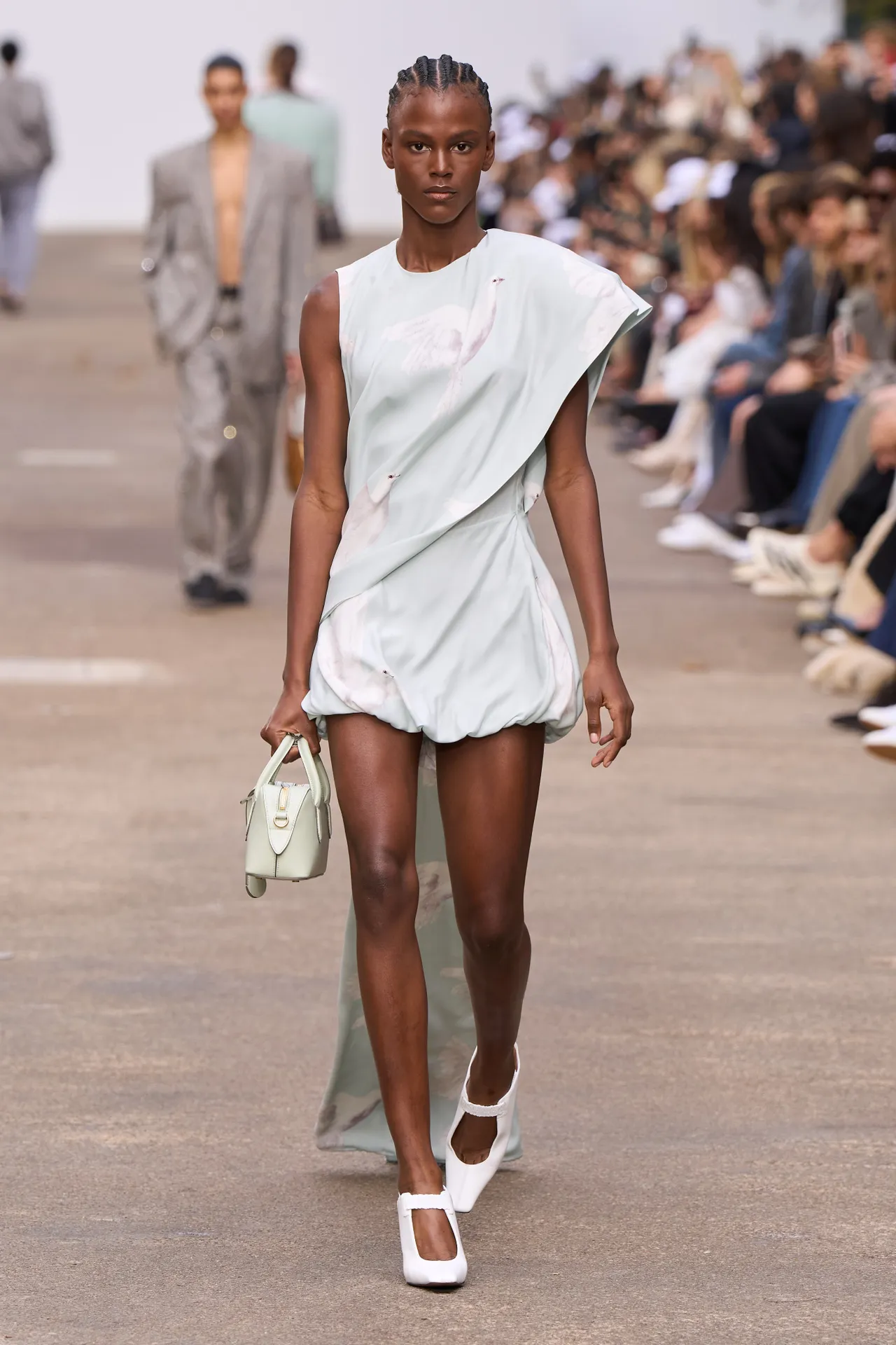 Hier, sous un ciel ouvert - terrain de jeux de tous les oiseaux de Paris - gris mais miraculeusement sec pour une fin de mois de septembre, était présentée la collection SS25 de Stella McCartney. Après un manifesto narré par Helen Mirren, invitant son audimat à sauver ce que l’on aime tant qu’il en est encore temps, les mannequins entrent et marchent en rythme sur When Doves Cry de Prince, un titre minutieusement choisi non pas pour le vibrato impressionnant de son interprète mais surtout pour le message qu’il délivre. En effet, le thème principal autour duquel s'articule la collection entière est celui des oiseaux, dans un subtil et poétique appel à l’aide mais surtout dans une incitation à les protéger quoi qu’il en coûte. Mais ne nous méprenons pas : pas de fausses plumes de piètre qualité ou de tenues d’autruches exagérées sur le tarmac qui a fait office de podium au défilé hier matin, seulement des détails discrets, réalisés dans des couleurs parfois neutres parfois plus criardes, le tout dans un hommage équilibré et bien pensé à la nature et toutes les merveilles qui la composent.