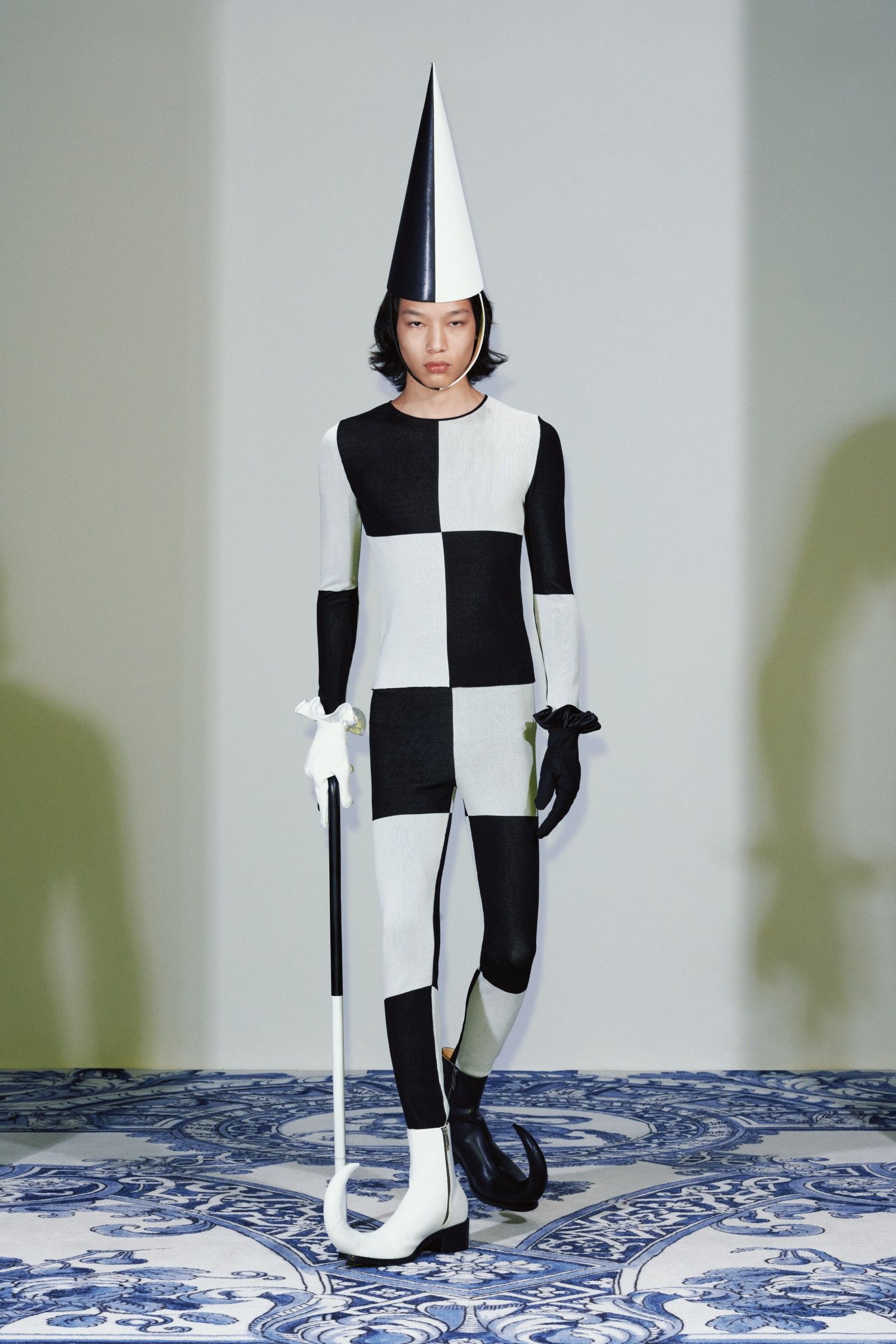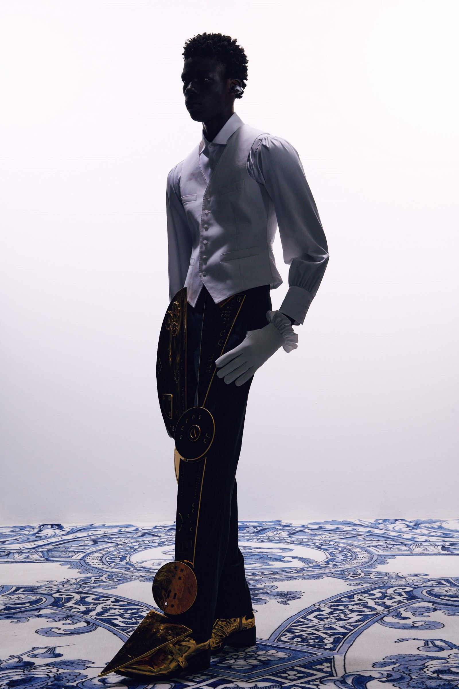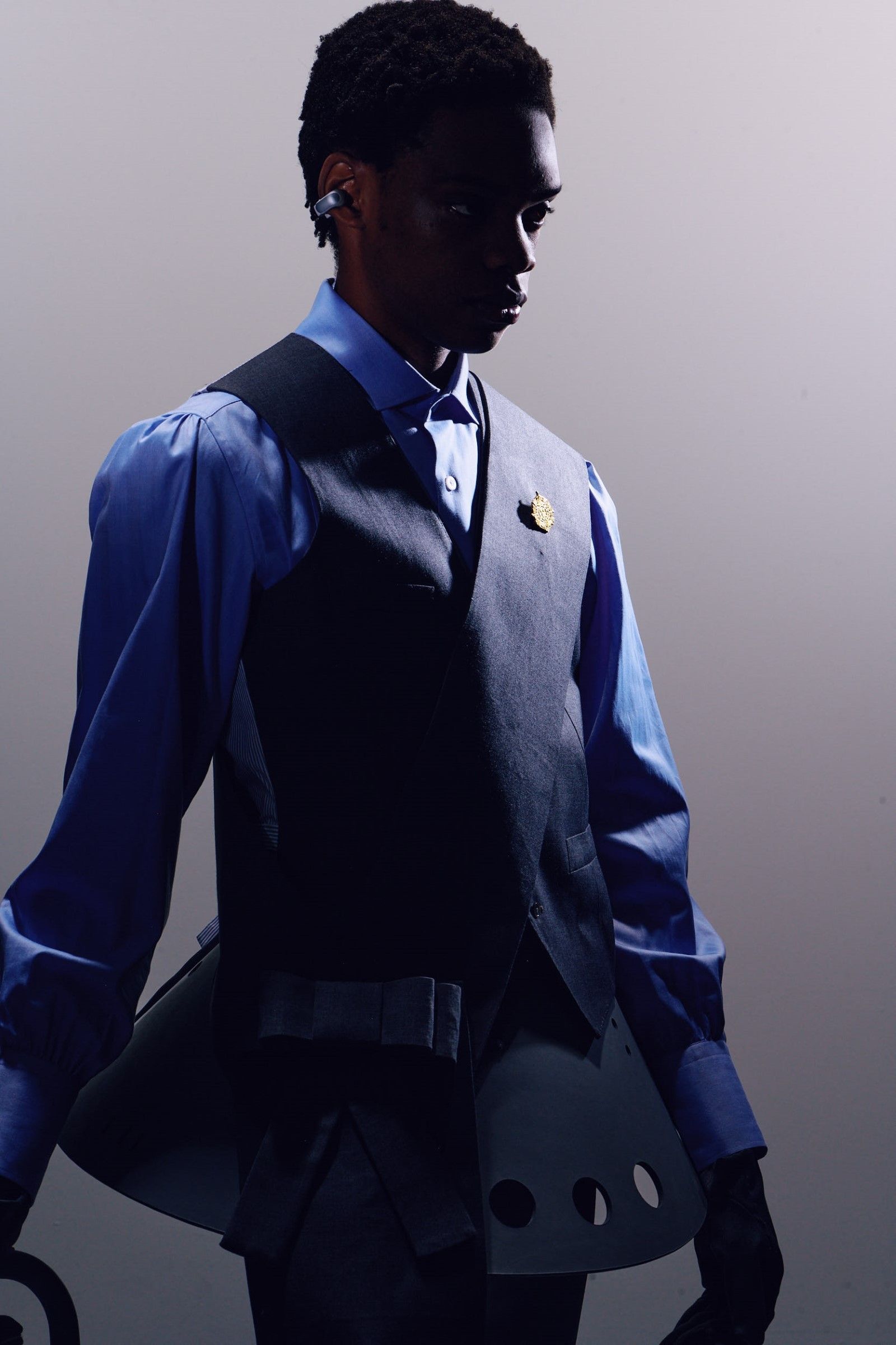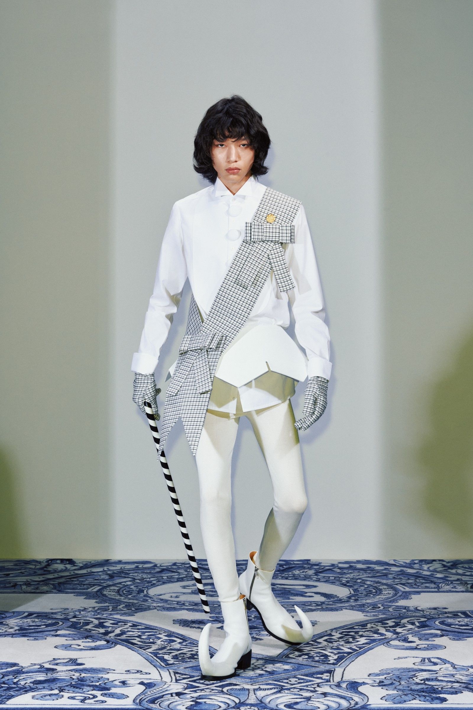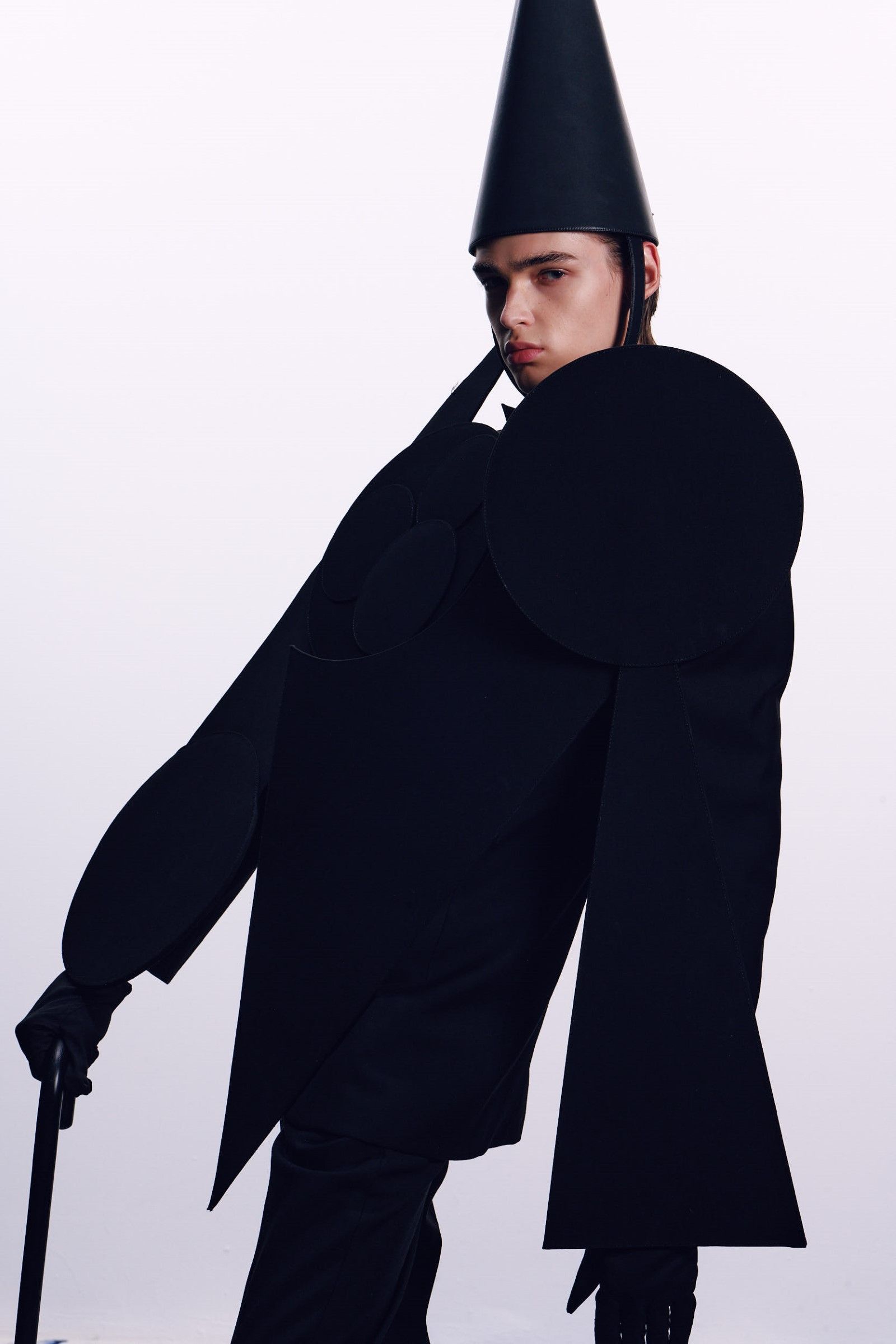 Ce qui est intéressant, cependant, en particulier pour le spectateur occidental, c'est que la collection ne dépend en réalité pas des tendances, mais se développe à partir d'une idée autonome et est donc dotée d'une stature indépendante propre. «Nous explorons différentes possibilités de recombiner les éléments. Les rendre familiers mais nouveaux», explique-t-il. «C'est le surréalisme de la réalité que nous voulons toujours exprimer dans nos projets». Un exemple notable est le traitement du motif en losange d'Arlequin, traditionnellement associé aux personnages comiques de la commedia dell'arte. En inversant et en reconfigurant les formes des losanges, Zhou a créé des motifs géométriques, réimaginant les cols et les poignets en formes géométriques modernes qui conservent un clin d'œil ludique à leurs racines historiques. «Au début, mon point de départ était : comment ces éléments 'ornementaux' peuvent-ils perdre leur sens d'ornementation ? Nous devions les traduire dans le vocabulaire de XANDER ZHOU». Au cœur d'ANACHRONOTALE, il y a une exploration de l'équilibre entre l'élégance et le grotesque — un thème reflété dans les silhouettes dramatiques et les détails complexes de la collection. Les pointes des poulaines, par exemple, rappellent les chaussures médiévales européennes avec des courbes exagérées, symbolisant à la fois le statut et l'absurdité. Zhou amplifie ce contraste en intégrant des motifs de science-fiction, créant une collection qui oscille entre la révérence historique et la fantaisie futuriste.