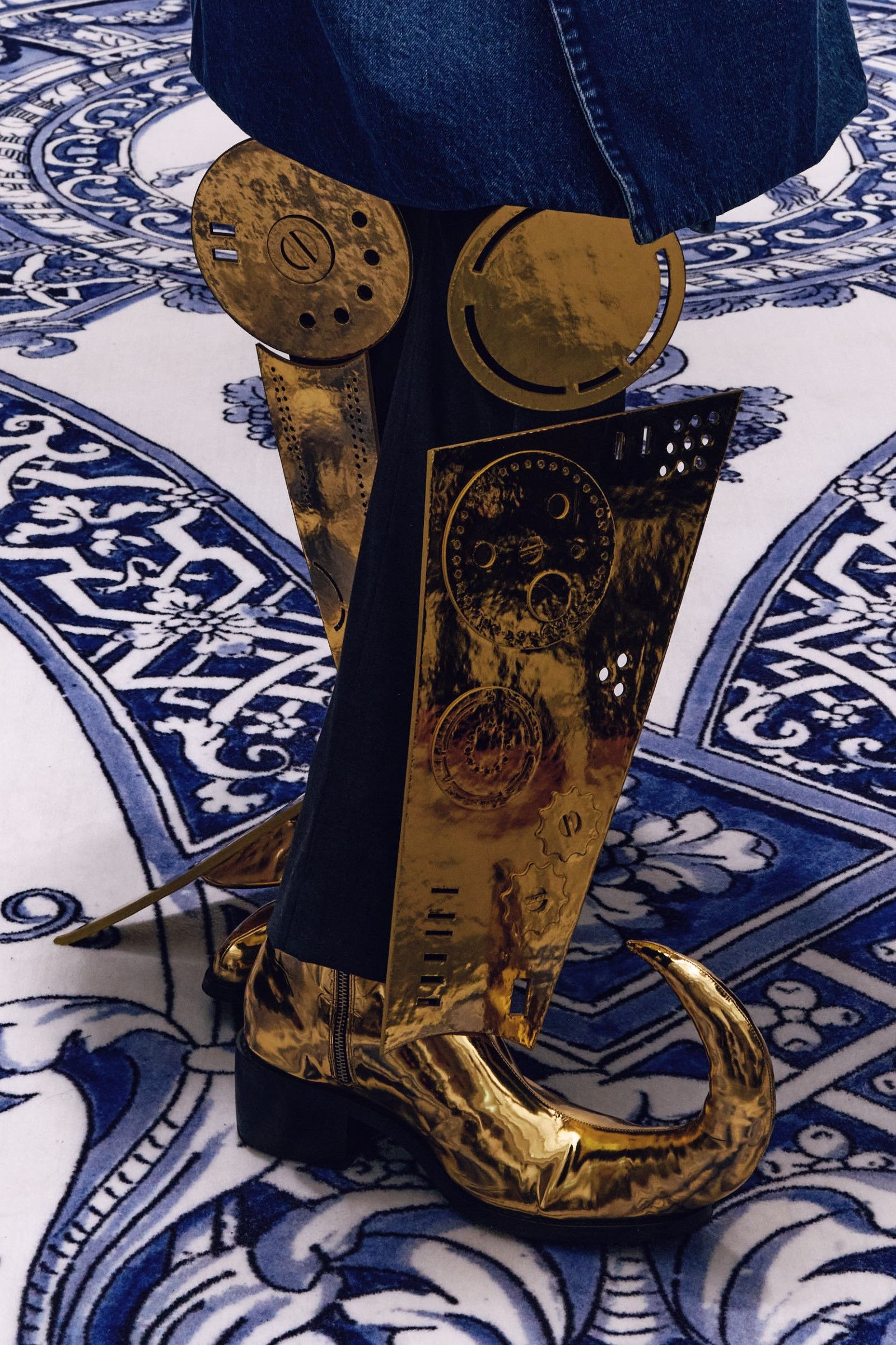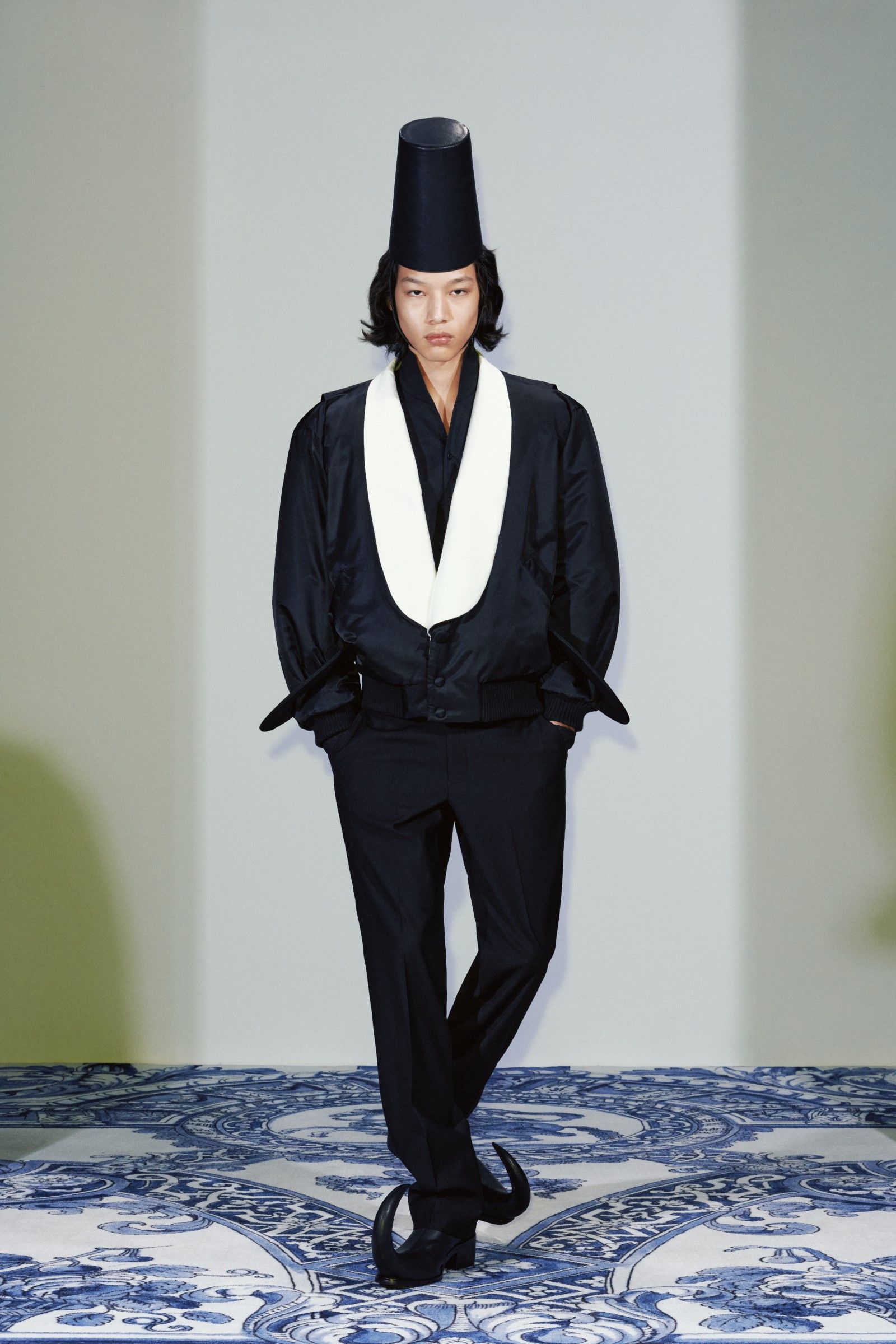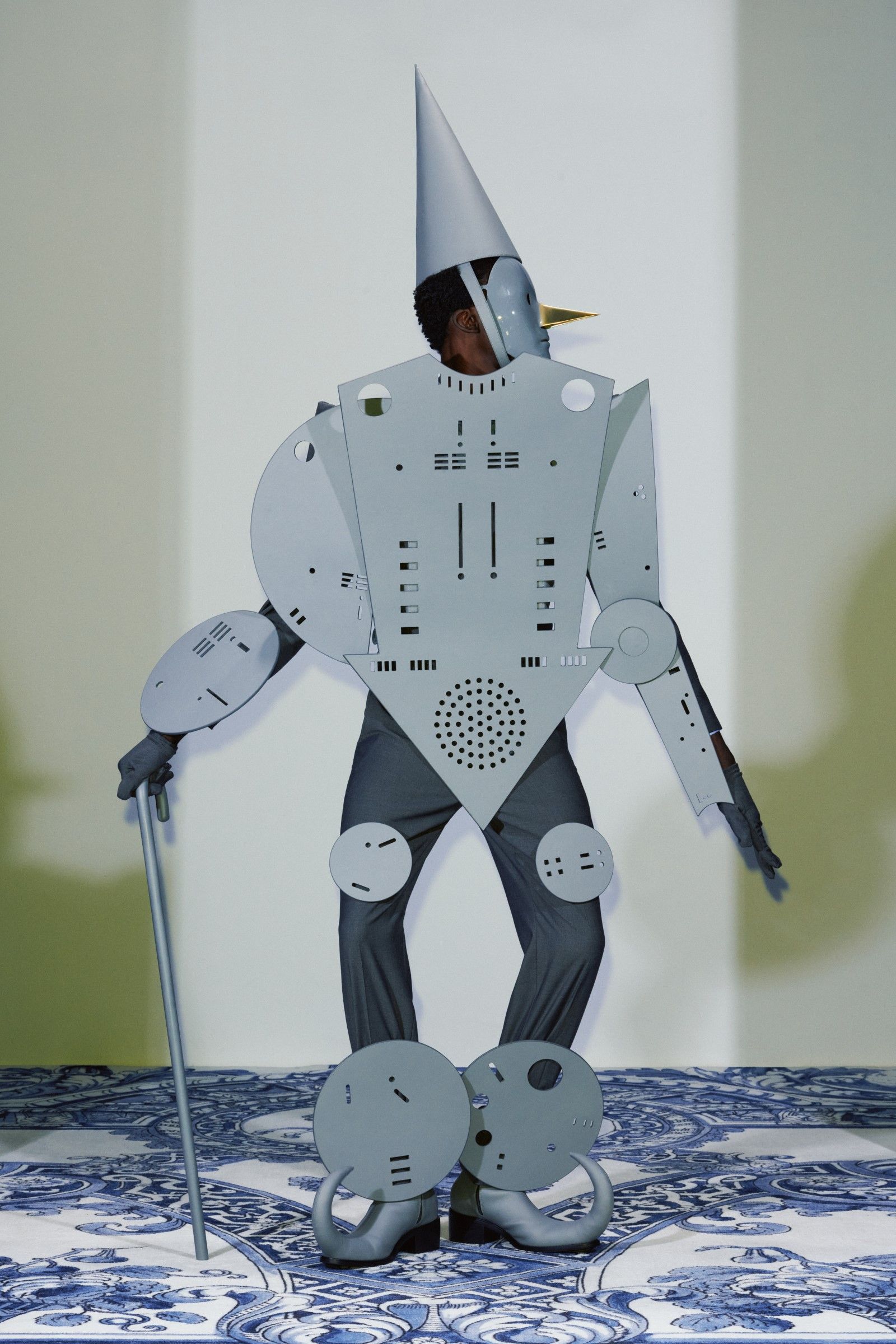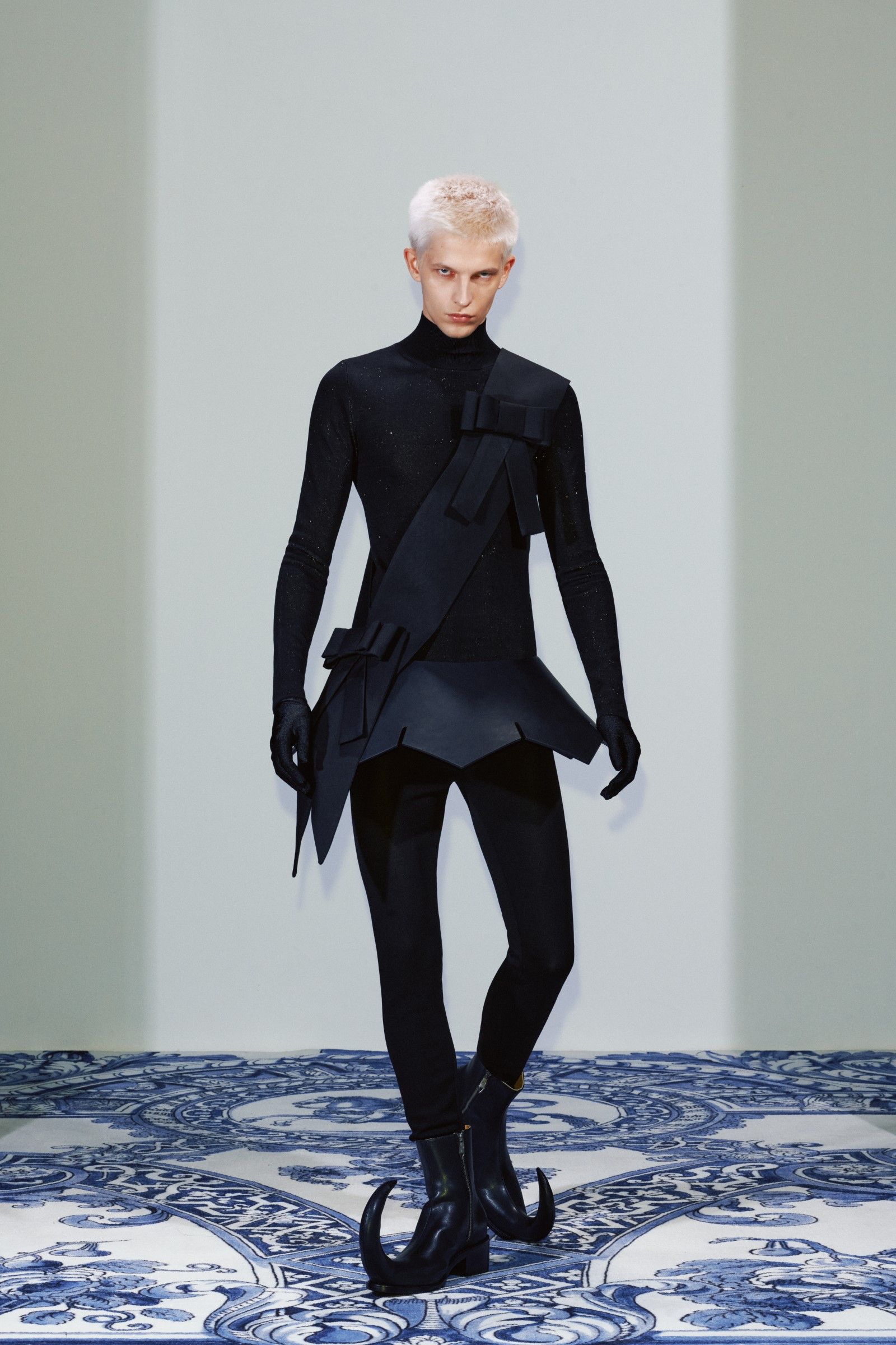 Ce qui est intéressant, cependant, en particulier pour le spectateur occidental, c'est que la collection ne dépend en réalité pas des tendances, mais se développe à partir d'une idée autonome et est donc dotée d'une stature indépendante propre. «Nous explorons différentes possibilités de recombiner les éléments. Les rendre familiers mais nouveaux», explique-t-il. «C'est le surréalisme de la réalité que nous voulons toujours exprimer dans nos projets». Un exemple notable est le traitement du motif en losange d'Arlequin, traditionnellement associé aux personnages comiques de la commedia dell'arte. En inversant et en reconfigurant les formes des losanges, Zhou a créé des motifs géométriques, réimaginant les cols et les poignets en formes géométriques modernes qui conservent un clin d'œil ludique à leurs racines historiques. «Au début, mon point de départ était : comment ces éléments 'ornementaux' peuvent-ils perdre leur sens d'ornementation ? Nous devions les traduire dans le vocabulaire de XANDER ZHOU». Au cœur d'ANACHRONOTALE, il y a une exploration de l'équilibre entre l'élégance et le grotesque — un thème reflété dans les silhouettes dramatiques et les détails complexes de la collection. Les pointes des poulaines, par exemple, rappellent les chaussures médiévales européennes avec des courbes exagérées, symbolisant à la fois le statut et l'absurdité. Zhou amplifie ce contraste en intégrant des motifs de science-fiction, créant une collection qui oscille entre la révérence historique et la fantaisie futuriste.