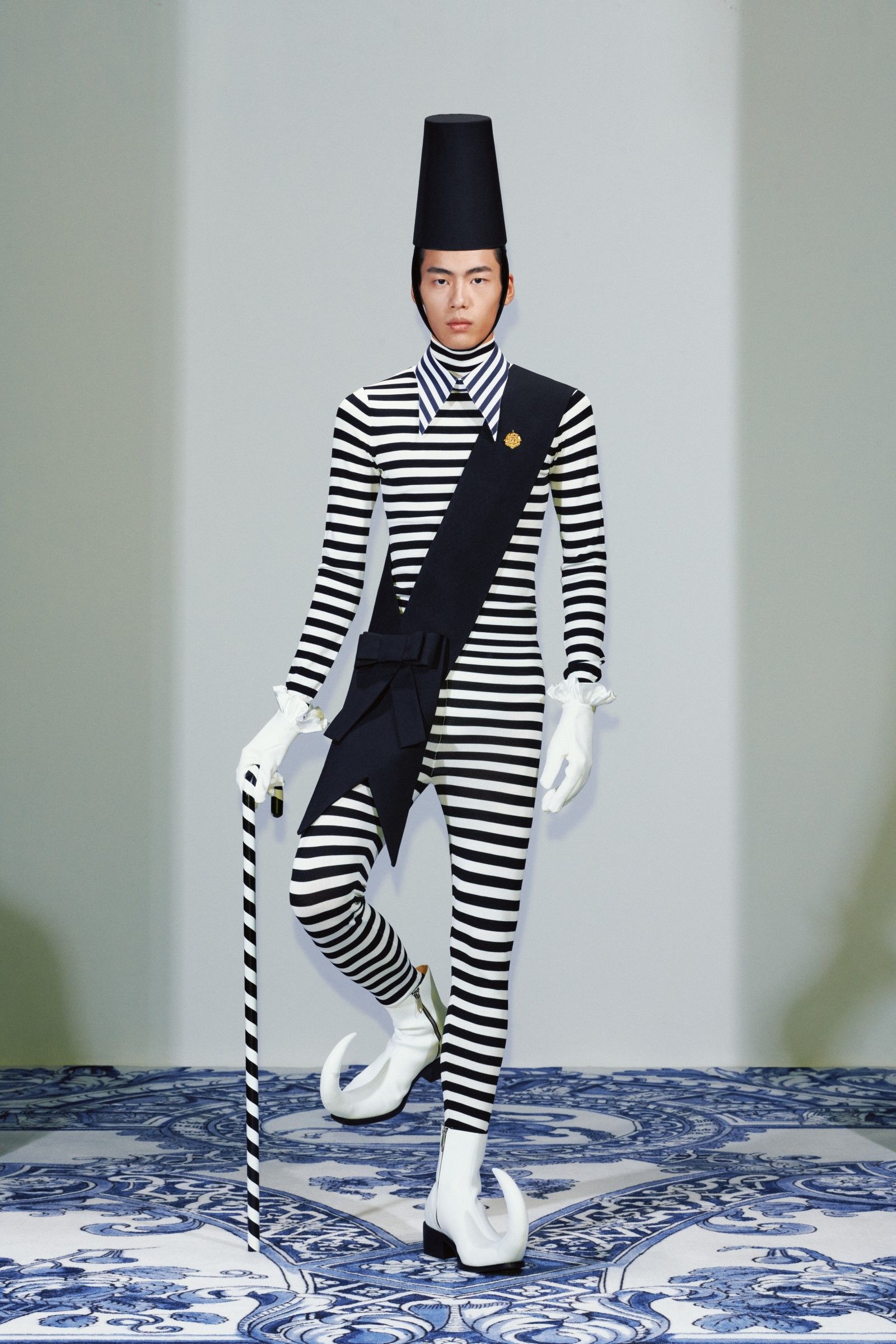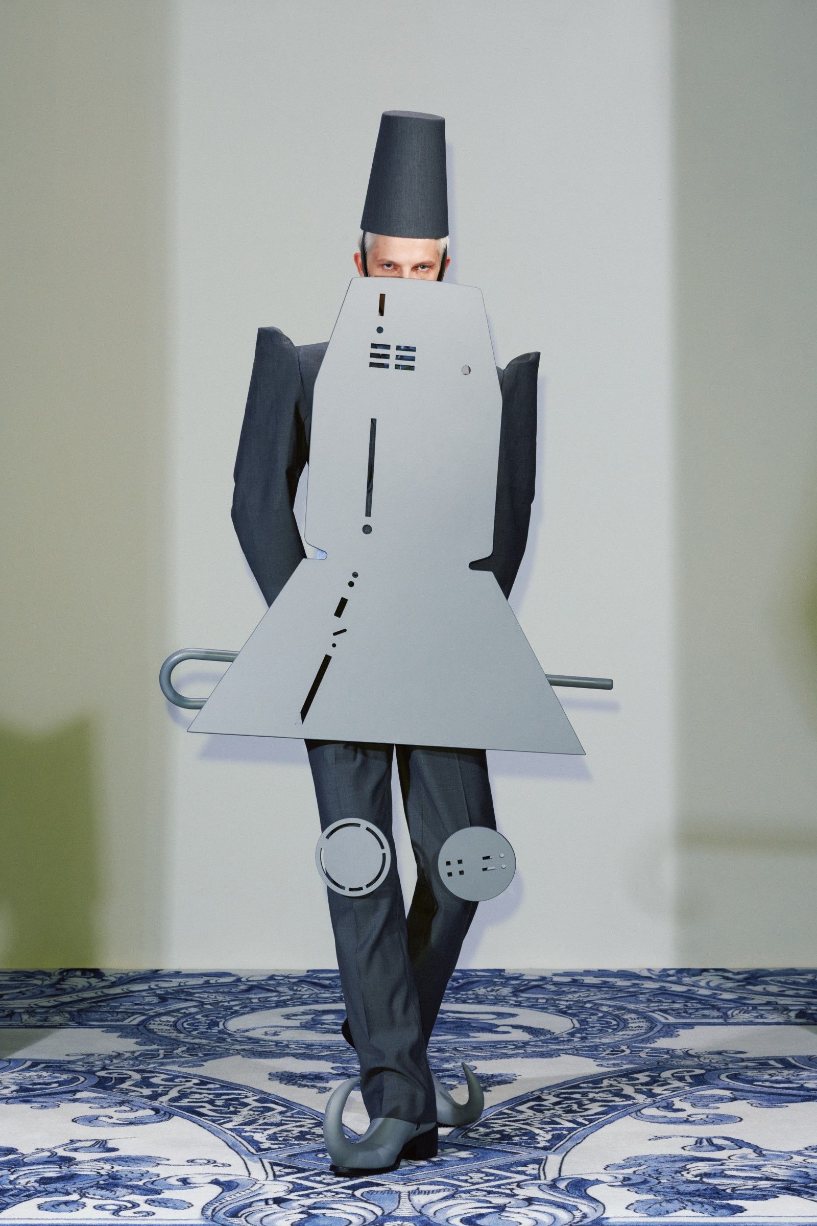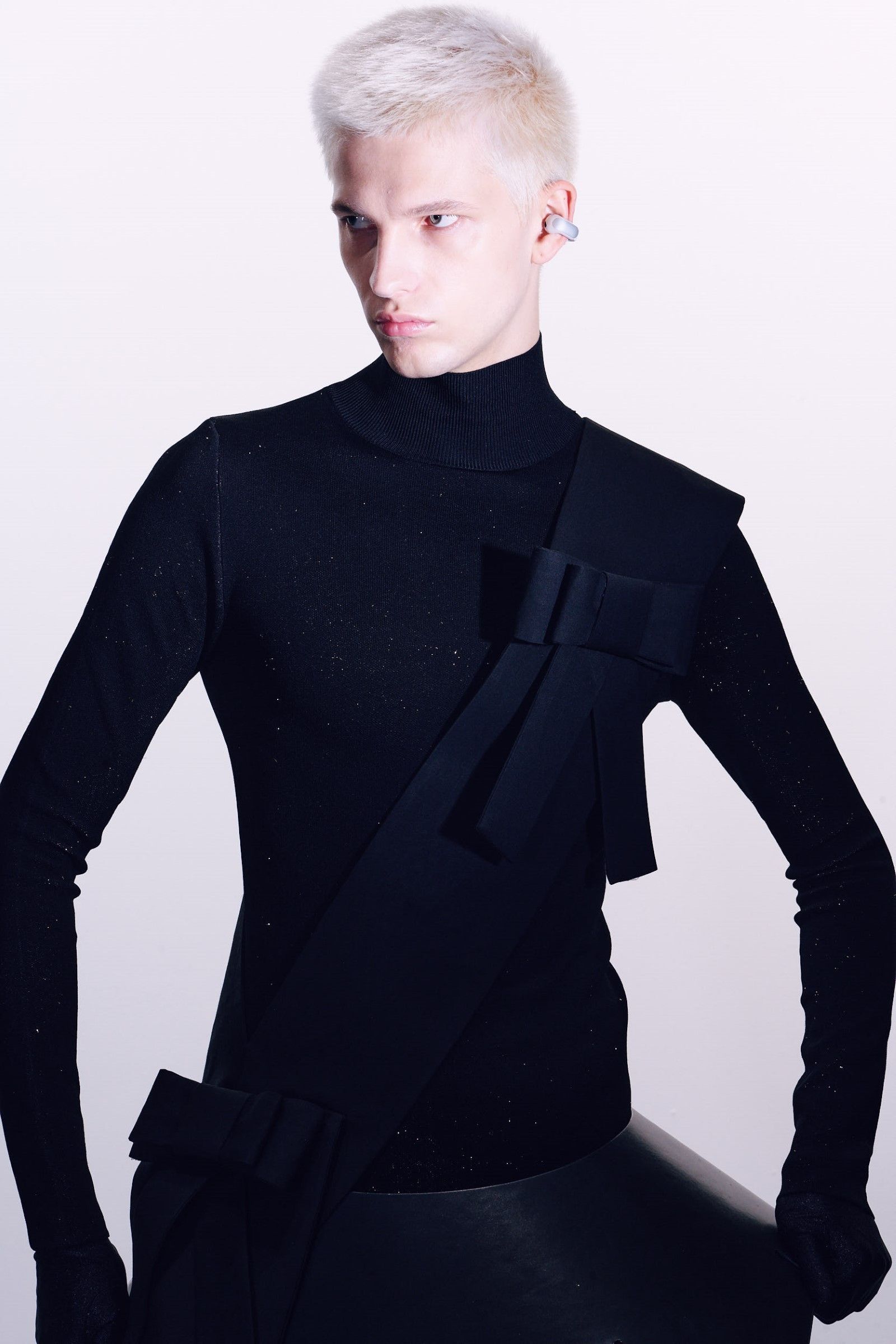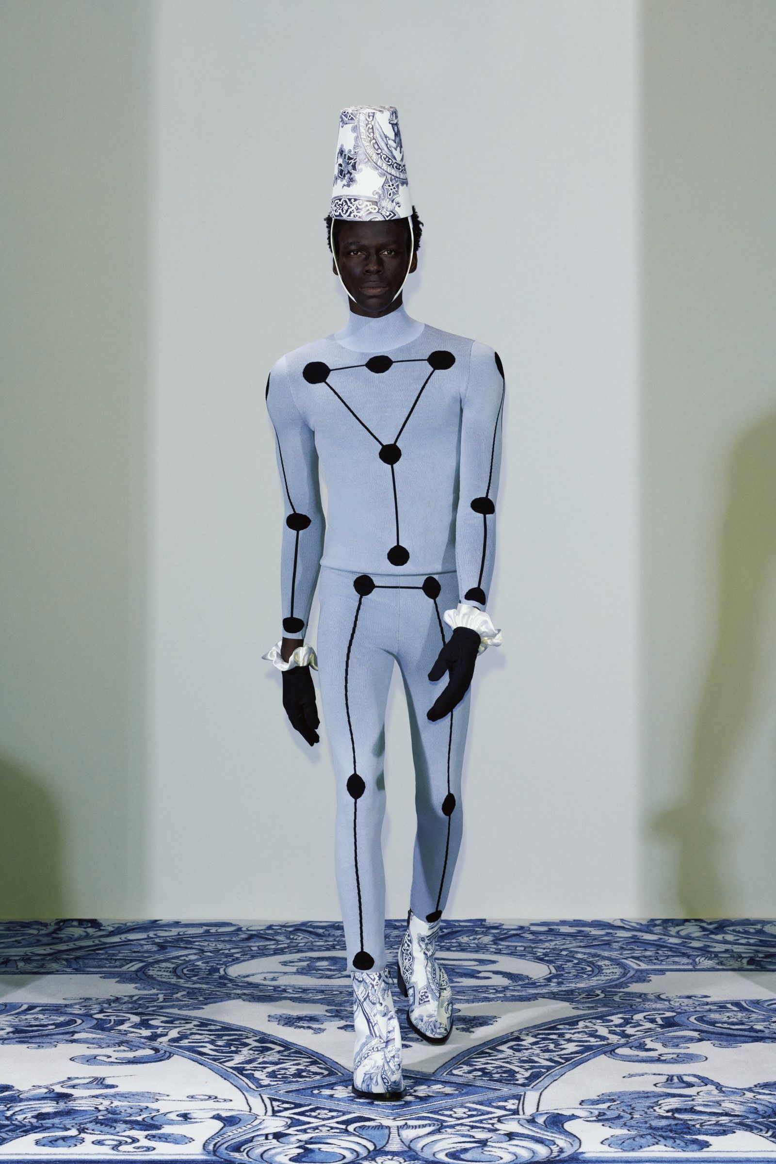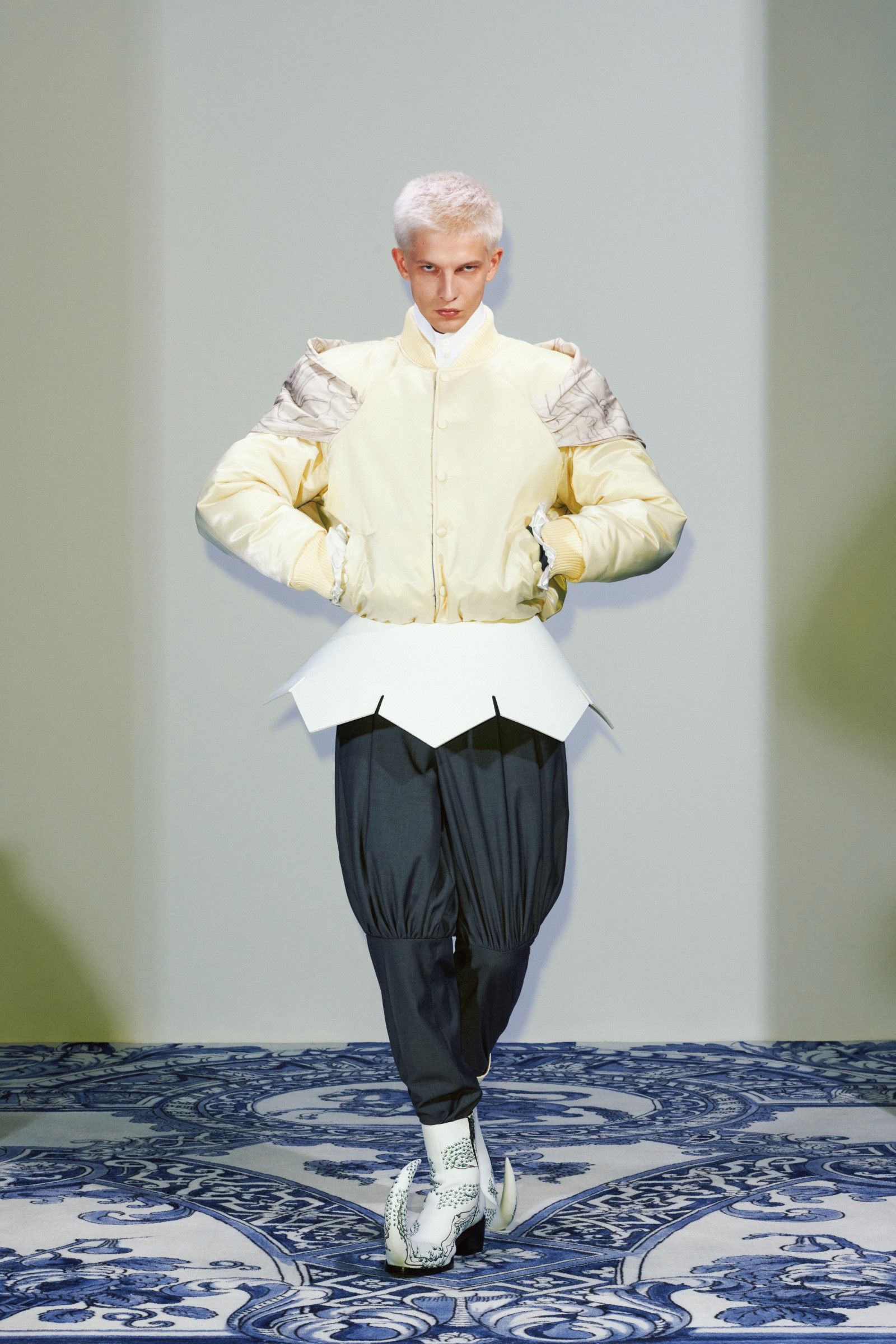 Ce qui est intéressant, cependant, en particulier pour le spectateur occidental, c'est que la collection ne dépend en réalité pas des tendances, mais se développe à partir d'une idée autonome et est donc dotée d'une stature indépendante propre. «Nous explorons différentes possibilités de recombiner les éléments. Les rendre familiers mais nouveaux», explique-t-il. «C'est le surréalisme de la réalité que nous voulons toujours exprimer dans nos projets». Un exemple notable est le traitement du motif en losange d'Arlequin, traditionnellement associé aux personnages comiques de la commedia dell'arte. En inversant et en reconfigurant les formes des losanges, Zhou a créé des motifs géométriques, réimaginant les cols et les poignets en formes géométriques modernes qui conservent un clin d'œil ludique à leurs racines historiques. «Au début, mon point de départ était : comment ces éléments 'ornementaux' peuvent-ils perdre leur sens d'ornementation ? Nous devions les traduire dans le vocabulaire de XANDER ZHOU». Au cœur d'ANACHRONOTALE, il y a une exploration de l'équilibre entre l'élégance et le grotesque — un thème reflété dans les silhouettes dramatiques et les détails complexes de la collection. Les pointes des poulaines, par exemple, rappellent les chaussures médiévales européennes avec des courbes exagérées, symbolisant à la fois le statut et l'absurdité. Zhou amplifie ce contraste en intégrant des motifs de science-fiction, créant une collection qui oscille entre la révérence historique et la fantaisie futuriste.