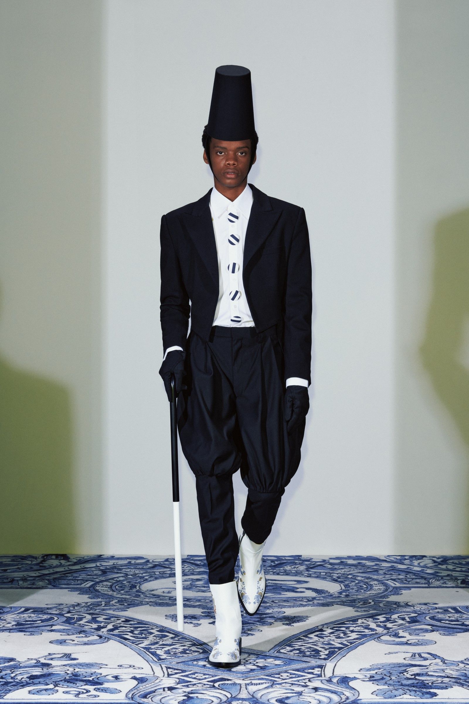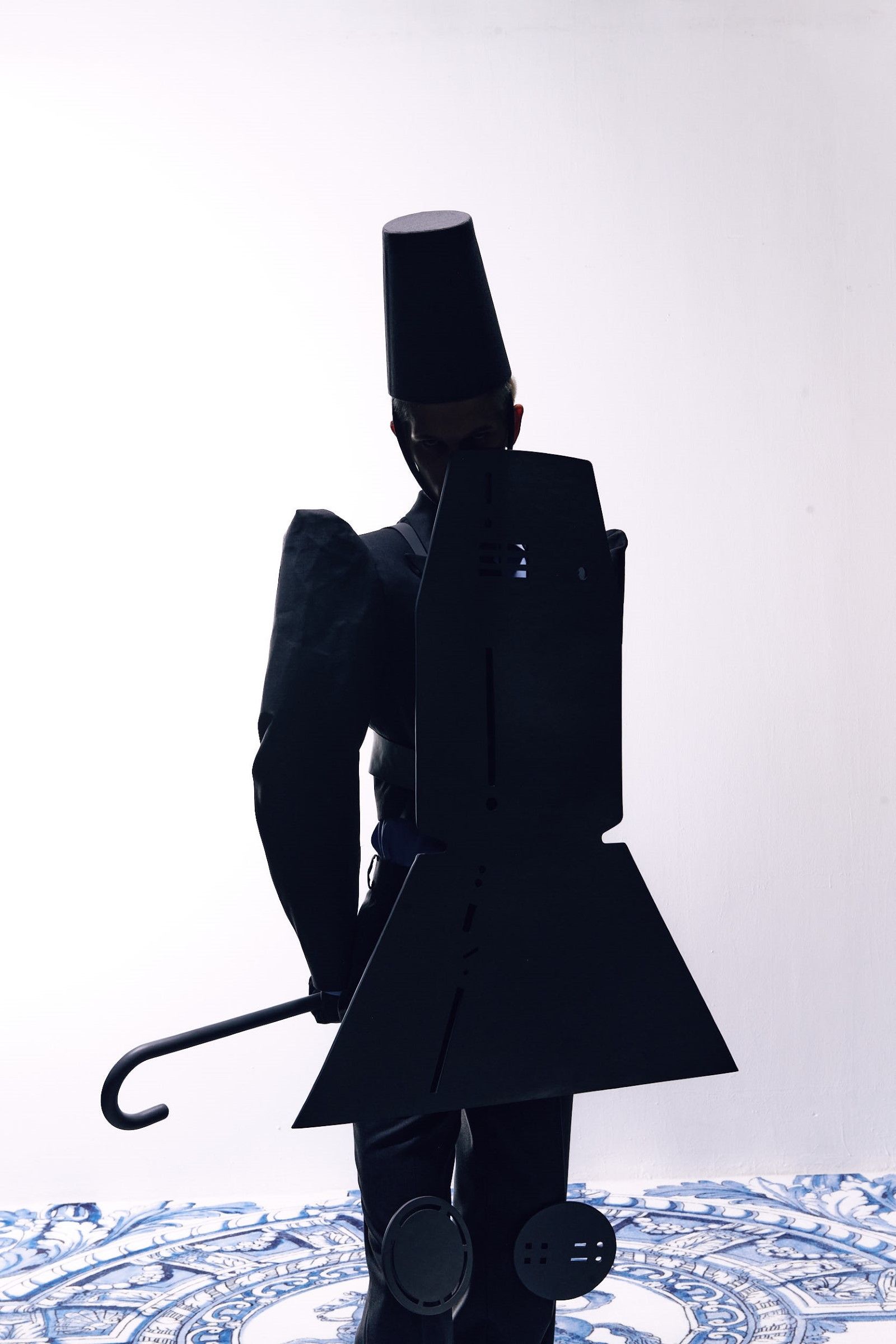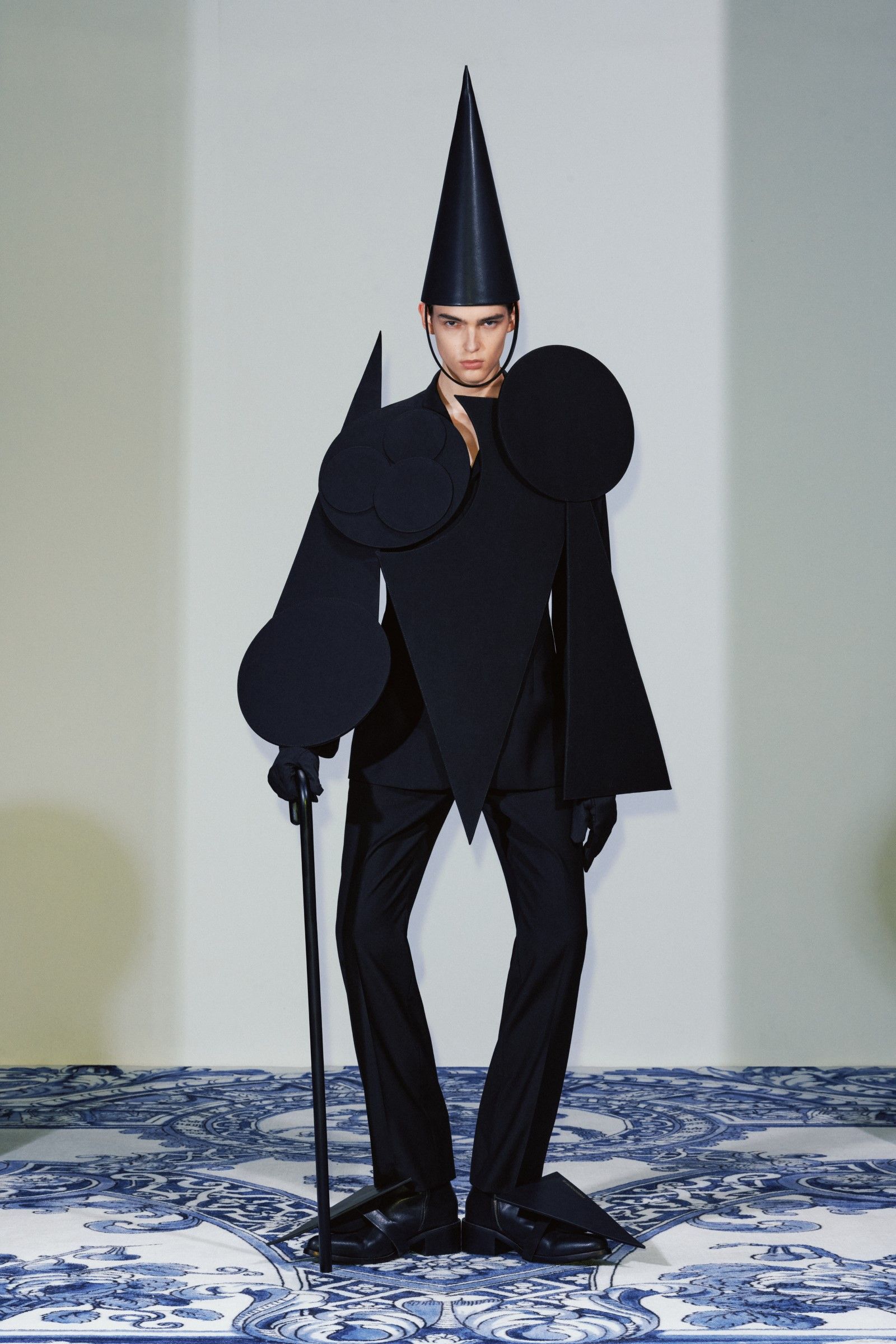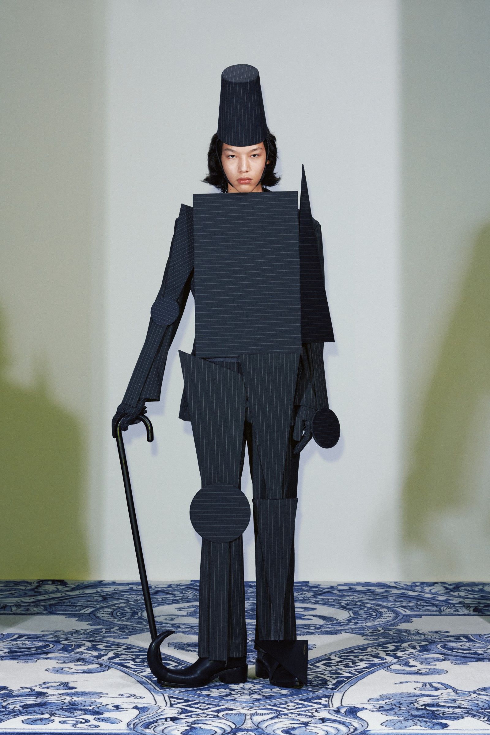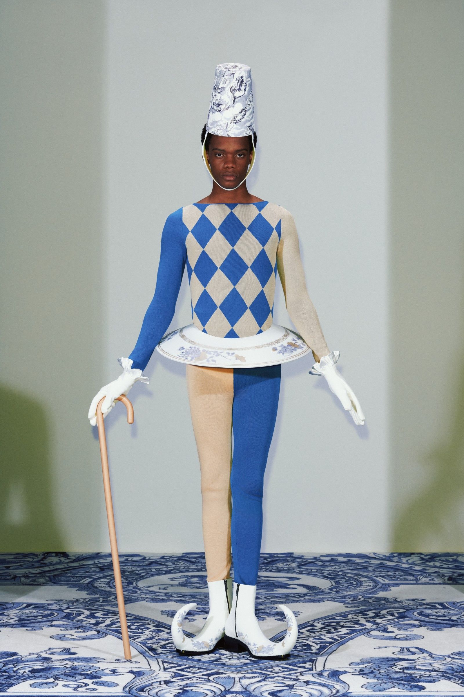 Ce qui est intéressant, cependant, en particulier pour le spectateur occidental, c'est que la collection ne dépend en réalité pas des tendances, mais se développe à partir d'une idée autonome et est donc dotée d'une stature indépendante propre. «Nous explorons différentes possibilités de recombiner les éléments. Les rendre familiers mais nouveaux», explique-t-il. «C'est le surréalisme de la réalité que nous voulons toujours exprimer dans nos projets». Un exemple notable est le traitement du motif en losange d'Arlequin, traditionnellement associé aux personnages comiques de la commedia dell'arte. En inversant et en reconfigurant les formes des losanges, Zhou a créé des motifs géométriques, réimaginant les cols et les poignets en formes géométriques modernes qui conservent un clin d'œil ludique à leurs racines historiques. «Au début, mon point de départ était : comment ces éléments 'ornementaux' peuvent-ils perdre leur sens d'ornementation ? Nous devions les traduire dans le vocabulaire de XANDER ZHOU». Au cœur d'ANACHRONOTALE, il y a une exploration de l'équilibre entre l'élégance et le grotesque — un thème reflété dans les silhouettes dramatiques et les détails complexes de la collection. Les pointes des poulaines, par exemple, rappellent les chaussures médiévales européennes avec des courbes exagérées, symbolisant à la fois le statut et l'absurdité. Zhou amplifie ce contraste en intégrant des motifs de science-fiction, créant une collection qui oscille entre la révérence historique et la fantaisie futuriste.
