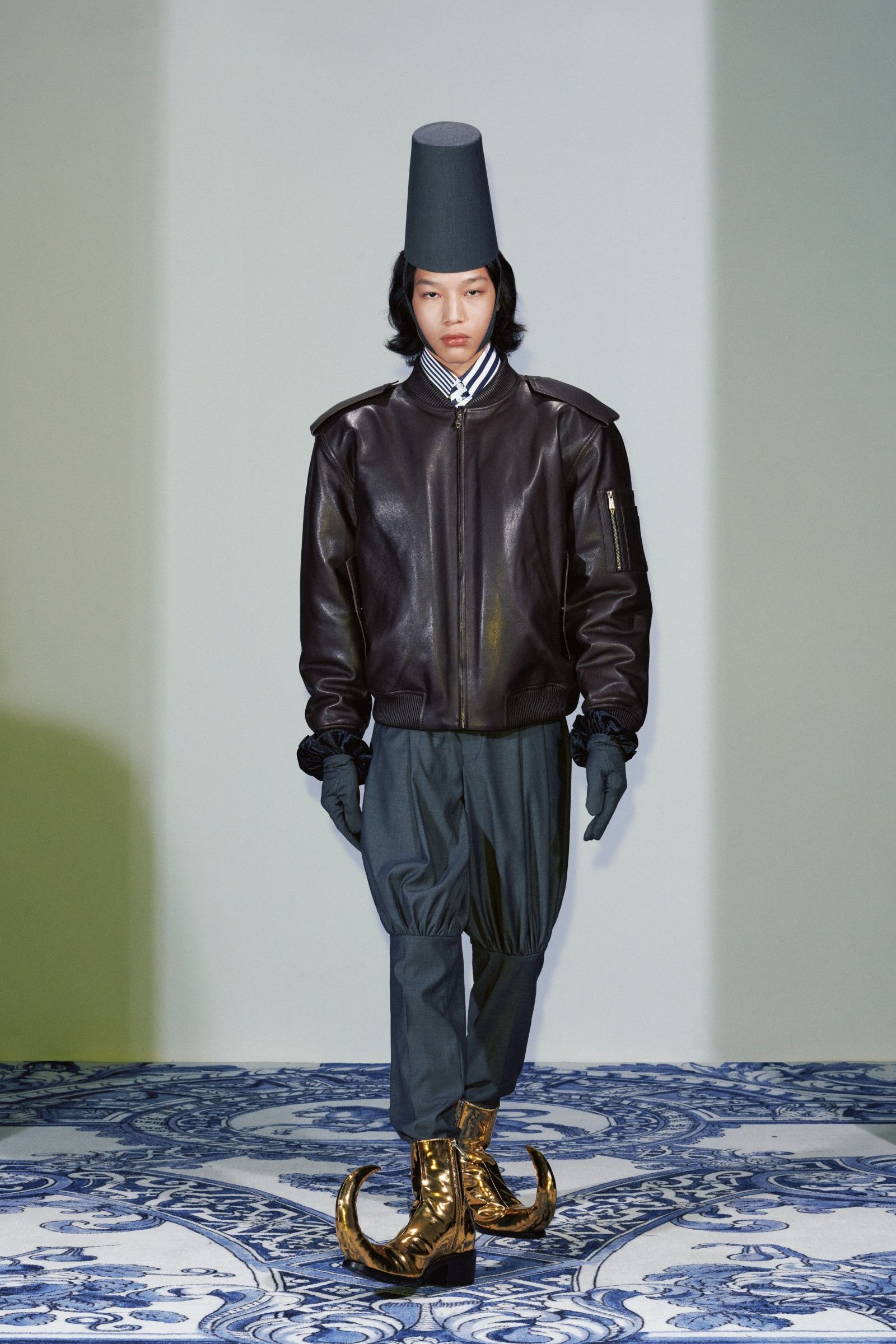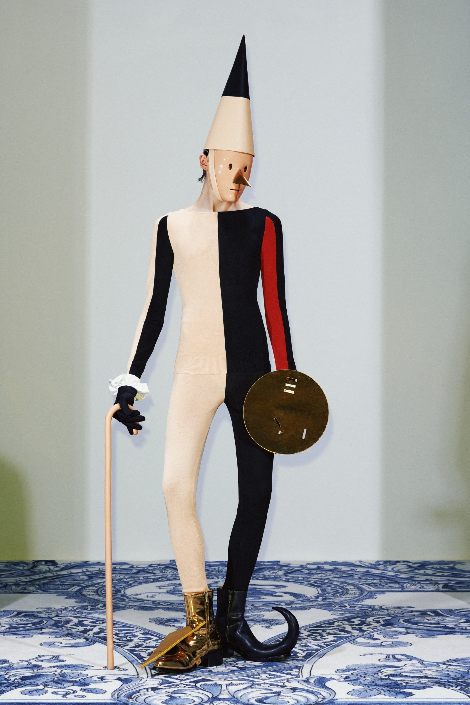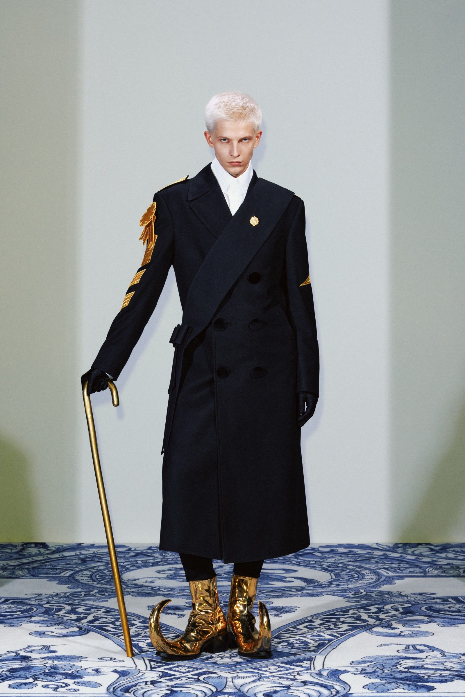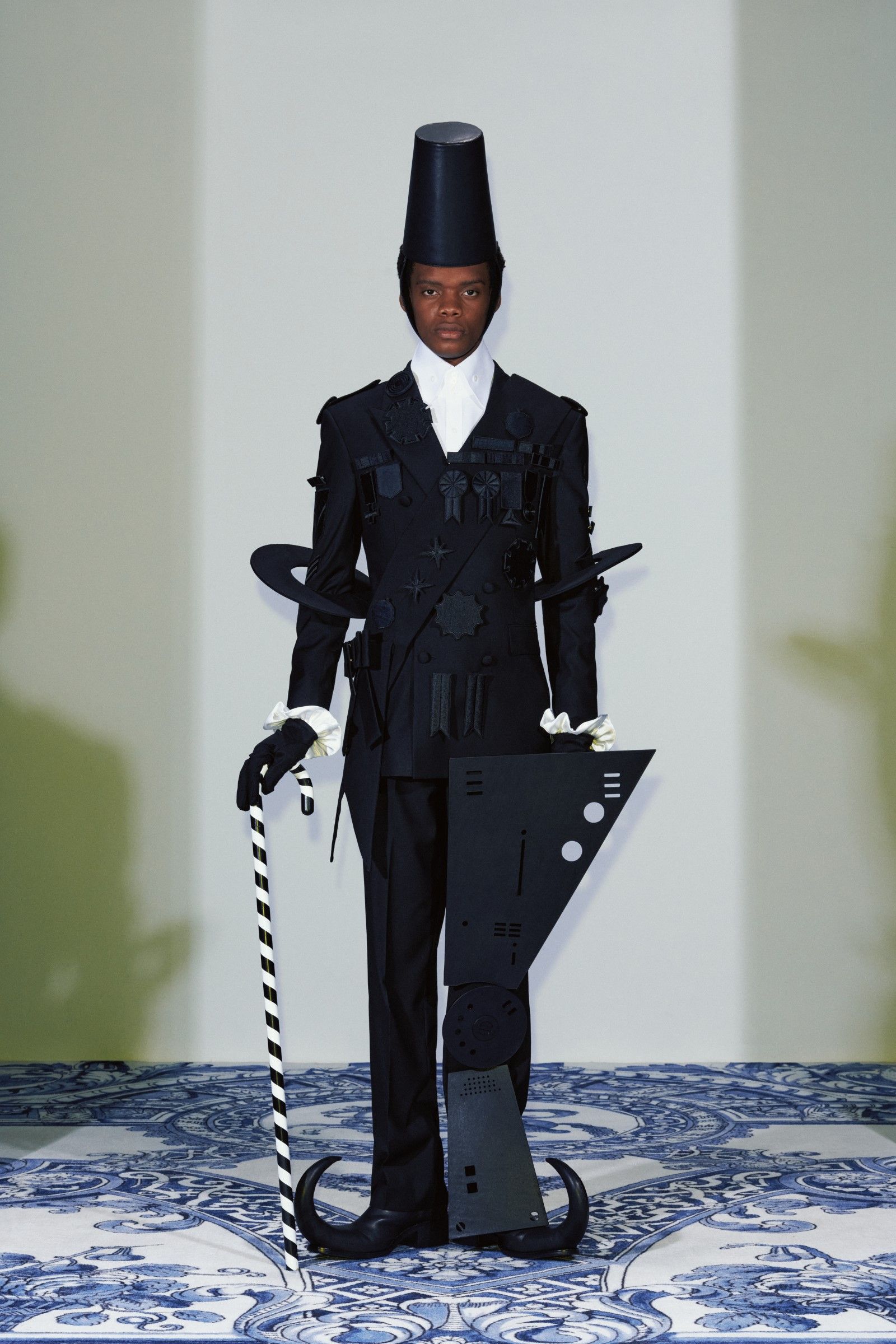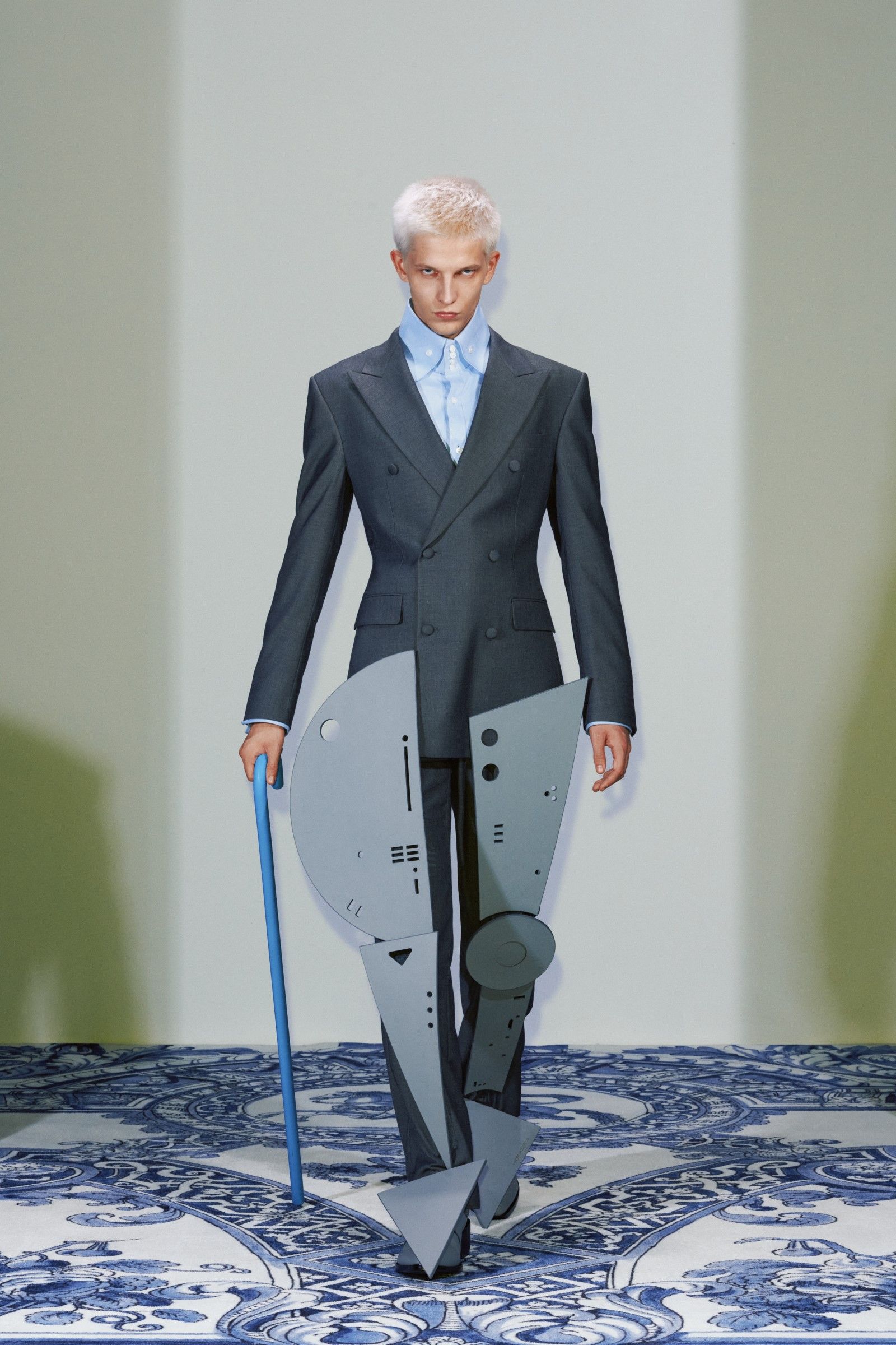 Ce qui est intéressant, cependant, en particulier pour le spectateur occidental, c'est que la collection ne dépend en réalité pas des tendances, mais se développe à partir d'une idée autonome et est donc dotée d'une stature indépendante propre. «Nous explorons différentes possibilités de recombiner les éléments. Les rendre familiers mais nouveaux», explique-t-il. «C'est le surréalisme de la réalité que nous voulons toujours exprimer dans nos projets». Un exemple notable est le traitement du motif en losange d'Arlequin, traditionnellement associé aux personnages comiques de la commedia dell'arte. En inversant et en reconfigurant les formes des losanges, Zhou a créé des motifs géométriques, réimaginant les cols et les poignets en formes géométriques modernes qui conservent un clin d'œil ludique à leurs racines historiques. «Au début, mon point de départ était : comment ces éléments 'ornementaux' peuvent-ils perdre leur sens d'ornementation ? Nous devions les traduire dans le vocabulaire de XANDER ZHOU». Au cœur d'ANACHRONOTALE, il y a une exploration de l'équilibre entre l'élégance et le grotesque — un thème reflété dans les silhouettes dramatiques et les détails complexes de la collection. Les pointes des poulaines, par exemple, rappellent les chaussures médiévales européennes avec des courbes exagérées, symbolisant à la fois le statut et l'absurdité. Zhou amplifie ce contraste en intégrant des motifs de science-fiction, créant une collection qui oscille entre la révérence historique et la fantaisie futuriste.
