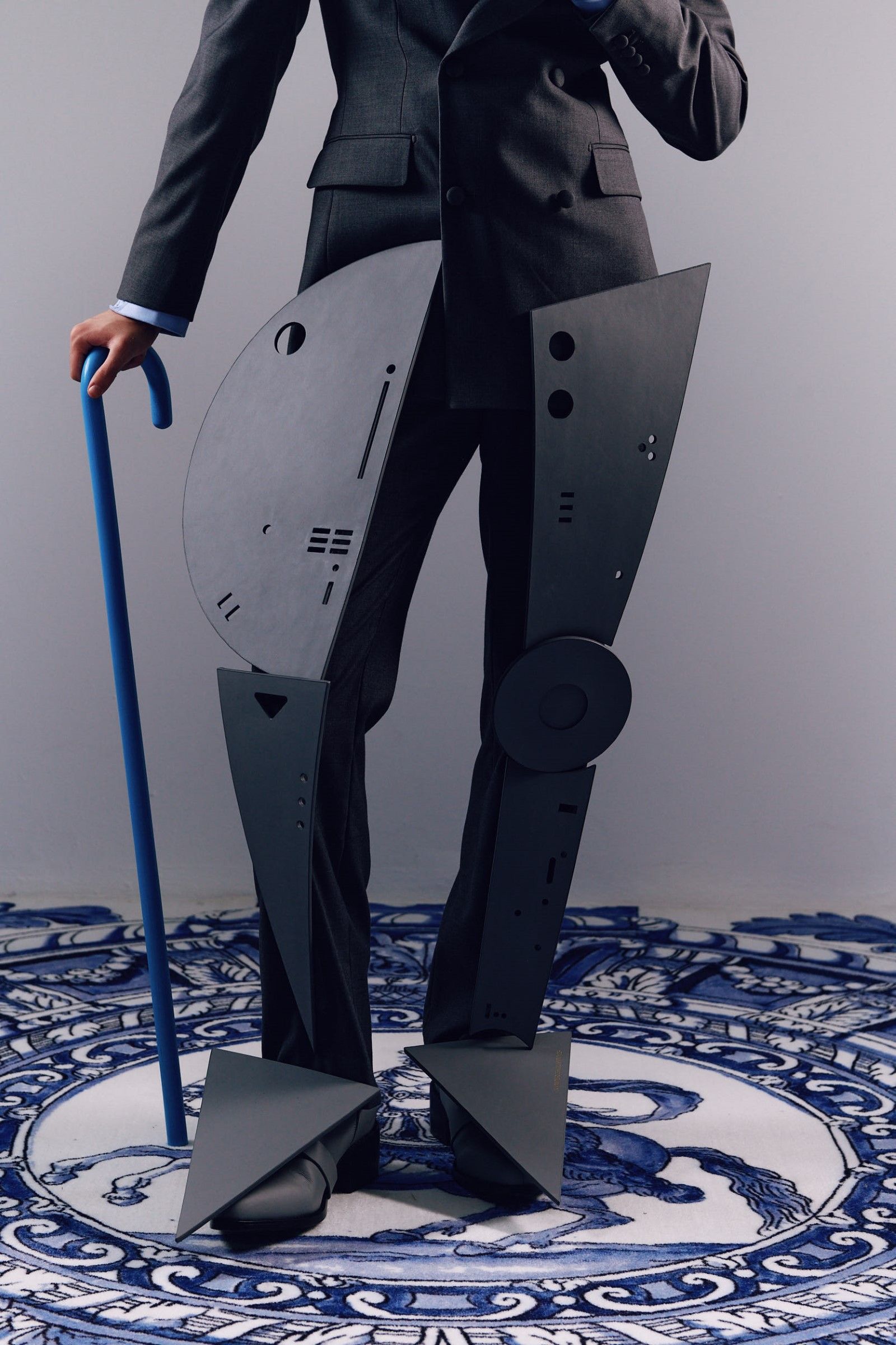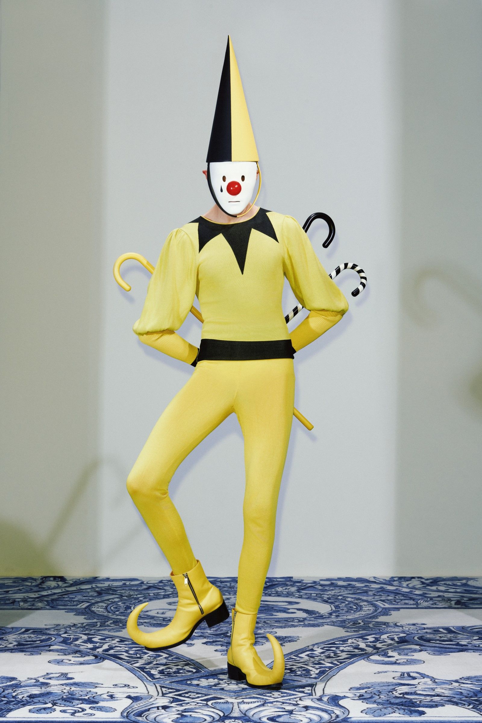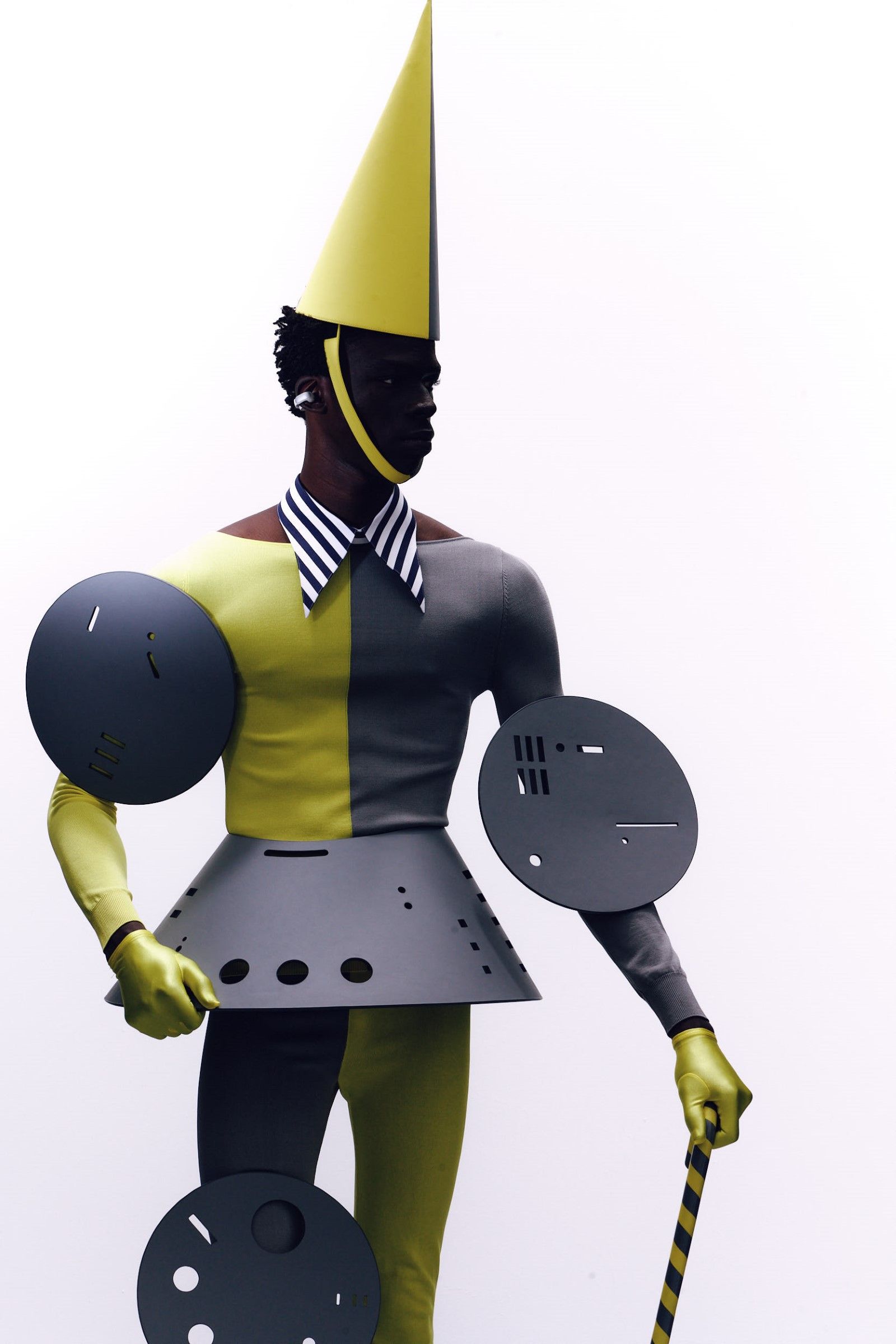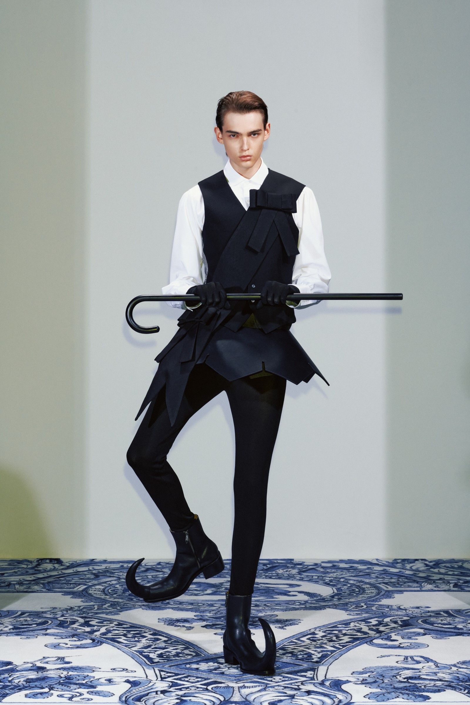 Ce qui est intéressant, cependant, en particulier pour le spectateur occidental, c'est que la collection ne dépend en réalité pas des tendances, mais se développe à partir d'une idée autonome et est donc dotée d'une stature indépendante propre. «Nous explorons différentes possibilités de recombiner les éléments. Les rendre familiers mais nouveaux», explique-t-il. «C'est le surréalisme de la réalité que nous voulons toujours exprimer dans nos projets». Un exemple notable est le traitement du motif en losange d'Arlequin, traditionnellement associé aux personnages comiques de la commedia dell'arte. En inversant et en reconfigurant les formes des losanges, Zhou a créé des motifs géométriques, réimaginant les cols et les poignets en formes géométriques modernes qui conservent un clin d'œil ludique à leurs racines historiques. «Au début, mon point de départ était : comment ces éléments 'ornementaux' peuvent-ils perdre leur sens d'ornementation ? Nous devions les traduire dans le vocabulaire de XANDER ZHOU». Au cœur d'ANACHRONOTALE, il y a une exploration de l'équilibre entre l'élégance et le grotesque — un thème reflété dans les silhouettes dramatiques et les détails complexes de la collection. Les pointes des poulaines, par exemple, rappellent les chaussures médiévales européennes avec des courbes exagérées, symbolisant à la fois le statut et l'absurdité. Zhou amplifie ce contraste en intégrant des motifs de science-fiction, créant une collection qui oscille entre la révérence historique et la fantaisie futuriste.