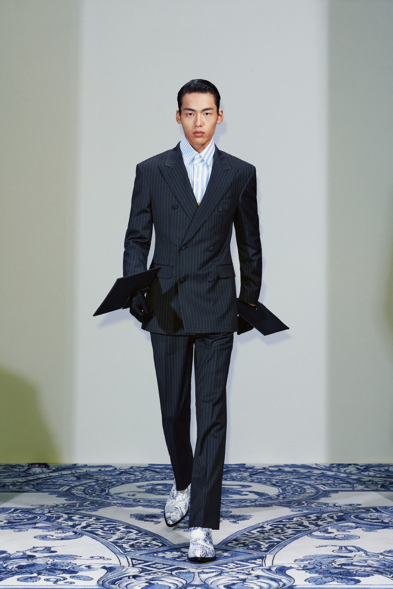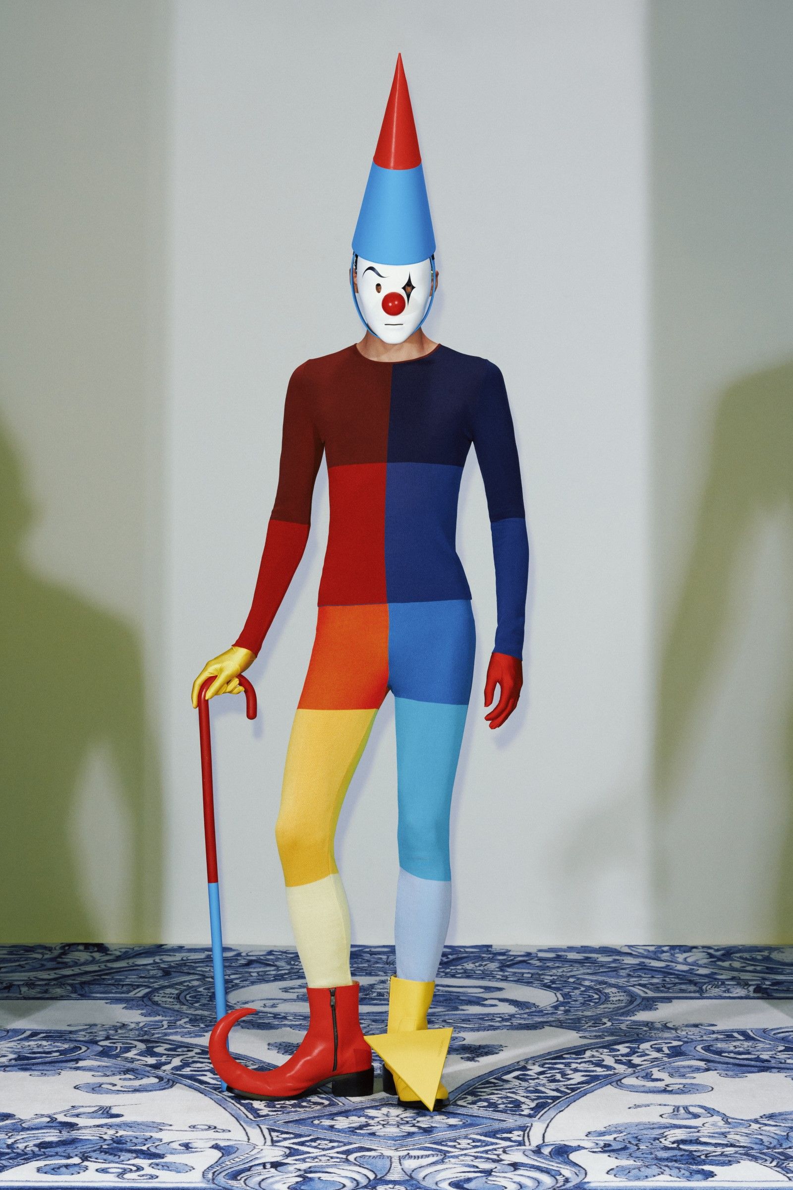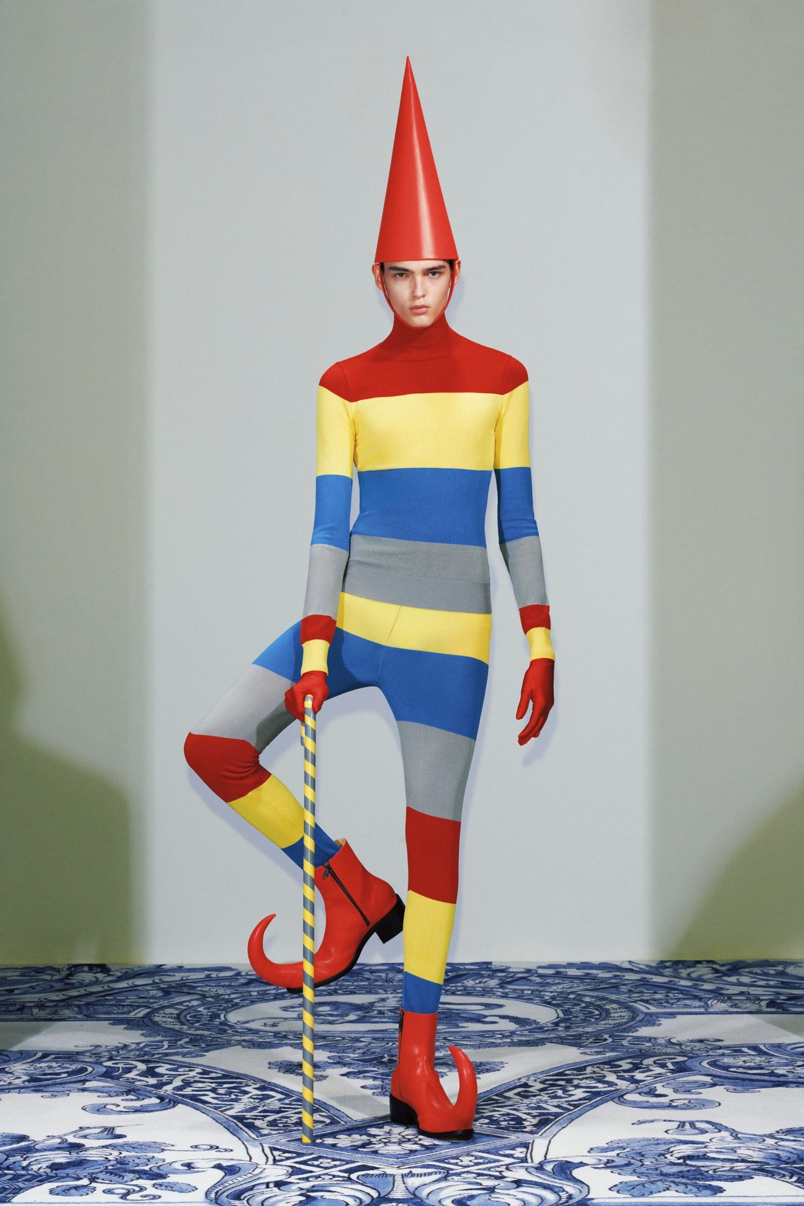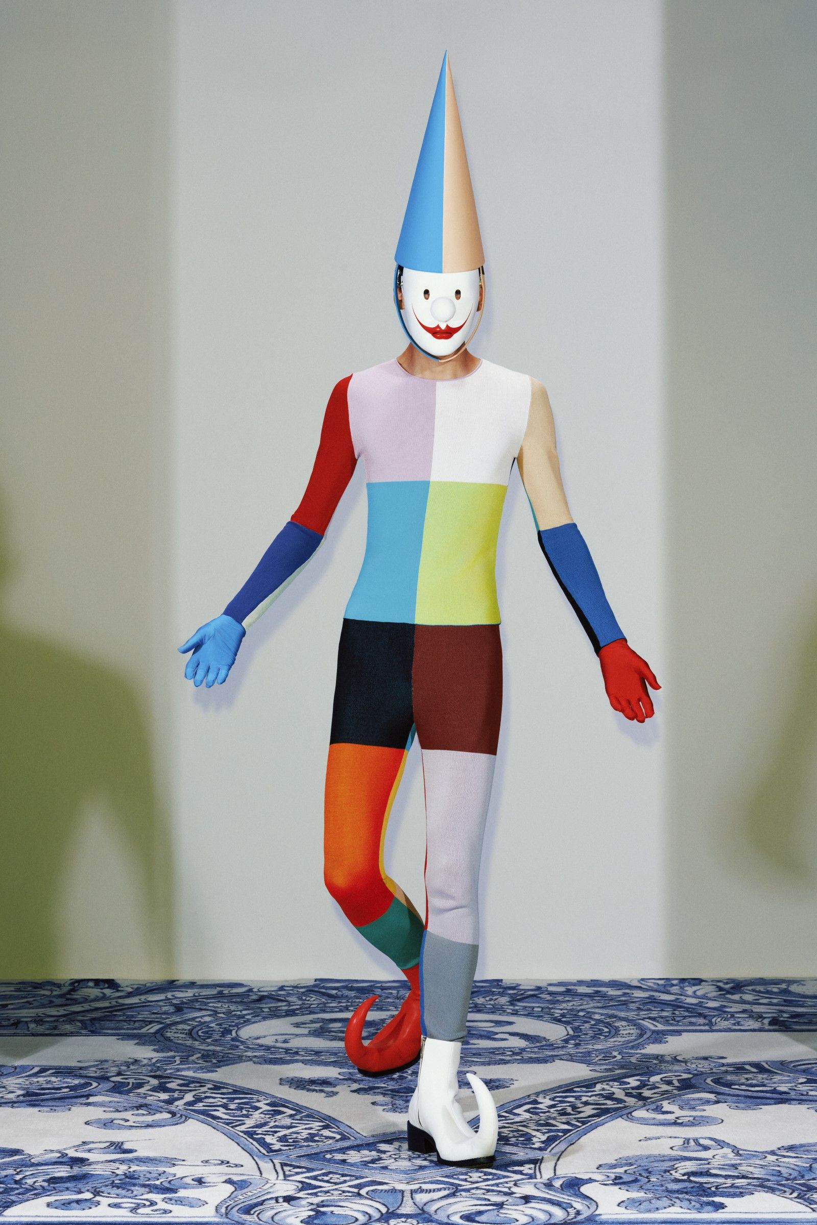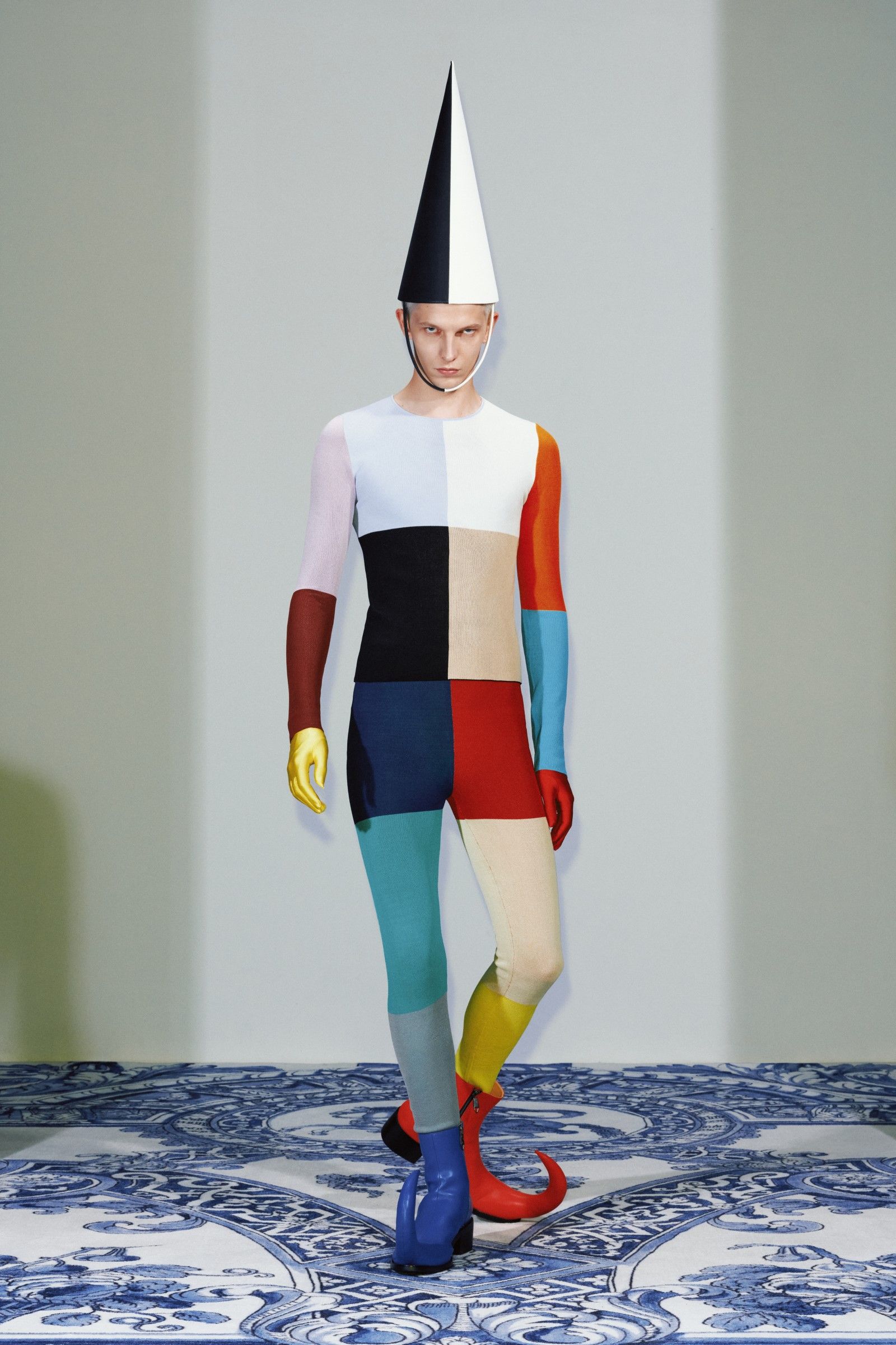 Ce qui est intéressant, cependant, en particulier pour le spectateur occidental, c'est que la collection ne dépend en réalité pas des tendances, mais se développe à partir d'une idée autonome et est donc dotée d'une stature indépendante propre. «Nous explorons différentes possibilités de recombiner les éléments. Les rendre familiers mais nouveaux», explique-t-il. «C'est le surréalisme de la réalité que nous voulons toujours exprimer dans nos projets». Un exemple notable est le traitement du motif en losange d'Arlequin, traditionnellement associé aux personnages comiques de la commedia dell'arte. En inversant et en reconfigurant les formes des losanges, Zhou a créé des motifs géométriques, réimaginant les cols et les poignets en formes géométriques modernes qui conservent un clin d'œil ludique à leurs racines historiques. «Au début, mon point de départ était : comment ces éléments 'ornementaux' peuvent-ils perdre leur sens d'ornementation ? Nous devions les traduire dans le vocabulaire de XANDER ZHOU». Au cœur d'ANACHRONOTALE, il y a une exploration de l'équilibre entre l'élégance et le grotesque — un thème reflété dans les silhouettes dramatiques et les détails complexes de la collection. Les pointes des poulaines, par exemple, rappellent les chaussures médiévales européennes avec des courbes exagérées, symbolisant à la fois le statut et l'absurdité. Zhou amplifie ce contraste en intégrant des motifs de science-fiction, créant une collection qui oscille entre la révérence historique et la fantaisie futuriste.
