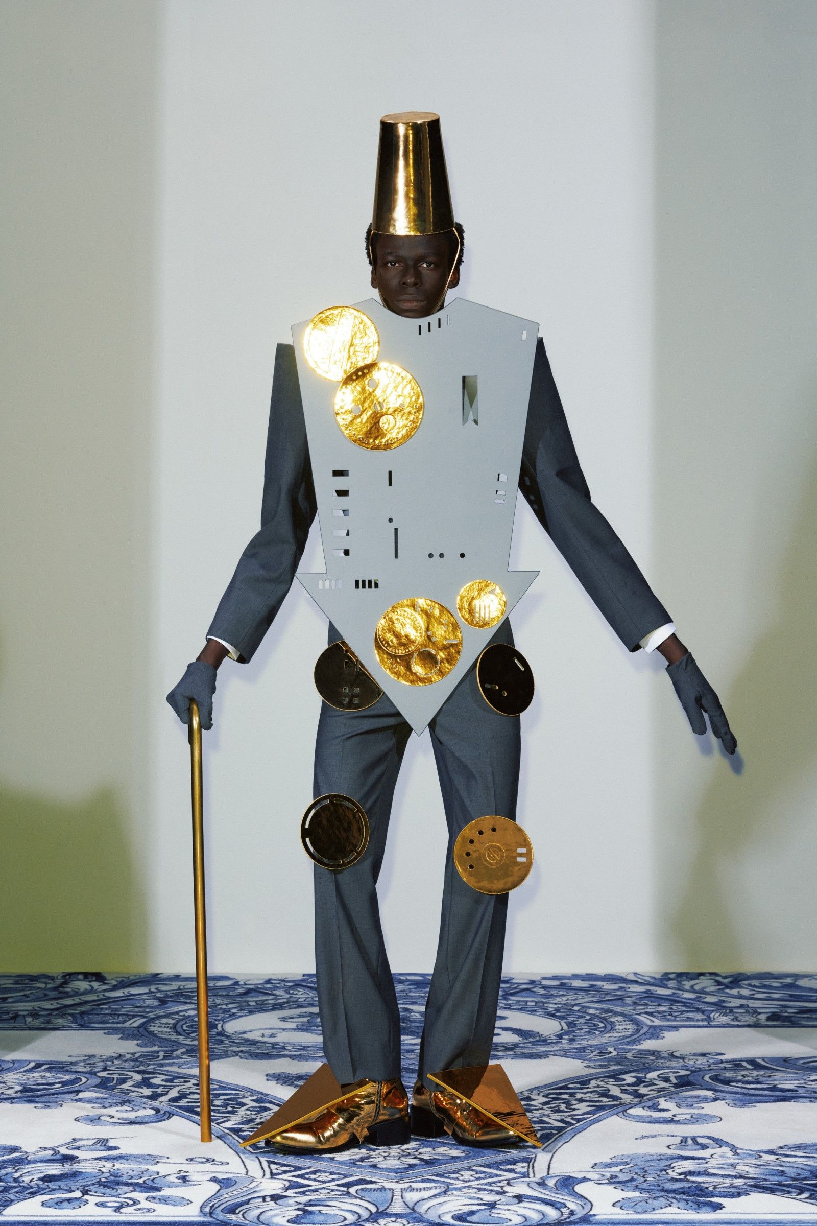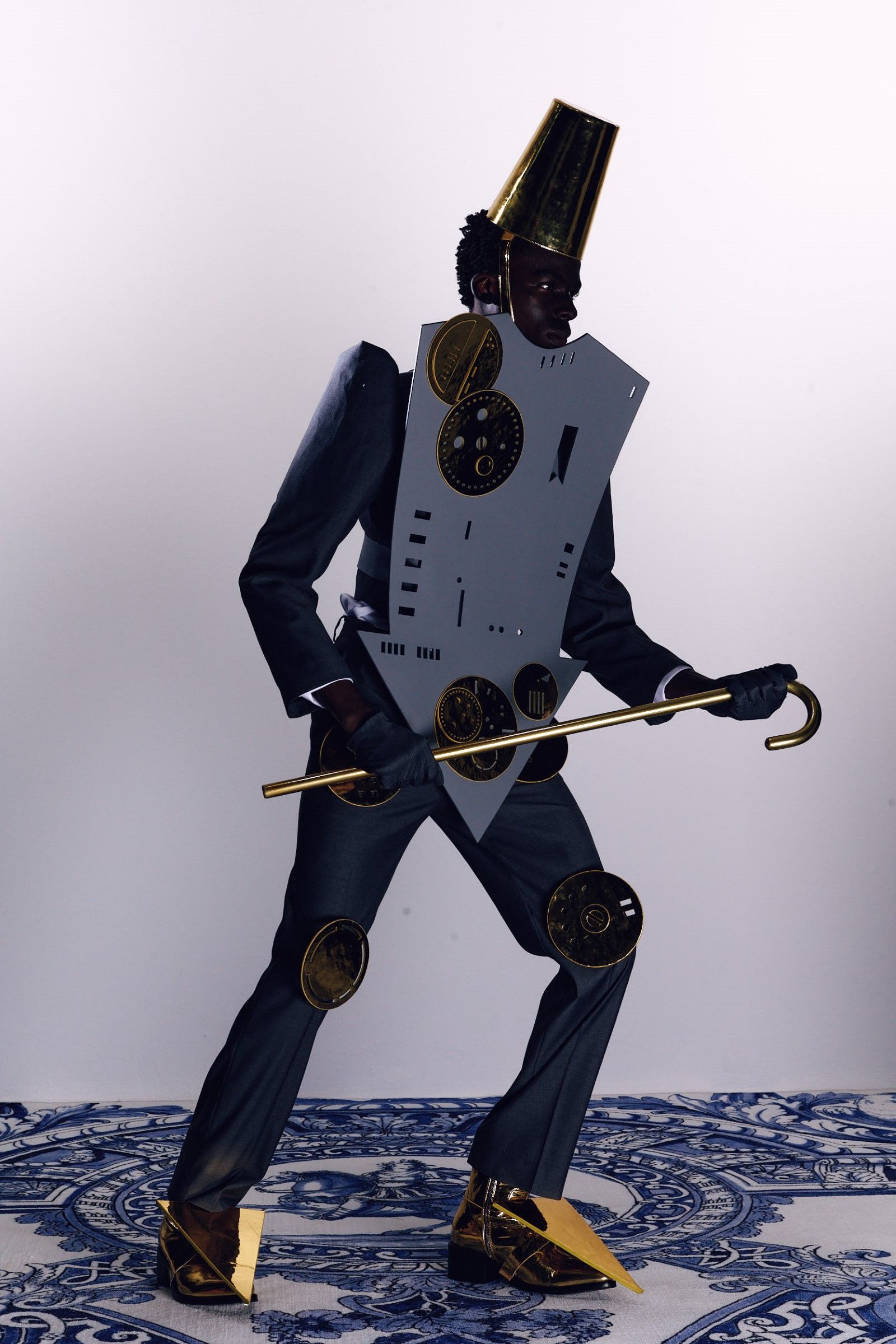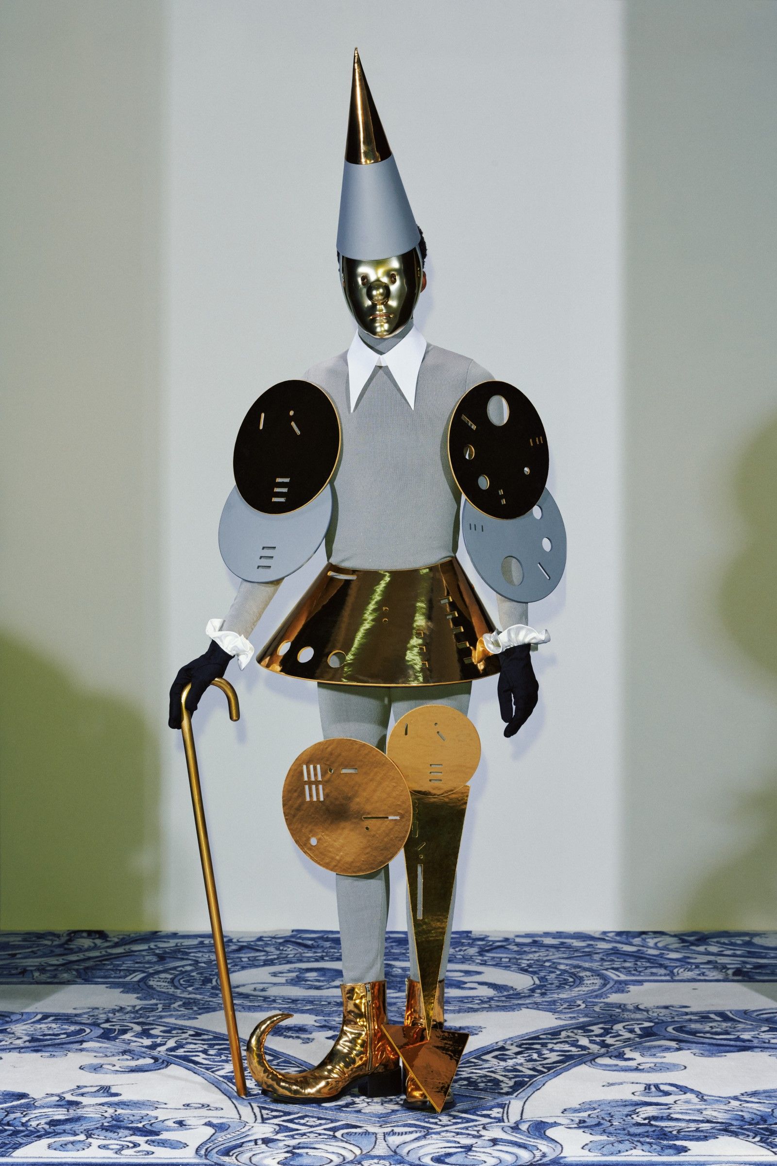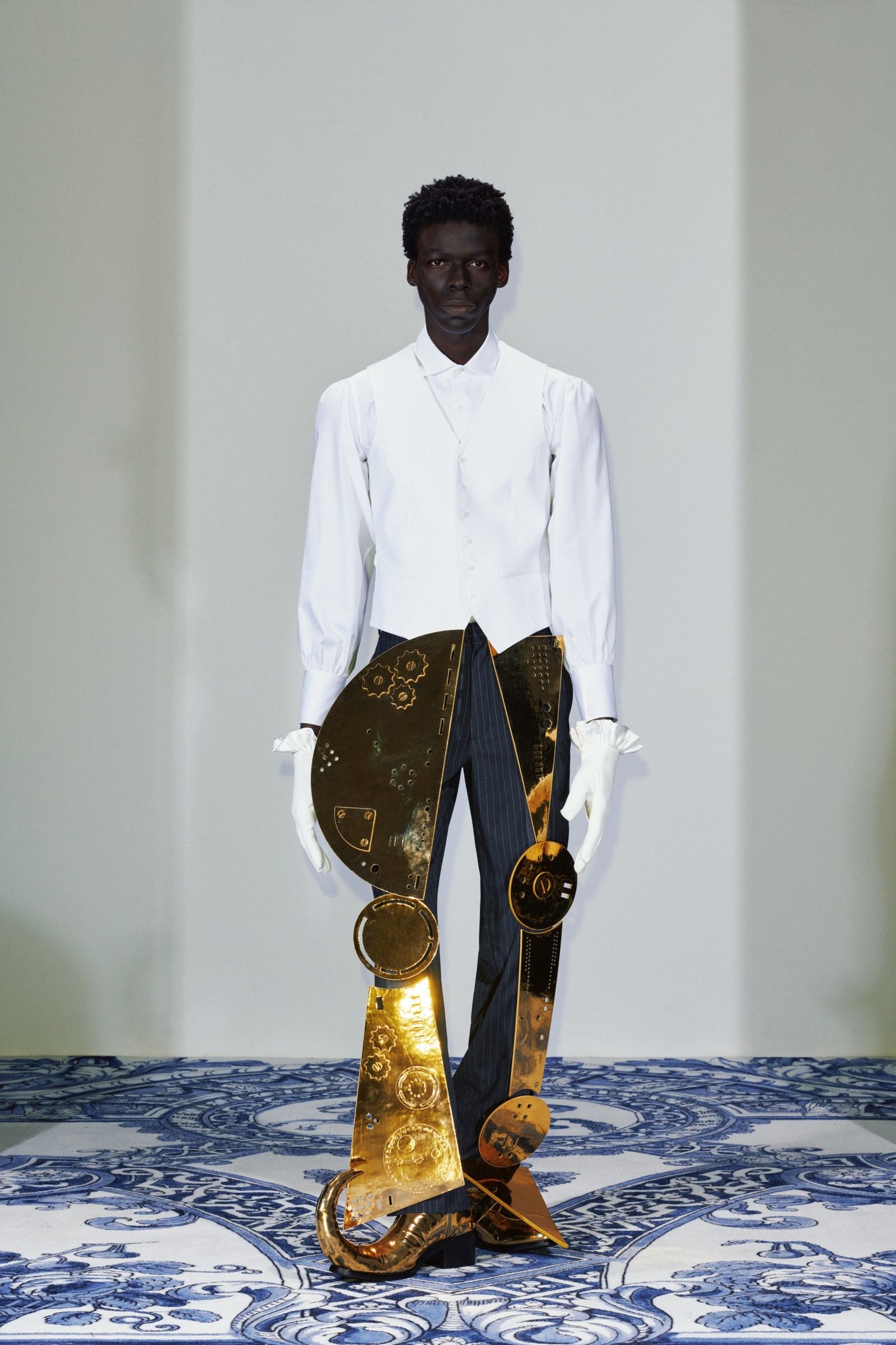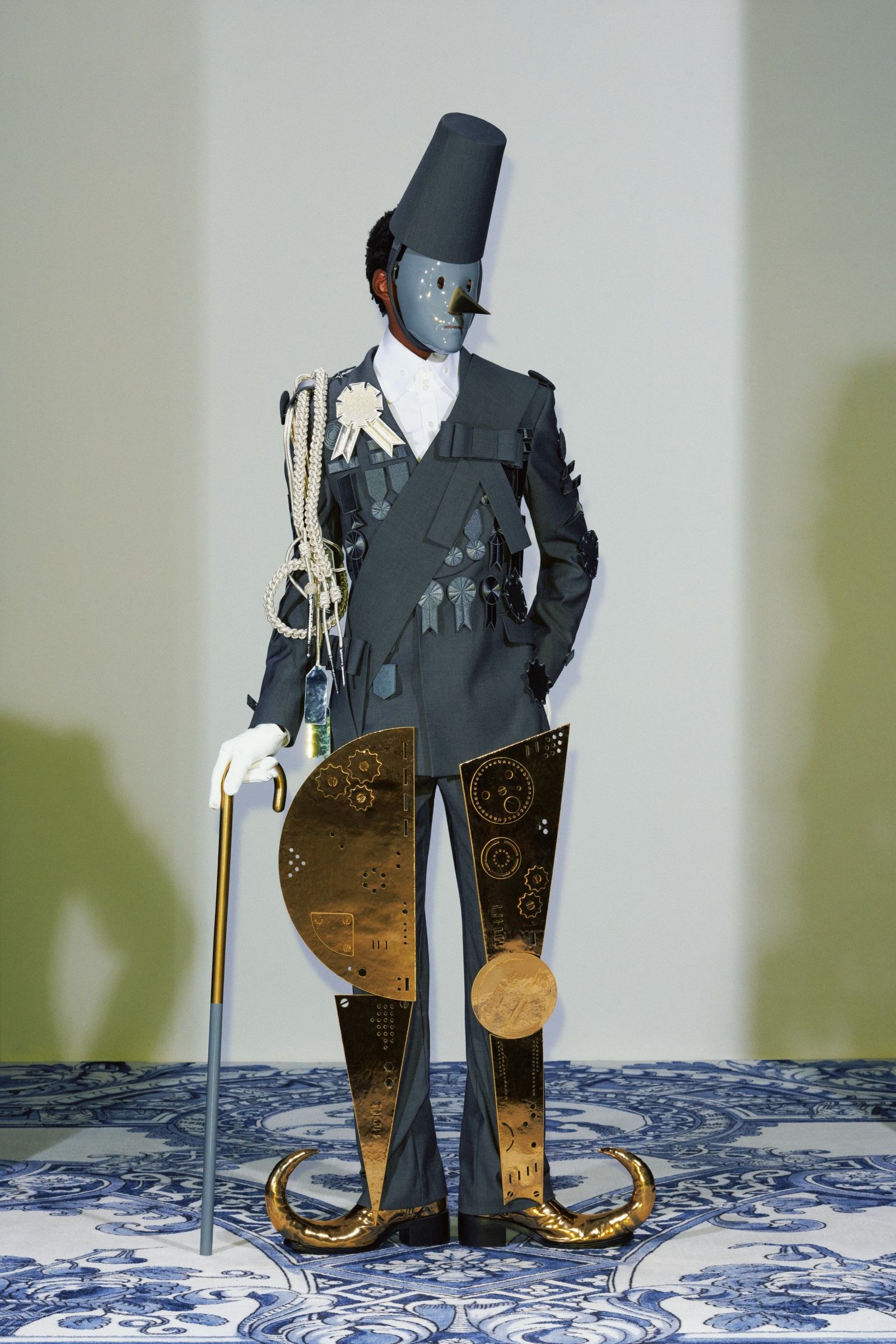Il ne faut cependant pas croire que, pour Zhou, les mondes surréalistes qu'il continue d'évoquer sont nécessairement éloignés de l'artisanat dont le reste des marques de mode se targuent habituellement. «J'aime les matériaux et techniques high-tech, ainsi que les matériaux et techniques traditionnels. Pour moi, combiner les deux offre plus de possibilités de m'exprimer à travers mes designs. Par exemple, les queues mécaniques de ma collection précédente ressemblent beaucoup à des impressions 3D, mais si l'on observe de près, on remarque qu'elles sont composées de segments de cuir faits main, utilisant l'artisanat du cuir le plus traditionnel pour obtenir un sens de la technologie. J'aime ce contraste visuel et j'aime briser les préjugés des gens au premier regard. Les différents effets et sensations d'un objet lorsqu'on le regarde de loin et de près sont très importants dans mes projets», a déclaré Zhou, qui a expérimenté dans cette collection des appliqués mécaniques, des textures métalliques et des silhouettes déconstruites appliqués aux costumes historiques de la commedia dell'arte et du ballet, mais aussi à des pièces telles que le shako hongrois, les manches bouffantes inspirées de Louis XIV, les armures de tournoi et les poulaine médiévales. Une reconstitution historique qui transforme les formes du passé en autant d'éléments de style, comme une version inversée du jabot du XVIIIe siècle qui devient un gant, des fusions de manches bouffantes et de manches poétiques byroniennes, des reproductions de médailles militaires classiques du XIXe siècle sur le tissu. Mais sa philosophie va au-delà des notions rigides d'influence culturelle. «Je ne fais généralement pas de distinction particulière entre la culture orientale ou occidentale», observe le créateur. «La raison en est que je veux ouvrir grand les fenêtres et abandonner les perceptions enracinées, obsolètes et stéréotypées. J'aime expérimenter la vie de différentes manières. Je crois que tirer le meilleur parti de la vie signifie expérimenter autant de vies différentes que possible avant de quitter ce monde, voir différents endroits, afin que le personnage du jeu qui vous a été assigné dans cette vie puisse accumuler le plus de points d'expérience possible».
