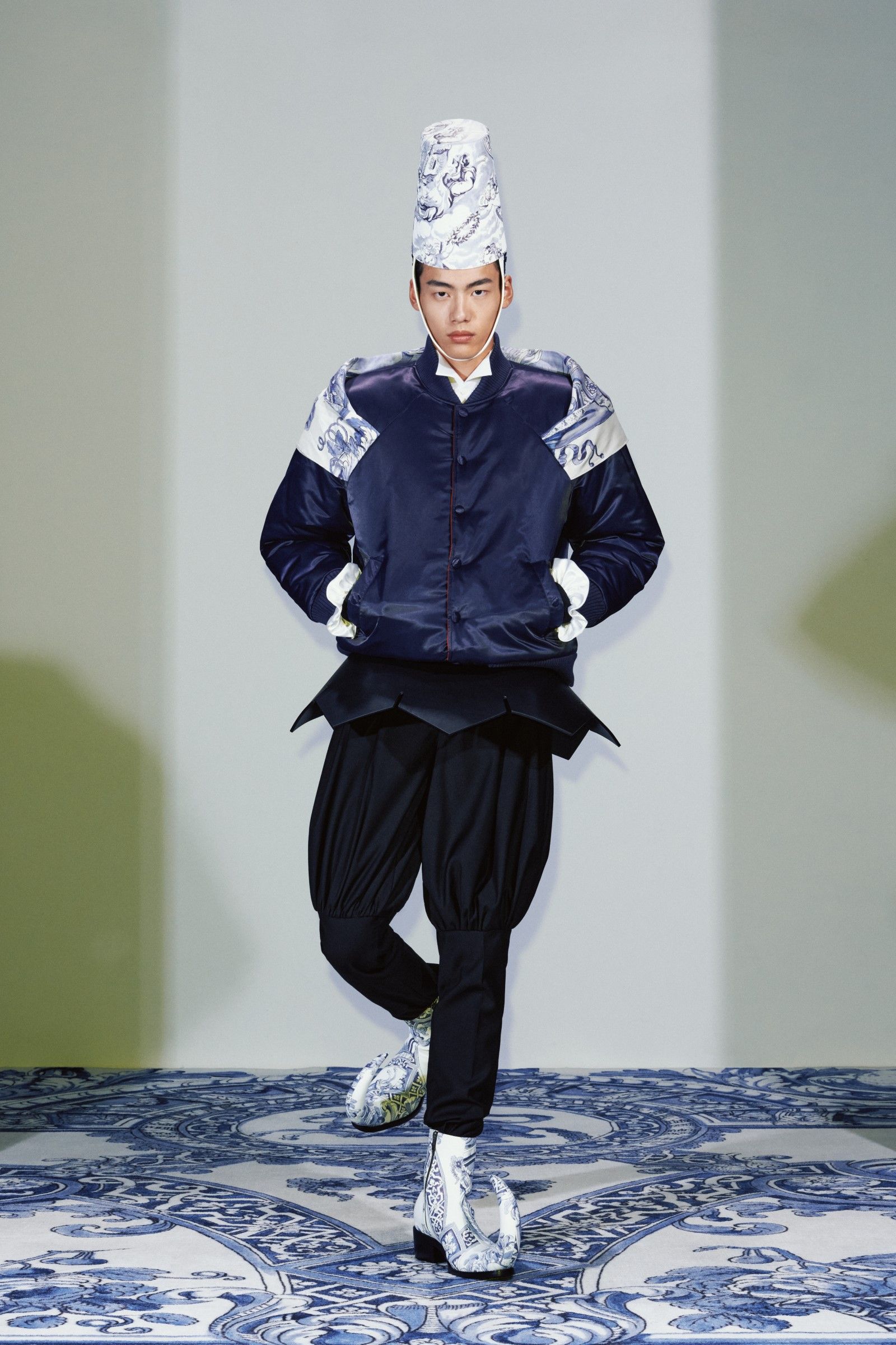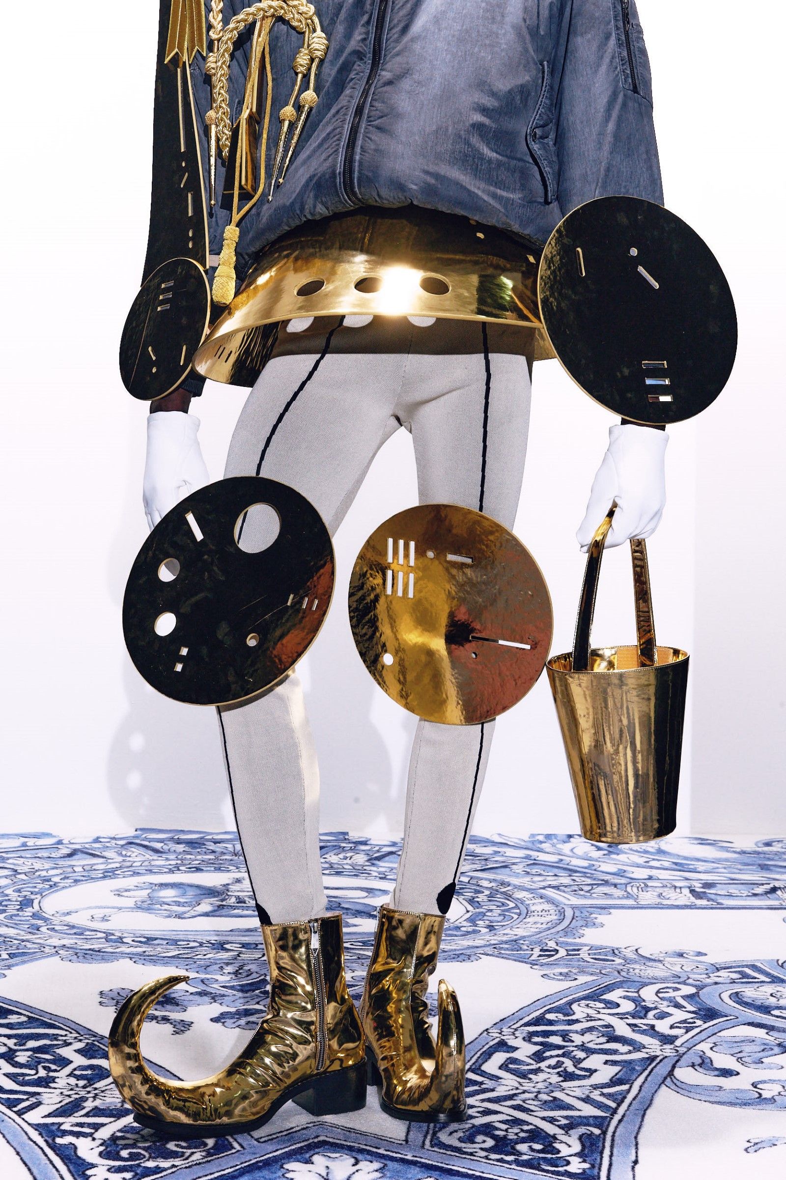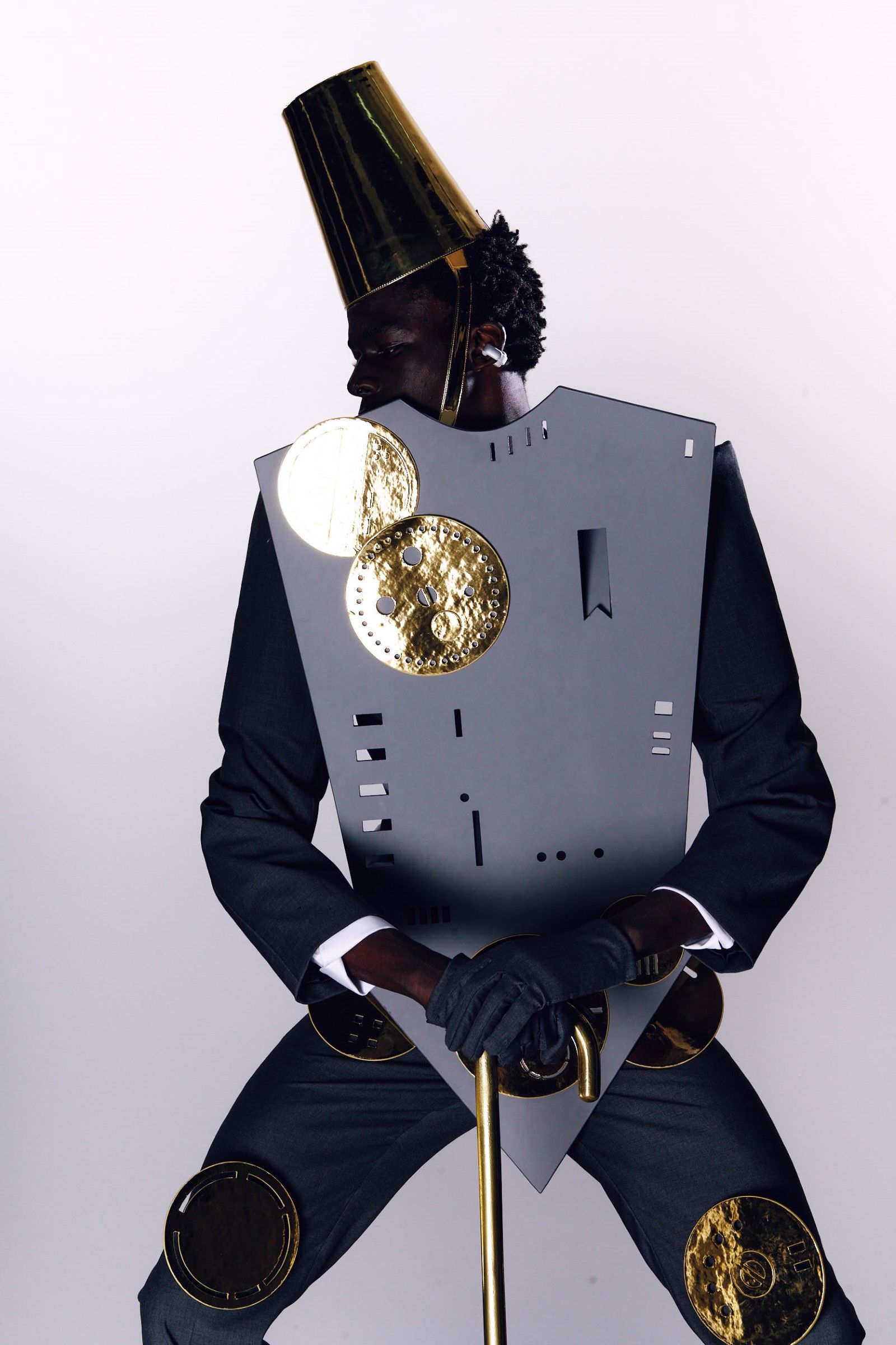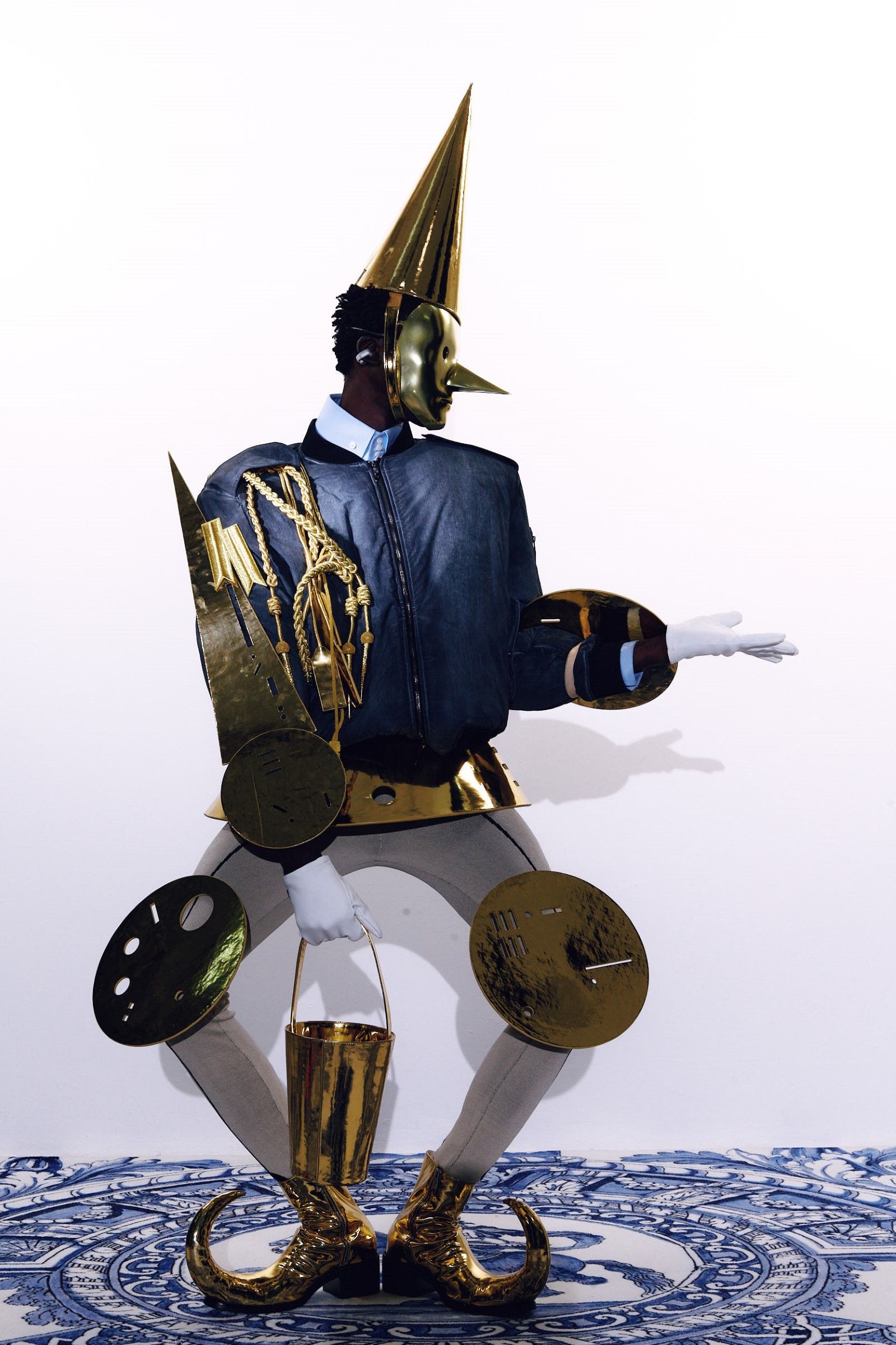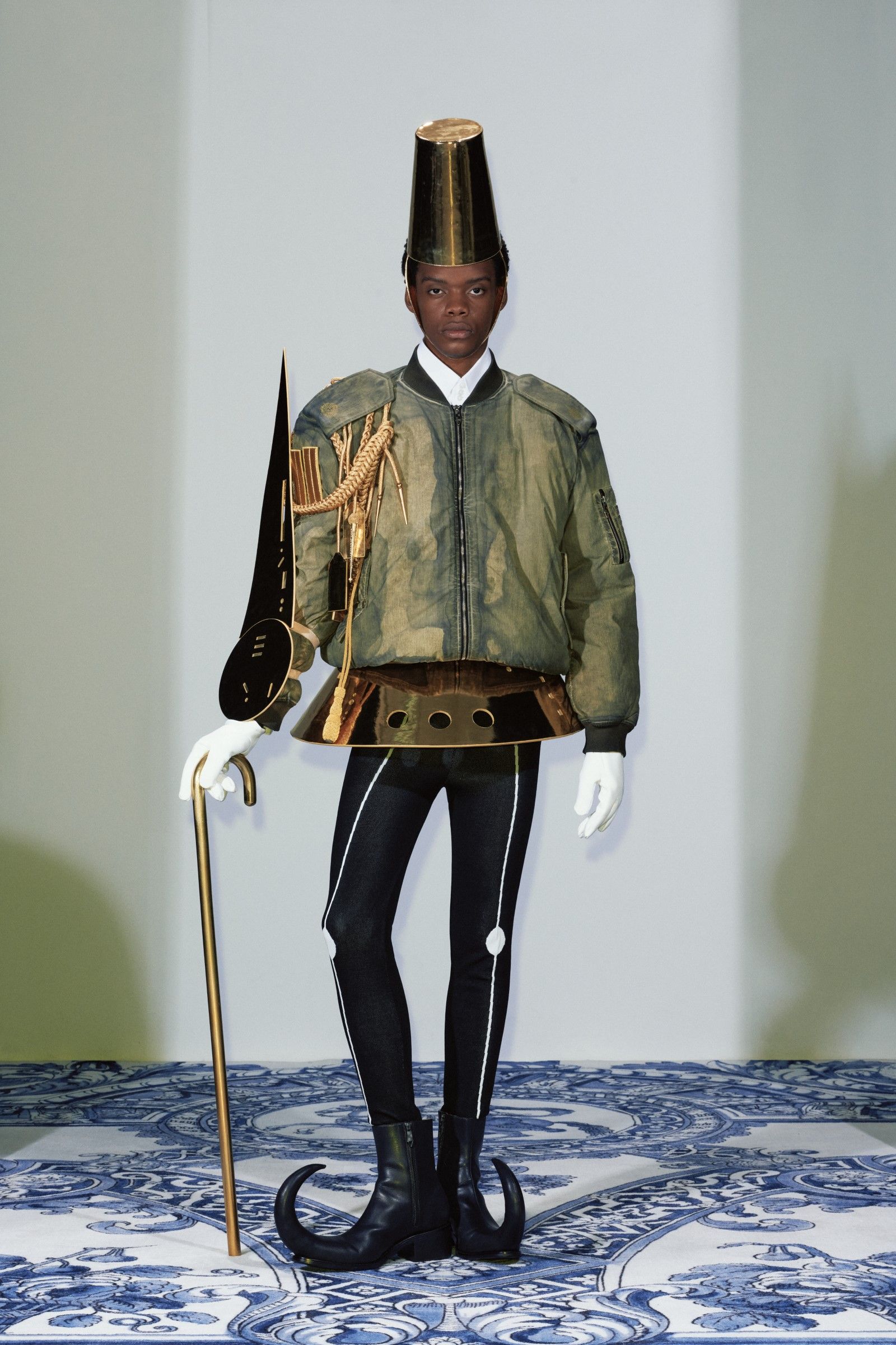 Il ne faut cependant pas croire que, pour Zhou, les mondes surréalistes qu'il continue d'évoquer sont nécessairement éloignés de l'artisanat dont le reste des marques de mode se targuent habituellement. «J'aime les matériaux et techniques high-tech, ainsi que les matériaux et techniques traditionnels. Pour moi, combiner les deux offre plus de possibilités de m'exprimer à travers mes designs. Par exemple, les queues mécaniques de ma collection précédente ressemblent beaucoup à des impressions 3D, mais si l'on observe de près, on remarque qu'elles sont composées de segments de cuir faits main, utilisant l'artisanat du cuir le plus traditionnel pour obtenir un sens de la technologie. J'aime ce contraste visuel et j'aime briser les préjugés des gens au premier regard. Les différents effets et sensations d'un objet lorsqu'on le regarde de loin et de près sont très importants dans mes projets», a déclaré Zhou, qui a expérimenté dans cette collection des appliqués mécaniques, des textures métalliques et des silhouettes déconstruites appliqués aux costumes historiques de la commedia dell'arte et du ballet, mais aussi à des pièces telles que le shako hongrois, les manches bouffantes inspirées de Louis XIV, les armures de tournoi et les poulaine médiévales. Une reconstitution historique qui transforme les formes du passé en autant d'éléments de style, comme une version inversée du jabot du XVIIIe siècle qui devient un gant, des fusions de manches bouffantes et de manches poétiques byroniennes, des reproductions de médailles militaires classiques du XIXe siècle sur le tissu. Mais sa philosophie va au-delà des notions rigides d'influence culturelle. «Je ne fais généralement pas de distinction particulière entre la culture orientale ou occidentale», observe le créateur. «La raison en est que je veux ouvrir grand les fenêtres et abandonner les perceptions enracinées, obsolètes et stéréotypées. J'aime expérimenter la vie de différentes manières. Je crois que tirer le meilleur parti de la vie signifie expérimenter autant de vies différentes que possible avant de quitter ce monde, voir différents endroits, afin que le personnage du jeu qui vous a été assigné dans cette vie puisse accumuler le plus de points d'expérience possible».