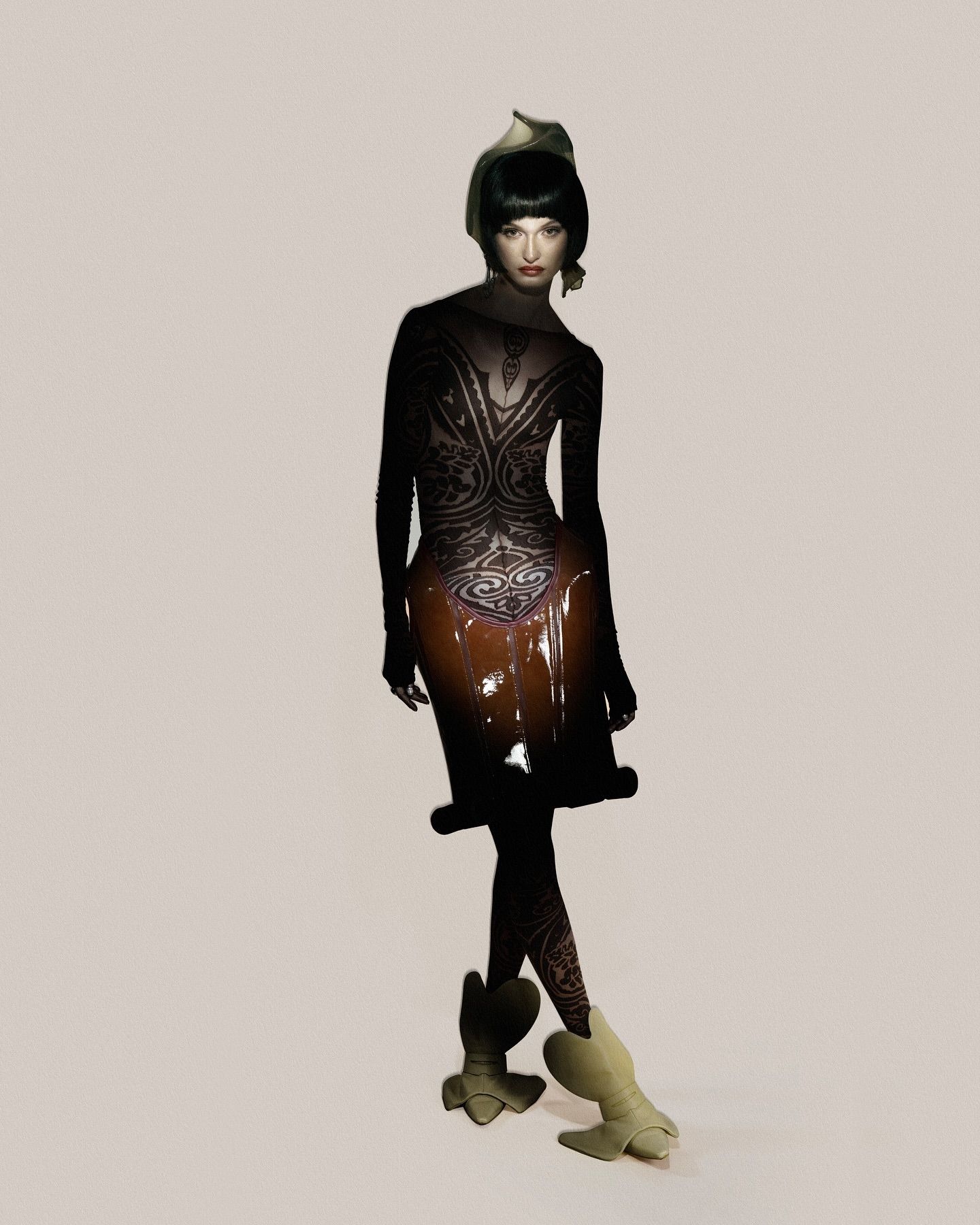 Paco Fausset Leroy Thomas, tout juste diplômé de l’Institut Français de la Mode à seulement 21 ans, incarne une profonde passion pour la créativité et le design. Élevé à Paris, la ville qui a façonné sa sensibilité artistique, Paco a construit son parcours académique autour des arts. Après s’être concentré sur les arts appliqués au lycée, il a affiné son expertise avec une spécialisation en mode, posant ainsi les bases d’une carrière prometteuse dans l’industrie. Quand nous lui avons demandé comment il décrirait sa philosophie de design en tant que jeune diplômé et ce qui distingue son travail dans le paysage créatif actuel, Paco répond : « tout au long de notre évolution personnelle, qu'elle soit physique ou morale, nos interactions avec la société évoluent également. Cette évolution peut parfois déplaire, perturber ou même offenser certains. Les échanges deviennent alors brusques, frontaux, provocateurs, mais aussi empreints de curiosité. C'est à travers le vêtement que j'aime transmettre l'émotion ressentie lors de ces confrontations. Le vêtement peut devenir une arme, non seulement par sa matière, mais aussi par son mouvement et sa construction. Il peut aider à affirmer ce que l'on souhaite transmettre. Sous le poids des jugements hâtifs, il se suffit de plonger dans l'océan relativiste qui assourdit le vécu, tout en recelant une préfiguration de la mort : l’hypersexualisation de notre propre corps. Cette collection est l'occasion de concevoir en grandeur nature mon idéal. Elle pousse à hypersexualiser son propre corps. À l'image d'un rêve, chacune de mes silhouettes est prête à vaincre ses peurs et à affirmer sa place. »