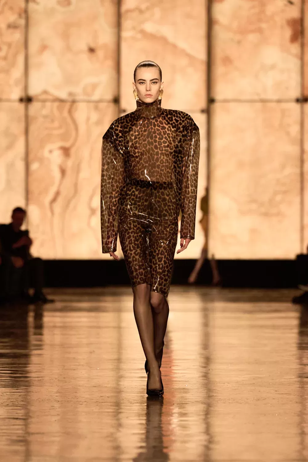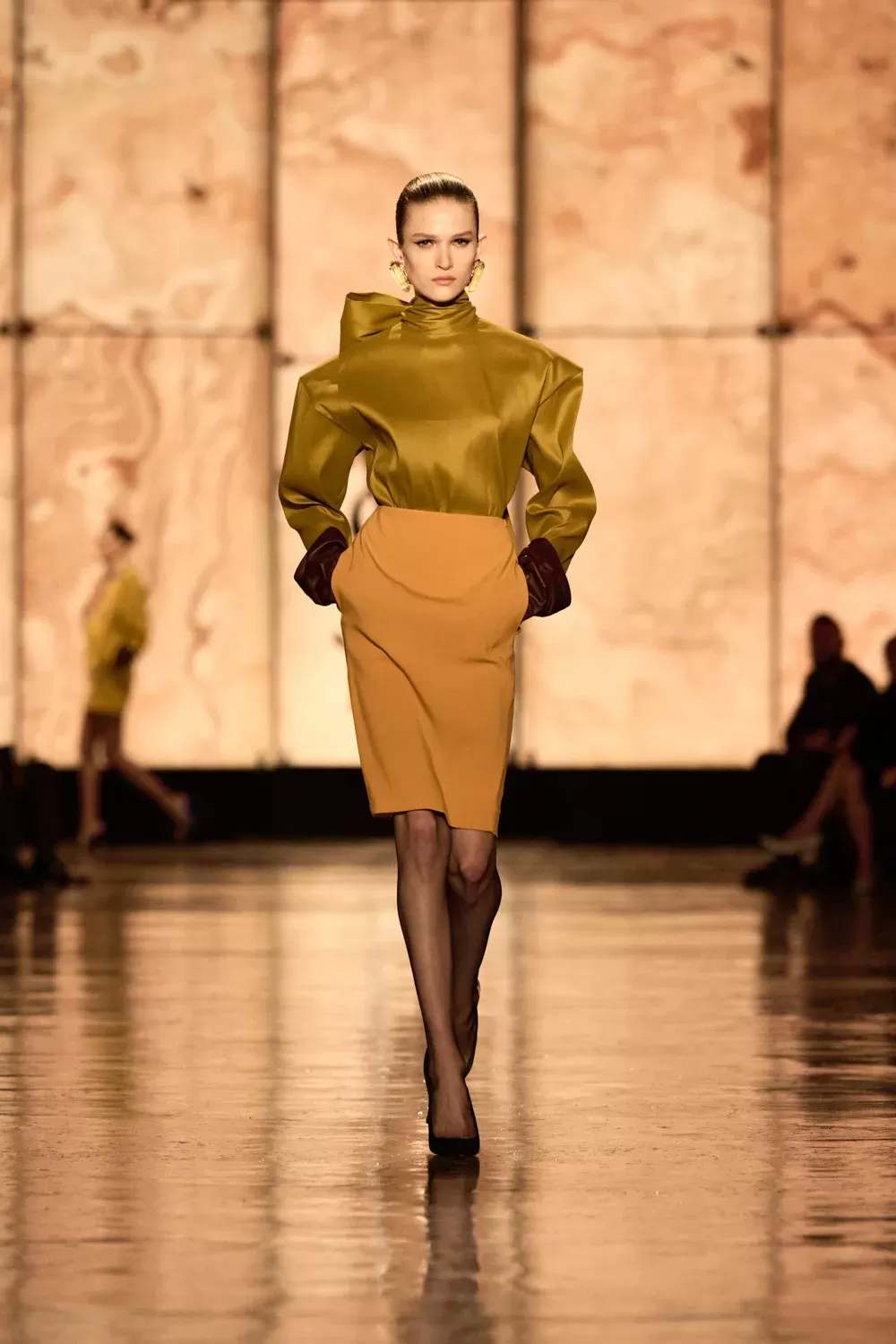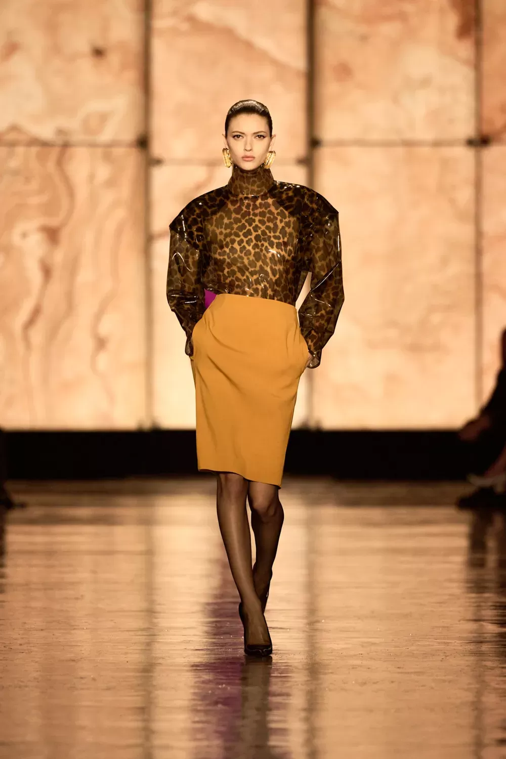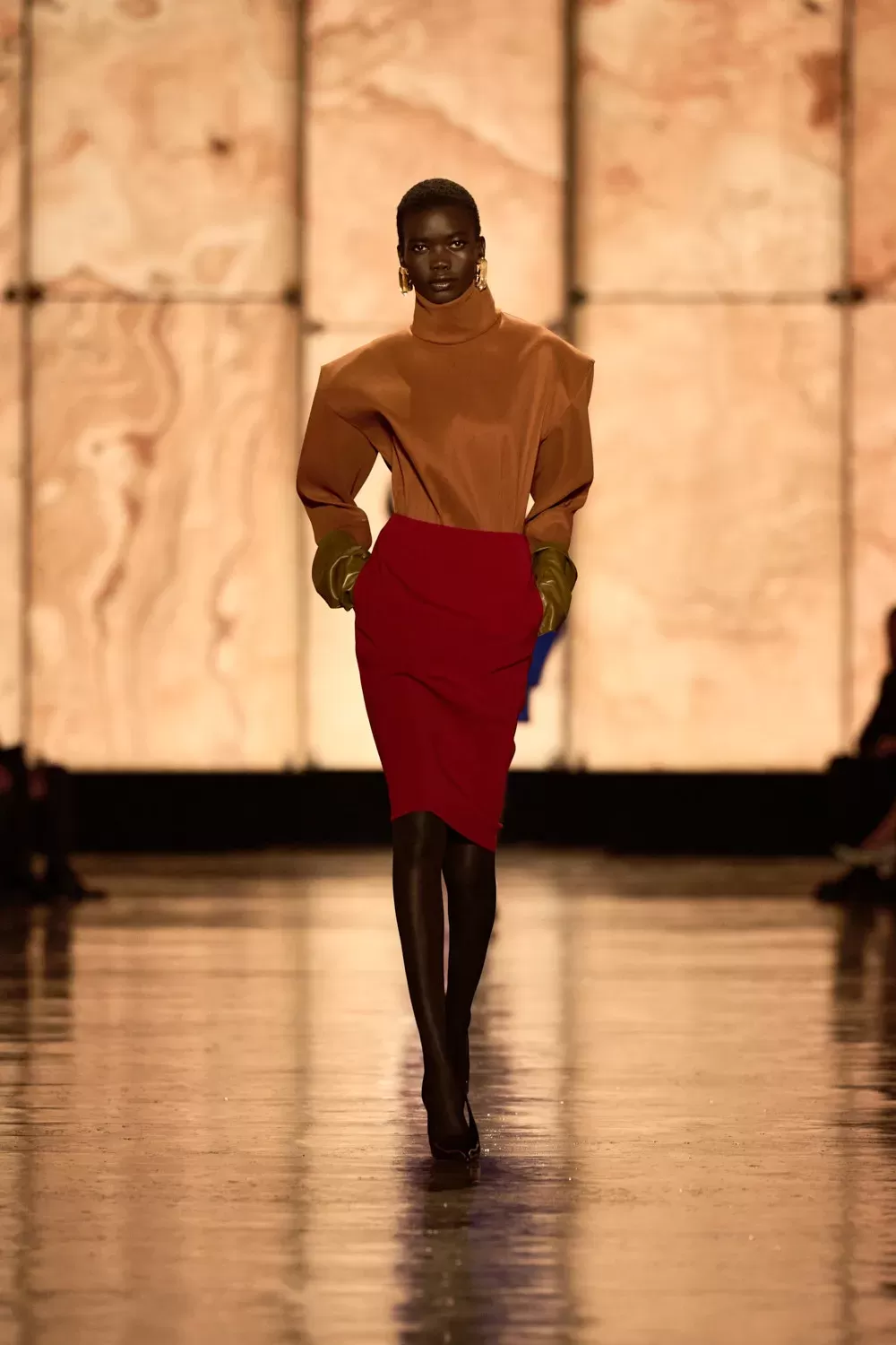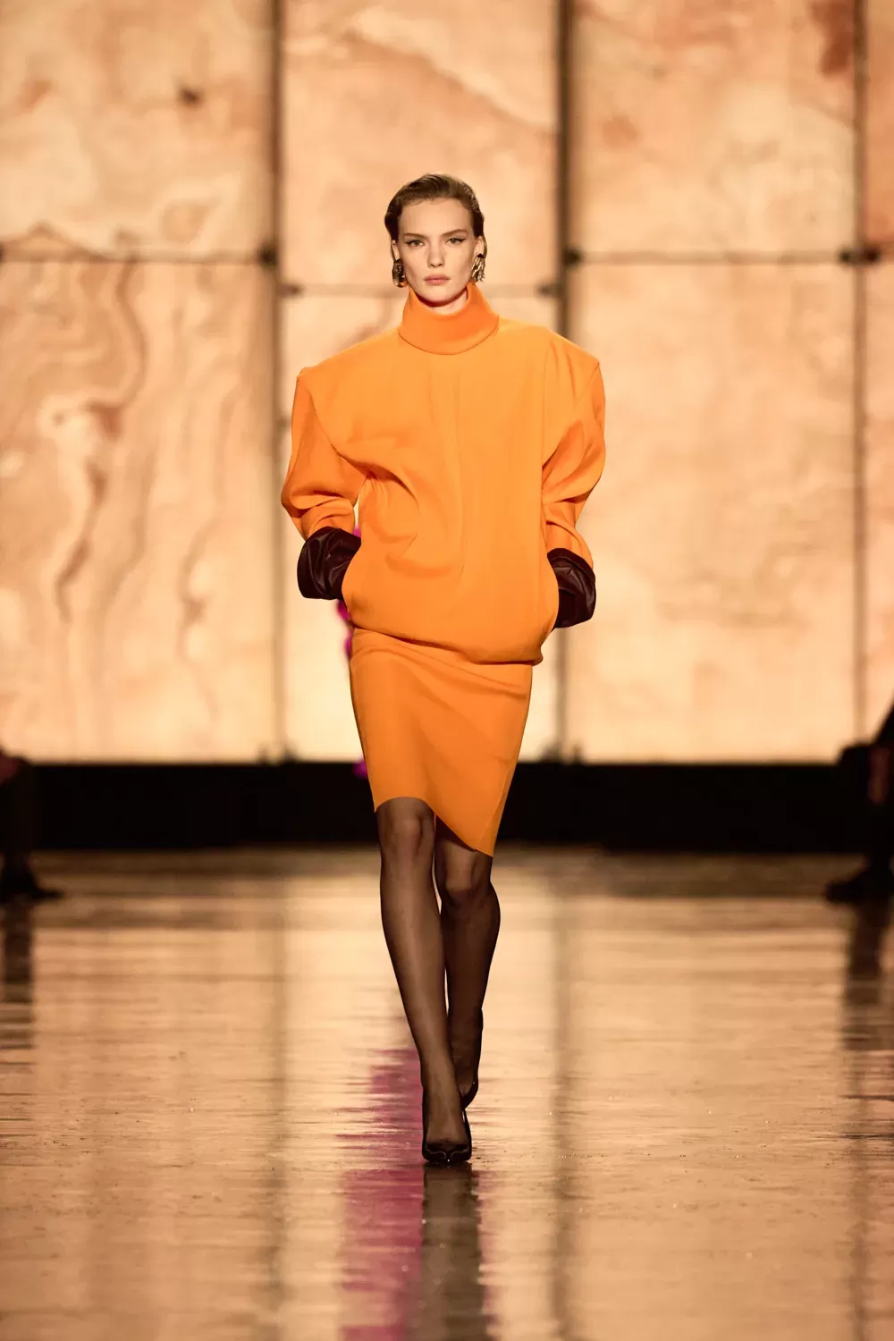 Les silhouettes de Vaccarello suivent un seul et même fil rouge qui se divise toutefois en deux catégories : les formes et les couleurs. Le premier modèle à apparaître, une robe orange à col roulé serrée à la taille par un nœud violet, annonce (littéralement) la couleur. Les 36 premiers looks qui se succèdent au rythme lent et vibrant de la musique sont en effet tous créés à partir de la même colonne vertébrale: les couleurs criardes, les épaules volumineuses, et les jupes qui descendent jusqu’au creux du genoux. La silhouette s’emballe au niveau des épaules et devient plus sage au fur et à mesure qu’elle s’approche de l’ourlet, formant ainsi comme un triangle qui se serait retrouvé la tête à l’envers malgré lui. La figure pyramidale est toutefois cassée chez chacun des looks par le biais de ceintures en cuir colorées ou de chemises rentrées dans une jupe à la taille marquée. On passe en un clin d'œil de l’orange corail au rose fuchsia, du vert sapin au bleu émeraude, du bleu électrique au violet améthyste sans que ce mélange multicolore ne nous donne le tournis, comme si un voile automnale et mélancolique avait adoucit la puissance de ses pigments. Dès la vingtième silhouette, la collection change de cap, et passe à une série de tenues elles aussi toutes reliées par un fil conducteur fin, mais solide. Les tons délaissent les vibrations estivales derrières eux pour prendre une tournure plus automnale, avec une palette de couleurs allant du beige au jaune moutarde en passant par un orange plus tranquille. Les imprimés font également leur première apparition, qu’ils soient léopard ou fleuris. S'en suit l'arrivée sur le podium d’autres protagonistes principaux du défilé : les vestes en cuir portées en guise de robes et serrées à la taille, et les robes en dentelles. Une série de trois looks, la robe délicate d’un bleu profond portée par Bella Hadid, une robe en cuir jaune et une robe en dentelle rouge nous rappellent inévitablement les couleurs de Mondrian, dont la collaboration avec Yves Saint Laurent aura donné vie à un modèle de robe trapèze considéré comme l’un des plus connus et iconiques de la maison française.