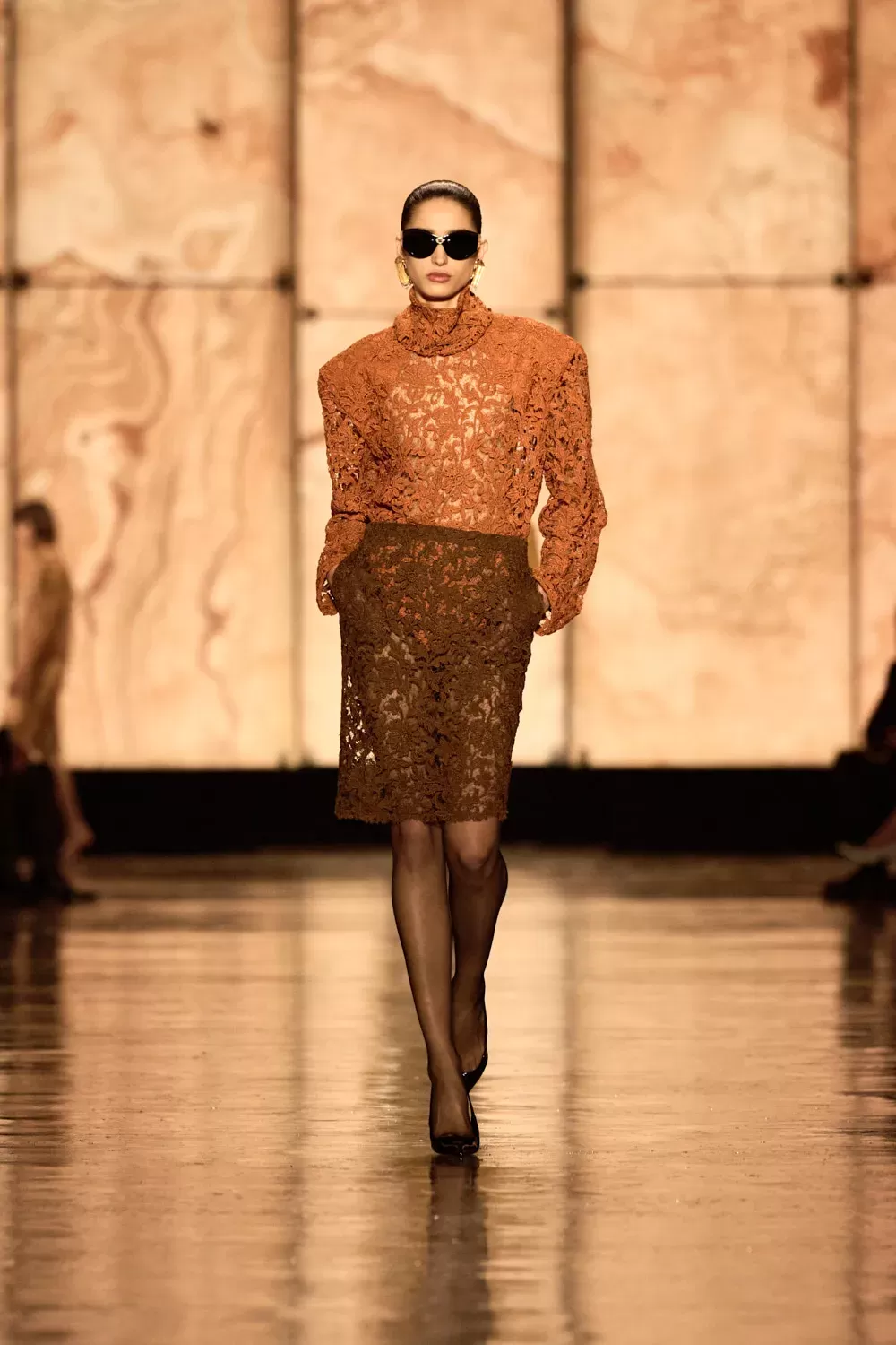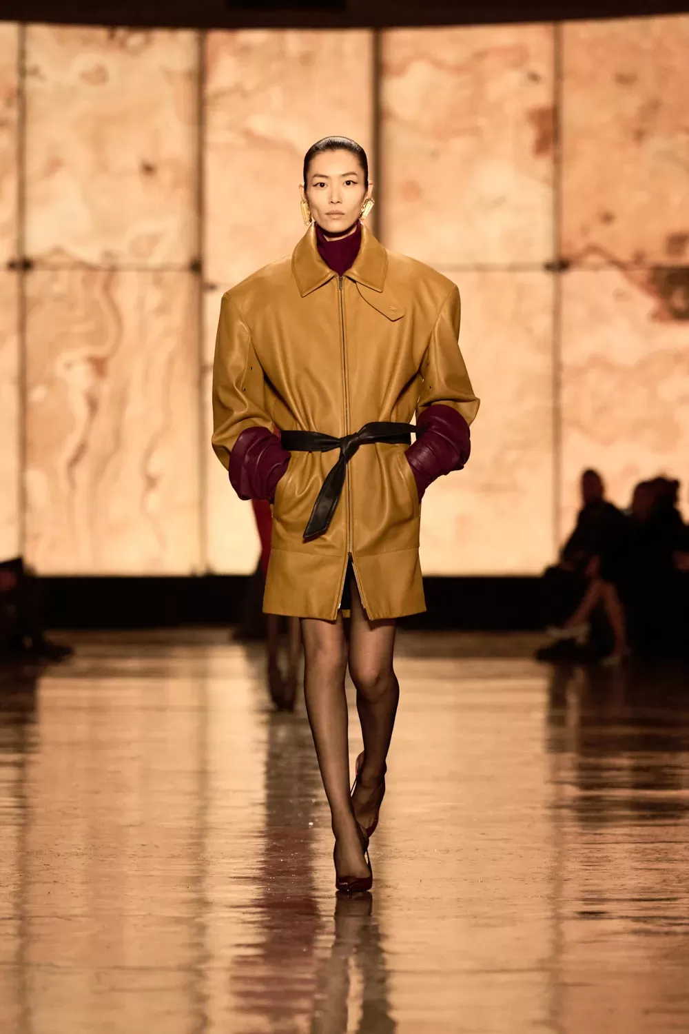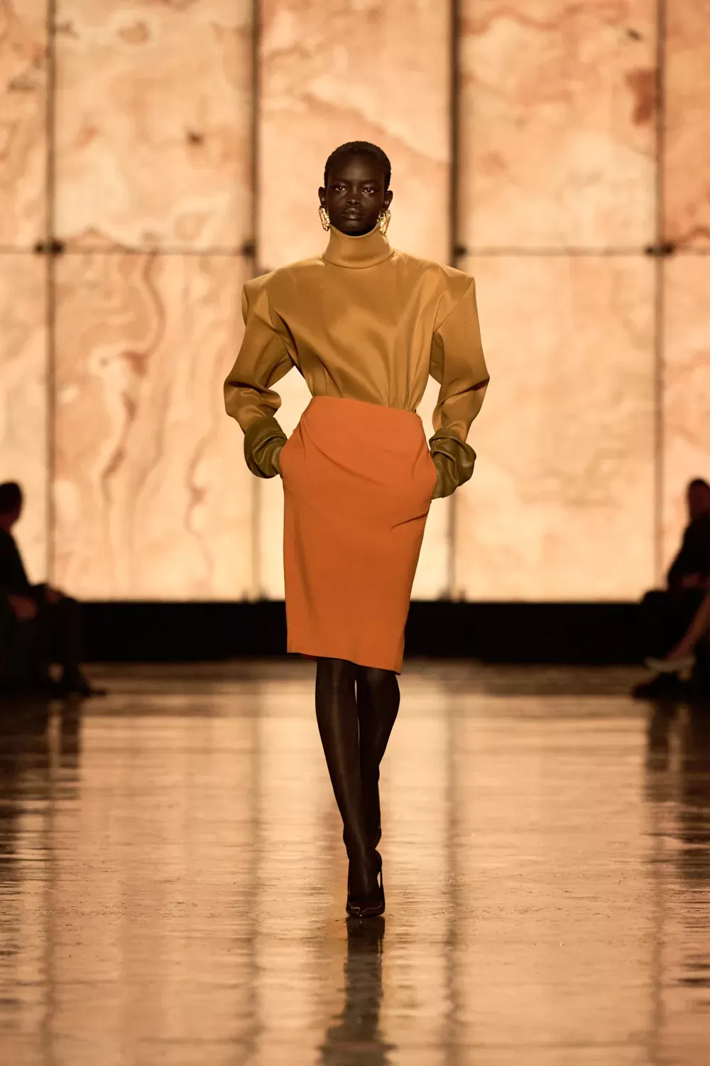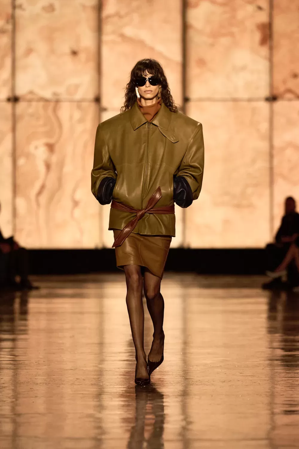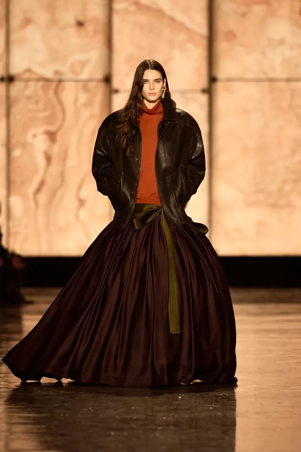 Dès que la robe rouge quitte le podium, arrive le troisième et dernier chapitre de la collection, qui vient chambouler nos extrapolations quant au reste de cette dernière. Ce volet final s’articule autour de silhouettes monochromes allant du marron foncé au brun noisette, les seules touches plus sombres de la collection qui y apportent équilibre, chaleur et réconfort. Au-delà d’amener du contraste aux premiers looks flashy qui nous rappellent quelque peu les robes de bal kitsch satinées des années 80, les neufs derniers looks de la collection entrent également en contraste avec eux-même, comme si le jour et la nuit se mélangeaient dans une seule et même tenue. Si la base de ces derniers looks est la même, c’est-à-dire une jupe ballon partant du milieu de la cuisse et descendant bien bas jusqu’à balayer le podium comme une robe de bal balayerait la piste de danse, le haut varie, passe de tops style nuisette au col bordé de dentelle aux cols roulés, parfois agrémentés d’une lourde veste en cuir toujours respectant le code couleur de ce segment final. Pas l’ombre d’un pantalon. Pas l’ombre d’un sac. Pas l’ombre d’un doute: la femme Saint Laurent est la plus cool de toutes, avec ses mains dans les poches et son blouson posé de manière nonchalante sur le dos.