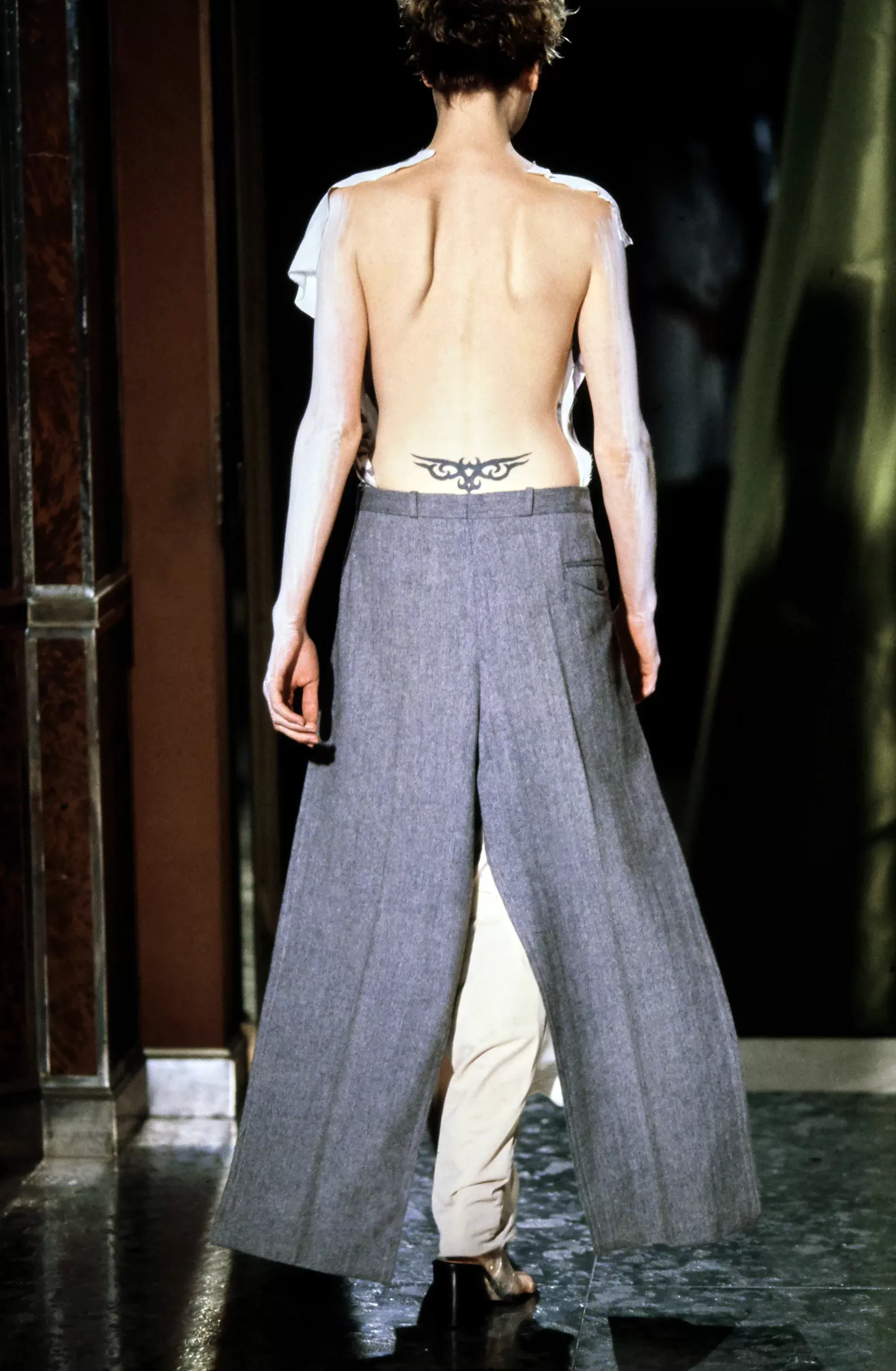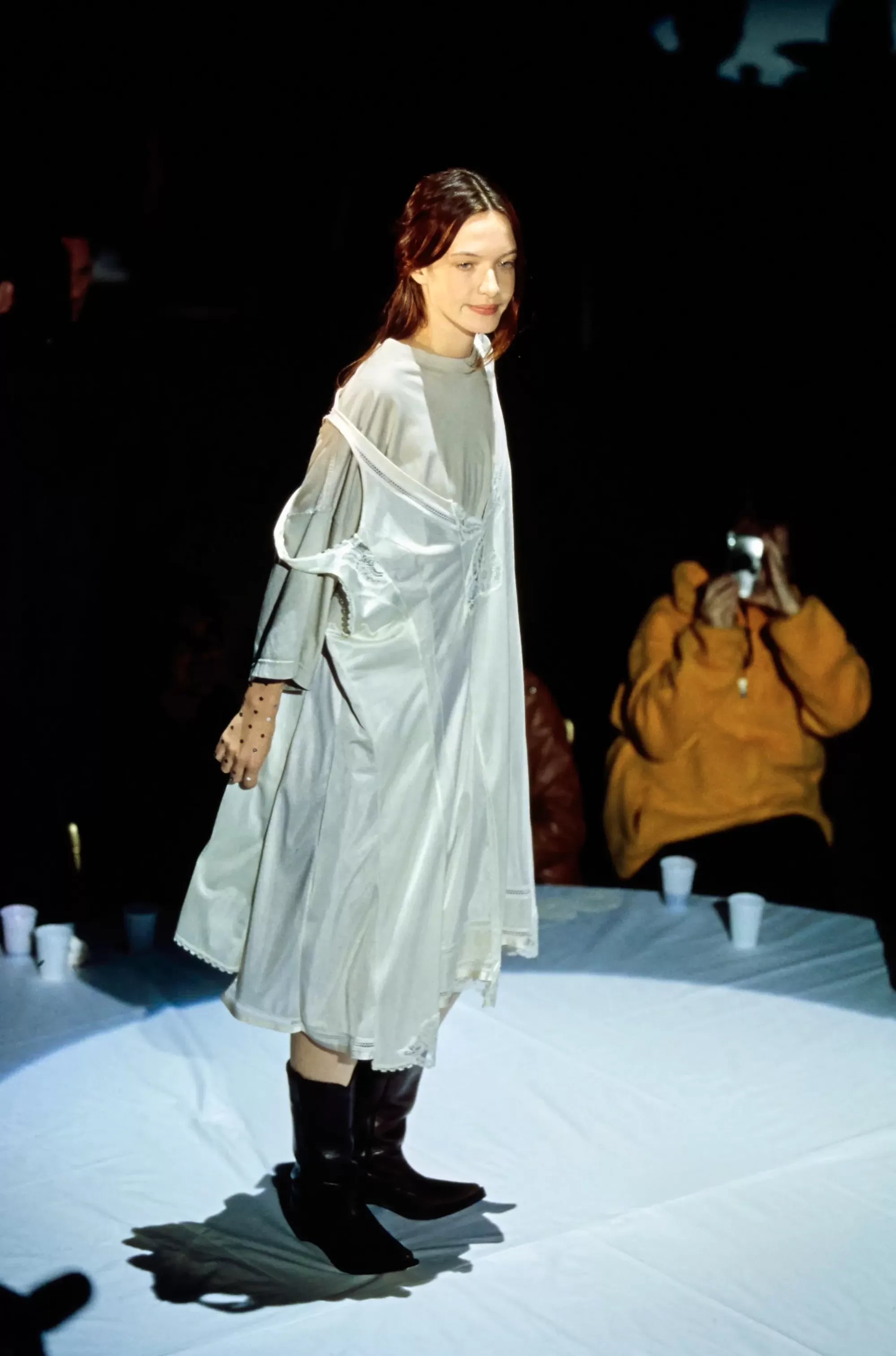 Et en parlant de bout d’assiette et de morceaux collés ensemble ci et là, les matériaux utilisés par le pionnier de la Maison Margiela n’étaient pas les seuls à être explosés en milles morceaux pour mieux être réassemblés. Le créateur Belge a instauré dans la mode une esthétique du cassé, de l’estropié et de l’inachevé qui aujourd’hui encore se complait sur le dos des mannequins des marques de haut voltige du monde entier. Entre les pièces retournées, les doublures occultées, les bouts de tissus éventrés et les coutures exhibées, chez Martin Margiela, rien ne se cache, rien ne se perd, tout se transforme et tout se dévoile. Une chose officiellement confirmée par le designer, qui déclarait « Je m’en tiens à deux principes : ne pas cacher et ne pas miser sur la richesse ». En effet, les silhouettes de Margiela n’inspirent pas la richesse, elles inspirent l’authenticité, le vrai, celui tordu, que l’on laisse apparaître une fois qu’on est seuls et que l’on n’a plus peur d’être jugé. Cette déconstruction de soi et des attentes extérieures se retrouvent dans ses silhouettes aux coupes démantelées, insensées mais aussi dans un usage presque abusif du blanc et un rejet total de reconnaissance. Inspiré du travail de Marcel Duchamps, la déconstruction complète des pièces de Martin Margiela vise en réalité à décontextualiser sa mode, les conventions qu’elle est censée respecter et les prédictions qu’elle est censée rejoindre.