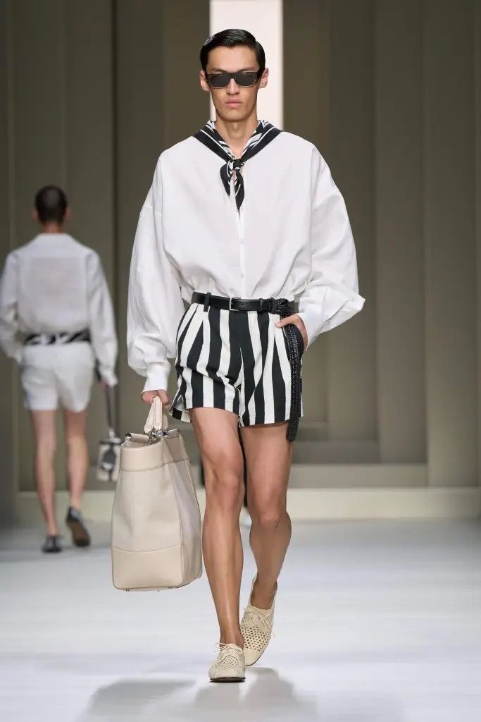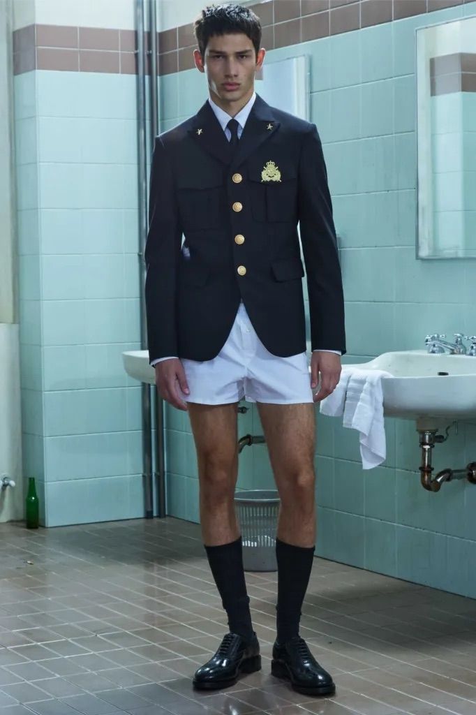 Dans la collection homme SS25 de Gucci, alors encore signée Sabato De Sarno, on voit des shorts tailleur munis d’une ceinture fermant le tout décorée du classique mors Horsebit de la maison. Dans ce défilé, ces shorts sont si courts qu’ils disparaissent presque sous les chemises imprimées ou à franges ainsi que sous les polos rayés. Le duo Dolce & Gabbana, quant à lui, fait de ce vêtement un élément central de l’uniforme du « masculu » sicilien. Dans sa SS25 intitulée “Italian Beauty”, le duo de designers présente des shorts taille haute à pinces, maintenus par des ceintures en cuir tressé ou des foulards, associés à des cardigans et polos ajourés, conçus avec des techniques artisanales rappelant le cannage des chaises et paniers. Les short shorts sont aussi souvent mis en avant dans les looks preppy, comme dans la Resort 2025 de Louis Vuitton, où Pharrell Williams les associe à des pulls à motifs norvégiens, portés avec des mocassins en cuir d’où dépassent des chaussettes blanches côtelées ornementées de perles. Chez Lazoschmidl, dans la FW25, on associe chemises crop rayées et cravates à des boxers blancs, portés avec des mi-bas et des chaussures de ville lacées. Thom Browne fait du micro‑short un élément central de son uniforme personnel et de ses collections : dans la Pre‑fall 2025 homme, les shorts deviennent plus “quirky” et moins rigides, imprimés de motifs ludiques et enfantins, combinés à des sacs en forme de teckel. Dans la collection SS25, Lacoste revient à son habitat naturel avec des ensembles tennis blancs et verts, micro‑shorts et polos brodés du mot “match” à l’avant.