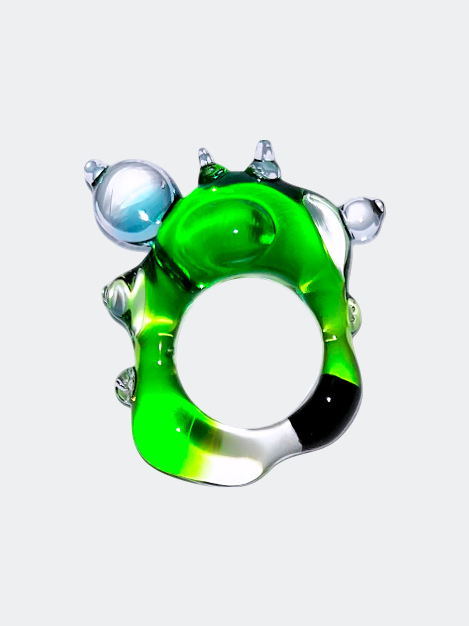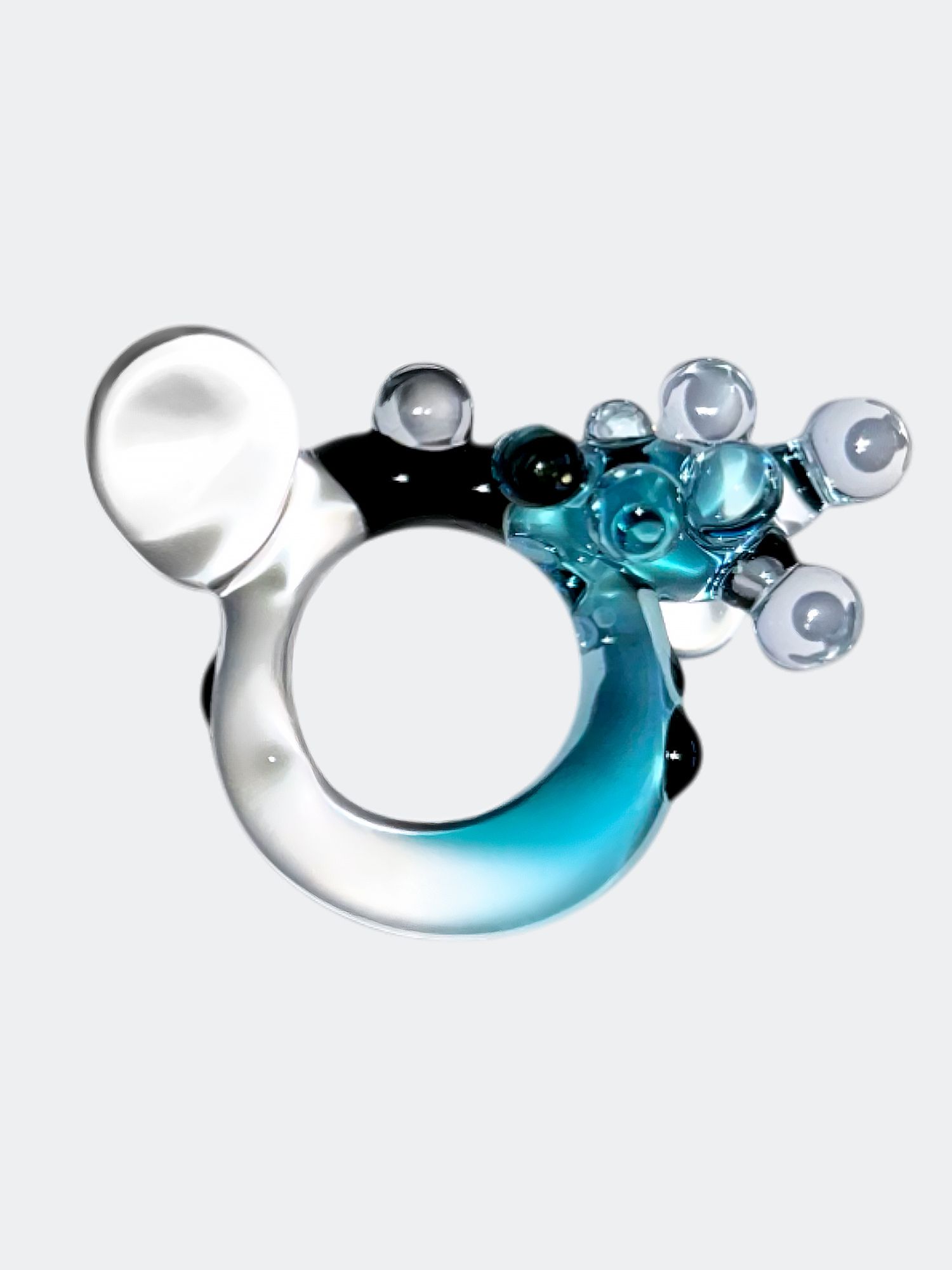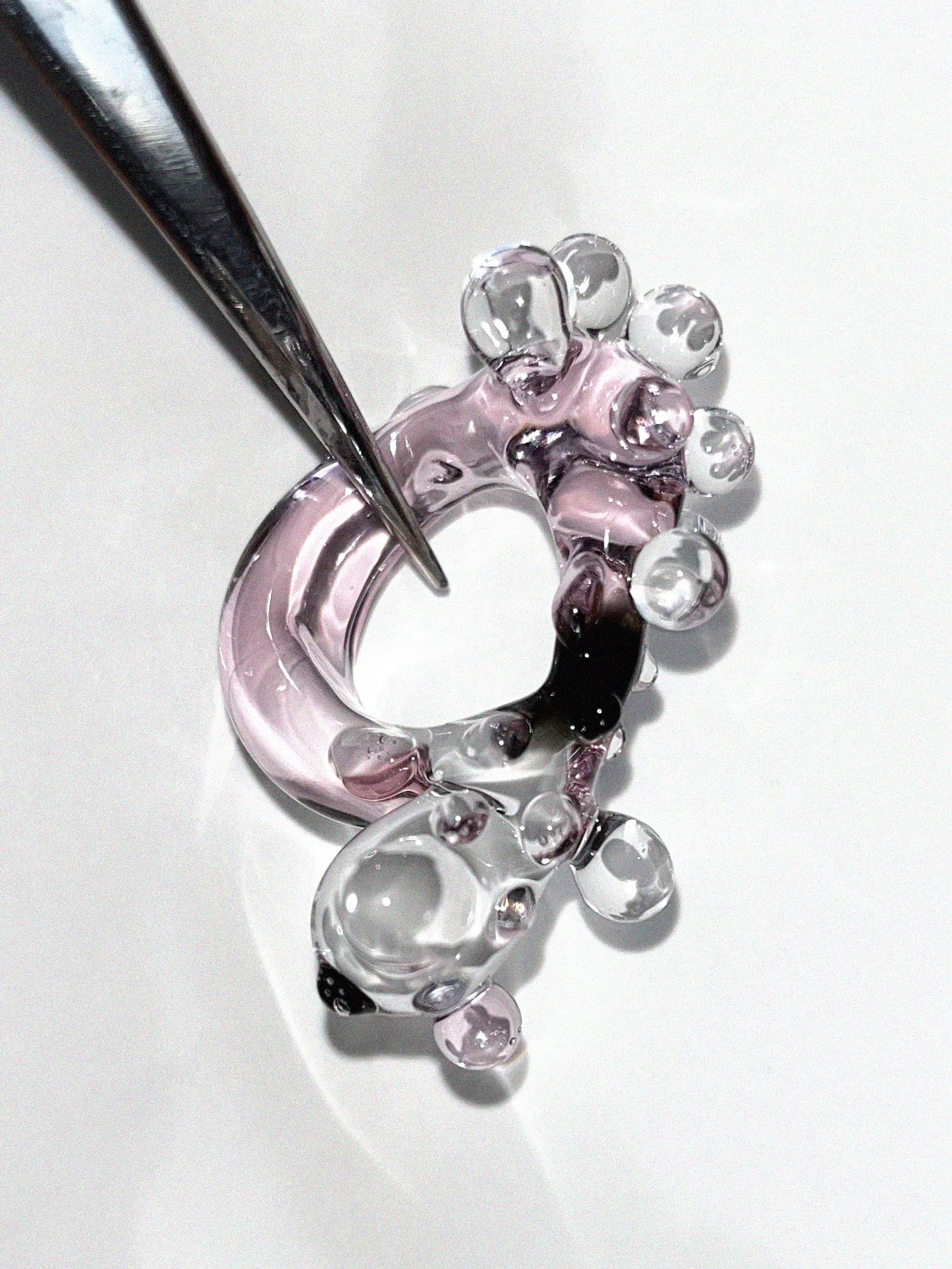 Et en parlant de matière, bien qu'elle adore manier le chalumeau, Chloé n’a pas choisi le chemin le plus facile, en optant pour le verre borosilicaté pour ses bijoux. « J’ai commencé avec le verre sodocalcique, une autre typologie de verre qui est plus sensible, plus liquide, plus enclin aux chocs thermiques. C’est quand j’ai commencé à travailler les bagues que je suis passée au borosilicate. C’est un verre plus résistant aux chocs thermiques, plus pérenne dans le temps, qui garde tout son éclat. Il est utilisé notamment en verrerie de laboratoire, en aéronautique, en optique. Il supporte mieux les chocs, même si bien sûr cela reste du verre, un matériau délicat dont il faut prendre soin. Il demande aussi une température de chauffe plus élevée » continue-t-elle.