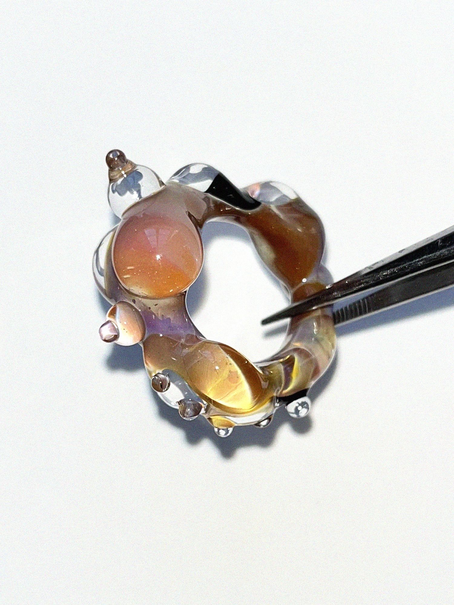 Elle n’a toutefois pas été seule dans son parcours vers la compréhension et la maîtrise de cette matière complexe et particulière, mais a eu la chance d’être épaulée par l’artiste japonaise Michi Suzuki, vétérante du travail en perles de verre. « C’était une vraie rencontre. Sa précision, sa concentration, sa gentillesse. On ne parlait pas beaucoup, elle m’offrait un thé, on échangeait beaucoup par les gestes. Elle me montrait, puis me laissait faire. J’ai d’abord fait beaucoup de perles pour apprendre. Puis un jour, elle m’a montré comment faire des bagues. Et à partir de là, j’ai commencé à tester, à expérimenter. J’étais émerveillée d’avoir accès à ce savoir-faire » raconte Chloé.