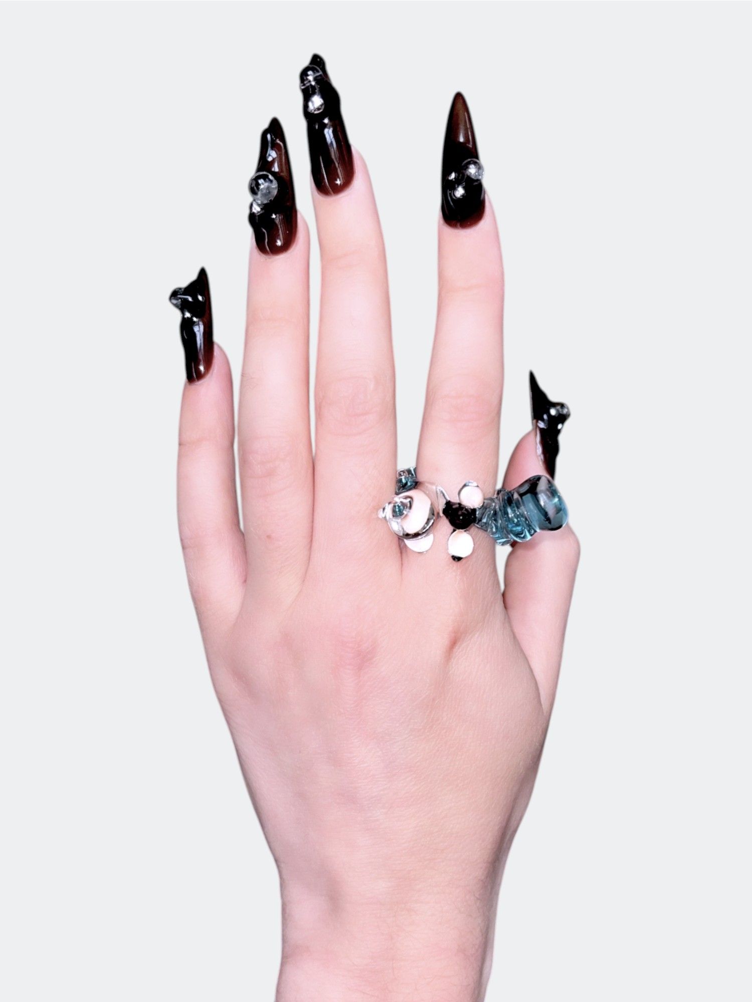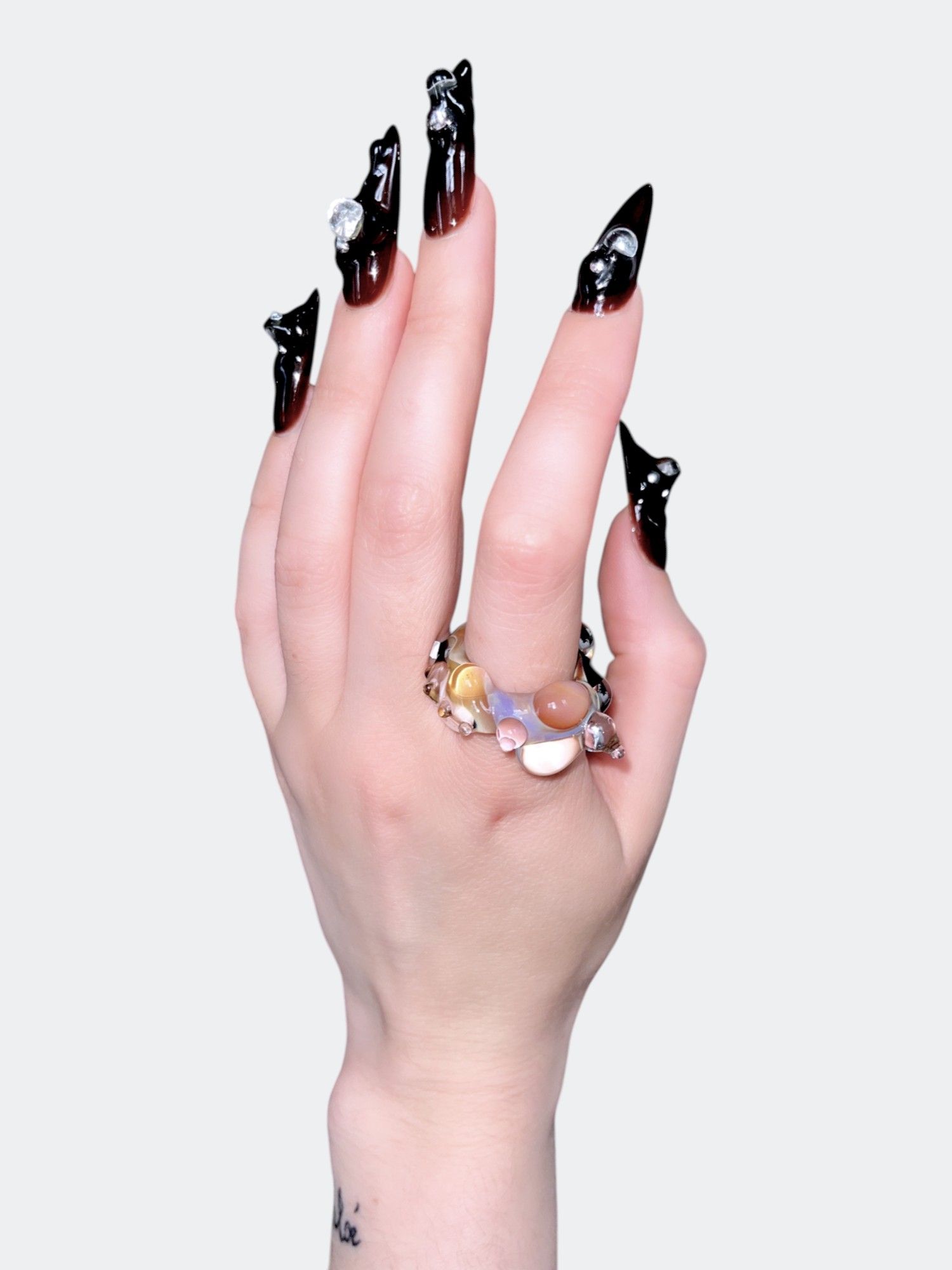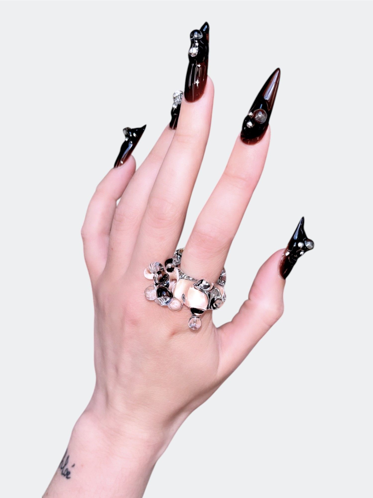 Des doigts de la jolie Théodora à ceux de Yeozang du groupe Ateez en cover de Numéro Magazine, les bagues de JoliPNJ sont partout. Tantôt transparentes tantôt colorées, aux recoins parfois arrondis souvent pointus mais toujours en verre, les bijoux de la créatrice Chloé Foulquier représentent le parfait équilibre entre le doux et le féroce, le transparent et l’opaque, l’ombre et la lumière. Forte de son expérience chez Balmain et Miu Miu, Chloé réussit aujourd’hui à allier comme personne tous ces éléments contradictoires et pourtant complémentaires dans des bijoux uniques, poétiques, auto-suffisants, au coeur d’une marque à la forte personnalité qu’elle nous raconte aujourd’hui à travers ses propres mots.