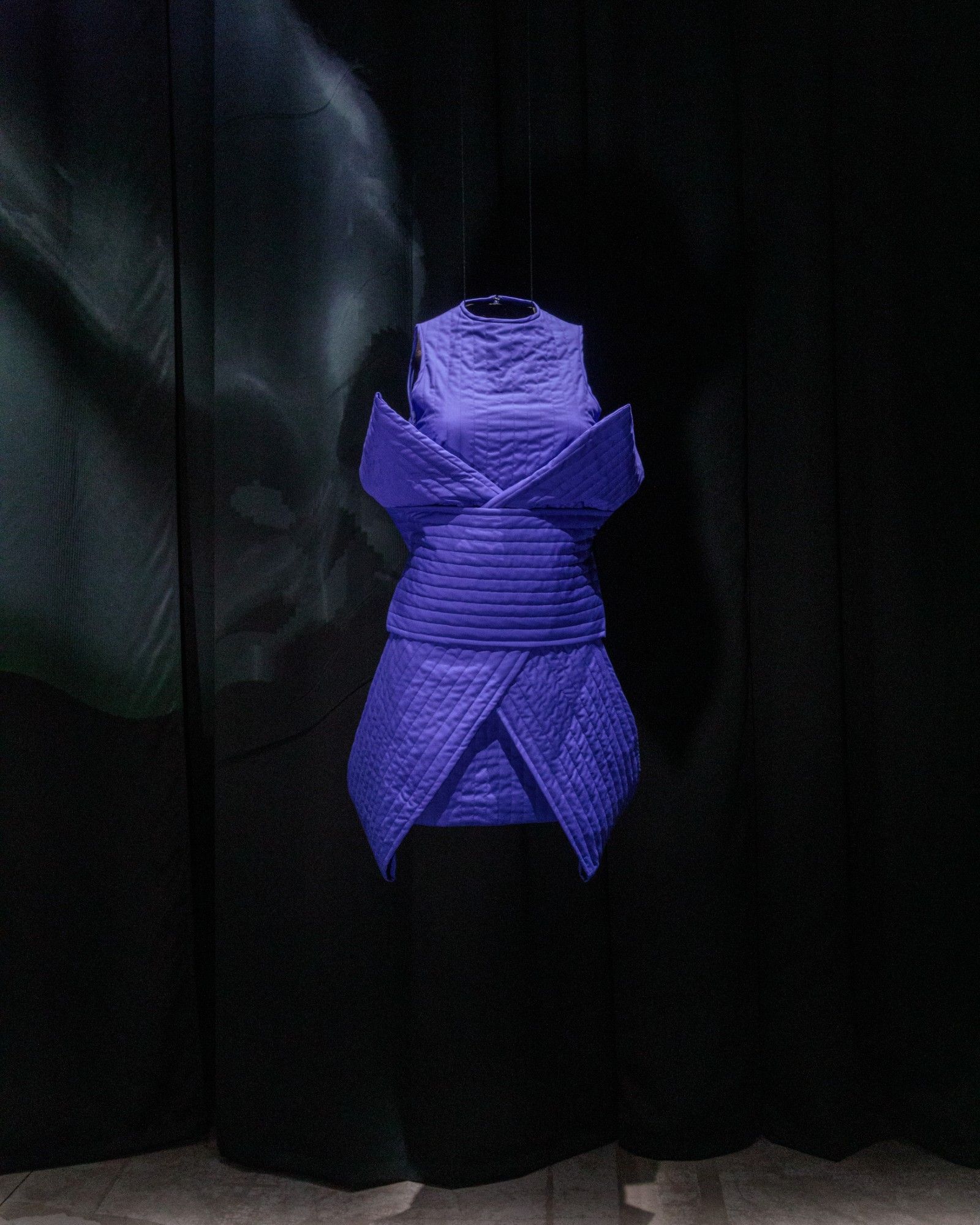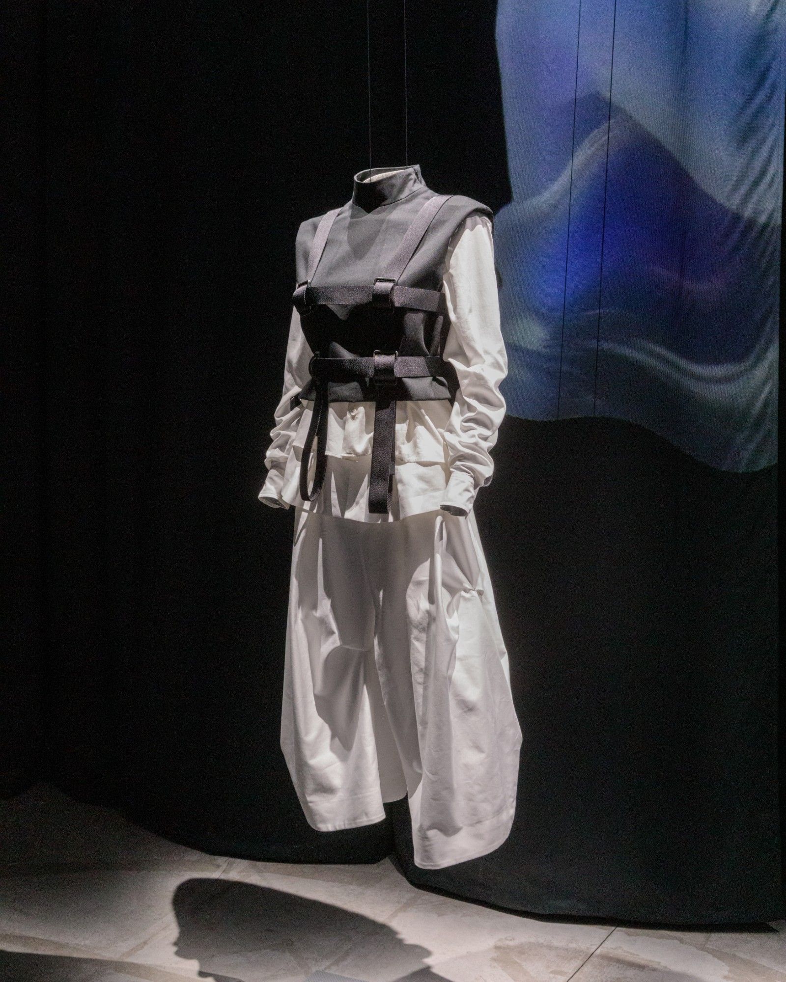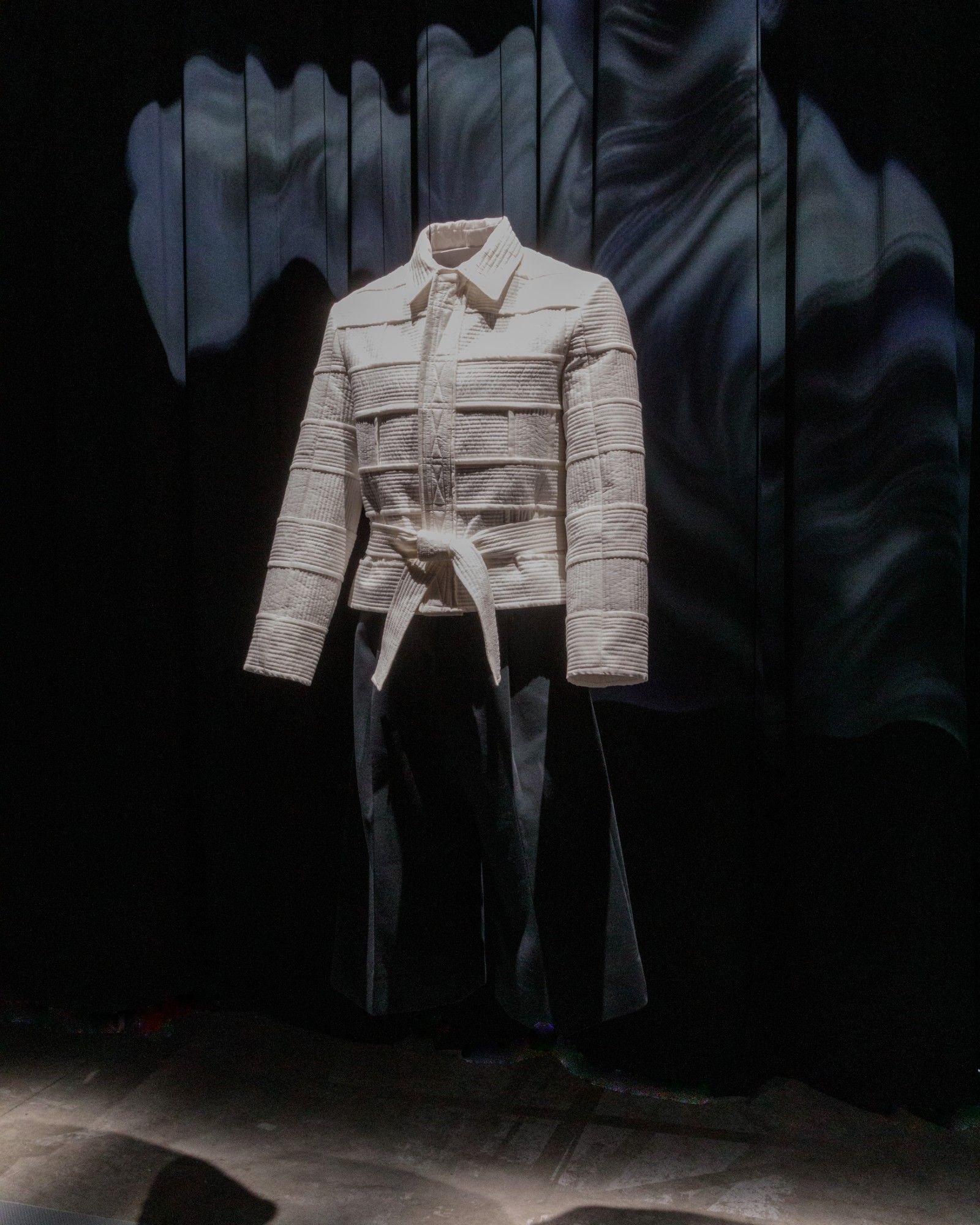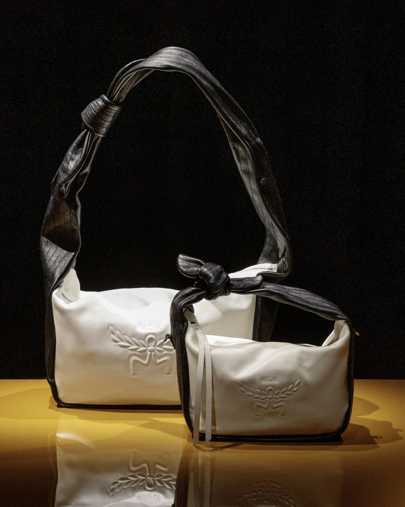 Sous la direction de Schönberger, MCM a proposé des pièces qui ont réinterprété des éléments martiaux avec une touche luxueuse. Une large ceinture d’arts martiaux s’est transformée en une robe bustier, qui a enveloppé le corps de plis sculptés. Un nœud de Taekwondo bleu brillant a défini une robe courte et a transformé un symbole de restriction en point focal. Une tenue inspirée du Zen, minimaliste, a combiné un gilet aux lignes épurées, une chemise impeccable et un pantalon large plissé, pour un look discipliné mais fluide. Les vestes bomber matelassées ont présenté des épaules définies et des tailles cintrées, tandis qu’une veste blanche carrée est née de la couture de ceintures d’arts martiaux, unissant tradition et innovation. Il y avait aussi un blazer croisé tailleur, orné d’un nœud martial et associé à un pantalon large, qui ont capturé la fluidité du mouvement. «Pour les sacs, nous avons eu un design noir et blanc avec des coutures sur une ceinture de cuir et un nœud», a expliqué Schönberger. «Notre sac 3D diamond a eu une forme carrée, que j’ai trouvée enthousiasmante pour la maroquinerie, avec des clous qui ont ajouté une touche punk. Pour les hommes, c’était le bomber sur un costume tailleur. Pour les femmes, c’était la robe noir-blanc avec une ceinture dynamique qui semblait bouger autour du corps. Ces pièces ont raconté l’histoire.»