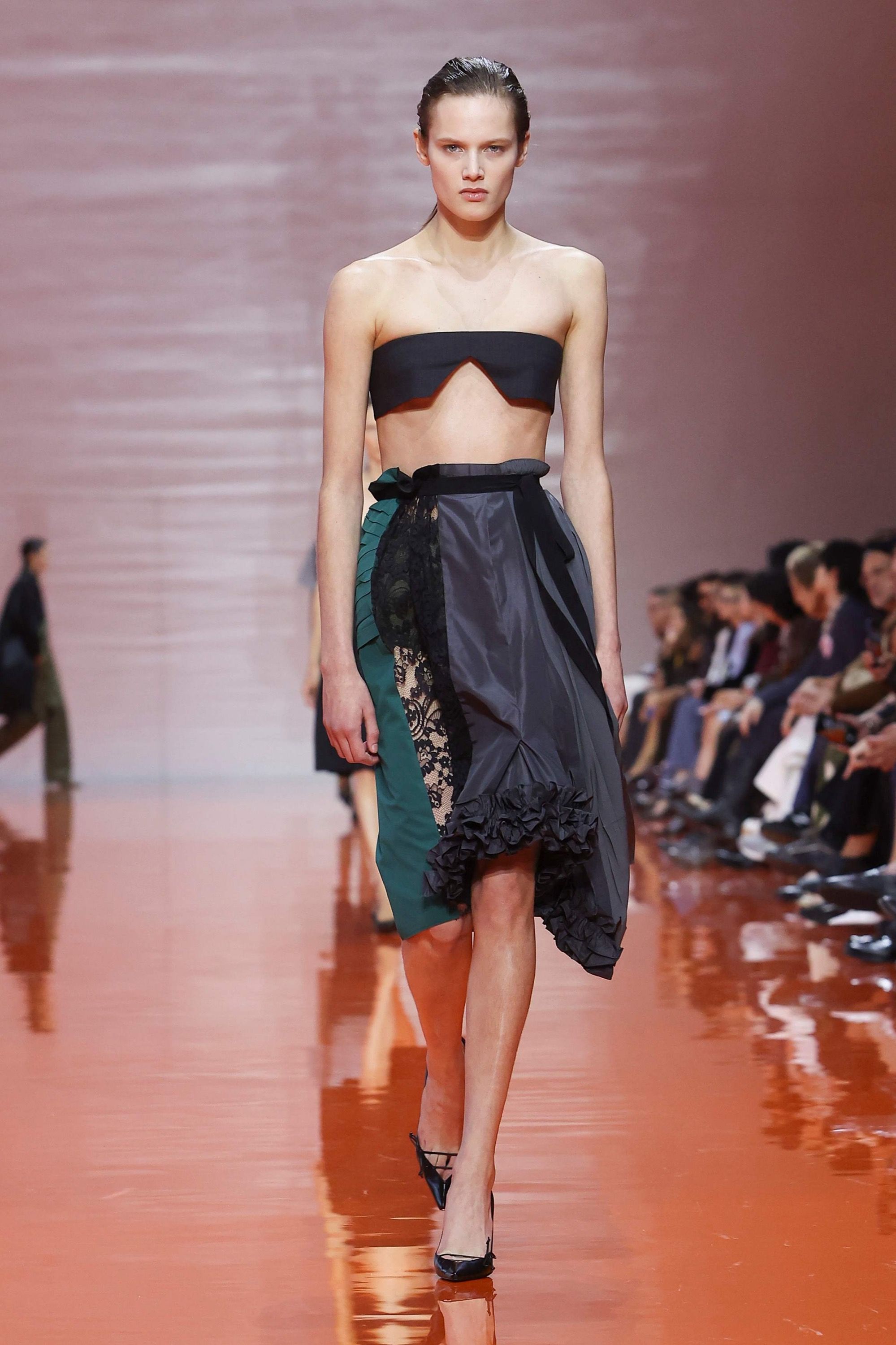 Les premiers looks du défilé ont servi à ancrer cette pensée dans l’esprit du public : des bleus de travail – pas tout à fait bleu, mais presque – associés à de longs gants en satin froissés et très colorés. Au poignet, un sac en cuir noir qui ressemble fortement à un sac hybride muni d’une bandoulière. Un peu de romantisme ne pouvait manquer ; même dans des temps sombre, après tout, la mode a besoin de poésie. Ainsi se sont succédé une série de jupes en patchwork de soie, dentelle et plissé colour-block, qui, associées au noir, font émerger de la traditionnelle austérité pradesque une tendance joyeuse, plus légère.