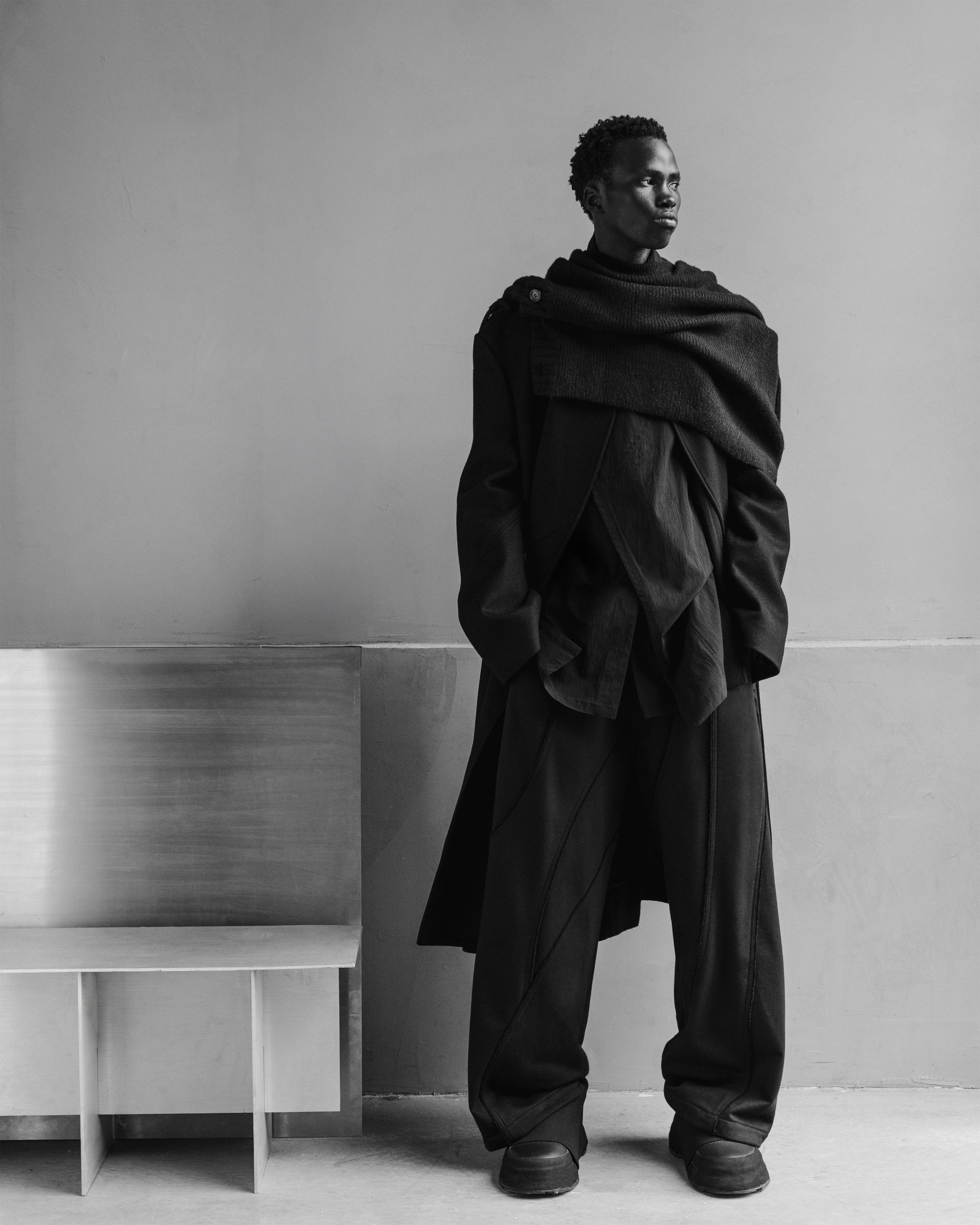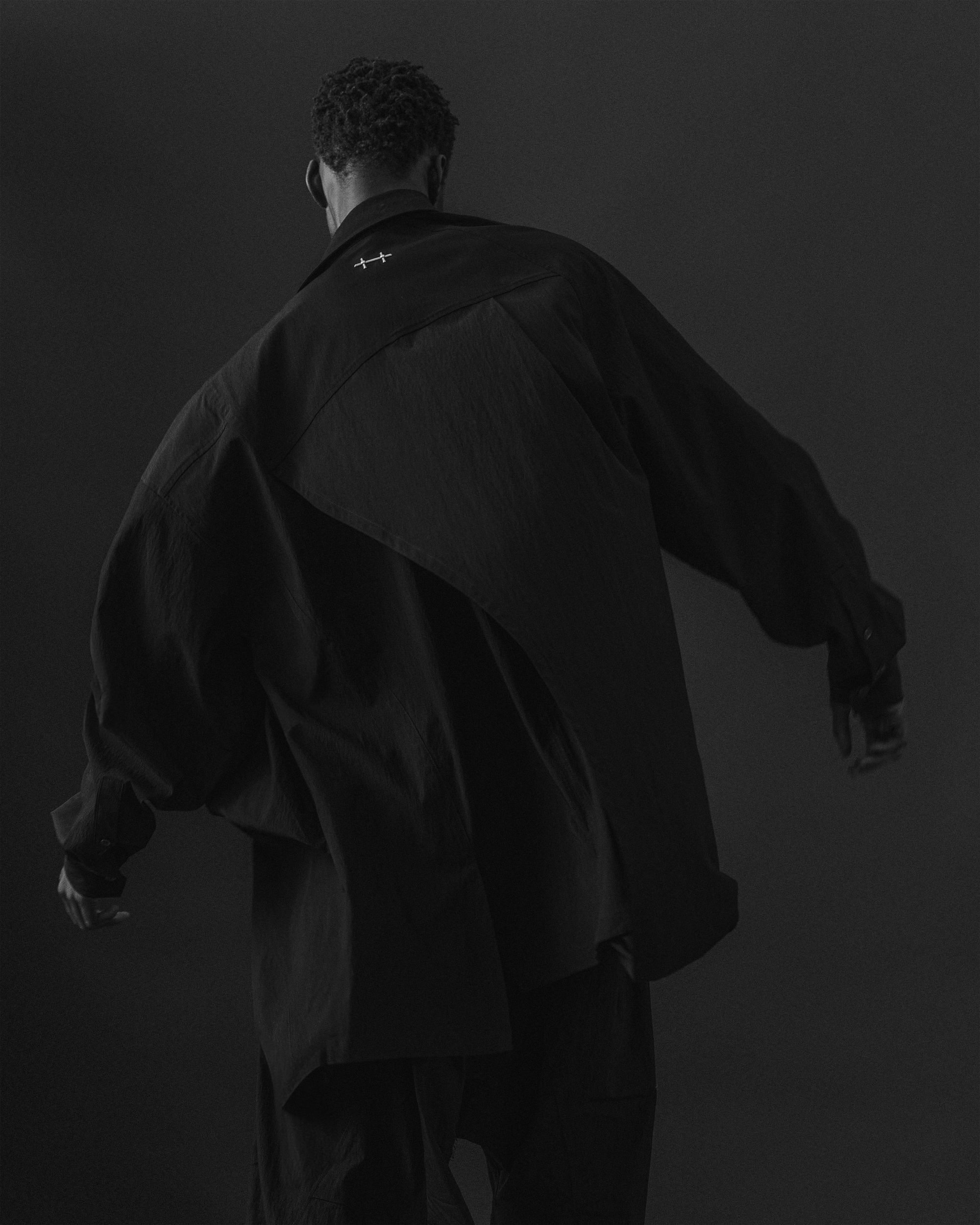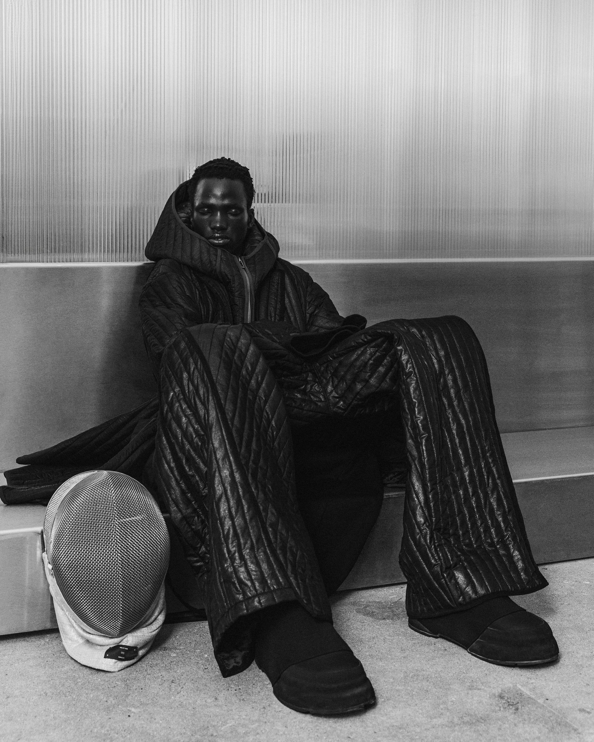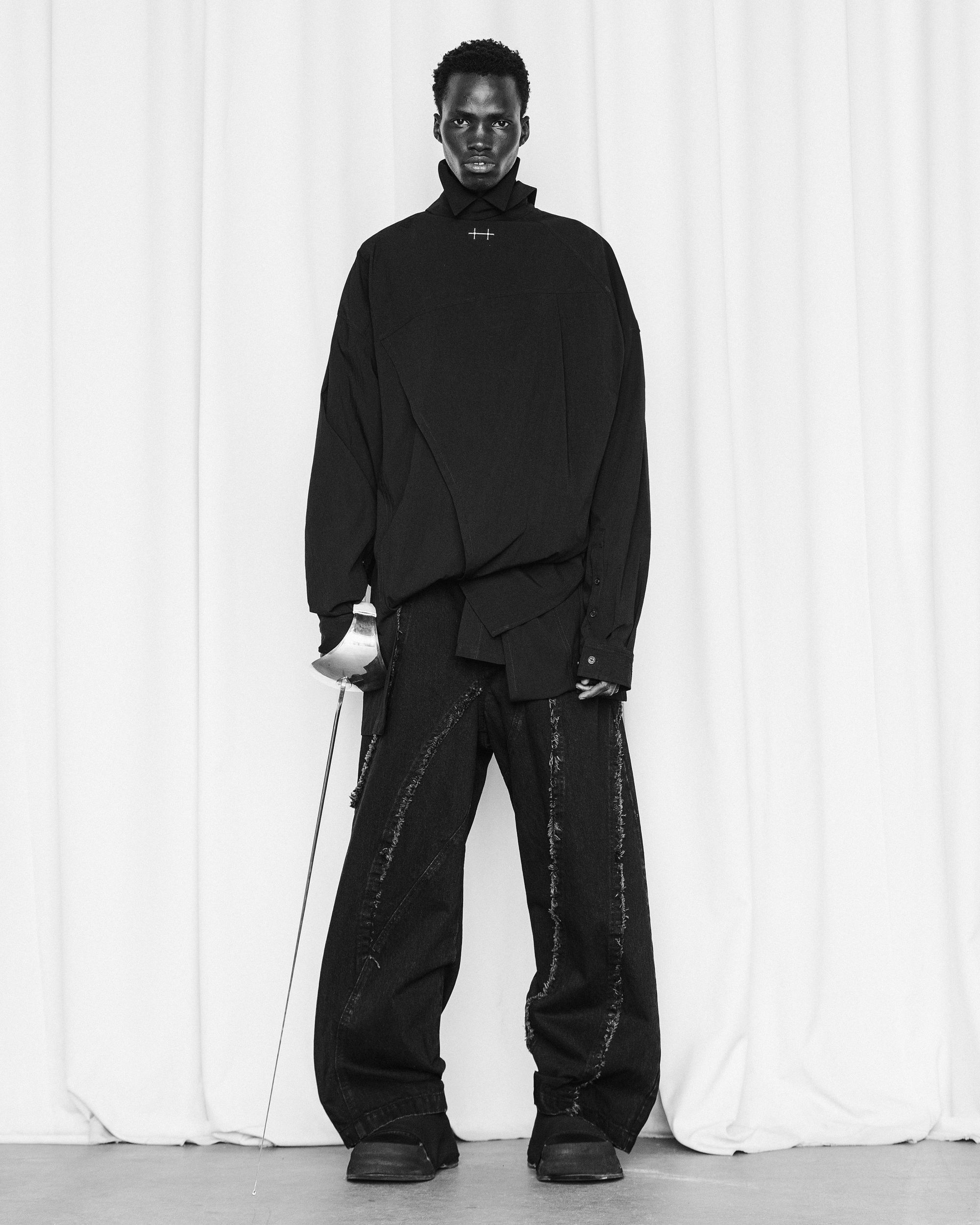 Le cœur poétique de Songzio, réputé pour son tailoring expressif et fluide, est venu défier la rigueur du design technique et l'esthétique industrielle structurée d'Heliot Emil. De ce face-à-face est né un équilibre fascinant, avec un "Duel" qui reflète l'ambivalence même de l'escrime, un dialogue incessant entre l'agressivité et la grâce, entre la rigidité et le raffinement, où la structure des vêtements se fluidifie dans le mouvement. Une philosophie qui se matérialise dans les différentes séries de la collection. La série L'"Adversaire" sculpte l'incertitude avec des coupes asymétriques et des plis courbes, offrant des silhouettes modulables, tandis que les séries "Aketon" et "Plastron" (faisant référence aux protections d'armure) réinterprètent le vêtement comme une armure moderne, à travers des pulls et blazers matelassés d'une fonctionnalité avant-gardiste.
