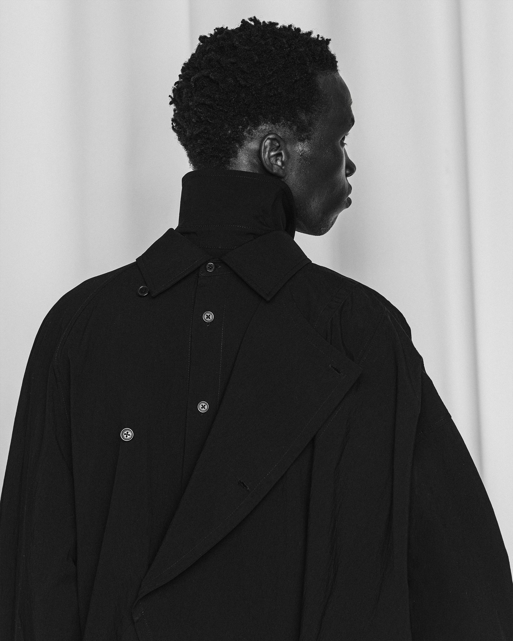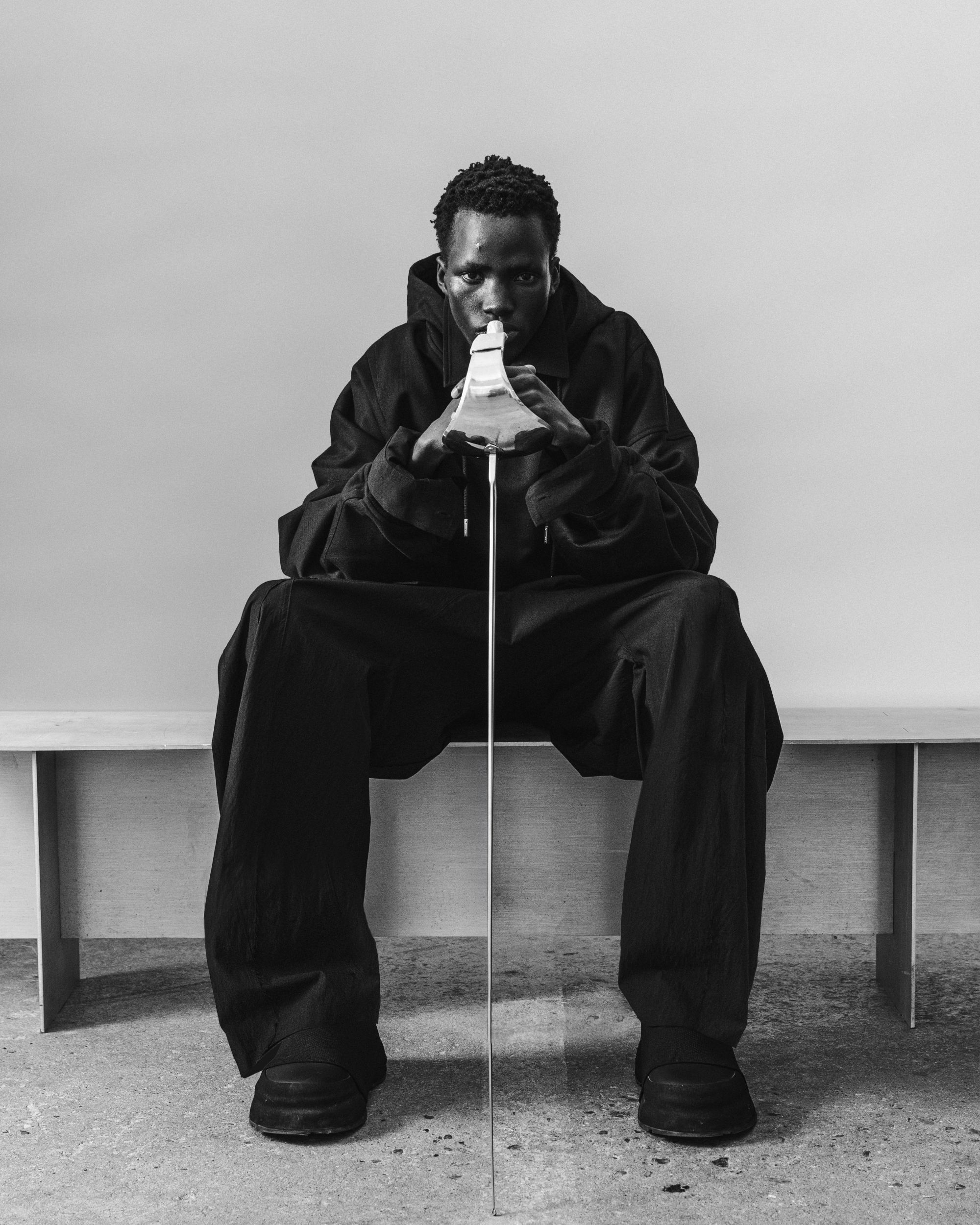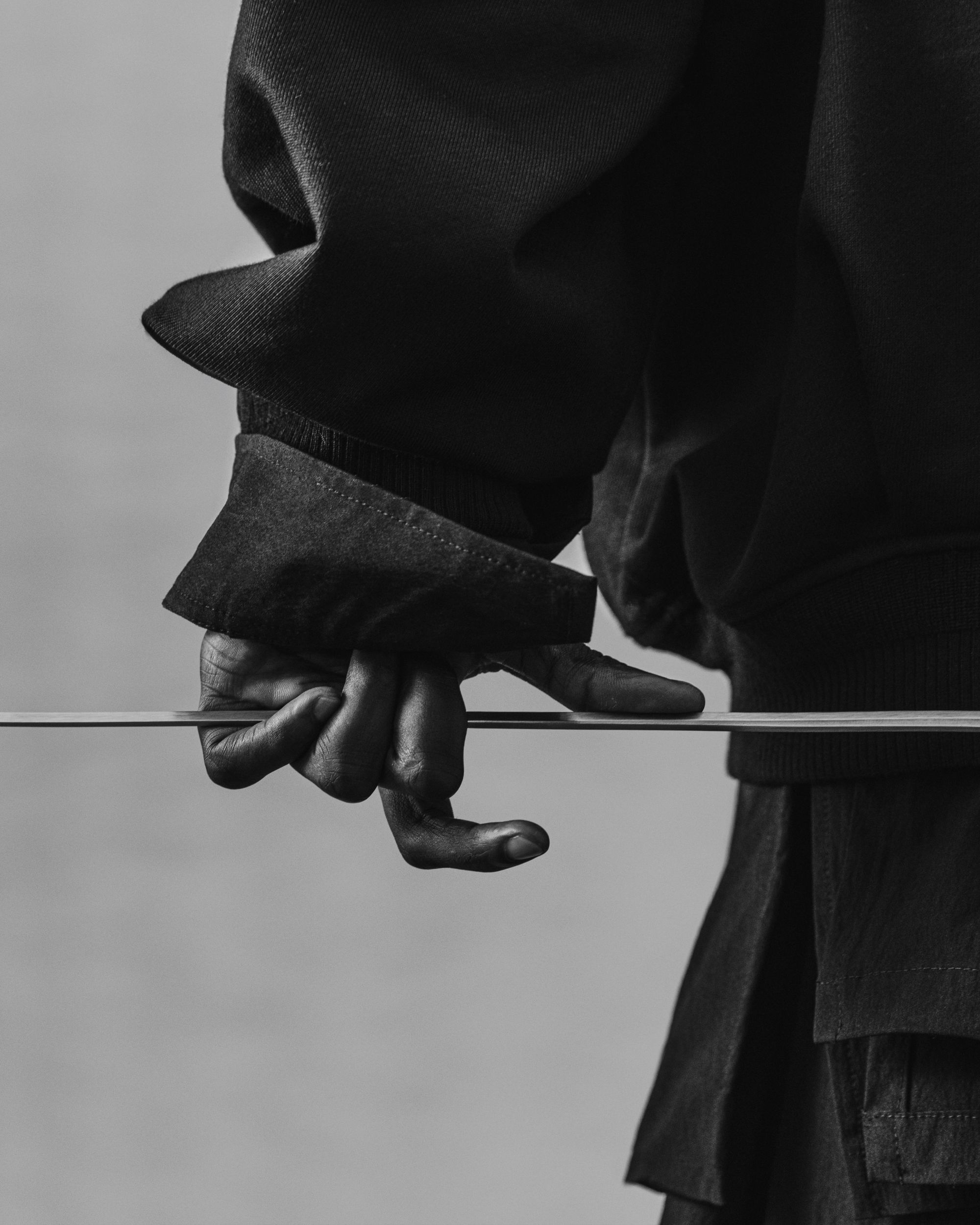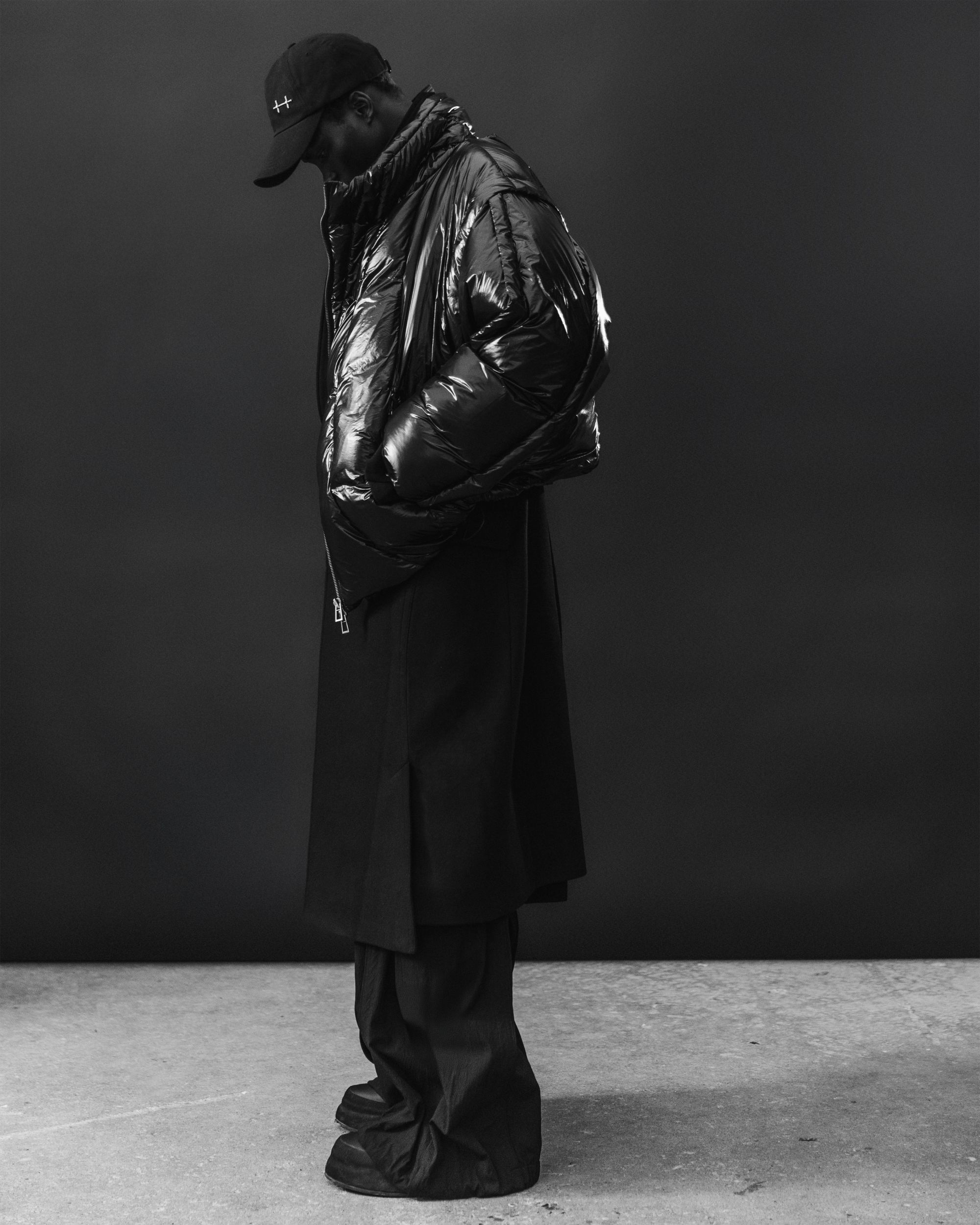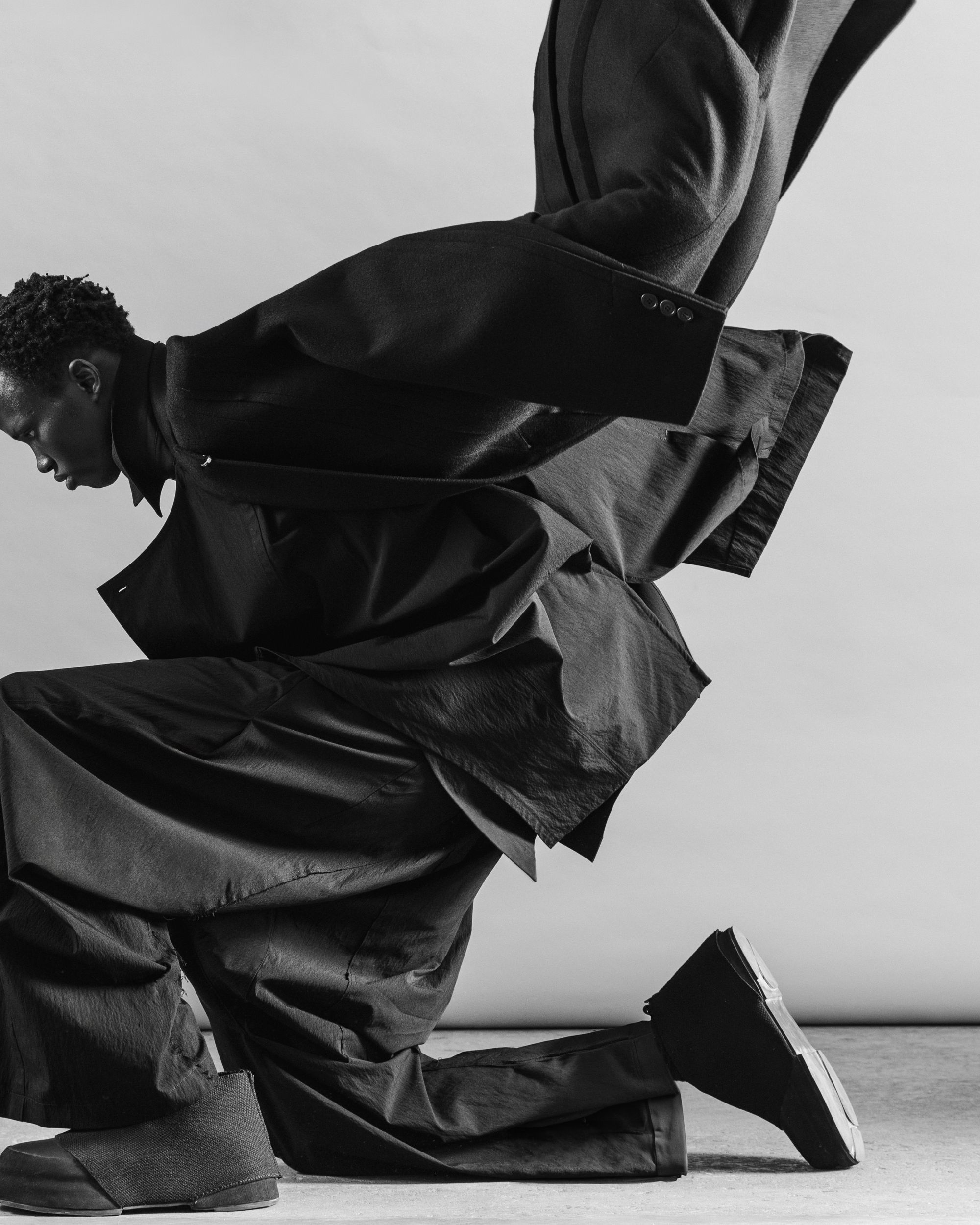 Le cœur poétique de Songzio, réputé pour son tailoring expressif et fluide, est venu défier la rigueur du design technique et l'esthétique industrielle structurée d'Heliot Emil. De ce face-à-face est né un équilibre fascinant, avec un "Duel" qui reflète l'ambivalence même de l'escrime, un dialogue incessant entre l'agressivité et la grâce, entre la rigidité et le raffinement, où la structure des vêtements se fluidifie dans le mouvement. Une philosophie qui se matérialise dans les différentes séries de la collection. La série L'"Adversaire" sculpte l'incertitude avec des coupes asymétriques et des plis courbes, offrant des silhouettes modulables, tandis que les séries "Aketon" et "Plastron" (faisant référence aux protections d'armure) réinterprètent le vêtement comme une armure moderne, à travers des pulls et blazers matelassés d'une fonctionnalité avant-gardiste.