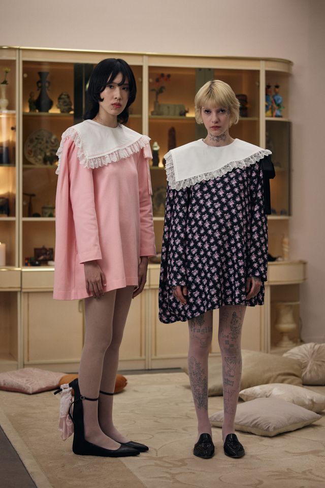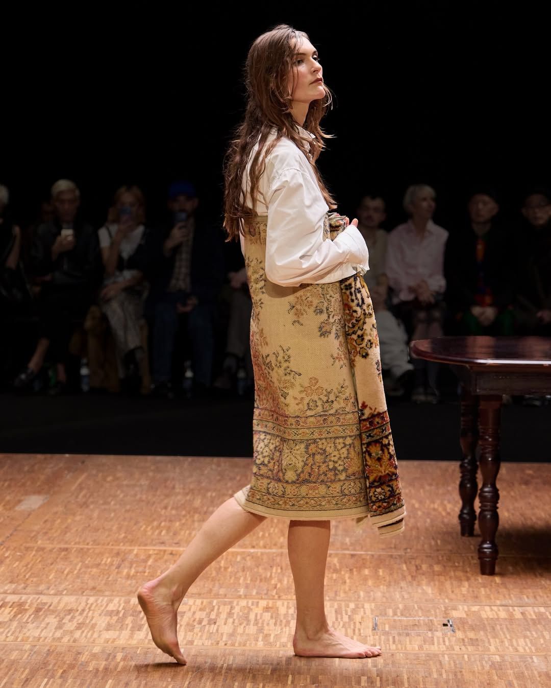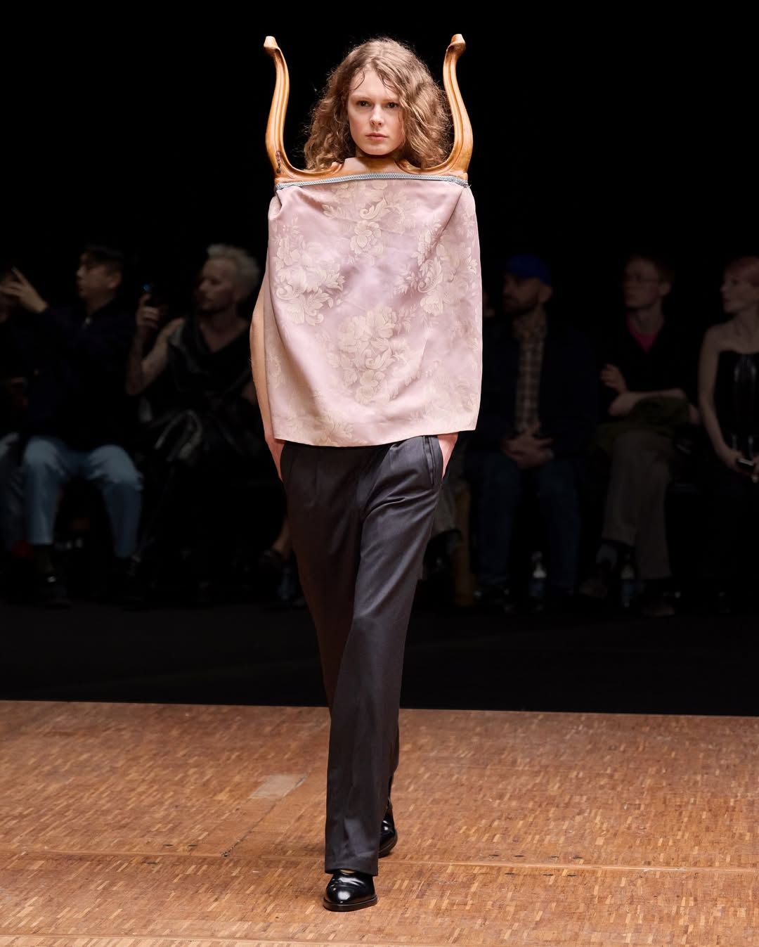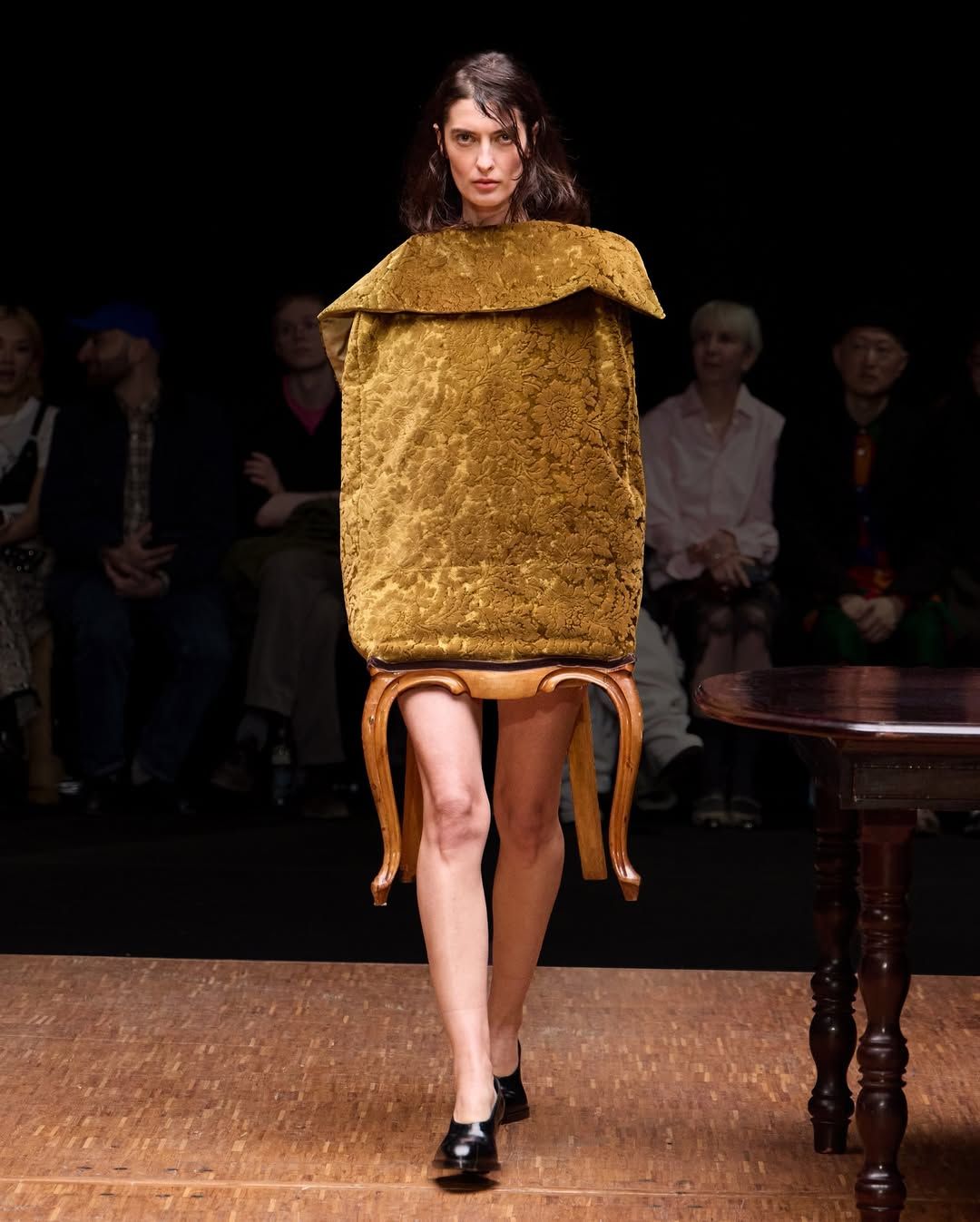 De son côté Jenny Fax, fidèle à ses habitudes, reconstitue l’intérieur d’une maison, transformant l’espace d’une galerie aux murs blancs en un décor domestique. Deux salles à manger sont reproduites avec minutie : buffet, table, lampes, comme si les mannequins évoluaient au cœur d’un quotidien figé. Intitulée Family Issues, la collection s’appuie sur des duos de mannequins d’âges différents, accentuant l’impression de tableau familial. L’ensemble oscille entre familiarité et absurdité. Les silhouettes jouent avec les proportions et les références : des ballerines inspirées des spartiates remontent le long du mollet jusqu’à former un talon, brouillant la frontière entre chaussure et sculpture. Si Jenny Fax utilise l’espace domestique comme toile de fond - ce lieu où se jouent silencieusement les rapports familiaux - la créatrice suédoise Ellen Hodakova Larsson pousse l’idée encore plus loin avec Hodakova. Présentée au Carrousel du Louvre, la collection semble littéralement émerger du mobilier qui compose la scénographie. Les miroirs deviennent des accessoires que les mannequins portent à la main, reflétant l’espace et les silhouettes au passage. Les meubles cessent d’être immobiles : un tapis se transforme en jupe lorsqu’une mannequin s’enroule dedans, des chaises renversées puis portées à même le corps, forment tantôt une robe tantôt un top. Les manteaux en fourrure, eux, sont portés à l’envers, créant un volume au niveau de la poitrine qui donne l’impression que le vêtement est resté suspendu à son cintre. À la frontière entre mode, sculpture et performance, la collection fait écho à une tradition surréaliste où l’objet du quotidien se métamorphose.