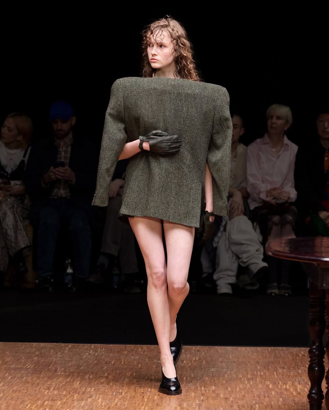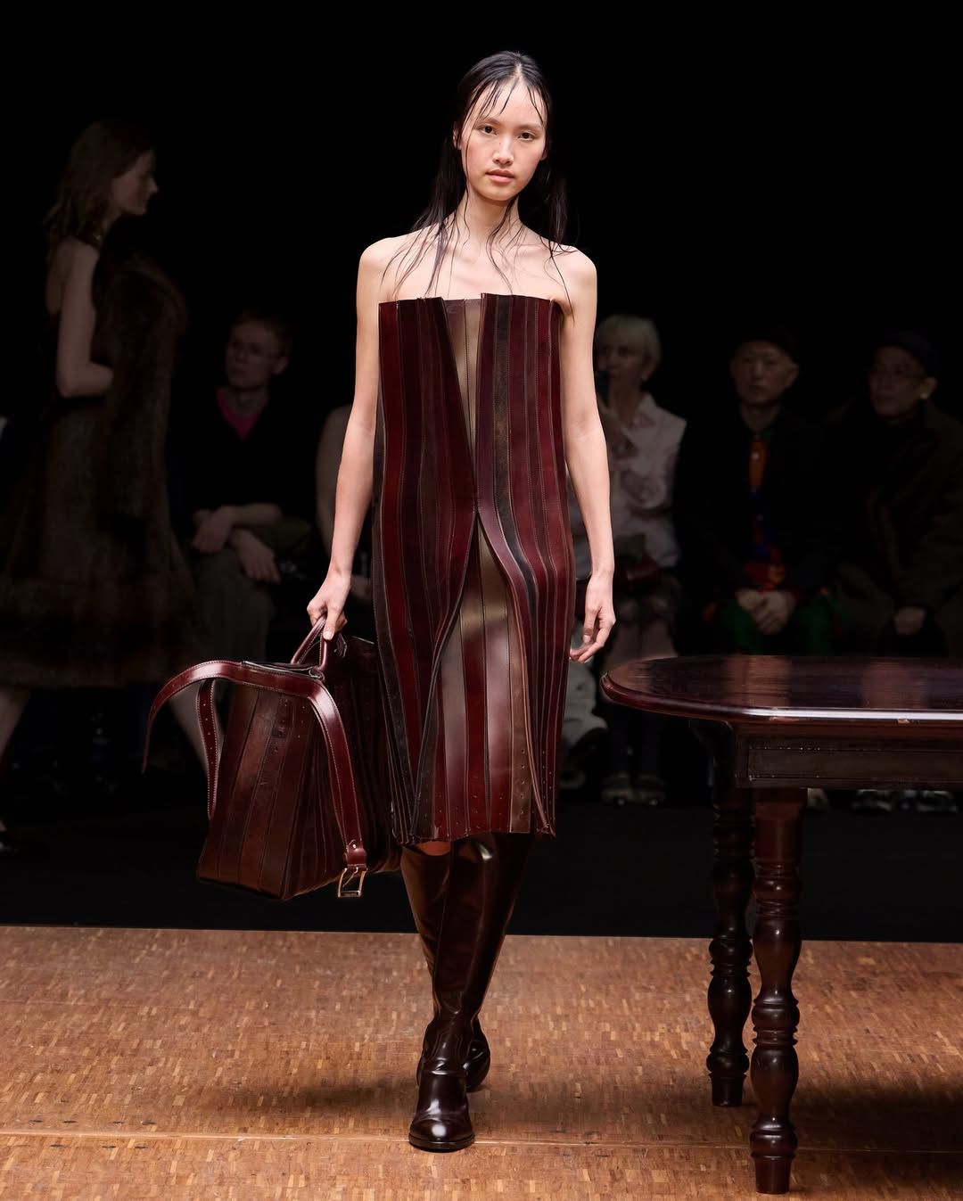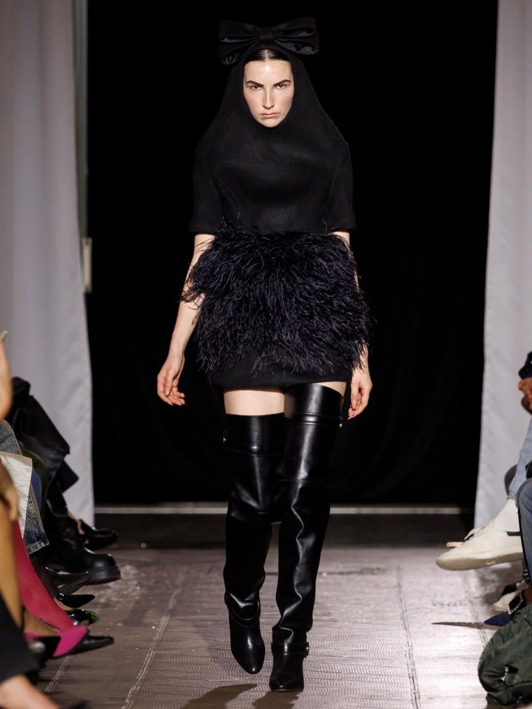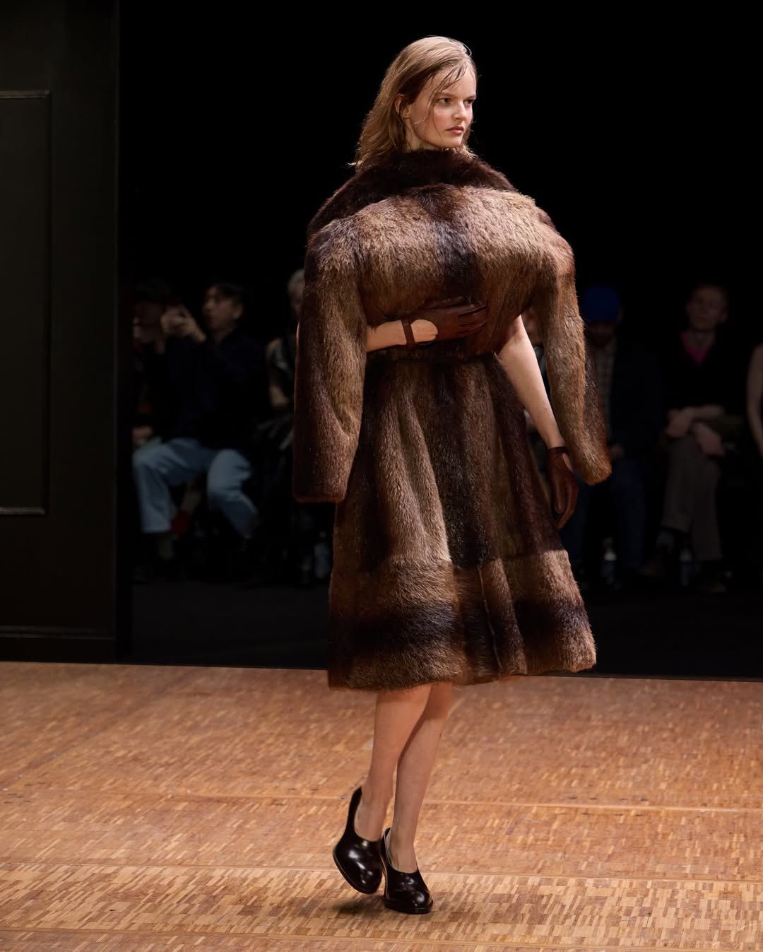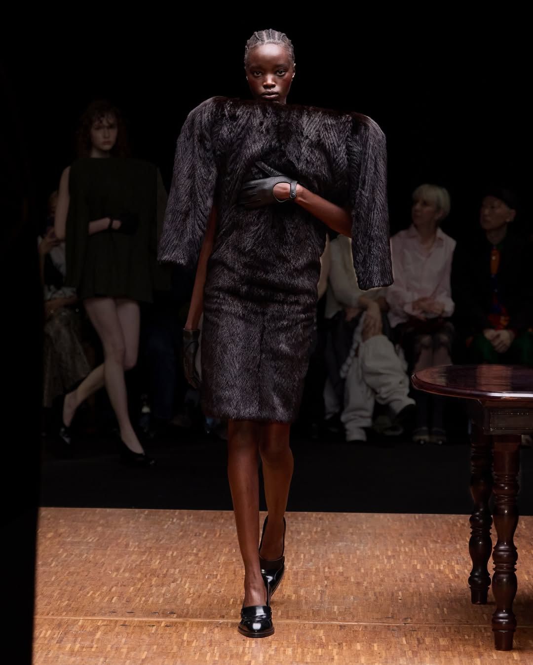 De son côté Jenny Fax, fidèle à ses habitudes, reconstitue l’intérieur d’une maison, transformant l’espace d’une galerie aux murs blancs en un décor domestique. Deux salles à manger sont reproduites avec minutie : buffet, table, lampes, comme si les mannequins évoluaient au cœur d’un quotidien figé. Intitulée Family Issues, la collection s’appuie sur des duos de mannequins d’âges différents, accentuant l’impression de tableau familial. L’ensemble oscille entre familiarité et absurdité. Les silhouettes jouent avec les proportions et les références : des ballerines inspirées des spartiates remontent le long du mollet jusqu’à former un talon, brouillant la frontière entre chaussure et sculpture. Si Jenny Fax utilise l’espace domestique comme toile de fond - ce lieu où se jouent silencieusement les rapports familiaux - la créatrice suédoise Ellen Hodakova Larsson pousse l’idée encore plus loin avec Hodakova. Présentée au Carrousel du Louvre, la collection semble littéralement émerger du mobilier qui compose la scénographie. Les miroirs deviennent des accessoires que les mannequins portent à la main, reflétant l’espace et les silhouettes au passage. Les meubles cessent d’être immobiles : un tapis se transforme en jupe lorsqu’une mannequin s’enroule dedans, des chaises renversées puis portées à même le corps, forment tantôt une robe tantôt un top. Les manteaux en fourrure, eux, sont portés à l’envers, créant un volume au niveau de la poitrine qui donne l’impression que le vêtement est resté suspendu à son cintre. À la frontière entre mode, sculpture et performance, la collection fait écho à une tradition surréaliste où l’objet du quotidien se métamorphose.