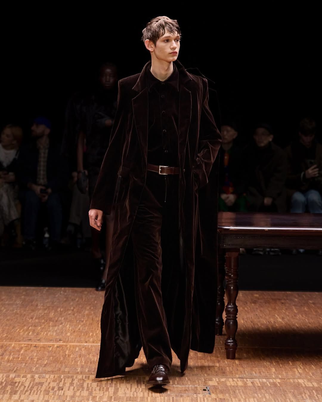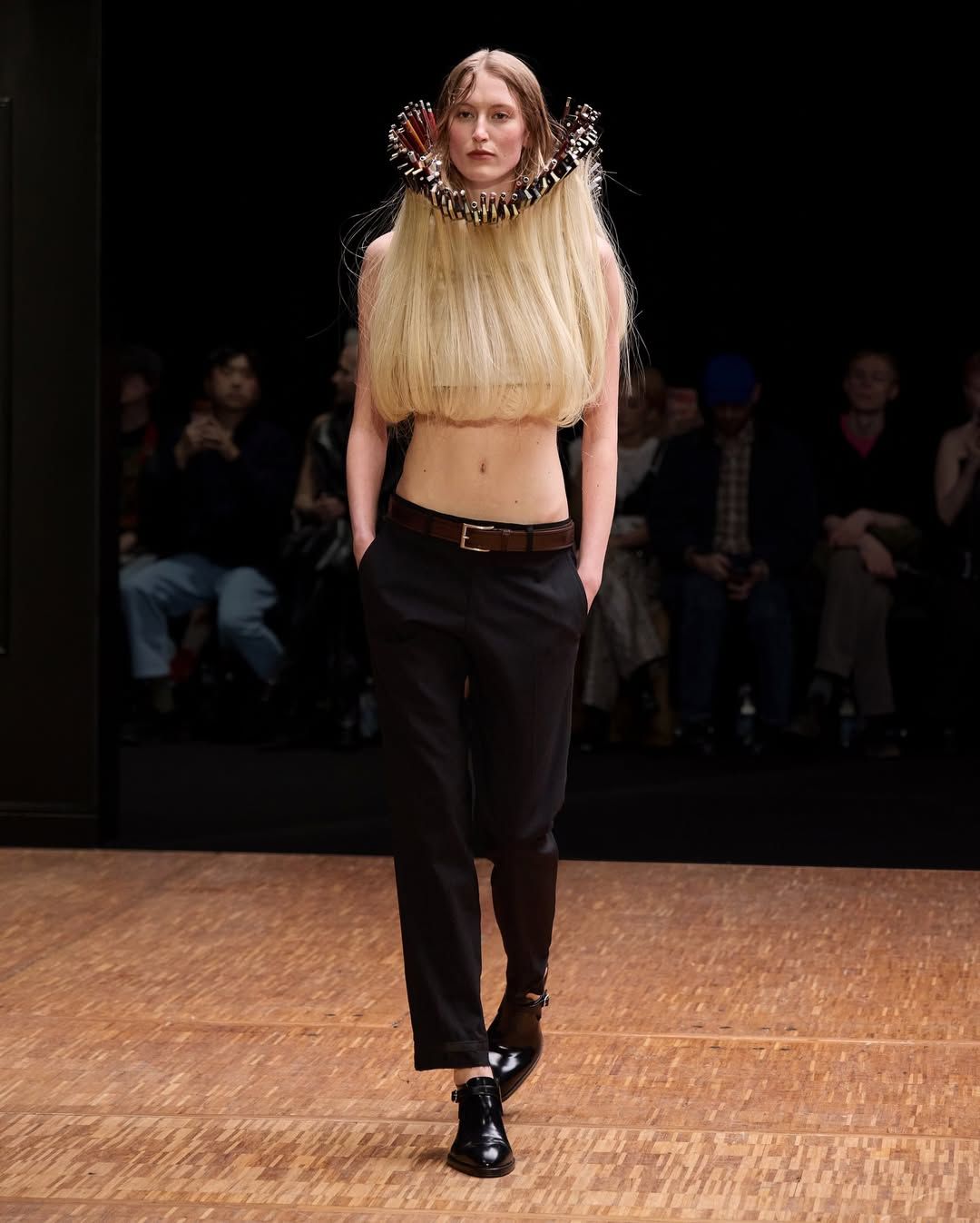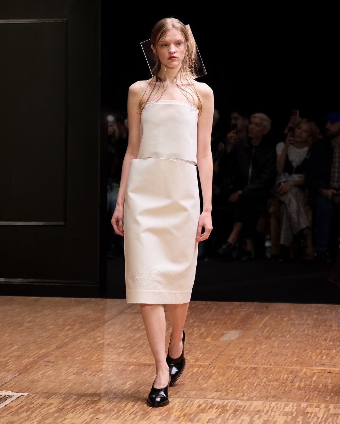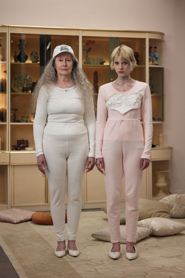 De son côté Jenny Fax, fidèle à ses habitudes, reconstitue l’intérieur d’une maison, transformant l’espace d’une galerie aux murs blancs en un décor domestique. Deux salles à manger sont reproduites avec minutie : buffet, table, lampes, comme si les mannequins évoluaient au cœur d’un quotidien figé. Intitulée Family Issues, la collection s’appuie sur des duos de mannequins d’âges différents, accentuant l’impression de tableau familial. L’ensemble oscille entre familiarité et absurdité. Les silhouettes jouent avec les proportions et les références : des ballerines inspirées des spartiates remontent le long du mollet jusqu’à former un talon, brouillant la frontière entre chaussure et sculpture. Si Jenny Fax utilise l’espace domestique comme toile de fond - ce lieu où se jouent silencieusement les rapports familiaux - la créatrice suédoise Ellen Hodakova Larsson pousse l’idée encore plus loin avec Hodakova. Présentée au Carrousel du Louvre, la collection semble littéralement émerger du mobilier qui compose la scénographie. Les miroirs deviennent des accessoires que les mannequins portent à la main, reflétant l’espace et les silhouettes au passage. Les meubles cessent d’être immobiles : un tapis se transforme en jupe lorsqu’une mannequin s’enroule dedans, des chaises renversées puis portées à même le corps, forment tantôt une robe tantôt un top. Les manteaux en fourrure, eux, sont portés à l’envers, créant un volume au niveau de la poitrine qui donne l’impression que le vêtement est resté suspendu à son cintre. À la frontière entre mode, sculpture et performance, la collection fait écho à une tradition surréaliste où l’objet du quotidien se métamorphose.