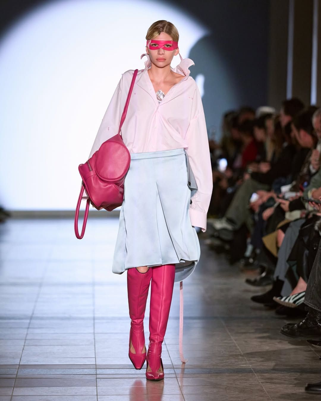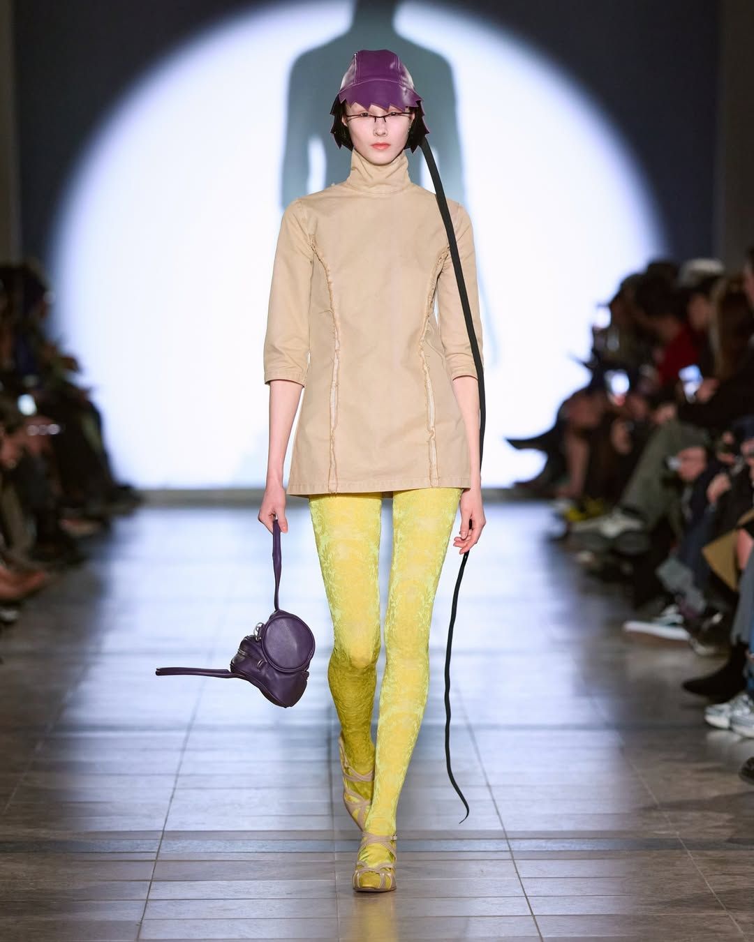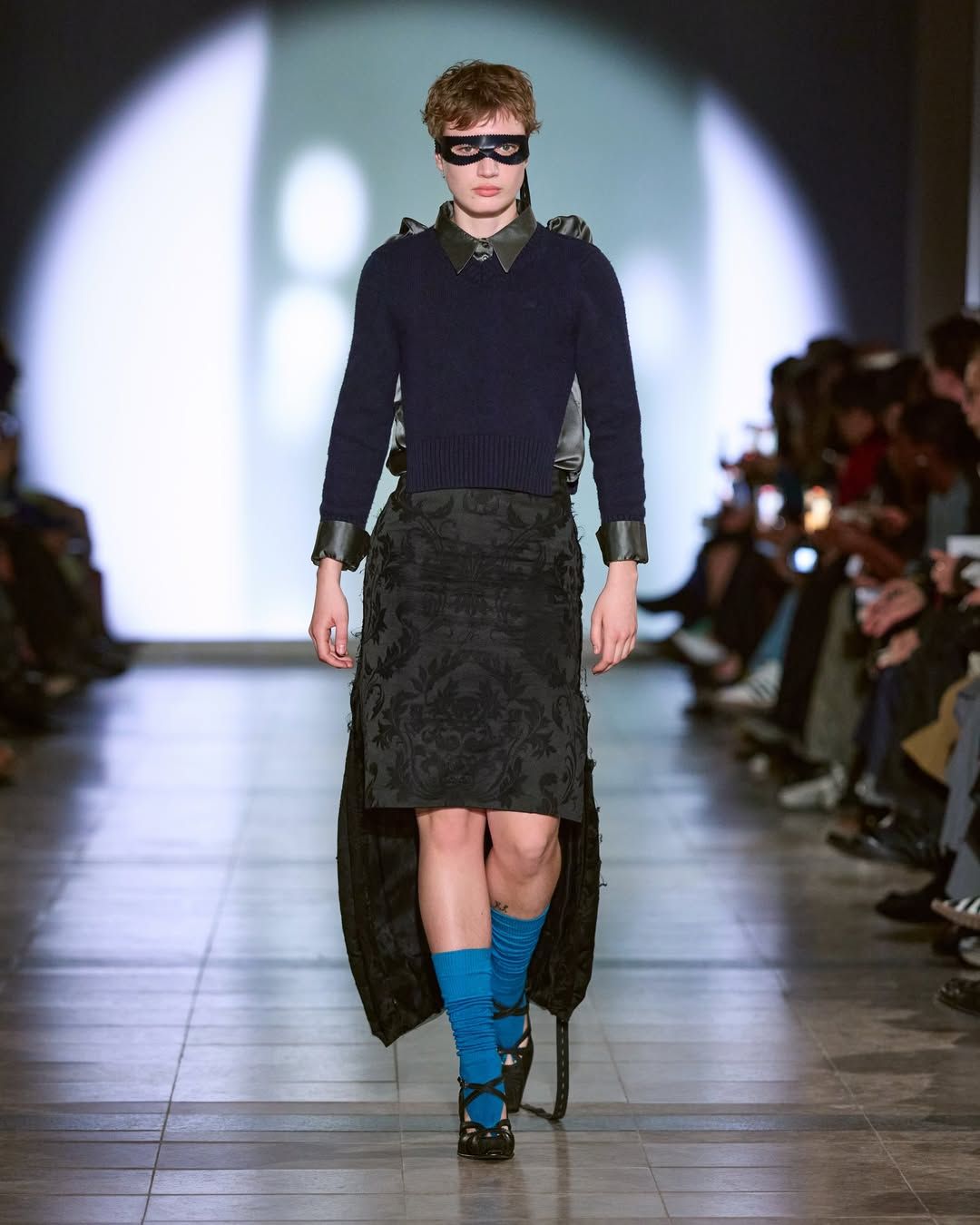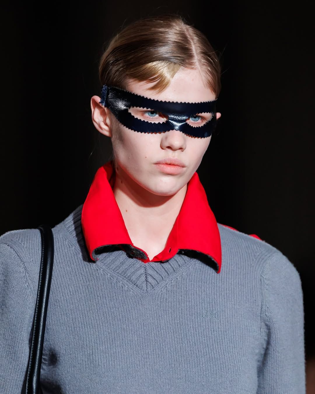 Cette idée du masque présente chez Vaquera imprègne aussi le travail de Julie Kegels. Pour sa cinquième collection, la créatrice belge - récemment demi-finaliste du Prix LVMH - confirme son statut de talent à suivre. Dès l’invitation, un petit masque de cuir glissé dans l’enveloppe annonce le thème de la collection : Face Value. La créatrice introduit également des capes qui évoquent celles des super-héros. Mais chez Kegels, la perfection n’est jamais l’objectif. Les vêtements semblent parfois complètement décalés : un pull qui paraît avoir rétréci au lavage, des gants qui ne couvrent que les doigts, un anorak volontairement trop grand, un sac porté avec nonchalance, tenu à une seule anse. La fente d’une jupe remonte plus haut que prévu, les épaulettes apparaissent posées directement sur la peau. Sur le catwalk, les mannequins apparaissent deux fois, leurs ombres projetées à grande échelle transforment chaque passage en double image. Par moments, la démarche se synchronise avec l’ombre projetée ; peu après, elle s’en détache. Une manière assumée d’embrasser l’erreur, les manques, l’imperfection comme langage. Si la créatrice belge est friande des ratés, son parcours est loin d’en être jonchés.