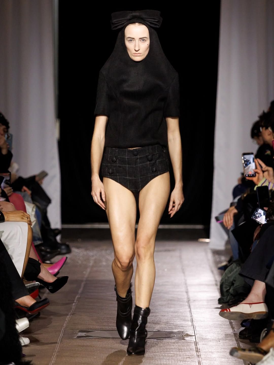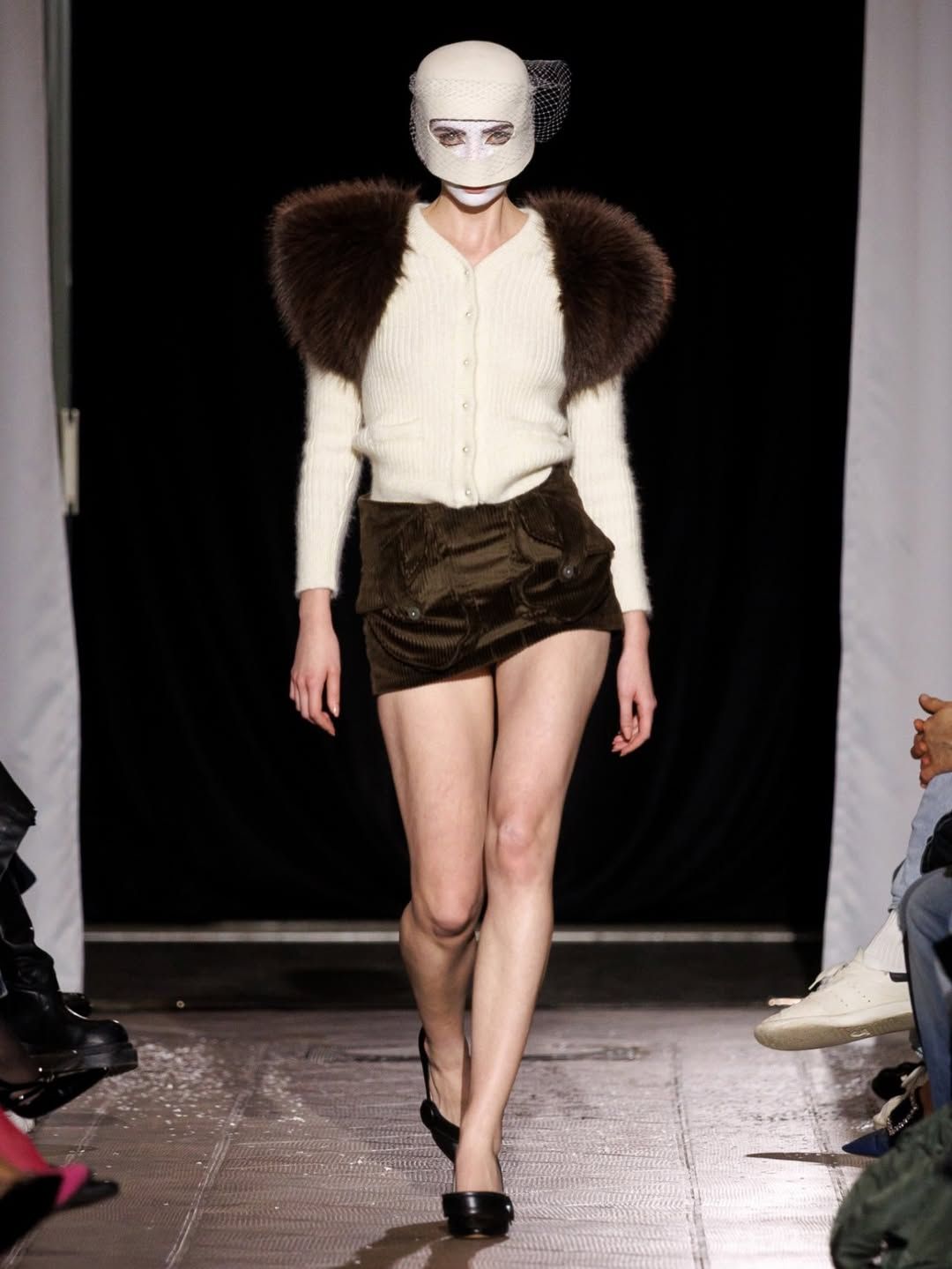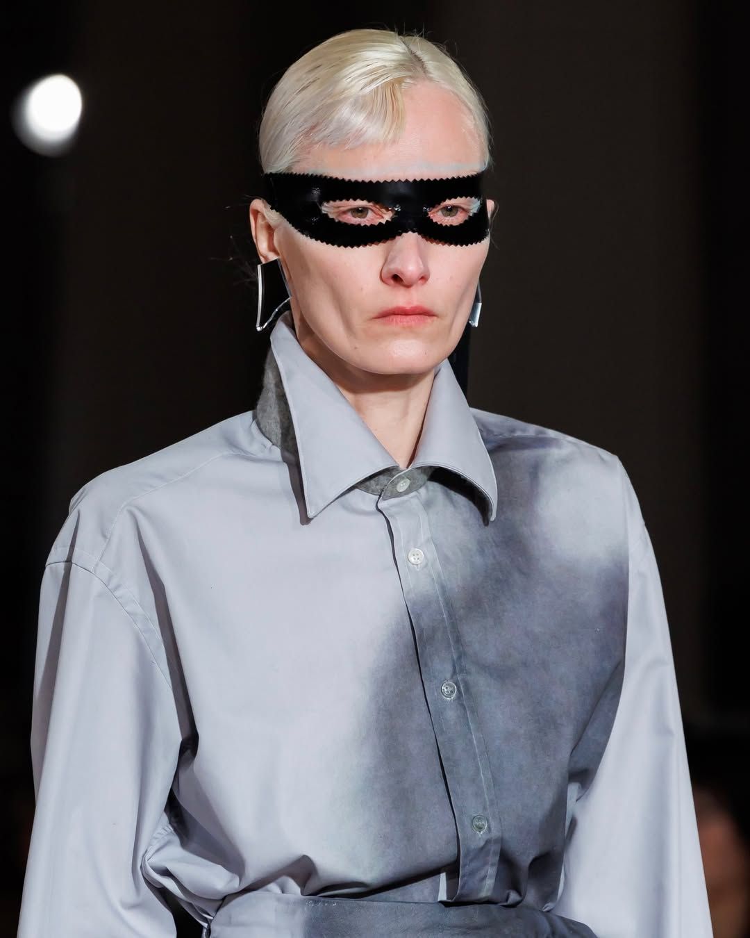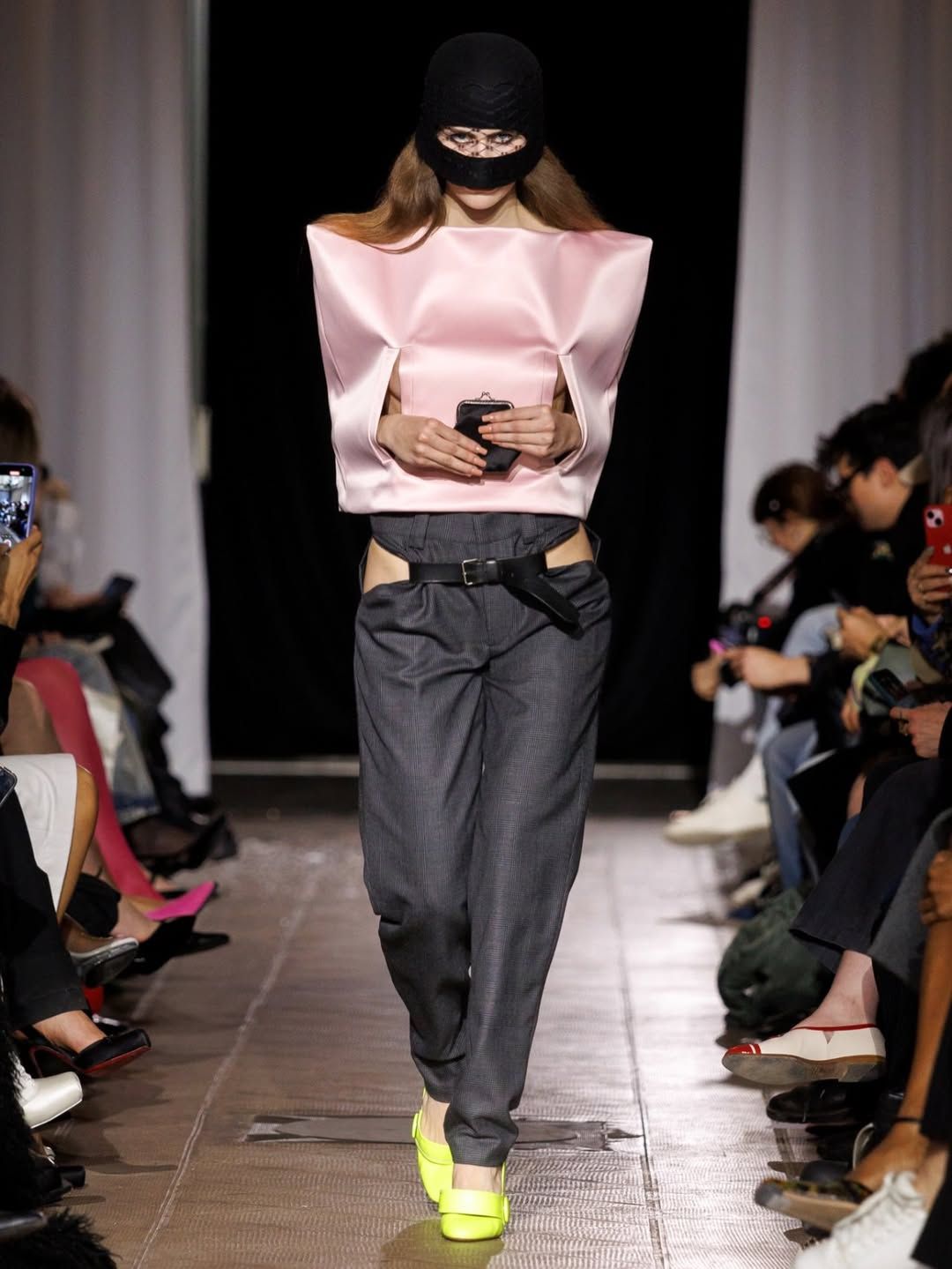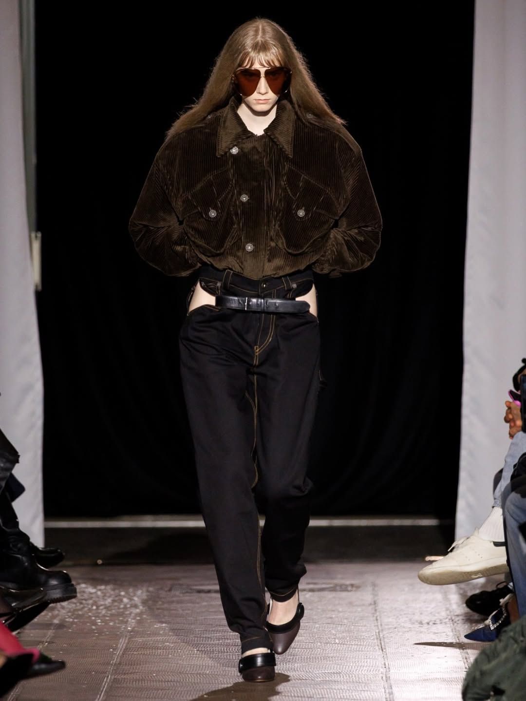 Cette idée du masque présente chez Vaquera imprègne aussi le travail de Julie Kegels. Pour sa cinquième collection, la créatrice belge - récemment demi-finaliste du Prix LVMH - confirme son statut de talent à suivre. Dès l’invitation, un petit masque de cuir glissé dans l’enveloppe annonce le thème de la collection : Face Value. La créatrice introduit également des capes qui évoquent celles des super-héros. Mais chez Kegels, la perfection n’est jamais l’objectif. Les vêtements semblent parfois complètement décalés : un pull qui paraît avoir rétréci au lavage, des gants qui ne couvrent que les doigts, un anorak volontairement trop grand, un sac porté avec nonchalance, tenu à une seule anse. La fente d’une jupe remonte plus haut que prévu, les épaulettes apparaissent posées directement sur la peau. Sur le catwalk, les mannequins apparaissent deux fois, leurs ombres projetées à grande échelle transforment chaque passage en double image. Par moments, la démarche se synchronise avec l’ombre projetée ; peu après, elle s’en détache. Une manière assumée d’embrasser l’erreur, les manques, l’imperfection comme langage. Si la créatrice belge est friande des ratés, son parcours est loin d’en être jonchés.