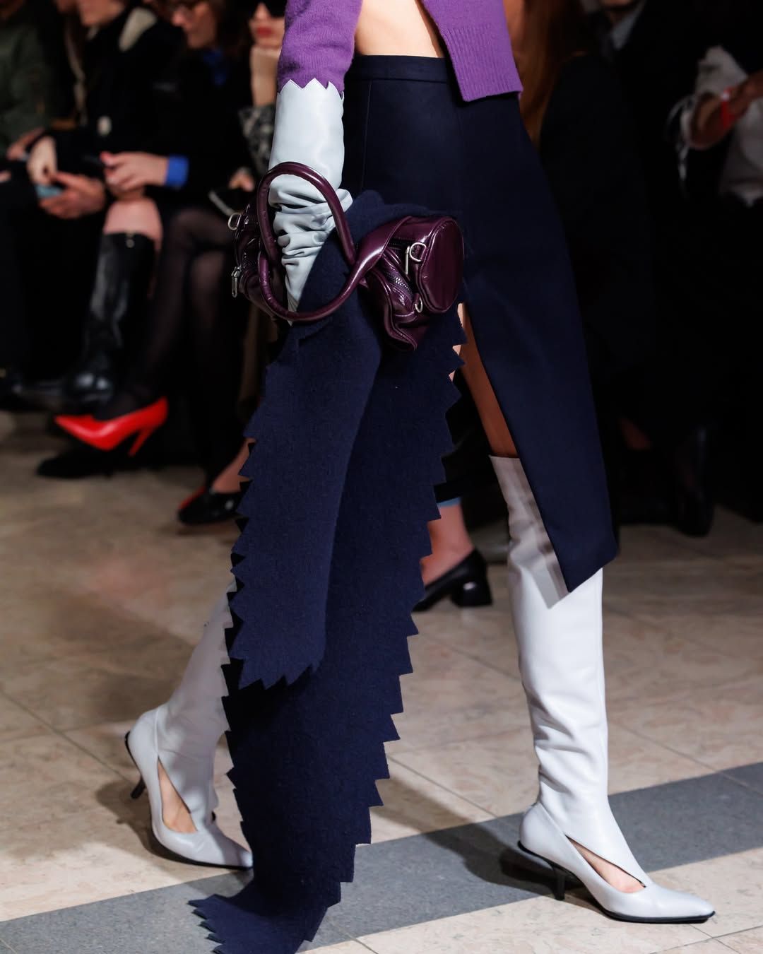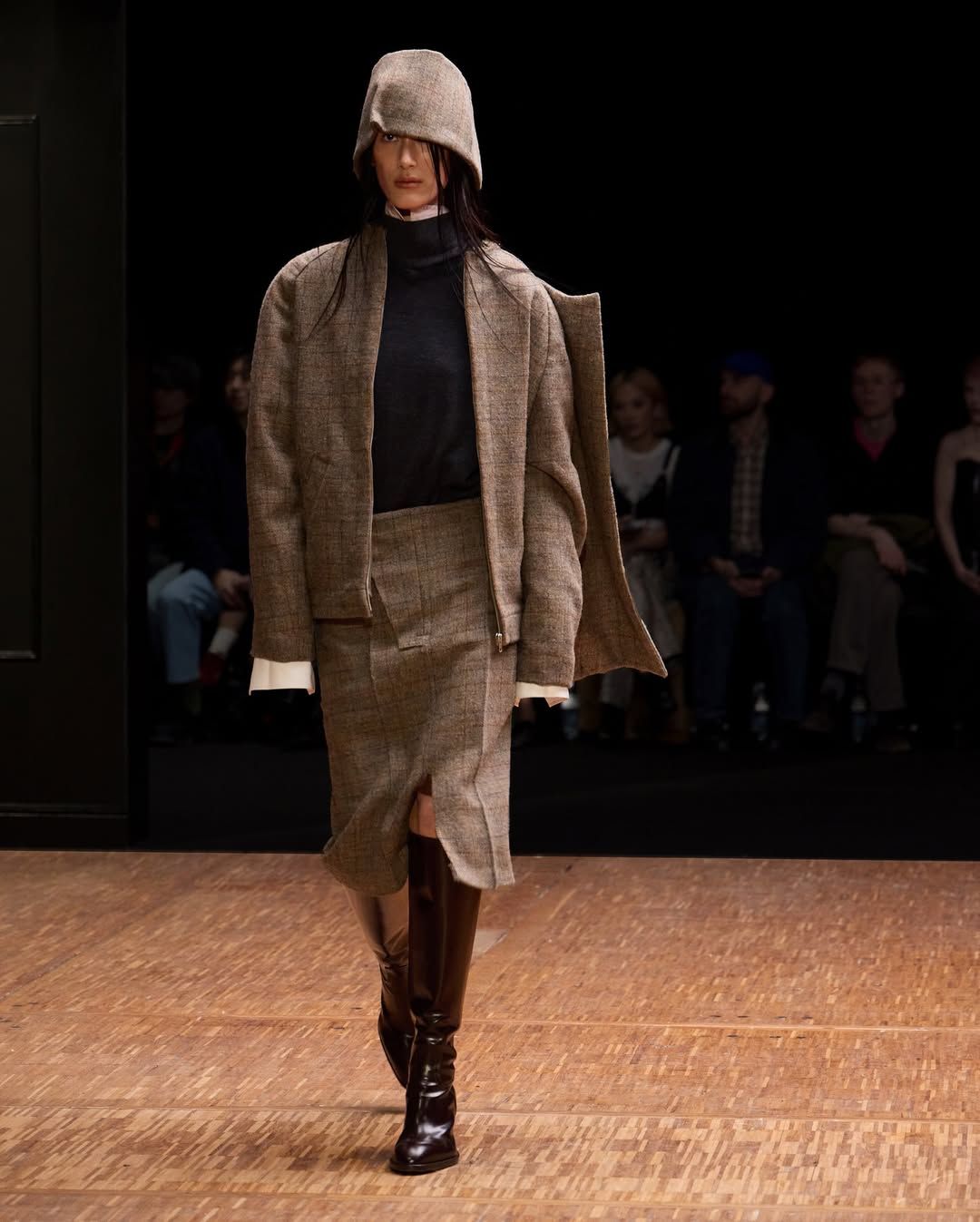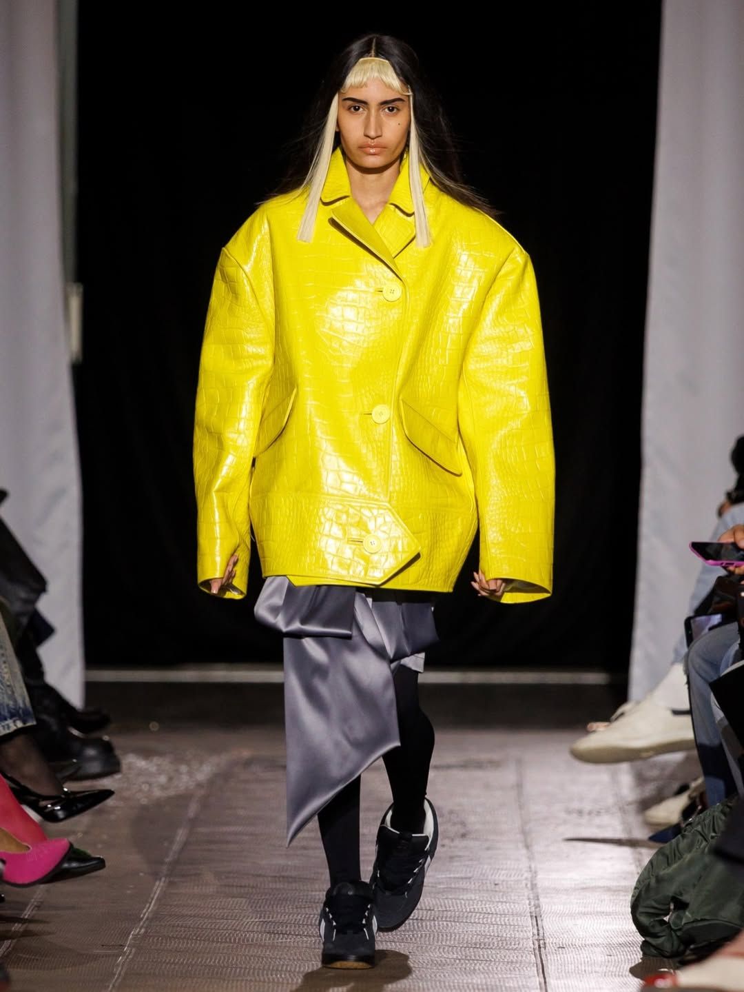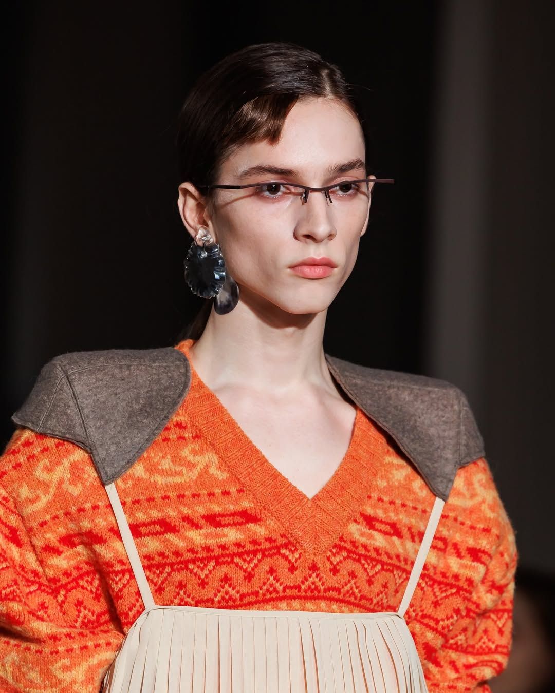 Cette idée du masque présente chez Vaquera imprègne aussi le travail de Julie Kegels. Pour sa cinquième collection, la créatrice belge - récemment demi-finaliste du Prix LVMH - confirme son statut de talent à suivre. Dès l’invitation, un petit masque de cuir glissé dans l’enveloppe annonce le thème de la collection : Face Value. La créatrice introduit également des capes qui évoquent celles des super-héros. Mais chez Kegels, la perfection n’est jamais l’objectif. Les vêtements semblent parfois complètement décalés : un pull qui paraît avoir rétréci au lavage, des gants qui ne couvrent que les doigts, un anorak volontairement trop grand, un sac porté avec nonchalance, tenu à une seule anse. La fente d’une jupe remonte plus haut que prévu, les épaulettes apparaissent posées directement sur la peau. Sur le catwalk, les mannequins apparaissent deux fois, leurs ombres projetées à grande échelle transforment chaque passage en double image. Par moments, la démarche se synchronise avec l’ombre projetée ; peu après, elle s’en détache. Une manière assumée d’embrasser l’erreur, les manques, l’imperfection comme langage. Si la créatrice belge est friande des ratés, son parcours est loin d’en être jonchés.