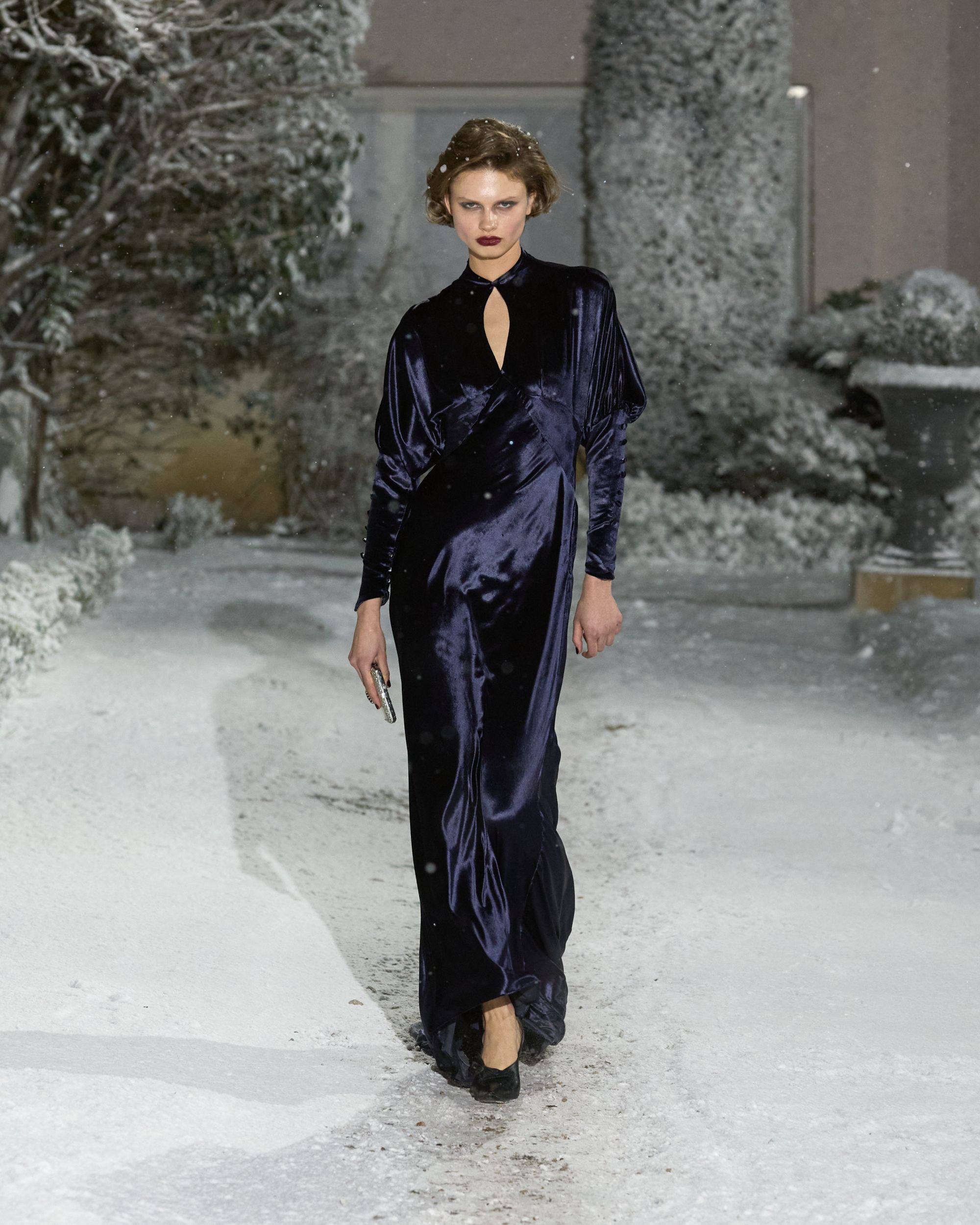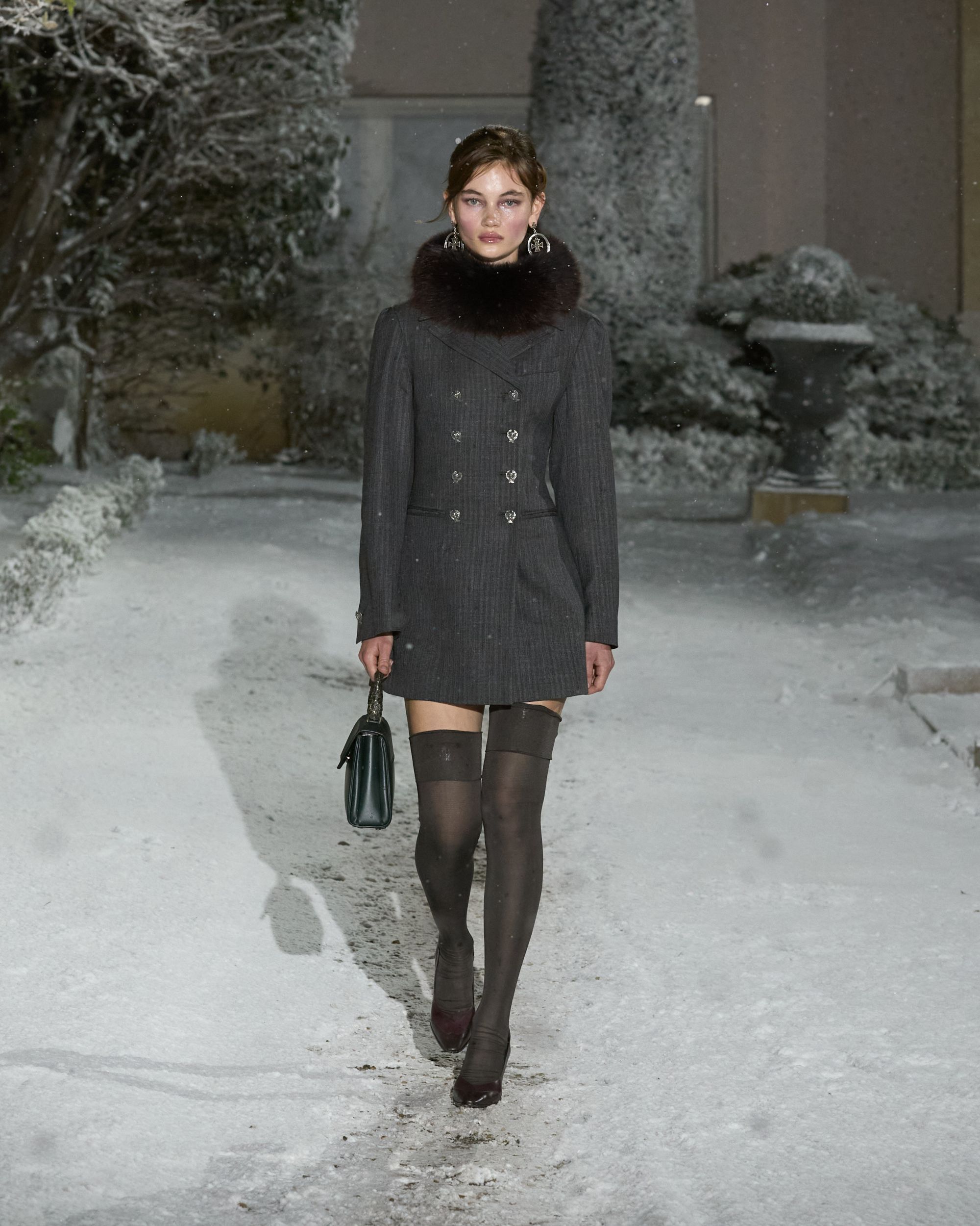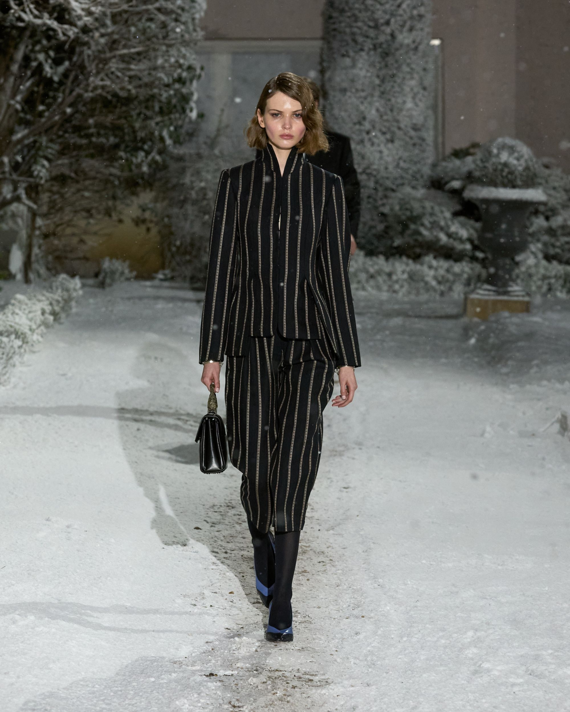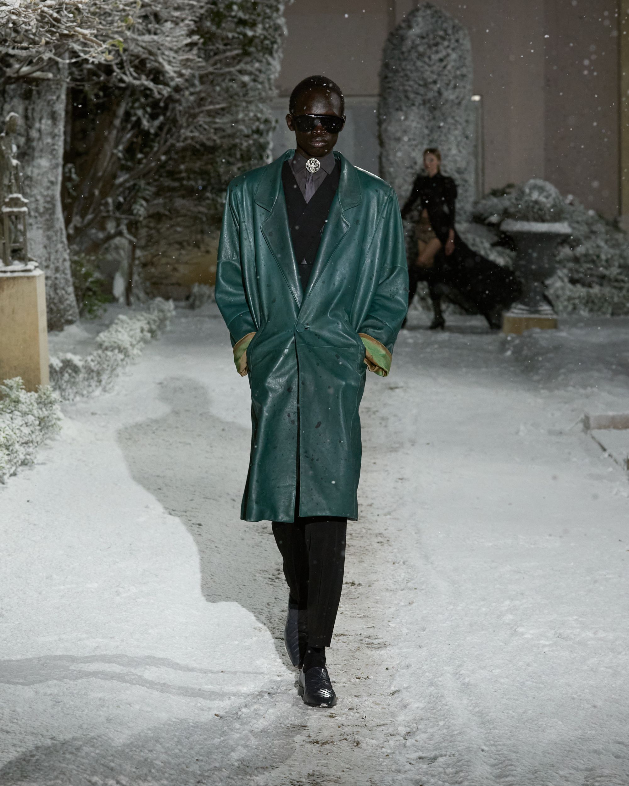 Côté scénographie, le décor prolongeait cette atmosphère quelque peu glaçante. Dans une cour entièrement recouverte d’un manteau blanc, 37 silhouettes sont apparues sous une neige artificielle. Interrogé par nss magazine, Levy évoque une forme de « sobriété froide ». Costumes rayés, parkas, full look en cuir ; une forme de rigueur émane de la collection Automne-Hiver 26 qui semble tout droit sortie d’un régime totalitaire. Une première approche des looks un brin sévère qui finit, à l’image des flocons, par dégager une forme de poésie. Une collection qui semble se construire par strates, look après look. Une idée que le fondateur résume lui-même après le défilé par cette phrase simple : « tout finit par se rejoindre à la fin ». Une formule qui pourrait presque servir d’avertissement : pour apprécier le défilé, il faudrait dépasser le choc de l’ouverture et observer l’ensemble. Pourtant, nombre de spectateurs se sont arrêtés à la première silhouette et, surtout, à cette provocation calculée - laissant passer la subtilité et l’ambition de la collection au profit d’un scandale soigneusement orchestré.