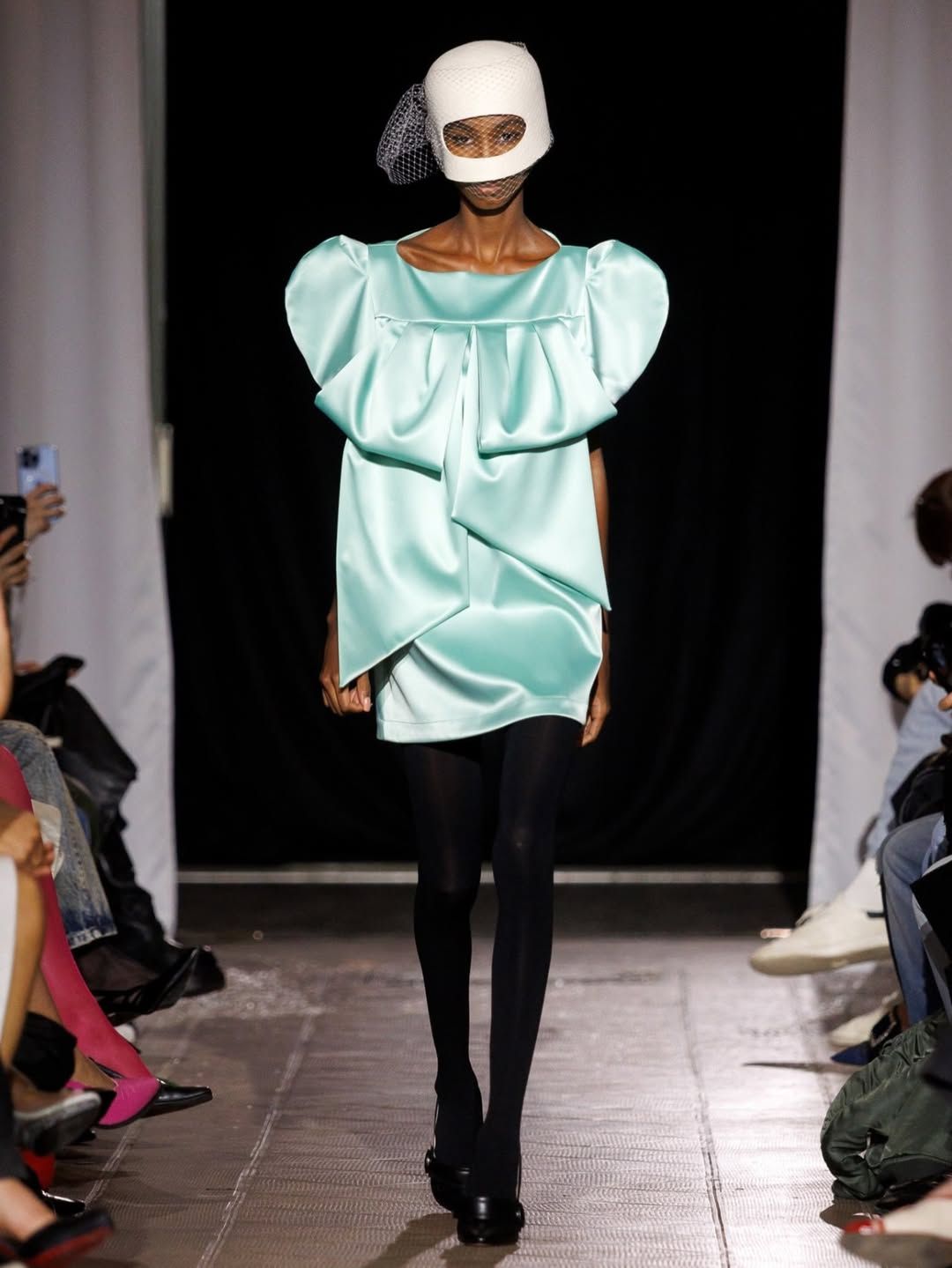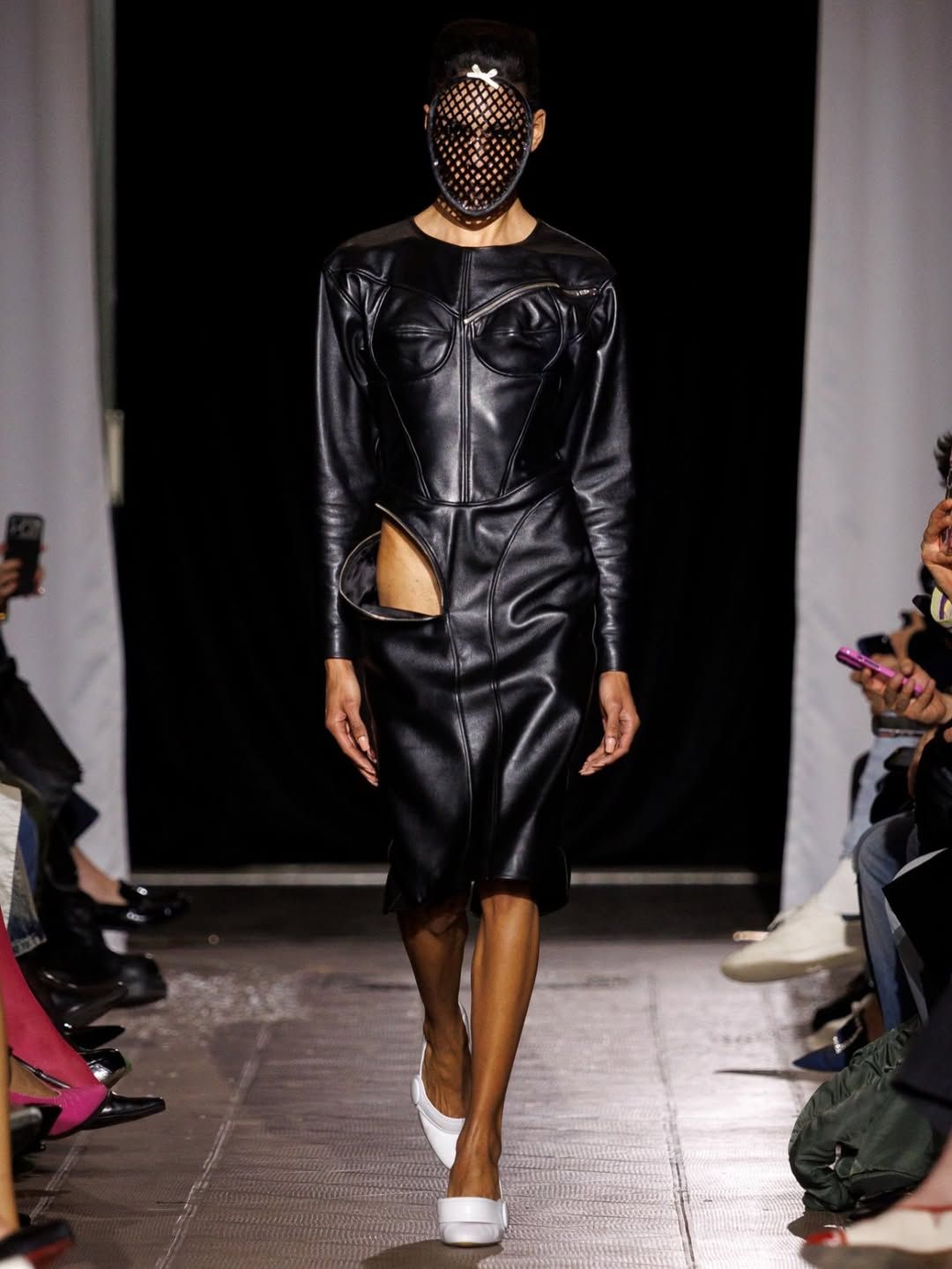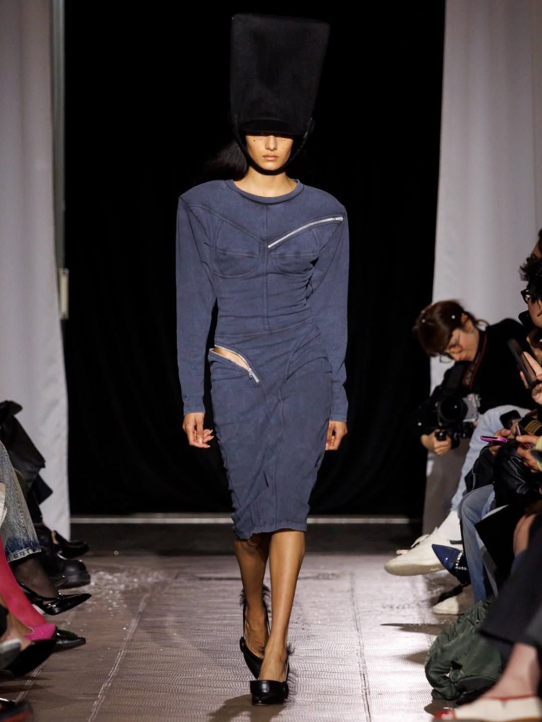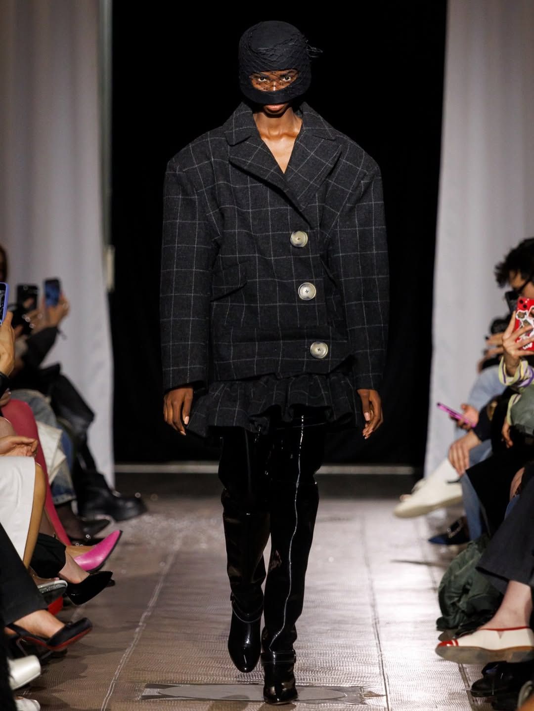 Le duo derrière Poster Girl poursuit son exploration de la féminité. Fondée par Francesca Capper et Natasha Somerville, la marque londonienne faisait ses débuts sur le calendrier parisien avec une présentation intitulée Objectified, imaginée en partenariat avec OnlyFans. Le latex, matière signature du label depuis sa création en 2017, structure l’ensemble de la proposition. Mais la présentation dépasse largement le simple vêtement : ici et là, des objets ponctuent l’espace, comme une « condom dress » XXL suspendue au plafond ou encore un téléphone accompagné d’un cartel indiquant « call girl ». L’ensemble évoque presque un cabinet de curiosités contemporain, rappelant l’esprit des ready-made de Marcel Duchamp. Pour couronner la présentation, le duo a fait appel à la chanteuse Cobrah vêtue d’une « robe invisible », en réalité confectionnée dans un latex transparent. Une apparition qui rappelle qu’un simple morceau de tissu ou son absence peut devenir un geste radical si l’on ose l’assumer.