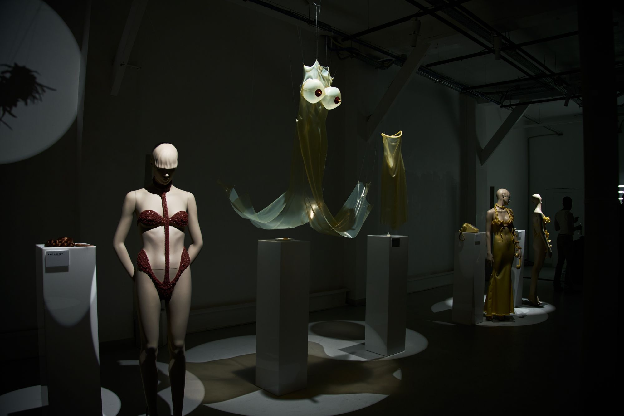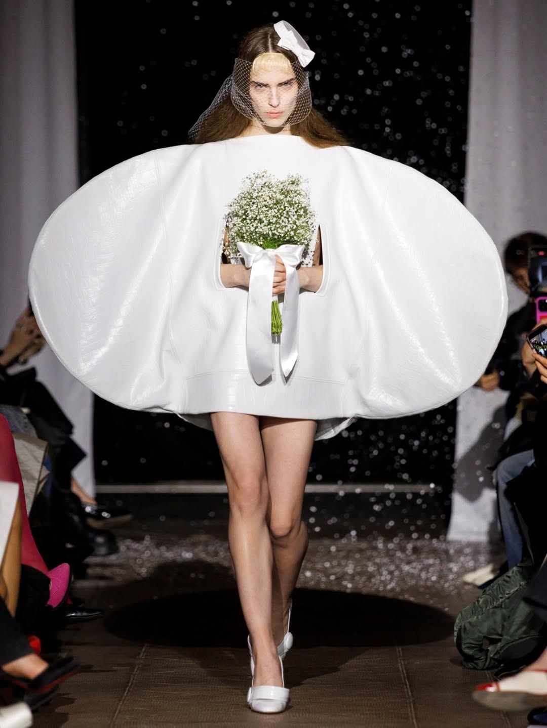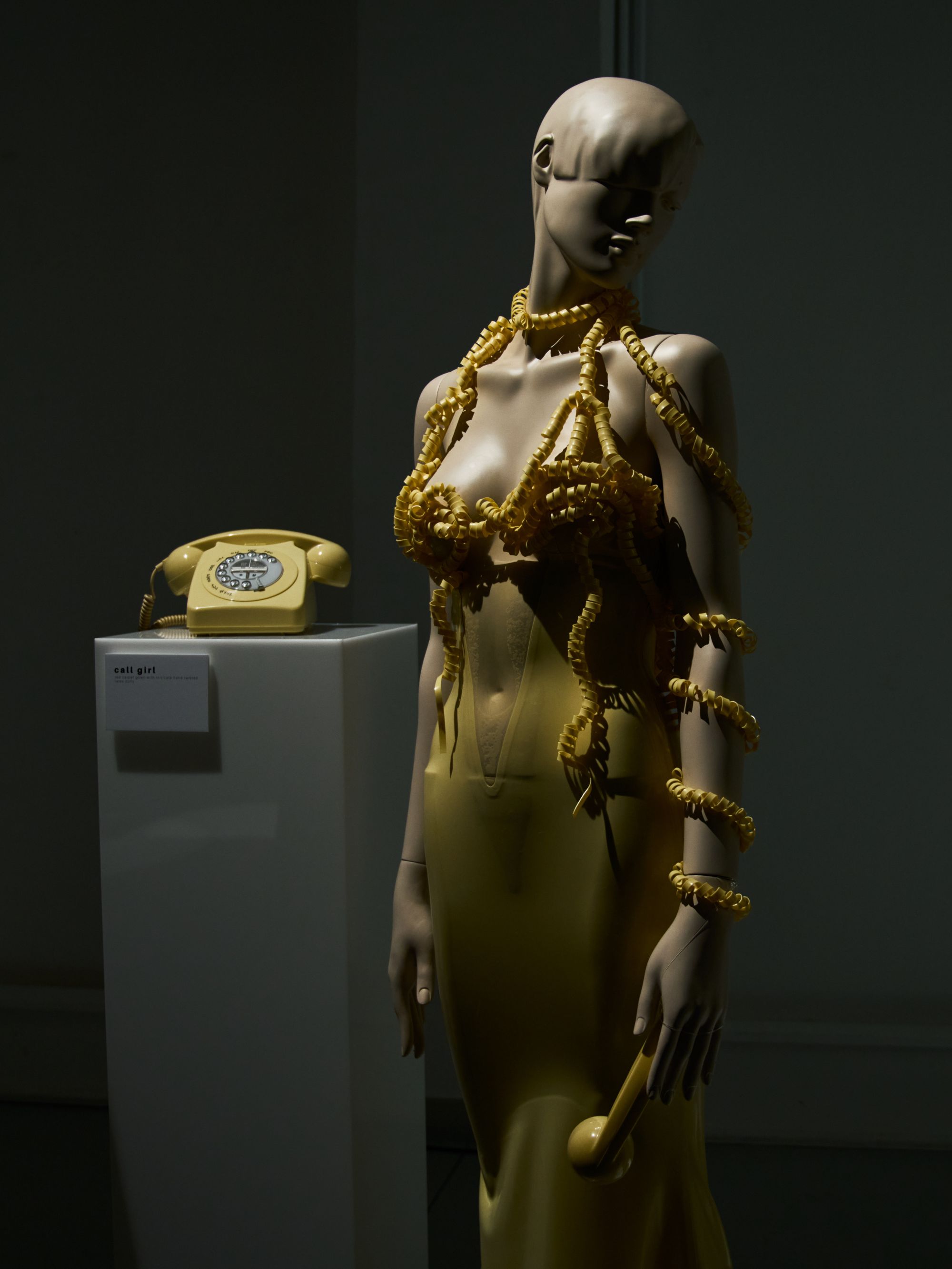 Le duo derrière Poster Girl poursuit son exploration de la féminité. Fondée par Francesca Capper et Natasha Somerville, la marque londonienne faisait ses débuts sur le calendrier parisien avec une présentation intitulée Objectified, imaginée en partenariat avec OnlyFans. Le latex, matière signature du label depuis sa création en 2017, structure l’ensemble de la proposition. Mais la présentation dépasse largement le simple vêtement : ici et là, des objets ponctuent l’espace, comme une « condom dress » XXL suspendue au plafond ou encore un téléphone accompagné d’un cartel indiquant « call girl ». L’ensemble évoque presque un cabinet de curiosités contemporain, rappelant l’esprit des ready-made de Marcel Duchamp. Pour couronner la présentation, le duo a fait appel à la chanteuse Cobrah vêtue d’une « robe invisible », en réalité confectionnée dans un latex transparent. Une apparition qui rappelle qu’un simple morceau de tissu ou son absence peut devenir un geste radical si l’on ose l’assumer.
