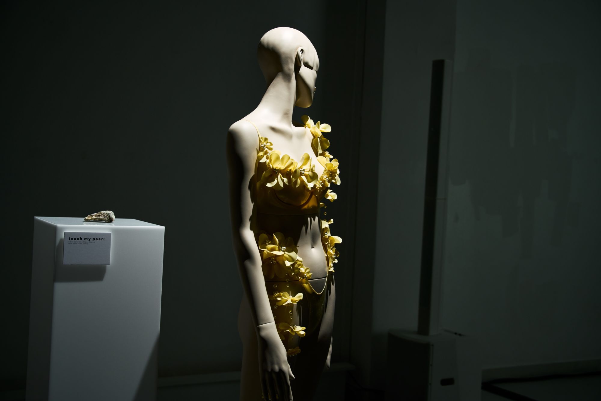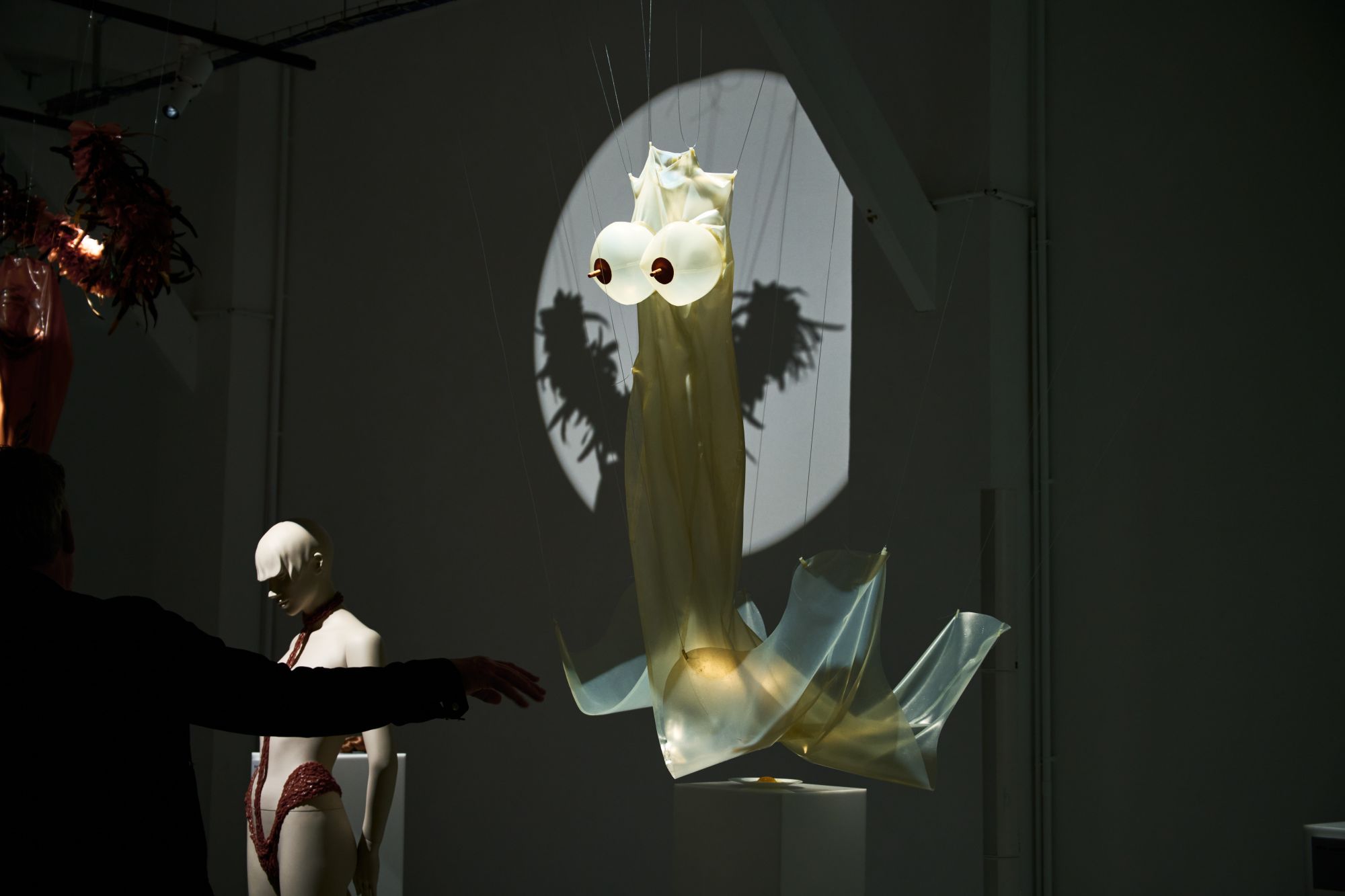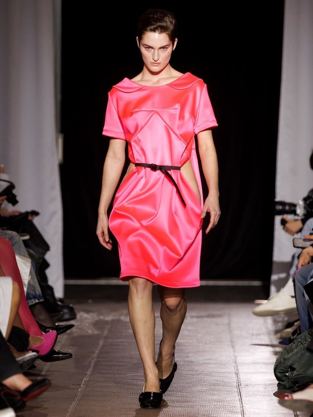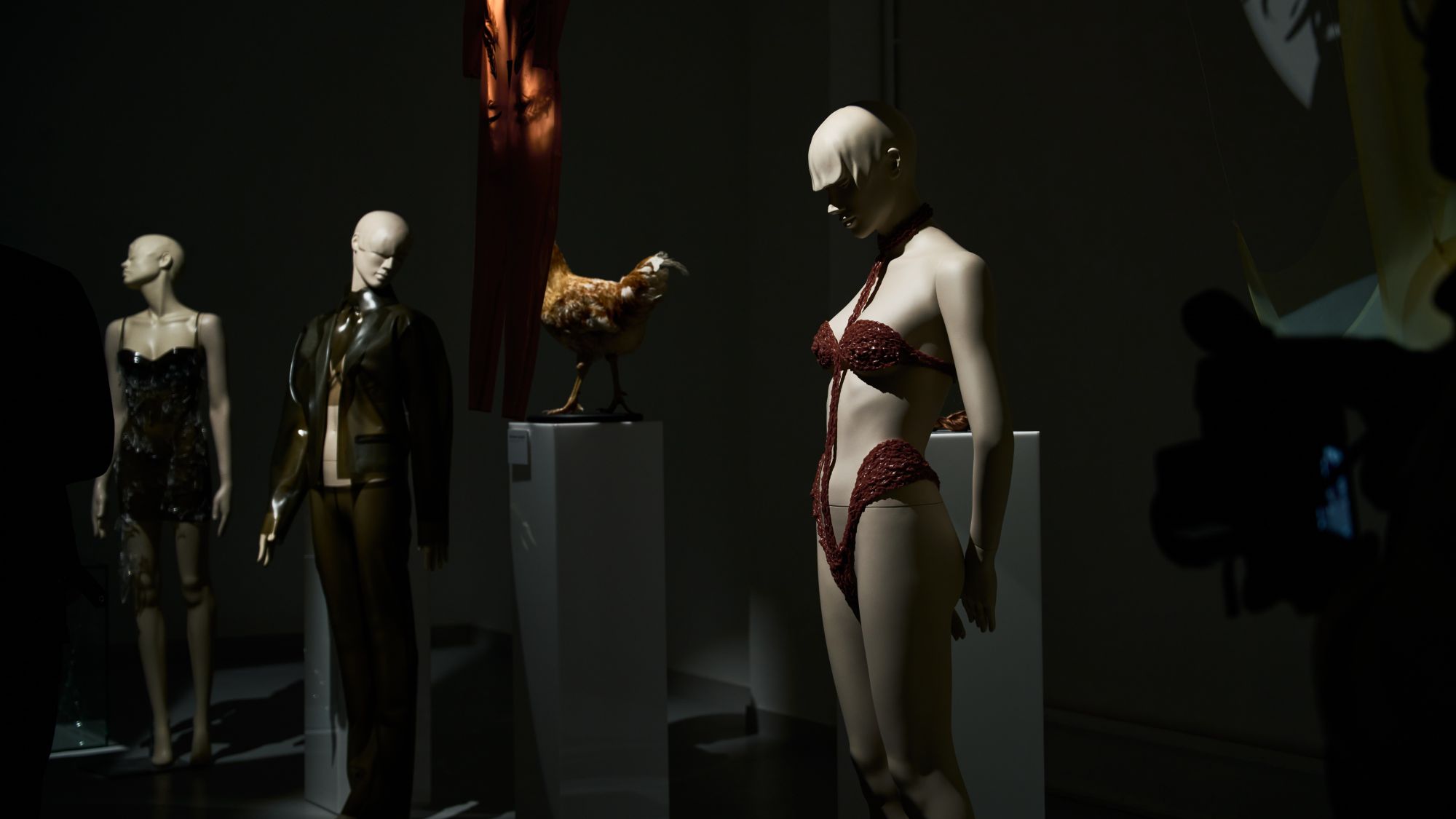 Le duo derrière Poster Girl poursuit son exploration de la féminité. Fondée par Francesca Capper et Natasha Somerville, la marque londonienne faisait ses débuts sur le calendrier parisien avec une présentation intitulée Objectified, imaginée en partenariat avec OnlyFans. Le latex, matière signature du label depuis sa création en 2017, structure l’ensemble de la proposition. Mais la présentation dépasse largement le simple vêtement : ici et là, des objets ponctuent l’espace, comme une « condom dress » XXL suspendue au plafond ou encore un téléphone accompagné d’un cartel indiquant « call girl ». L’ensemble évoque presque un cabinet de curiosités contemporain, rappelant l’esprit des ready-made de Marcel Duchamp. Pour couronner la présentation, le duo a fait appel à la chanteuse Cobrah vêtue d’une « robe invisible », en réalité confectionnée dans un latex transparent. Une apparition qui rappelle qu’un simple morceau de tissu ou son absence peut devenir un geste radical si l’on ose l’assumer.