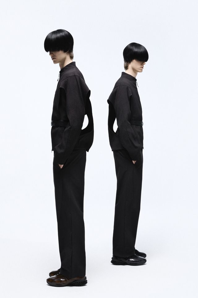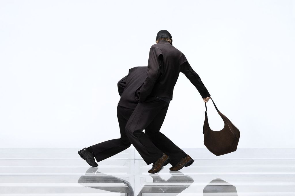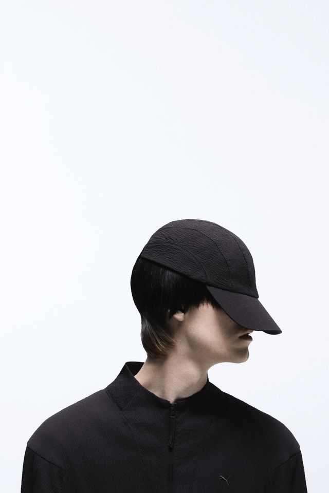 Autour de la chaussure, un vestiaire technique composé d’une veste, d’un pantalon, d’un tee-shirt et d’une casquette de baseball. Pour compléter l’ensemble, un sac hobo marron, partenaire idéal pour une virée en ville comme au grand air. Cette collaboration entre le géant Puma et le label plus confidentiel J.L-A-L parvient à repenser le tech-wear, à l’aube du printemps. Pour figurer l’effet seconde-peau des produits, les deux marques misent sur un fond épuré, totalement silencieux qui vient accueillir les mouvements des mannequins. Des déplacements permis par le confort des vêtements, là pour accompagner et non pour contraindre.