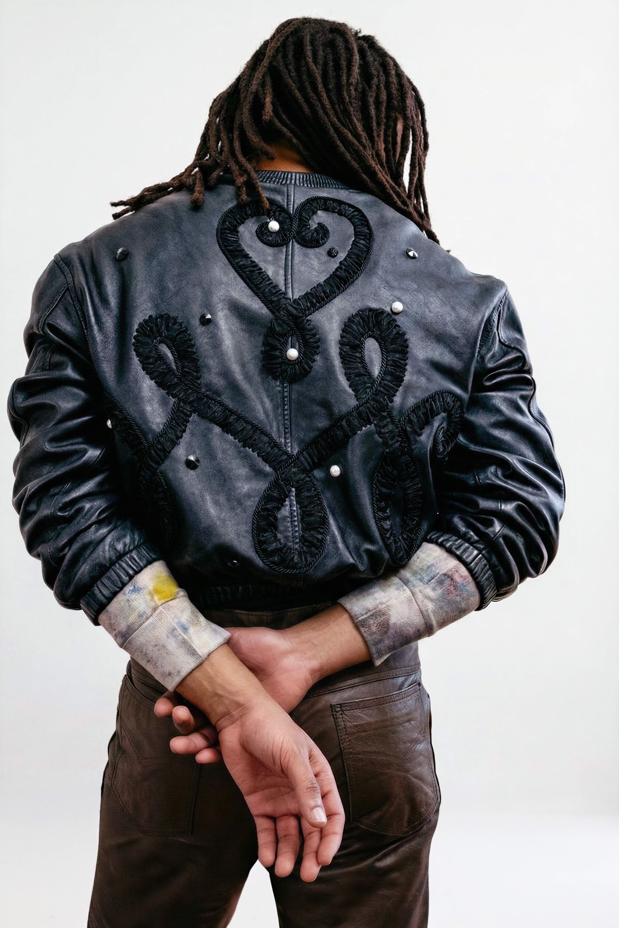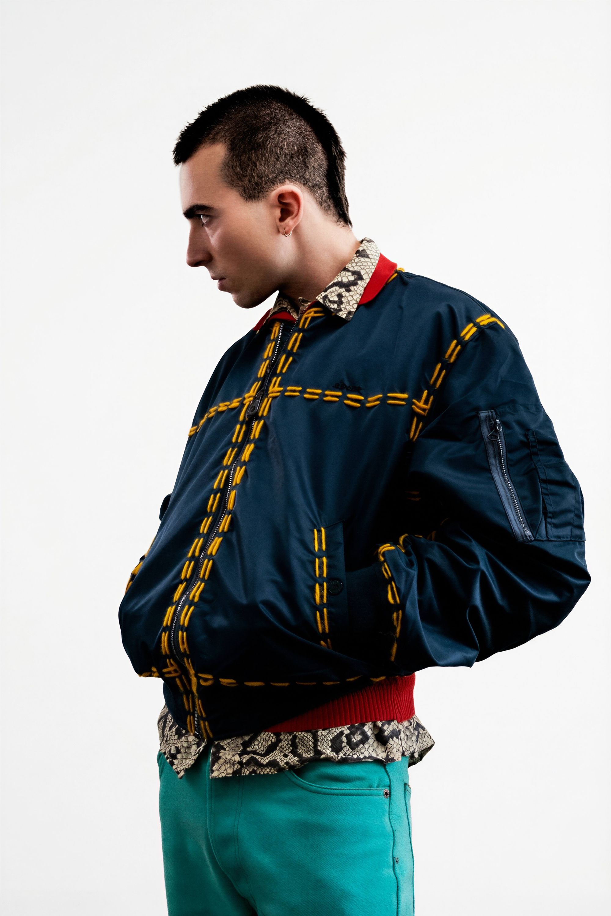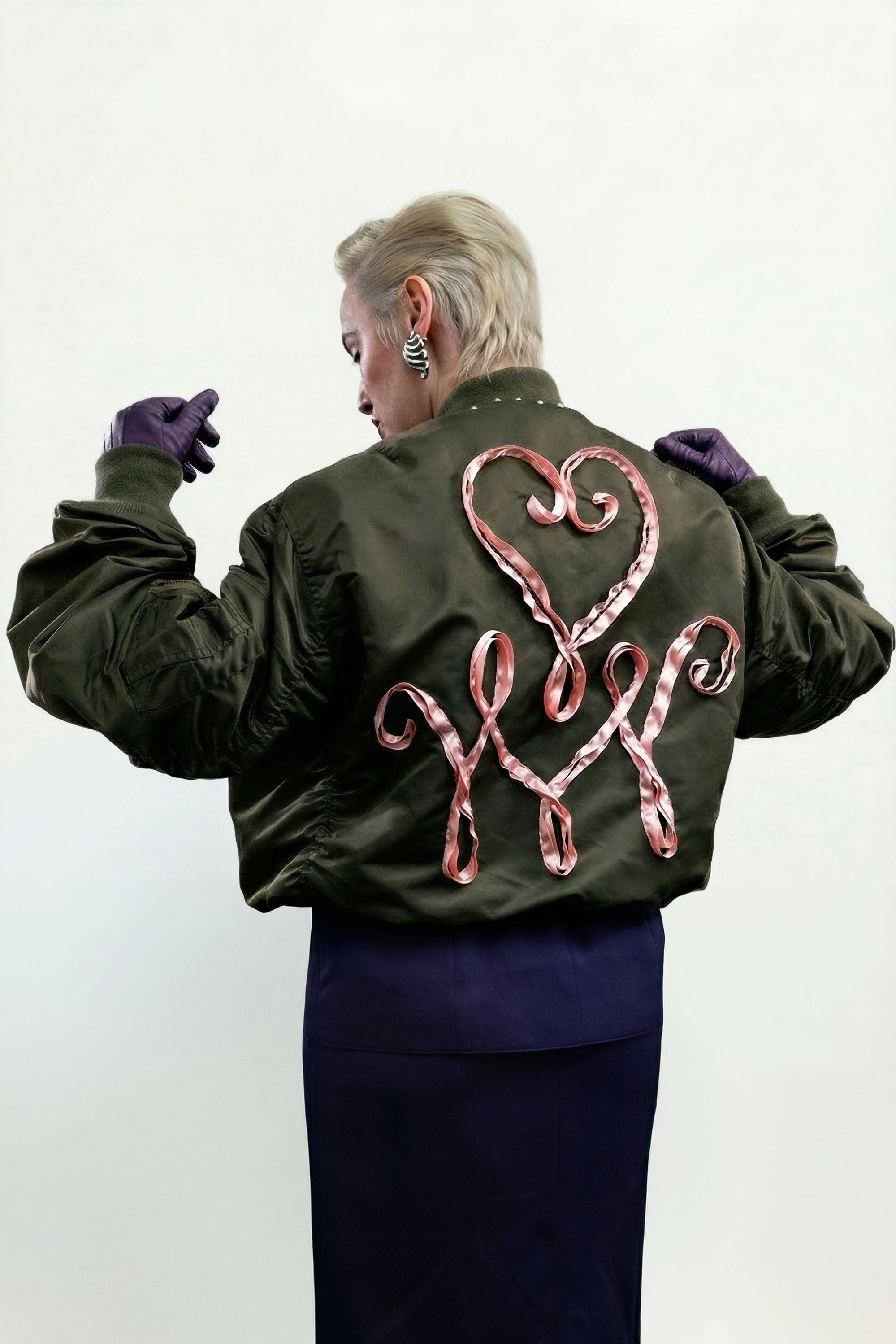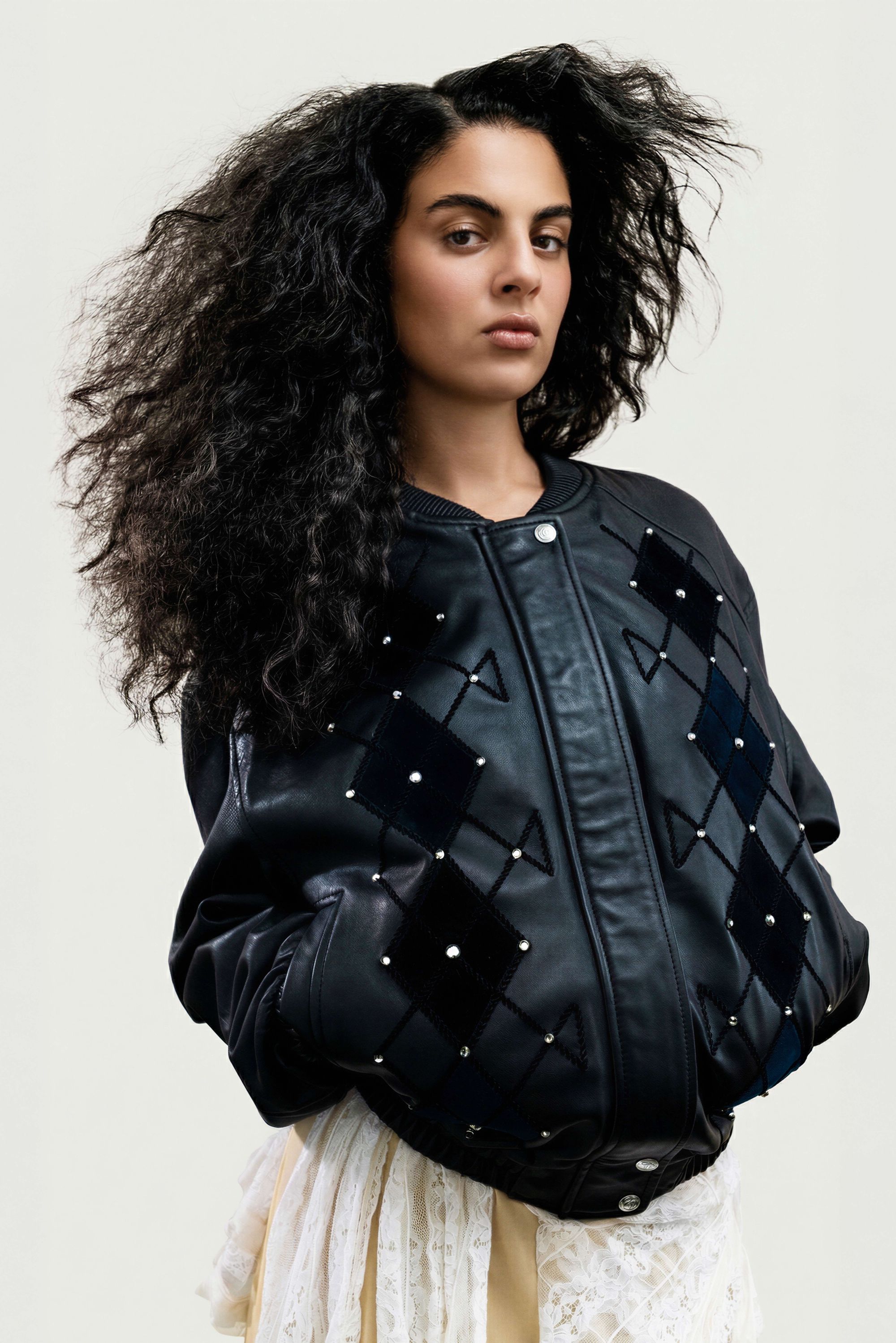 Dans le vêtement, cela se traduit par un travail particulièrement poussé : surpiqûres apparentes, losanges Burlington décalés par l’ajout de strass et broderies signées Atelier Montex. Chaque finition témoigne autant de la virtuosité des ateliers que de la créativité sans limite de la créatrice parisienne. La gamme de couleurs participe elle aussi à cette réinterprétation du bombers. Un rose poudré vient sublimer le nylon kaki, tandis que d’autres déclinaisons misent sur des associations plus franches : bleu marine et orange, ou encore bordeaux et bleu ciel. L’essentiel de la collaboration tient en ces quelques mots qu’elle partage au micro de nss France : « L’inspiration pour cette collection : mélanger les genres, le bombers très sport, iconique de chez Schott, et le savoir-faire haute couture de l’atelier Montex à la créativité d’une jeune marque comme la mienne ». Autre signature forte : le monogramme de Lou Menais. Son logo, formé des lettres « L » et « M », semble ici se métamorphoser à l’infini. Elle confie : « J’avais envie de travailler autour de l’imaginaire de mon logo » : des arabesques qui rappellent les vestes de toréador, celles des djellabas autant que les ferronneries des balcons parisiens. Des inspirations plurielles pour une collection-capsule qu’elle a d’abord pensé pour elle et ses amis.