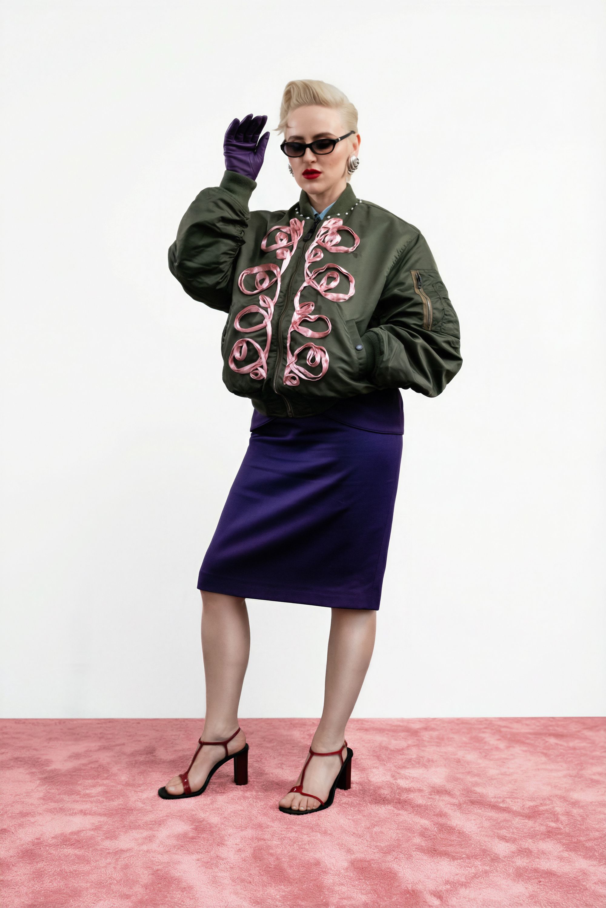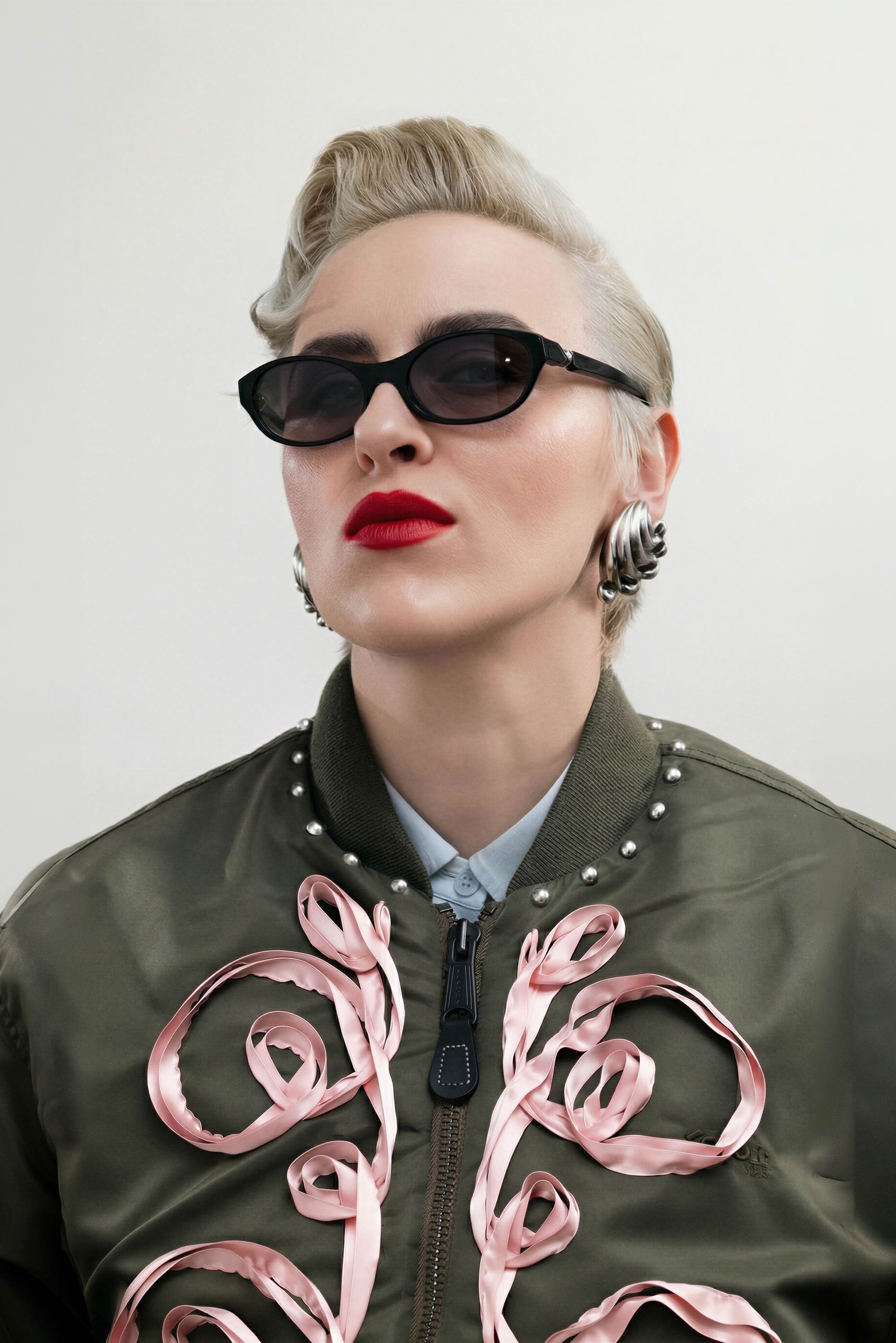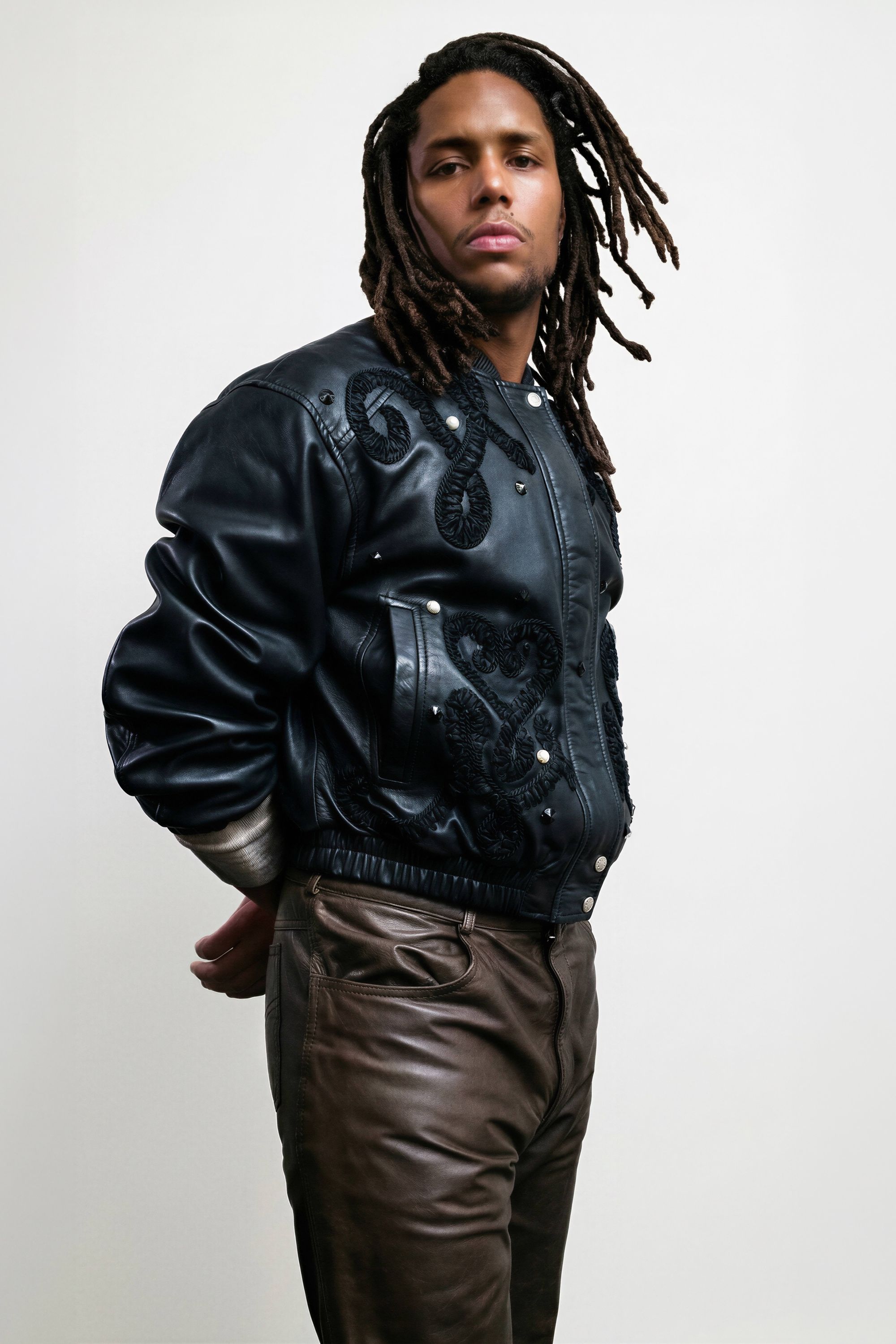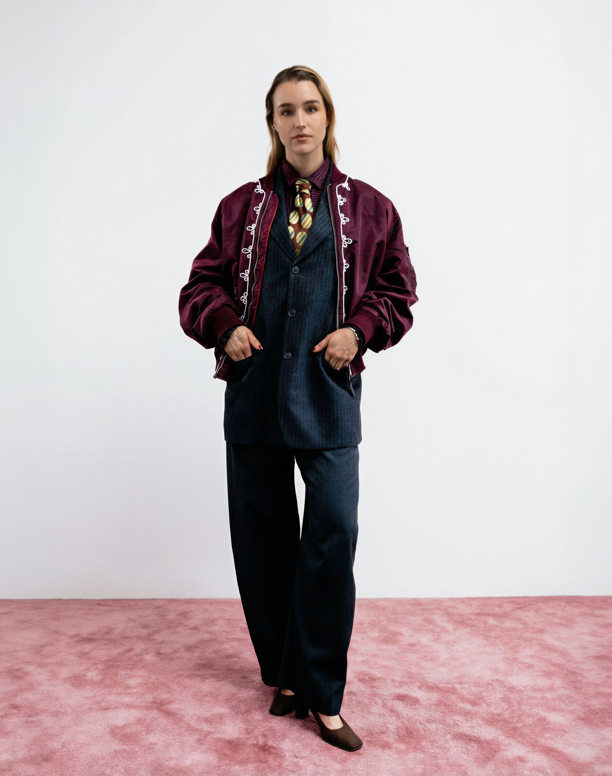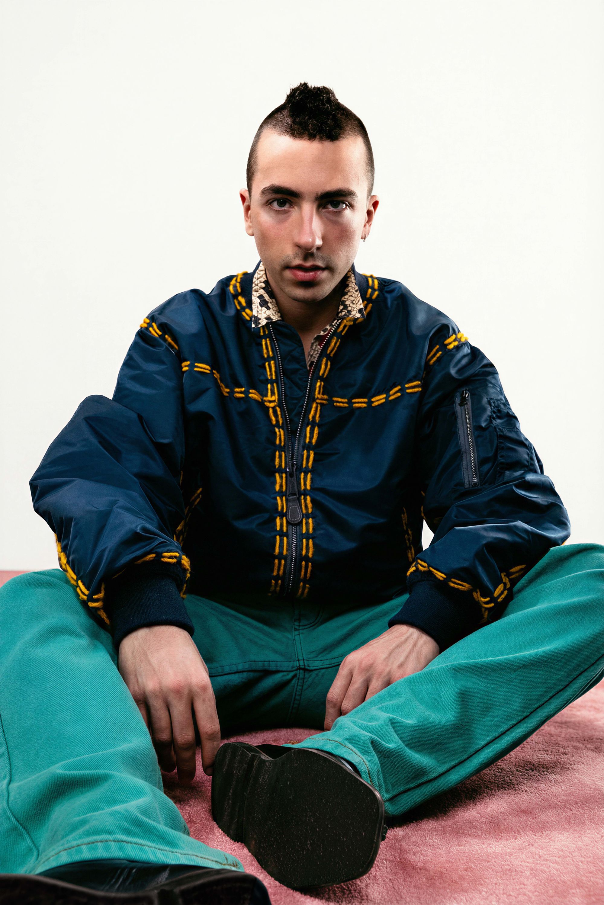 Dans le vêtement, cela se traduit par un travail particulièrement poussé : surpiqûres apparentes, losanges Burlington décalés par l’ajout de strass et broderies signées Atelier Montex. Chaque finition témoigne autant de la virtuosité des ateliers que de la créativité sans limite de la créatrice parisienne. La gamme de couleurs participe elle aussi à cette réinterprétation du bombers. Un rose poudré vient sublimer le nylon kaki, tandis que d’autres déclinaisons misent sur des associations plus franches : bleu marine et orange, ou encore bordeaux et bleu ciel. L’essentiel de la collaboration tient en ces quelques mots qu’elle partage au micro de nss France : « L’inspiration pour cette collection : mélanger les genres, le bombers très sport, iconique de chez Schott, et le savoir-faire haute couture de l’atelier Montex à la créativité d’une jeune marque comme la mienne ». Autre signature forte : le monogramme de Lou Menais. Son logo, formé des lettres « L » et « M », semble ici se métamorphoser à l’infini. Elle confie : « J’avais envie de travailler autour de l’imaginaire de mon logo » : des arabesques qui rappellent les vestes de toréador, celles des djellabas autant que les ferronneries des balcons parisiens. Des inspirations plurielles pour une collection-capsule qu’elle a d’abord pensé pour elle et ses amis.