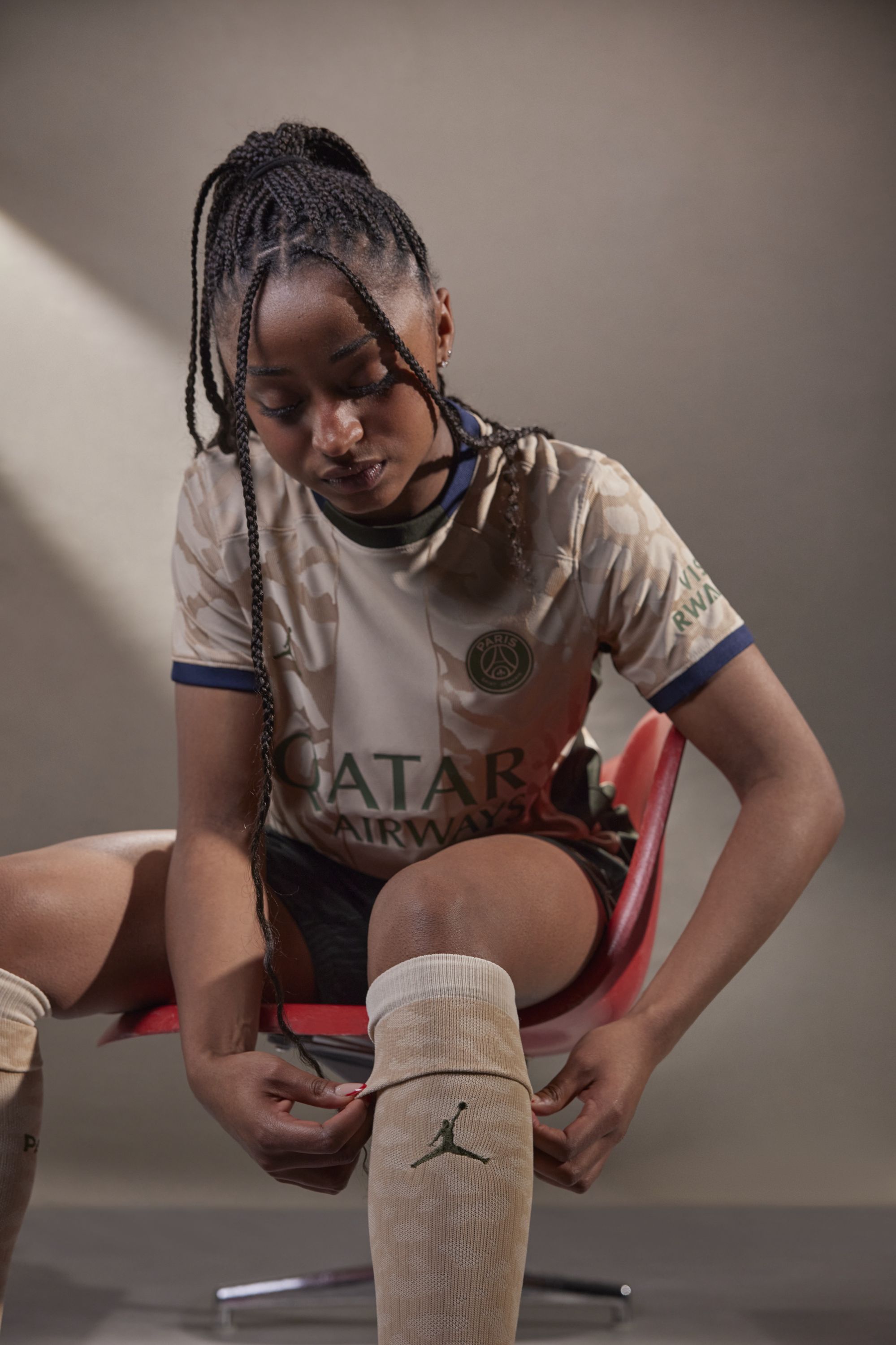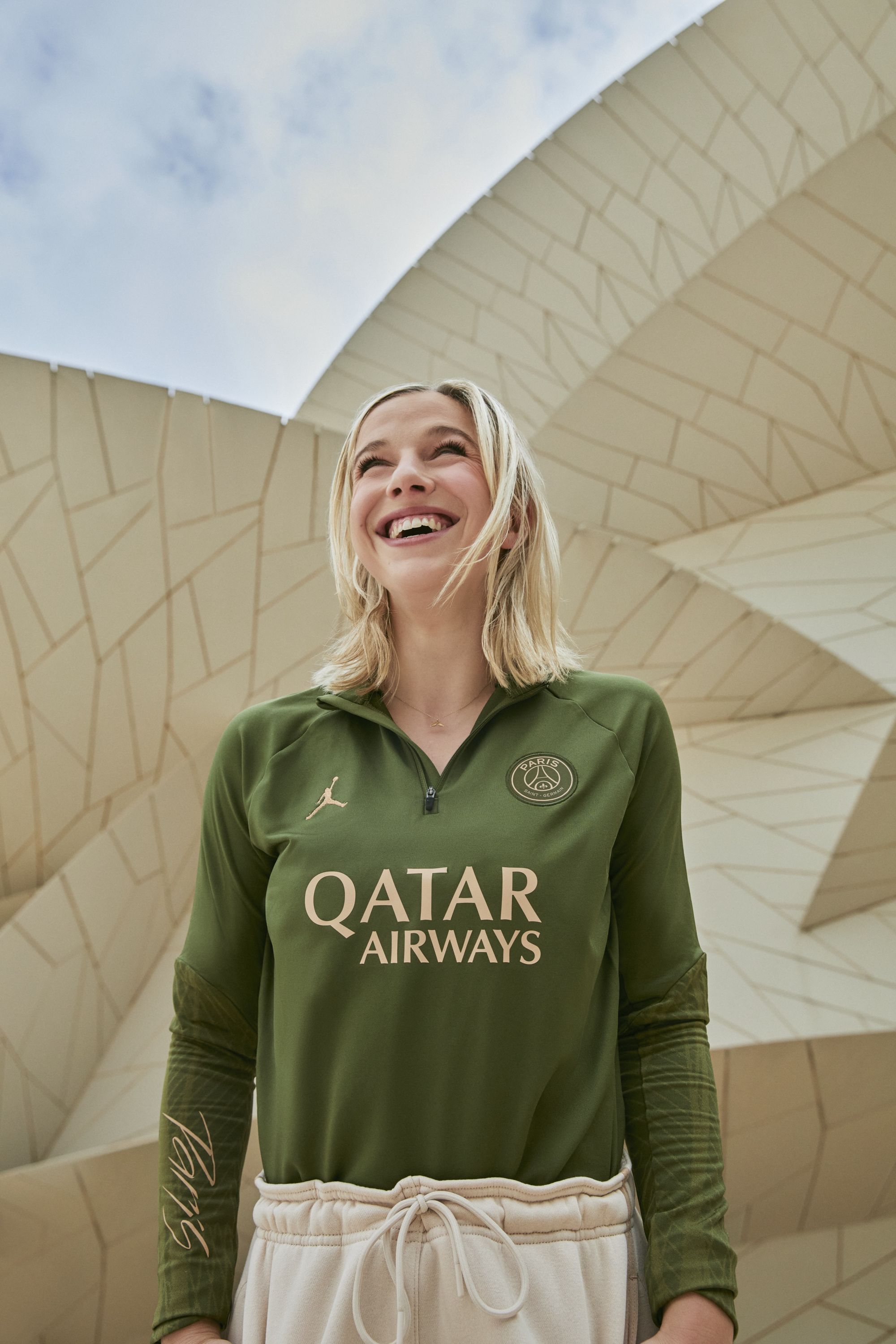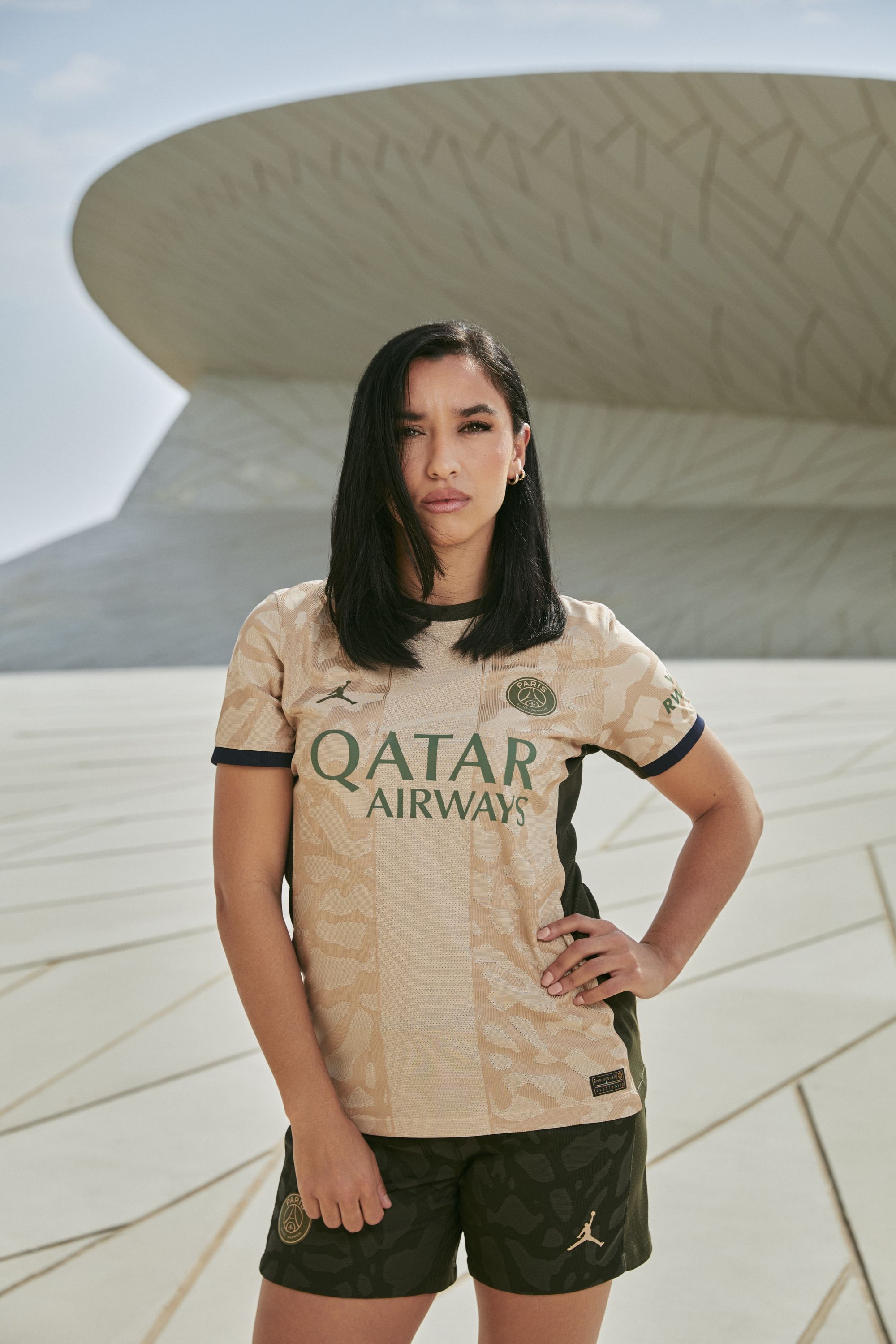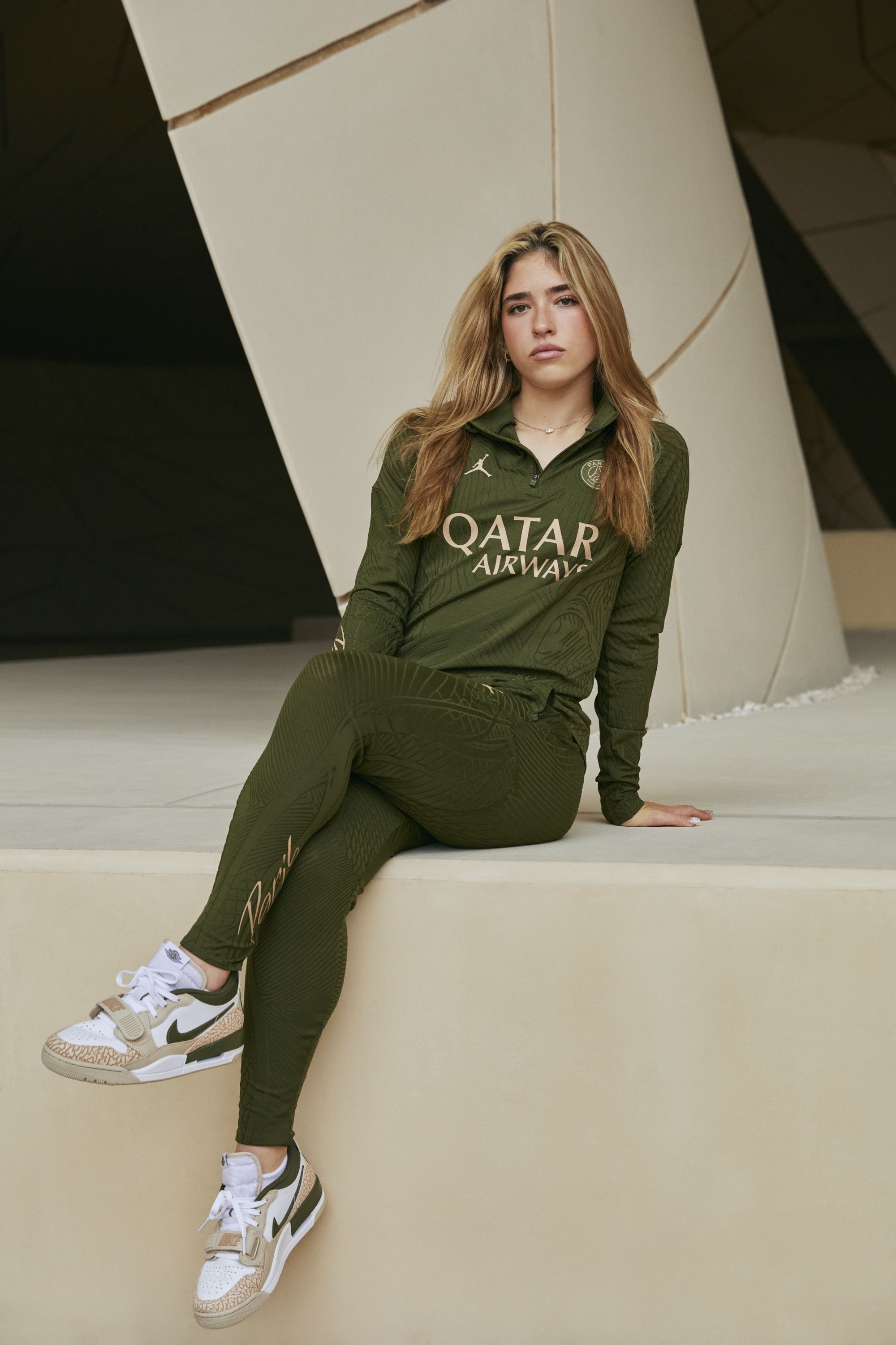 This collection is accompanied by a Training and Lifestyle range, as well as an exclusive Air Jordan Legacy 312 Low, also featuring the elephant print. For the first time ever, the "AIR JORDAN" brand appears on the lifestyle collection garments, marking a new milestone in the partnership between the two brands. For this fourth campaign, Paris Saint-Germain players (Korbin Albert, Elisa De Almeida, Grace Geyoro, Jackie Gronen, and Sakina Karchaoui) went to the National Museum of Qatar in Doha for an exclusive and unique photoshoot. This symbolic location, with its distinctive sand-colored architecture designed by French architect Jean Nouvel, provides a visually impactful setting that complements the kit's colors.