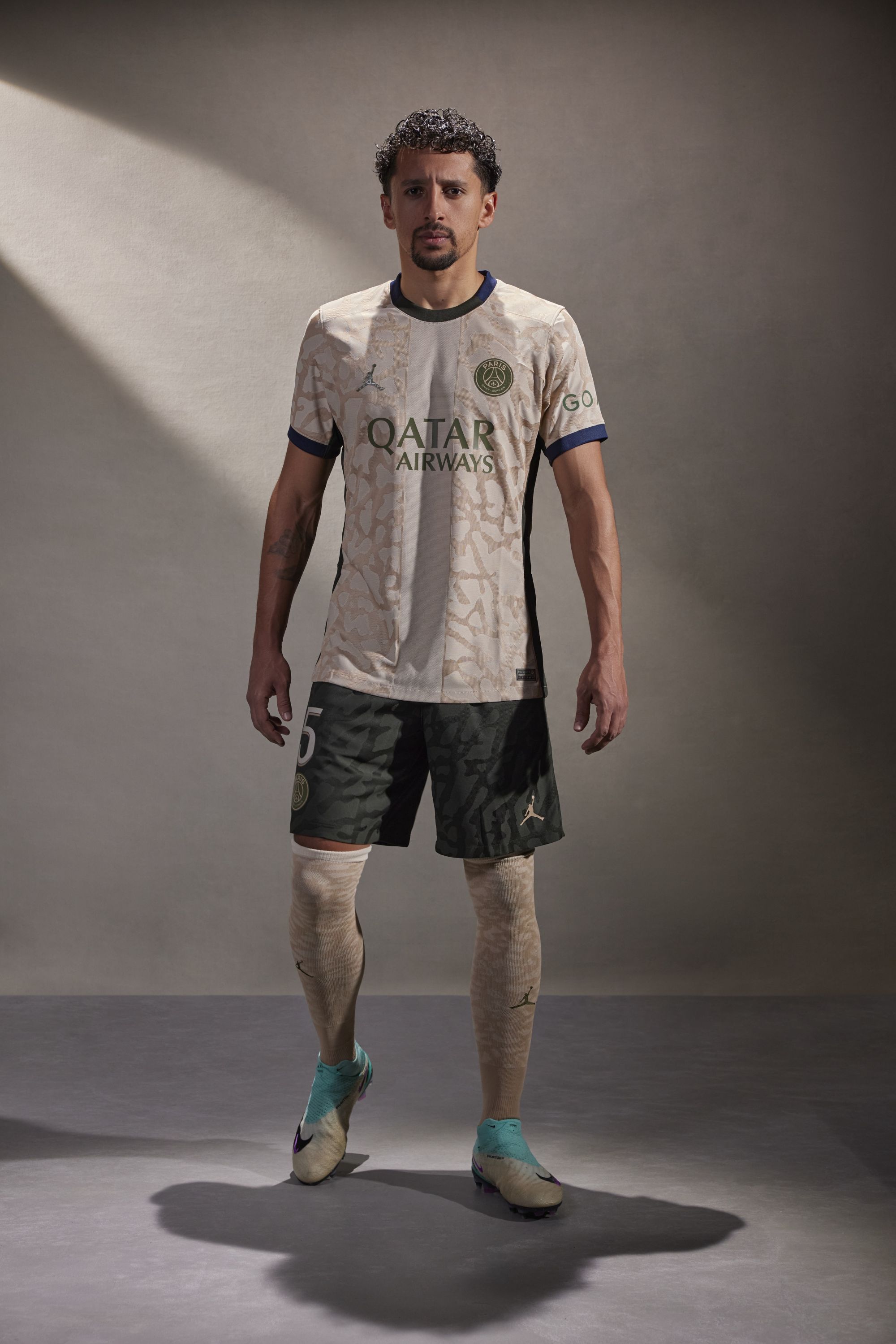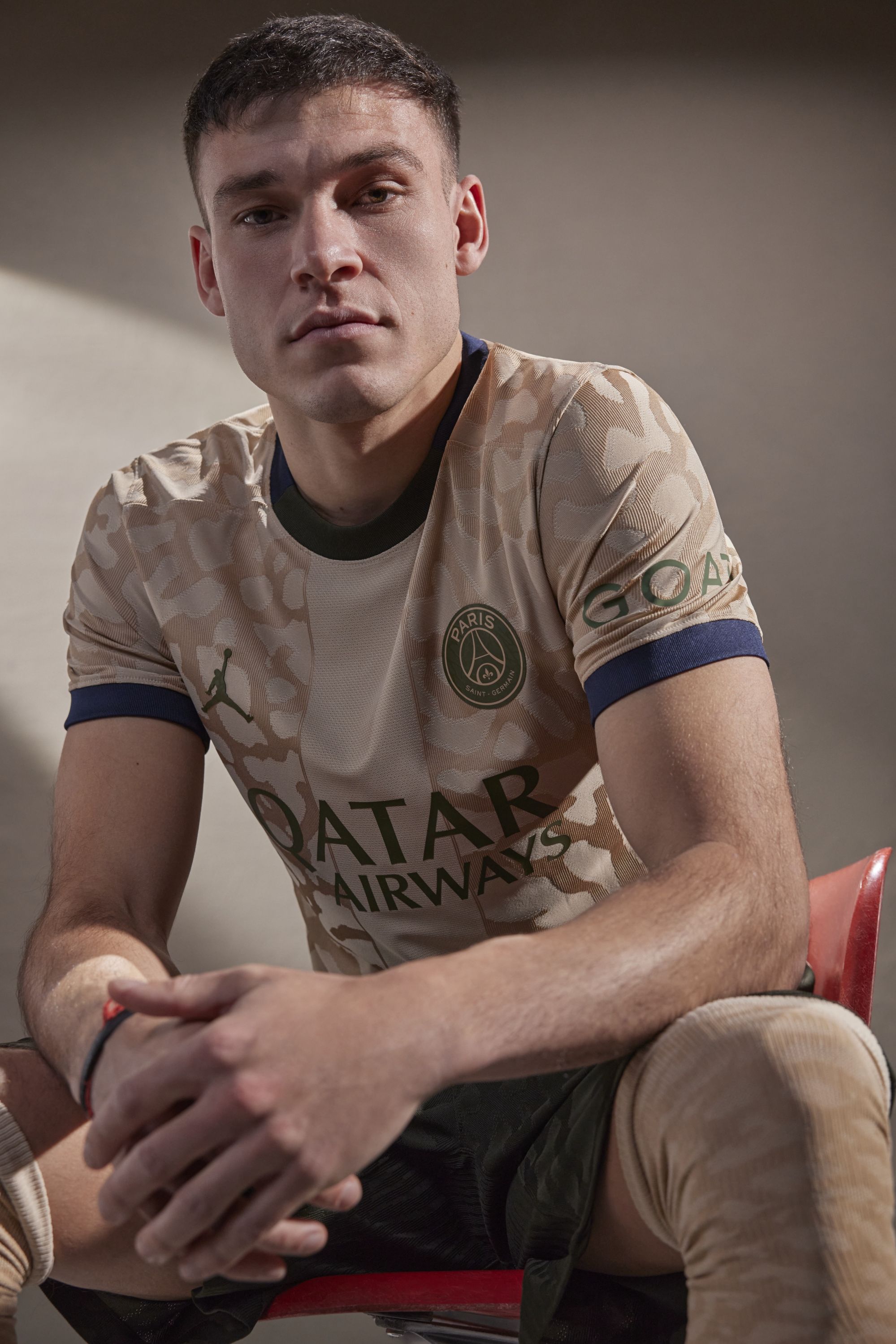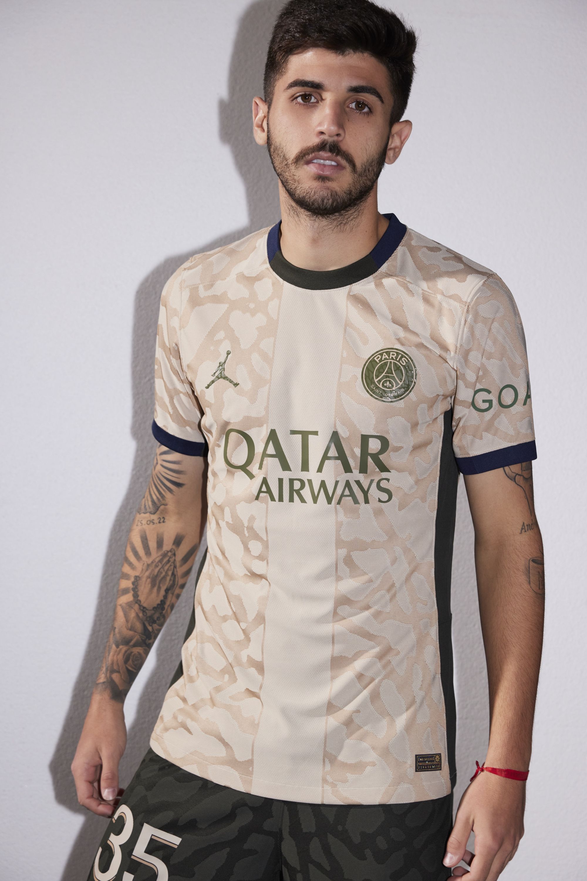 Le quatrième maillot du PSG en collaboration avec Jordan Brand L'emblématique motif elephant print revient cette fois-ci en couleur sable