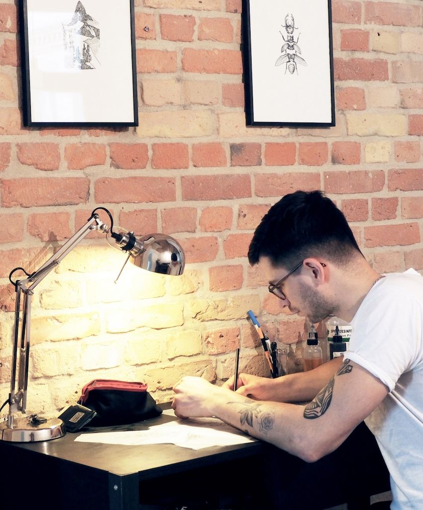 In realtà è successo e basta. Tatuavo da casa part-time e contemporaneamente facevo un altro lavoro quando un mio amico mi ha presentato Viktor, il parrucchiere (Viktor Leske). Lui è molto spontaneo, aperto e ama i tatuaggi quindi ha subito pensato di iniziare qualcosa insieme. MI ha offerto lo spazio sul retro del suo negozio a Mitte e sono rimasto lì per quasi quattro anni. Recentemente ci siamo separati perchè la sua attività è divenata molto frenetica e gli serviva più spazio. Per ma valeva la stessa cosa ma è stata davvero un'esperienza magnifica. Ora sono tornato a tatuare in casa ma ancora non so come farlo funzionare. Mi piace l'atmosfera che è privata e intima ma probabilmente cercherò uno studio.. o un appartamento più grande (ride).