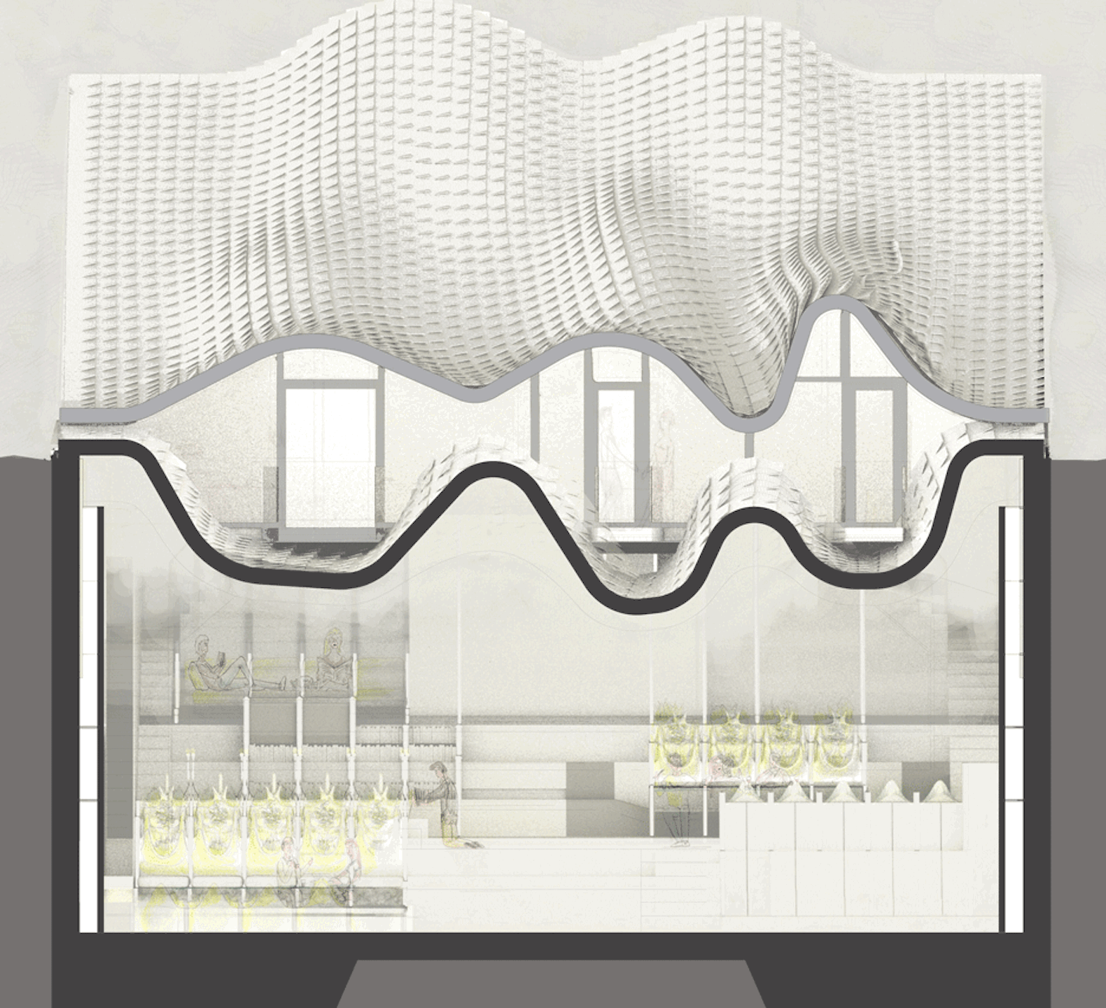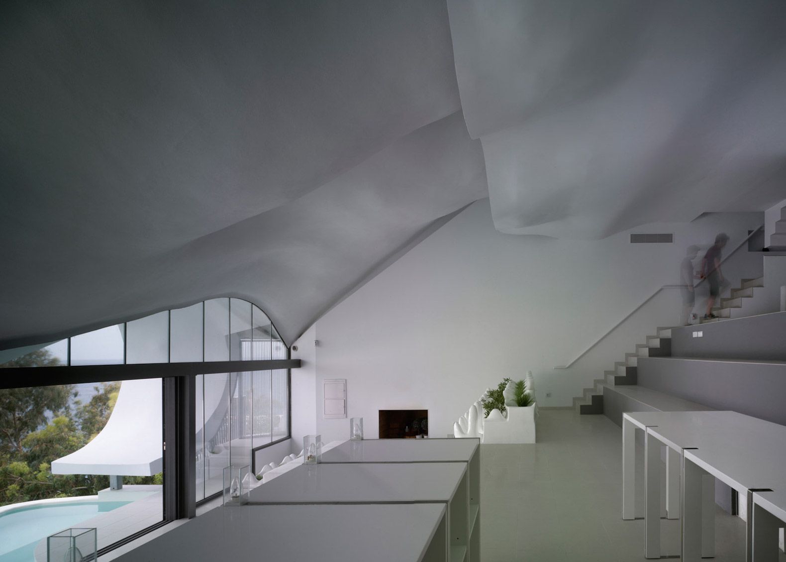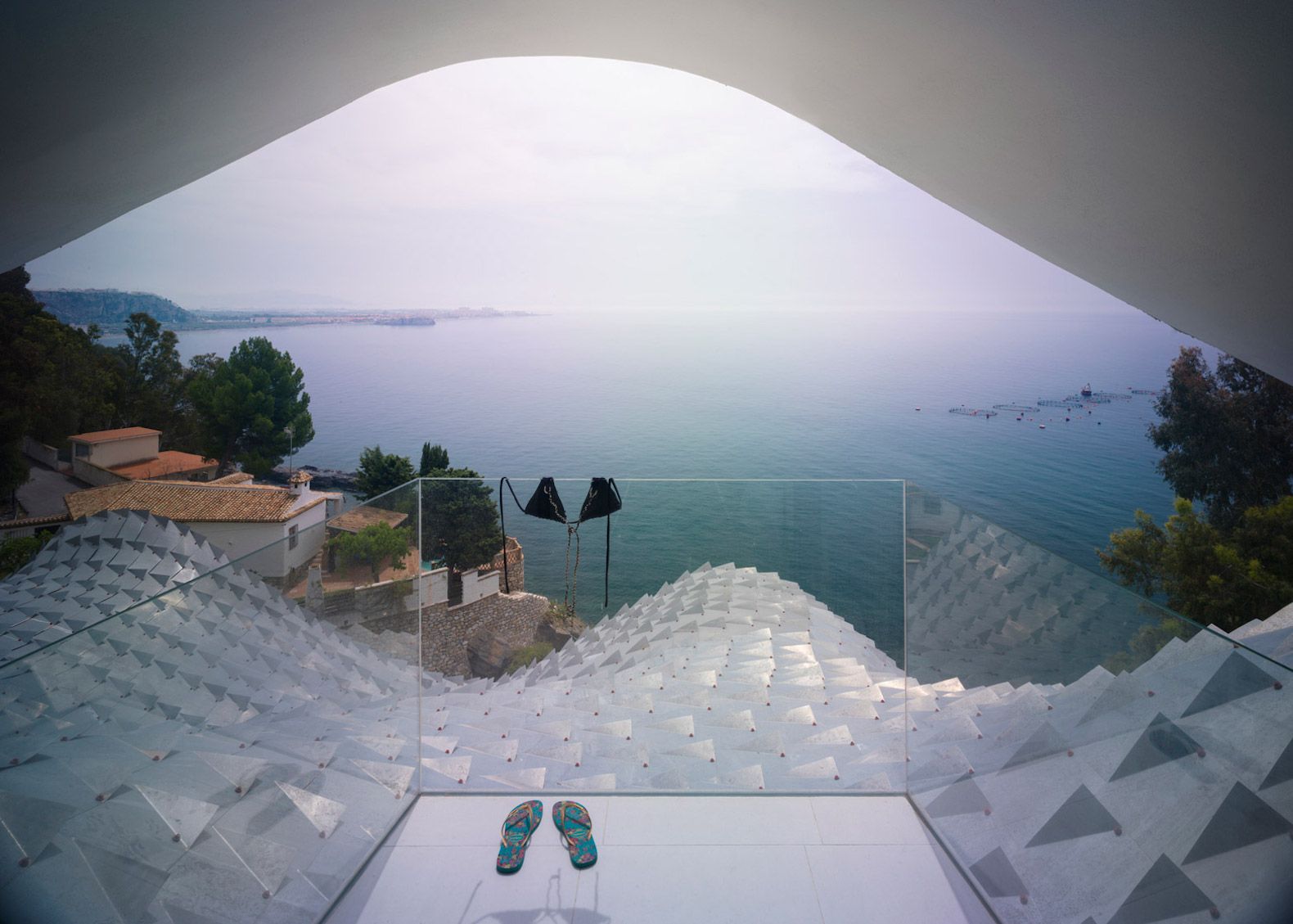 "Il nostro compito principale è stato quello di integrare la casa nel magnifico paesaggio che la circonda e dirigere gli spazi vivibili verso il mare", hanno spiegato gli architetti, "La forma della casa e il tetto metallico riproducono un'ambiguità estetica ben calcolata tra il naturale e l'artificiale, tra la pelle di un drago se visto dal basso e le onde del mare viste da sopra".