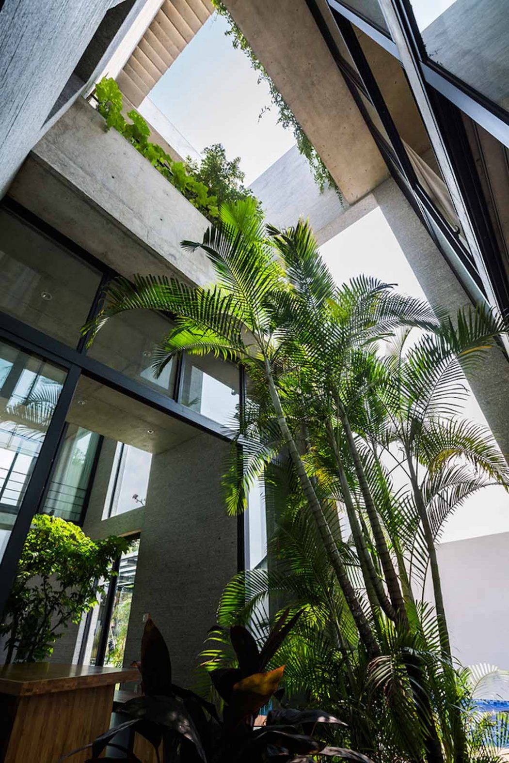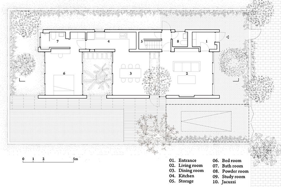 Il moderno stile di architettura residenziale proposto da VTN migliora, inoltre, il microclima introducendo ventilazione e luce naturali in ogni stanza. Al piano terra l'ingresso della proprietà si apre su un salotto separato da una zona pranzo da alberi e arbusti che crescono in un piccolo giardino di ghiaia. Al di là, un atrio all'aperto rivestito con porte scorrevoli in vetro ospita alte palme e pietre che conducono ad una camera da letto suite. Sempre al livello superiore ci sono altre due suite, uno studio e un centro benessere con vasca idromassaggio all'aperto.
