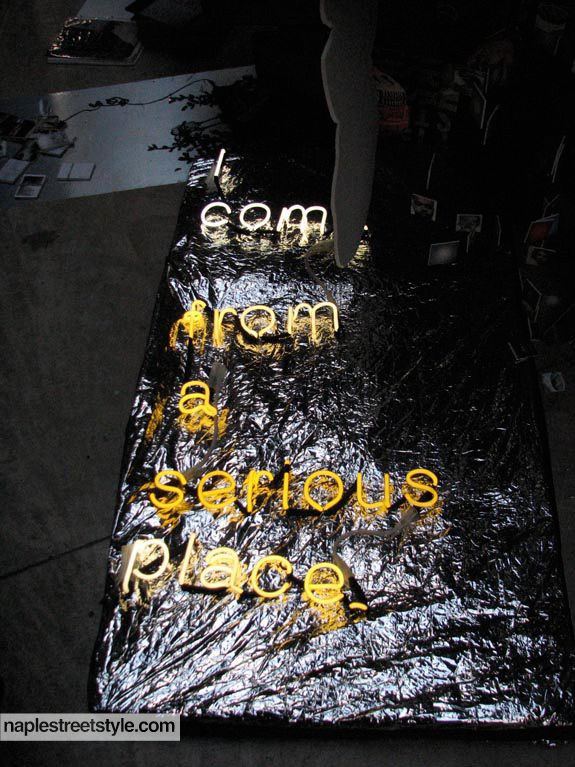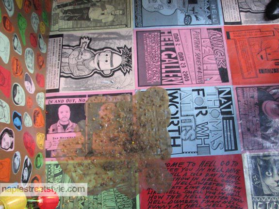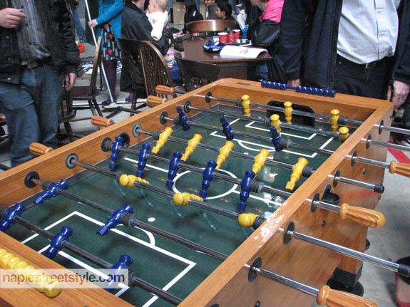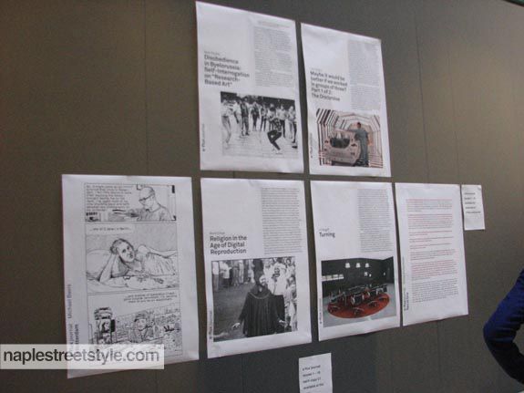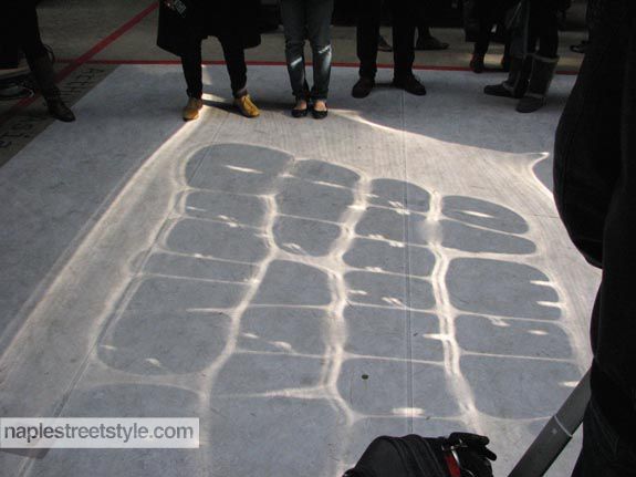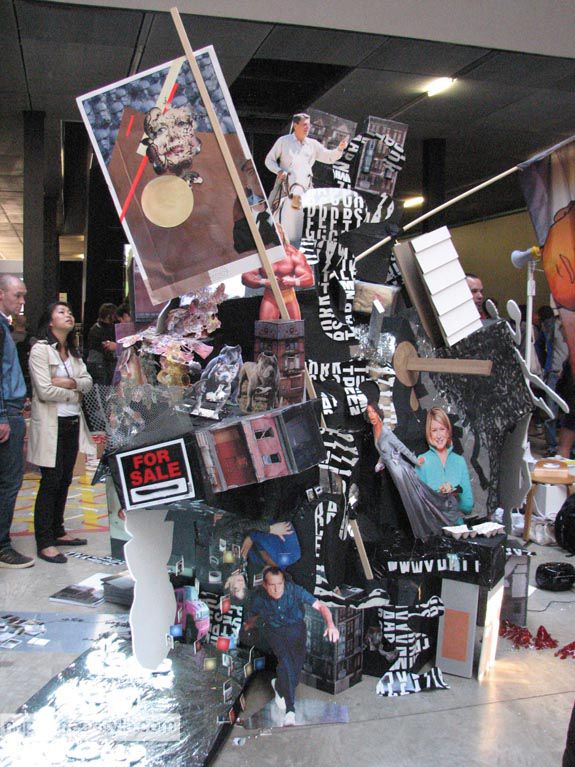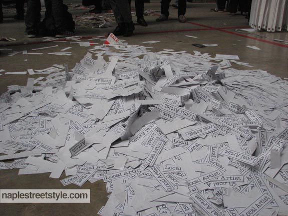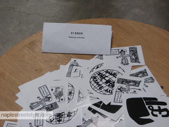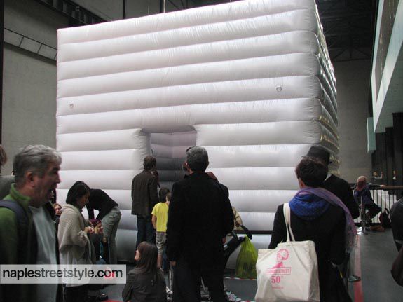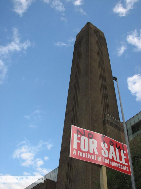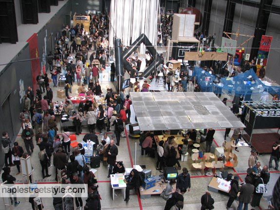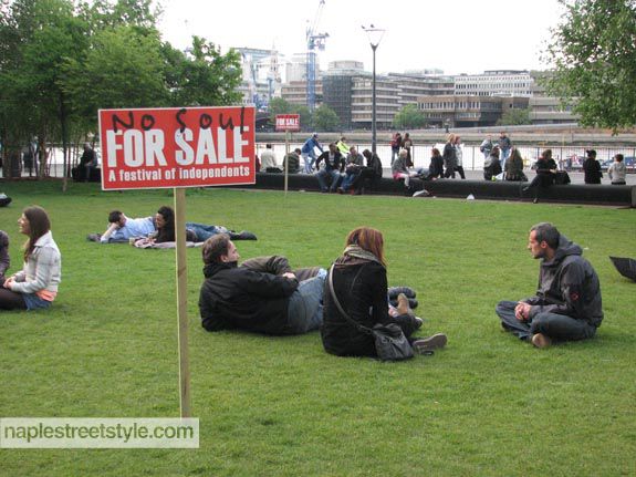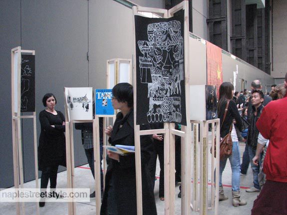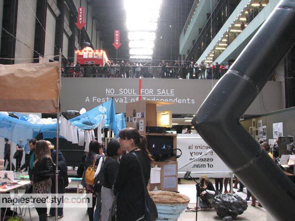 La causa? L’evento No Soul for Sale organizzato per festeggiare il decimo anniversario dell’apertura della Tate Modern. No Soul For Sale non è né una fiera di arte né una mostra, ma un festival per celebrare lo spirito di indipendenza e di diversità del mondo dell’arte, secondo le intenzioni dei curatori – Cecilia Alemani, Maurizio Cattelan e Massimiliano Gioni (tutti italiani, guarda un po'!). In mostra 70 mini-mondi artistici, tra istituzioni alternative, organizzazioni artistiche non-profit, collettivi artistici e imprese underground provenienti da ogni parte del globo, disposti su un reticolo di lotti di uguale dimensione disegnato sul pavimento con il nastro adesivo rosso. Riprendendo l’idea del set teatrale del film Dogville di Lars Von Trier, l’allestimento delle Turbine Hall crea in questo modo la mappa di una città immaginaria in cui distanze e gerarchie vengono abolite. Un festival volutamente incasinato e anarchico, che si direbbe quasi fuori luogo negli ambienti sacri della Tate, ma che invece riesce benissimo nell’intento di avvicinare e coinvolgere pubblico nel mondo dell’arte contemporanea. La mia amica Giulia, che è venuta a farsi un giro con me, ha commentato: “Mi piace un sacco questo evento. Mi piace appunto perché, per essere la Tate, mi sembra un buon diversivo, in questo modo perde il suo carattere scolastico-istituzionale e diventa un luogo più attivo e vibrante, grazie alla confusione creata dagli artisti in mostra.”