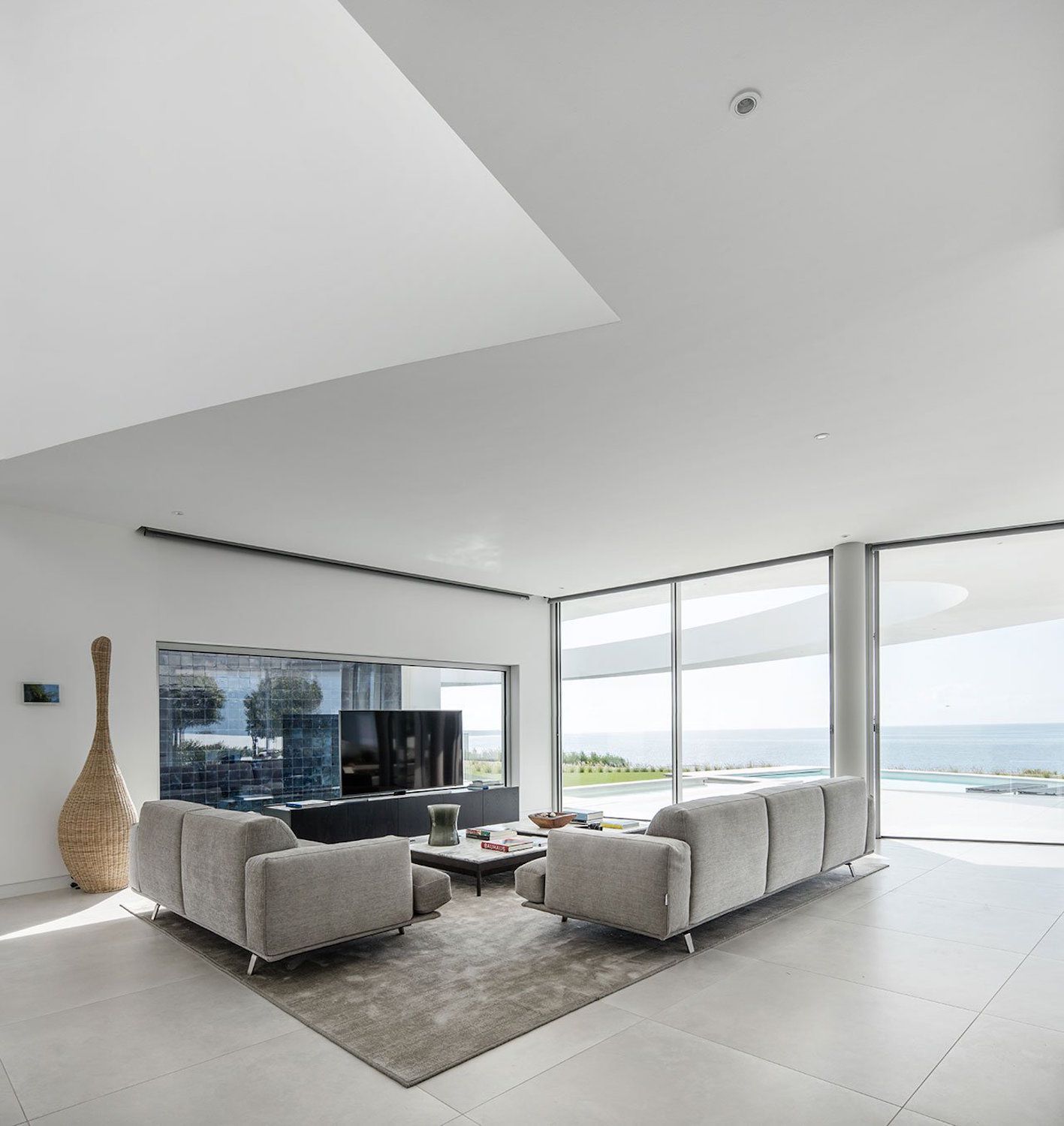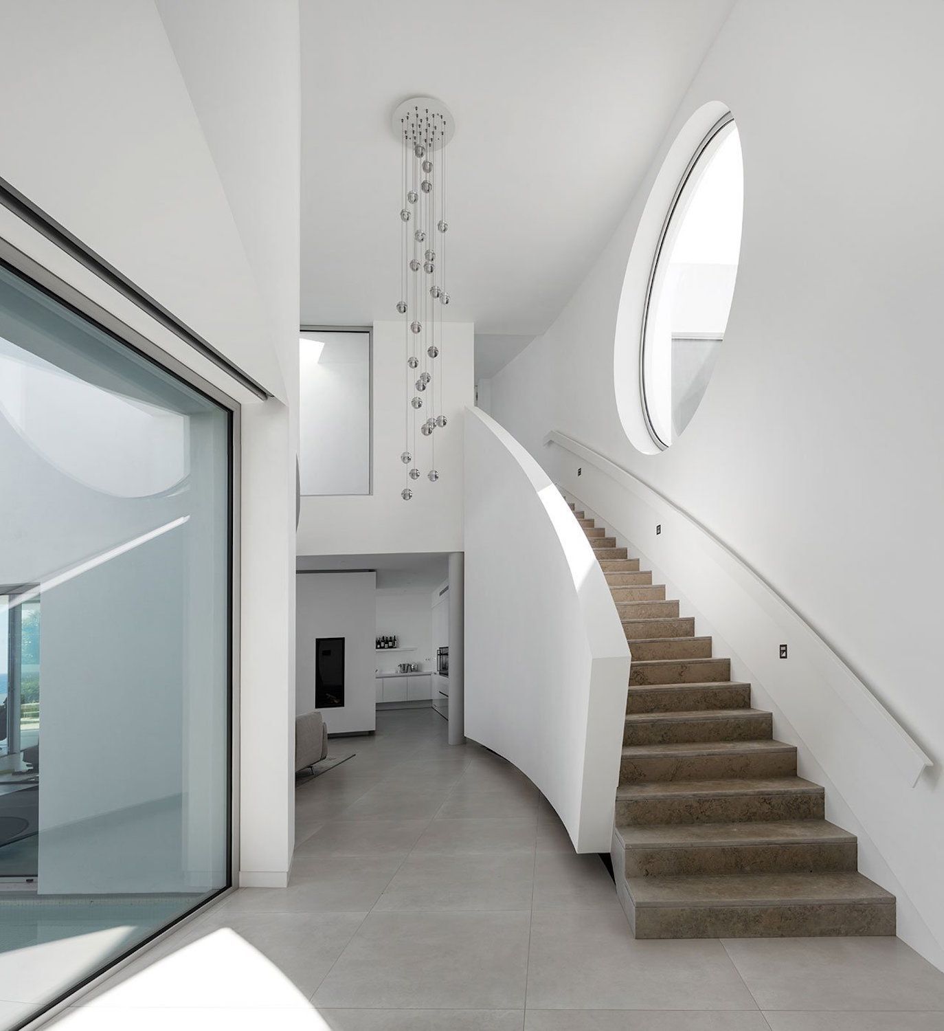 L’aspetto essenziale si riflette anche negli interni minimalisti, caratterizzati da tonalità di bianco e grigio chiaro e sottolinea le forme architettoniche interne che rispecchiano quelli dell’esterno: la curva, la scala larga e le ampie finestre rotonde.