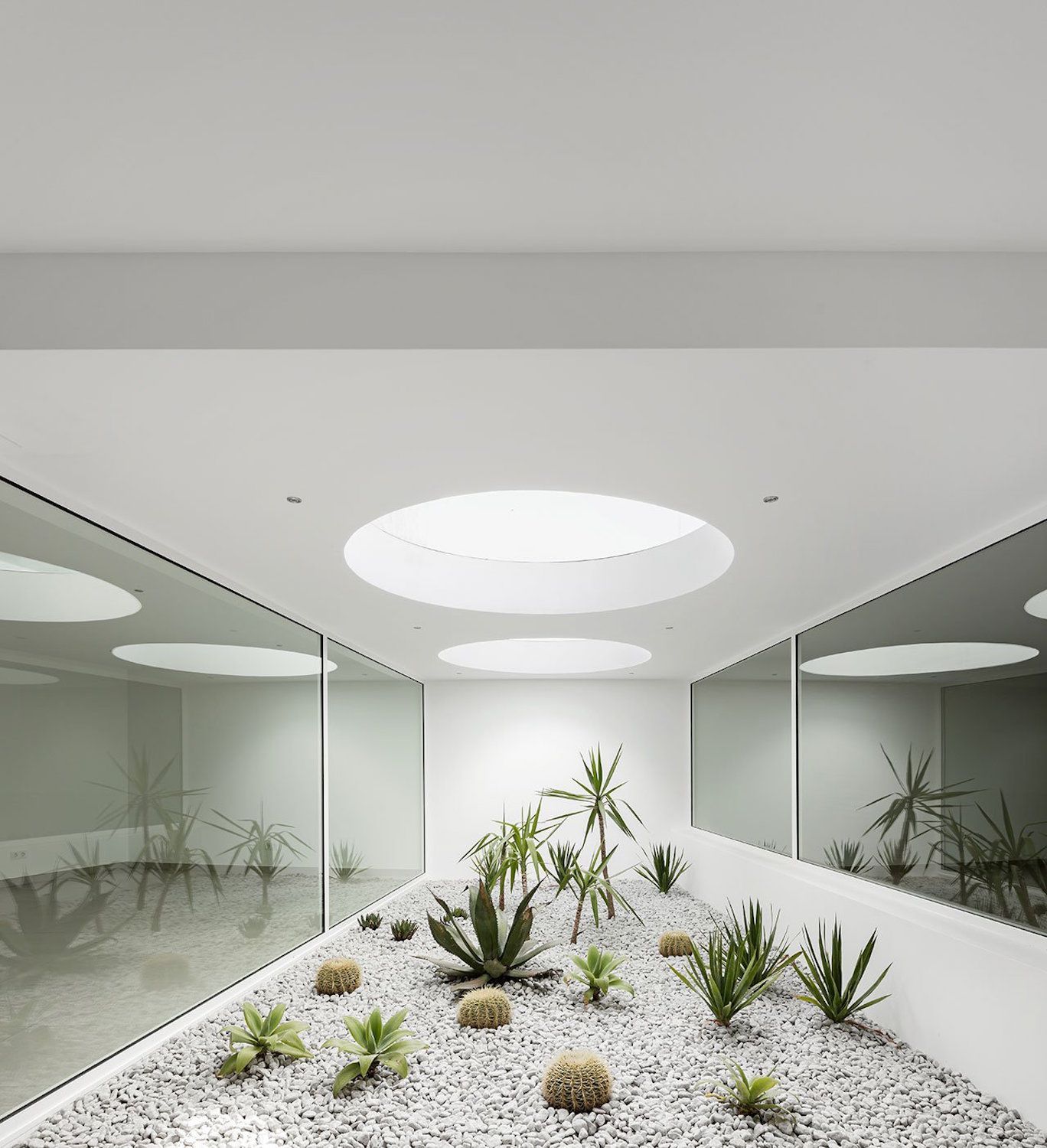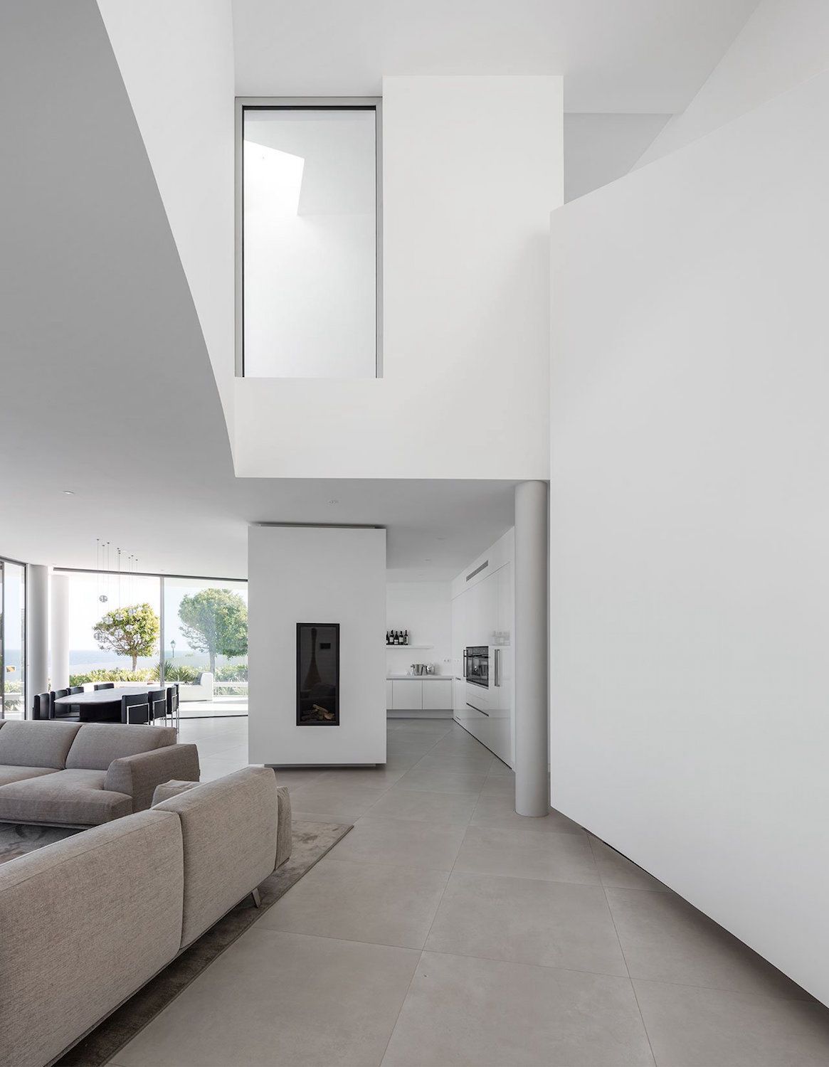 La sua particolare struttura bianco intenso, infatti, vanta una tale fluidità e leggerezza di design da riflettere l’equilibrio tra pienezza e vuoto, peso e aria, luce e ombra, tra il reale e immaginato, tra spazi fisici e virtuali. Il modo in cui la casa viene scolpita dalla luce trasmette e il fatto che i suoi due piani siano impostati in un angolo complementare le regala la sensazione di essere senza peso, come se fosse costantemente in movimento.
